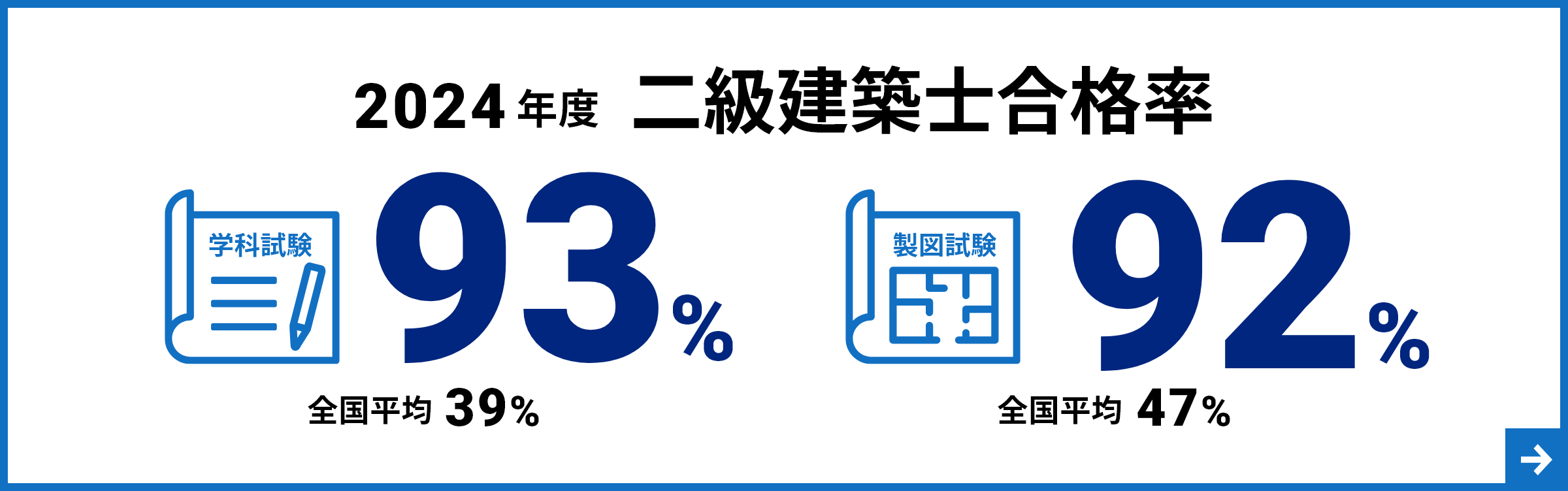 二級建築士の合格を目的とした「専科2級建築士科」では、基本・演習・復習を繰り返す独自のカリキュラムで、合格に必要な力をより確実に修得できます。2024年度の試験では、全国平均を大きく上回る学生たちが合格しました。