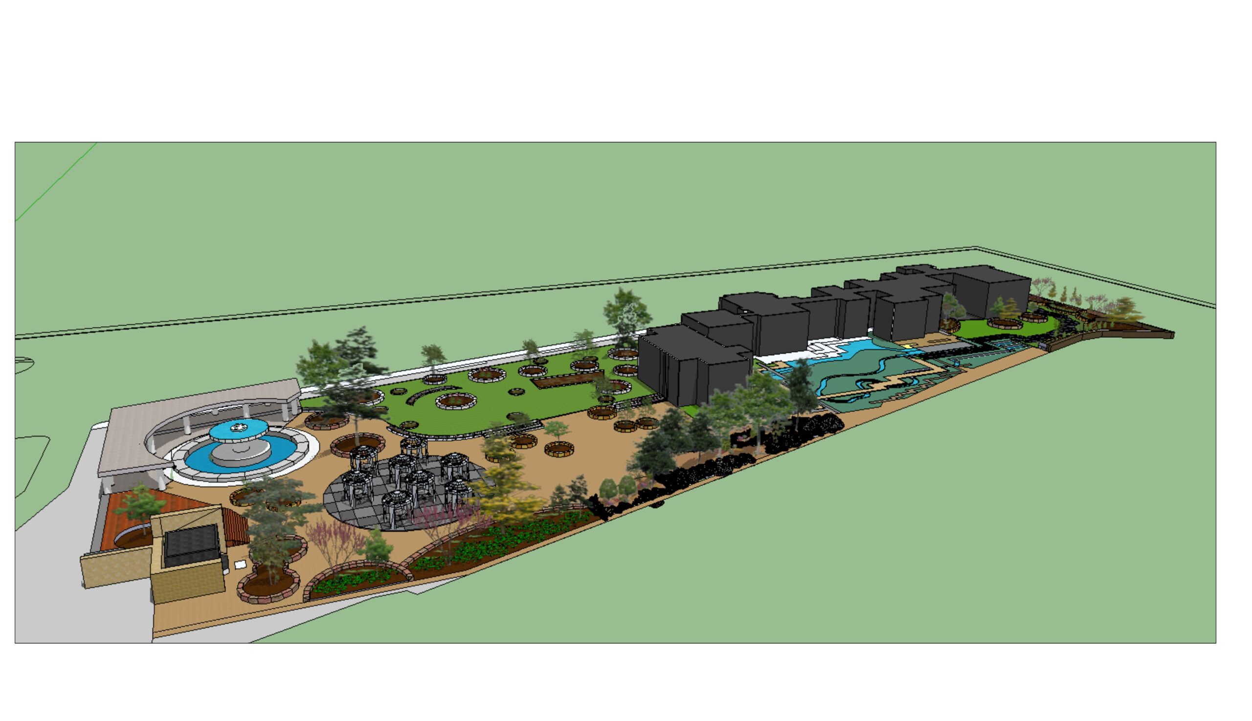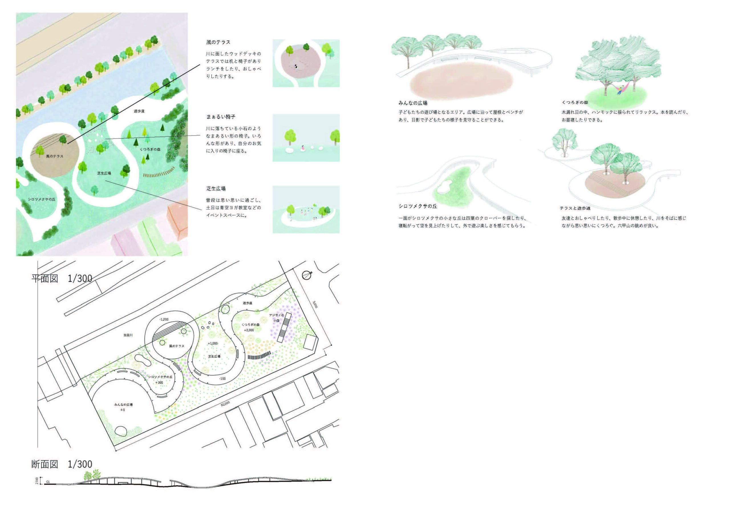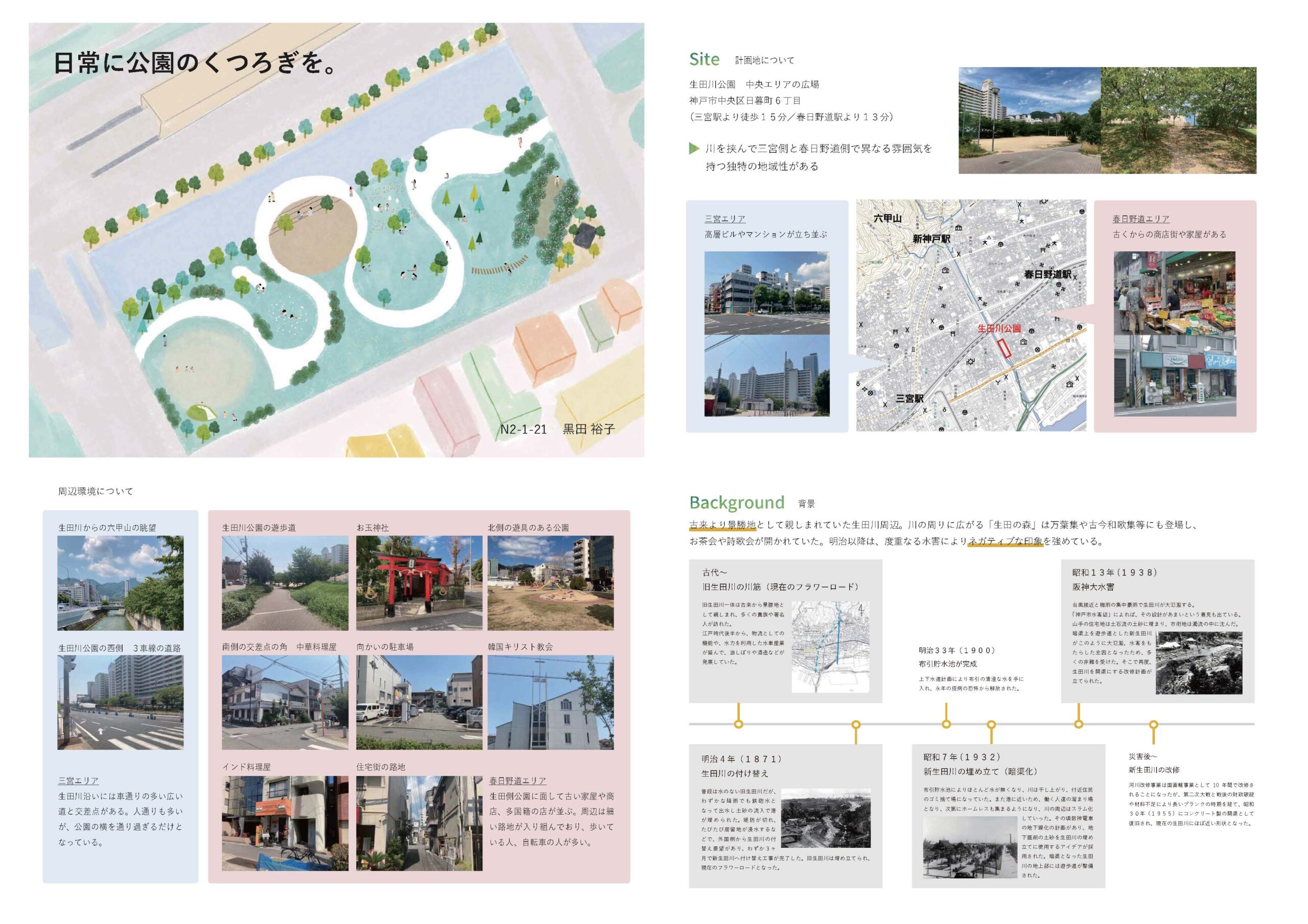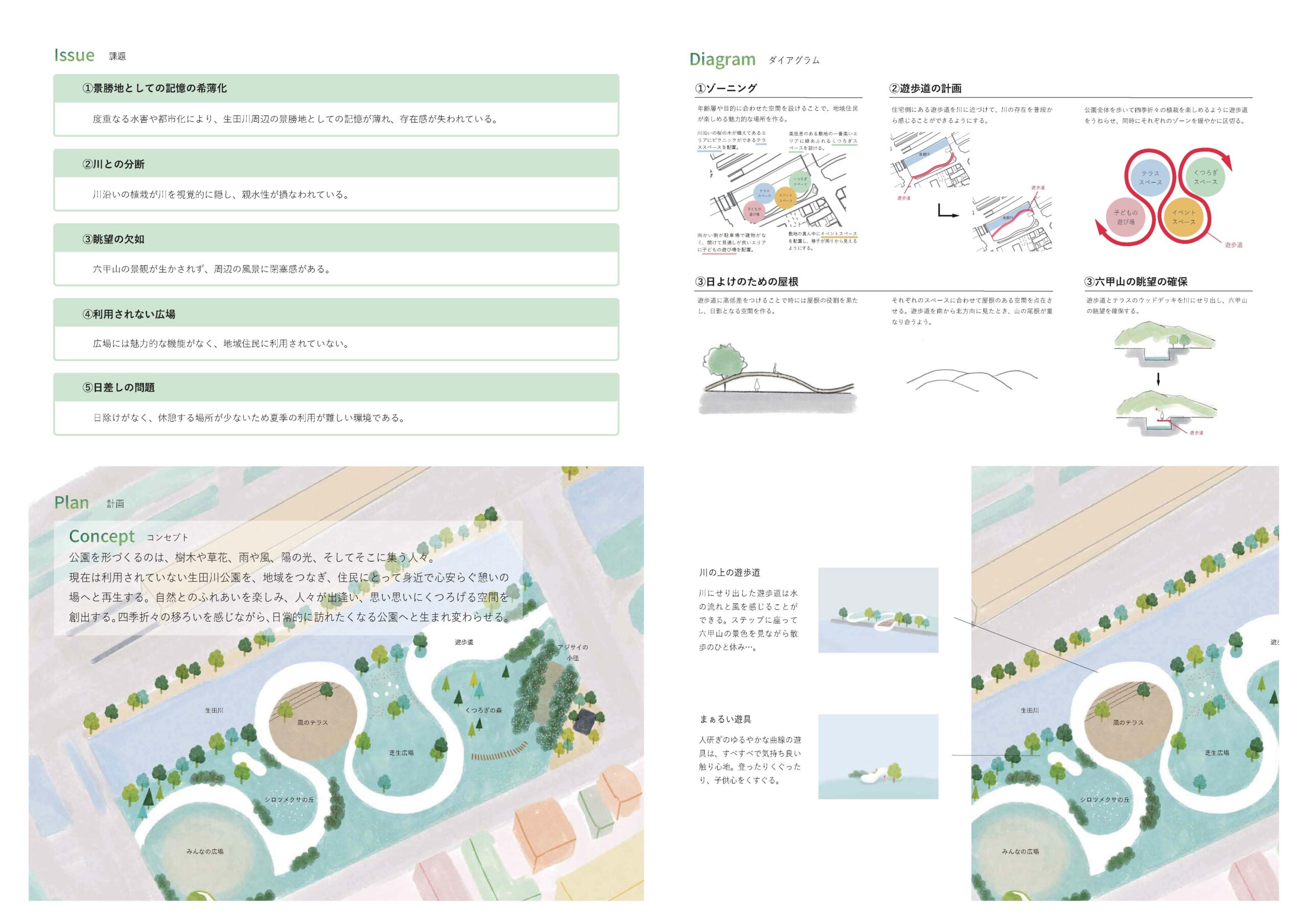 公園の改修をテーマに、地域住民が集いくつろげる場を目指して設計しました。歴史や利用者のニーズを調査し、六甲山や生田川といった地域特有の魅力を活かしつつ、自然と人が調和する空間を提案しました。
