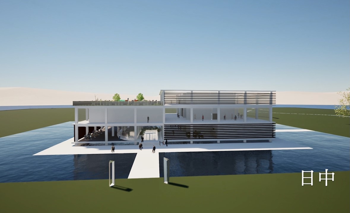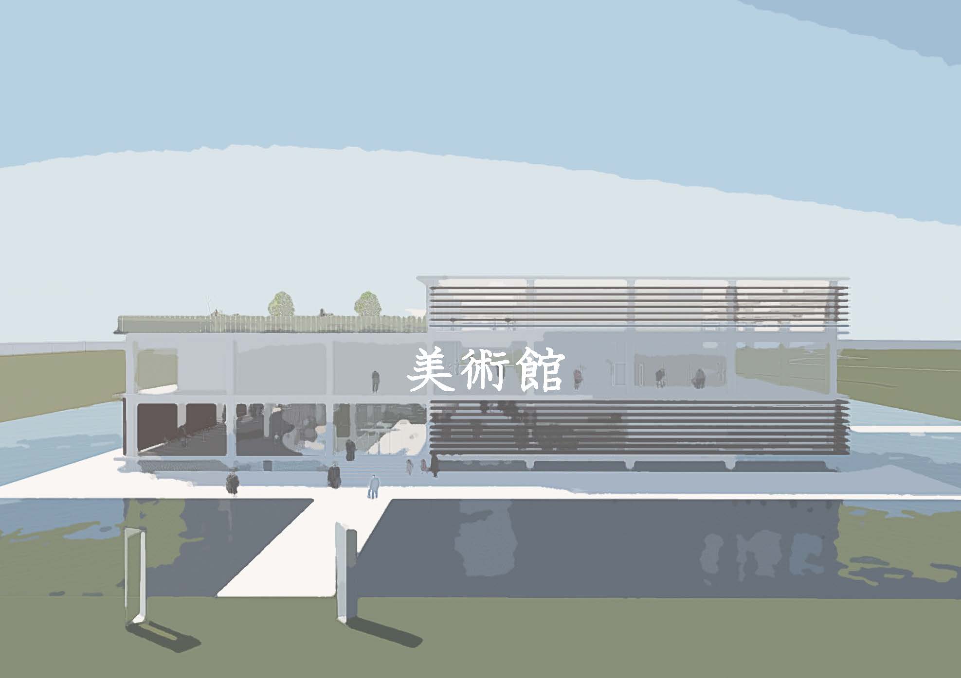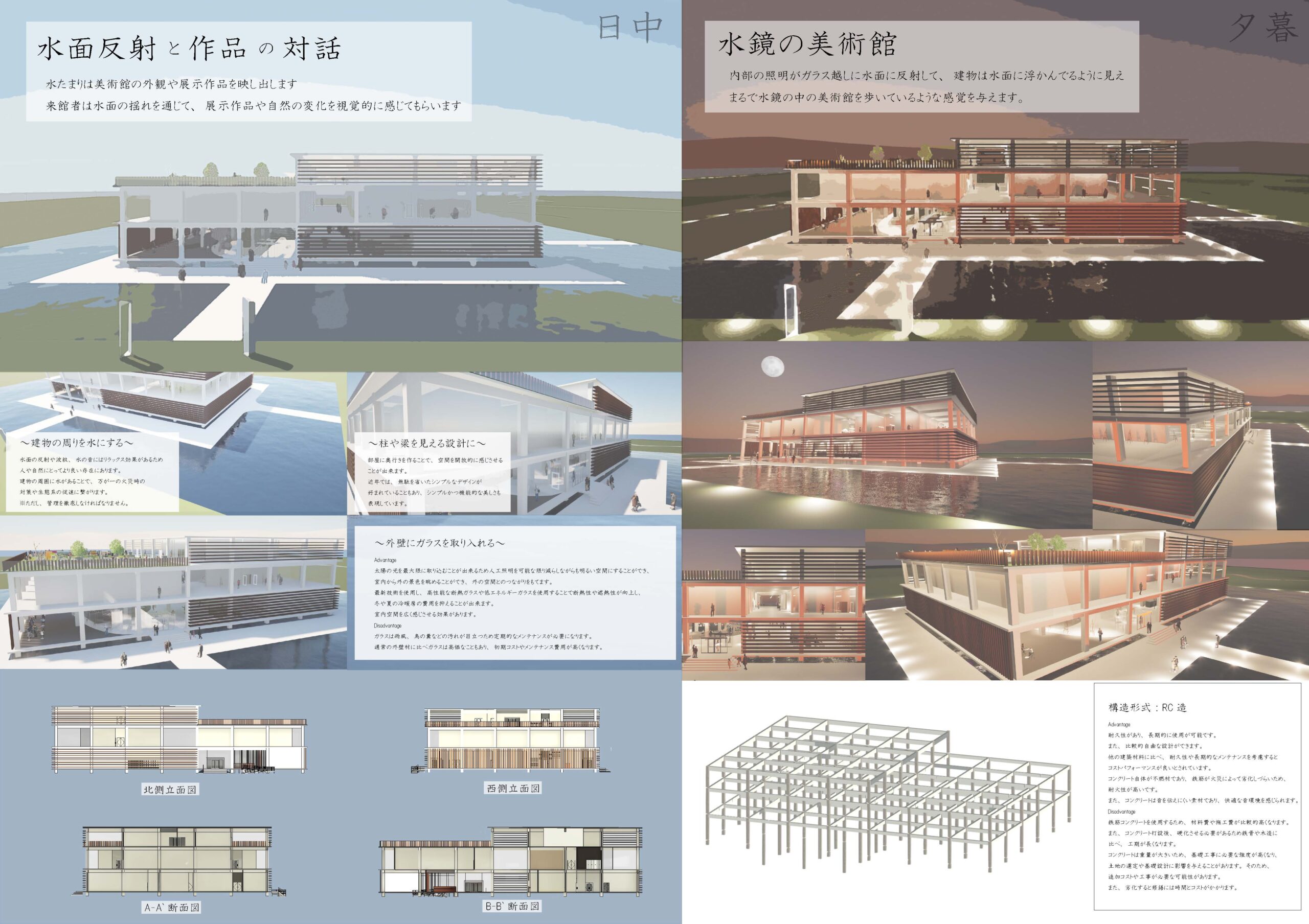この美術館は、建物の周りの水面反射により、作品を視覚や聴覚を通して感じてもらうことをコンセプトに設計しました。他の美術館にはあまり見られない、建物の外壁をガラスにすることにより、周りの景色を眺望でき、室内でも自然を感じることが出来ます。また、1Fにはカフェスペース、最上階には屋外緑化がある為、他には無いひと時を味わうことが出来ます。一般的に展示されている作品だけではなく、地域の方の作品を展示することによりその作品作成者の可能性を少しでも広げることが可能です。