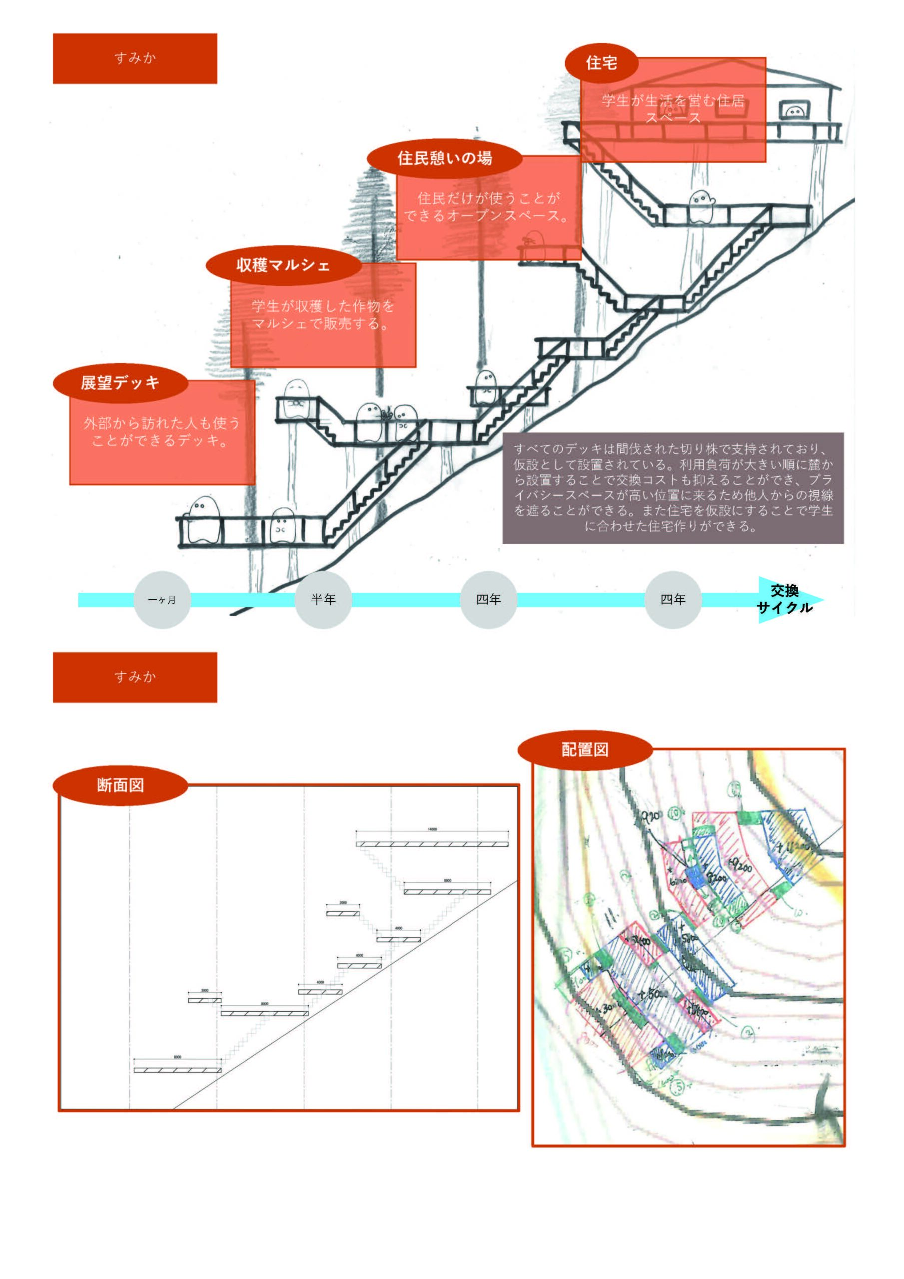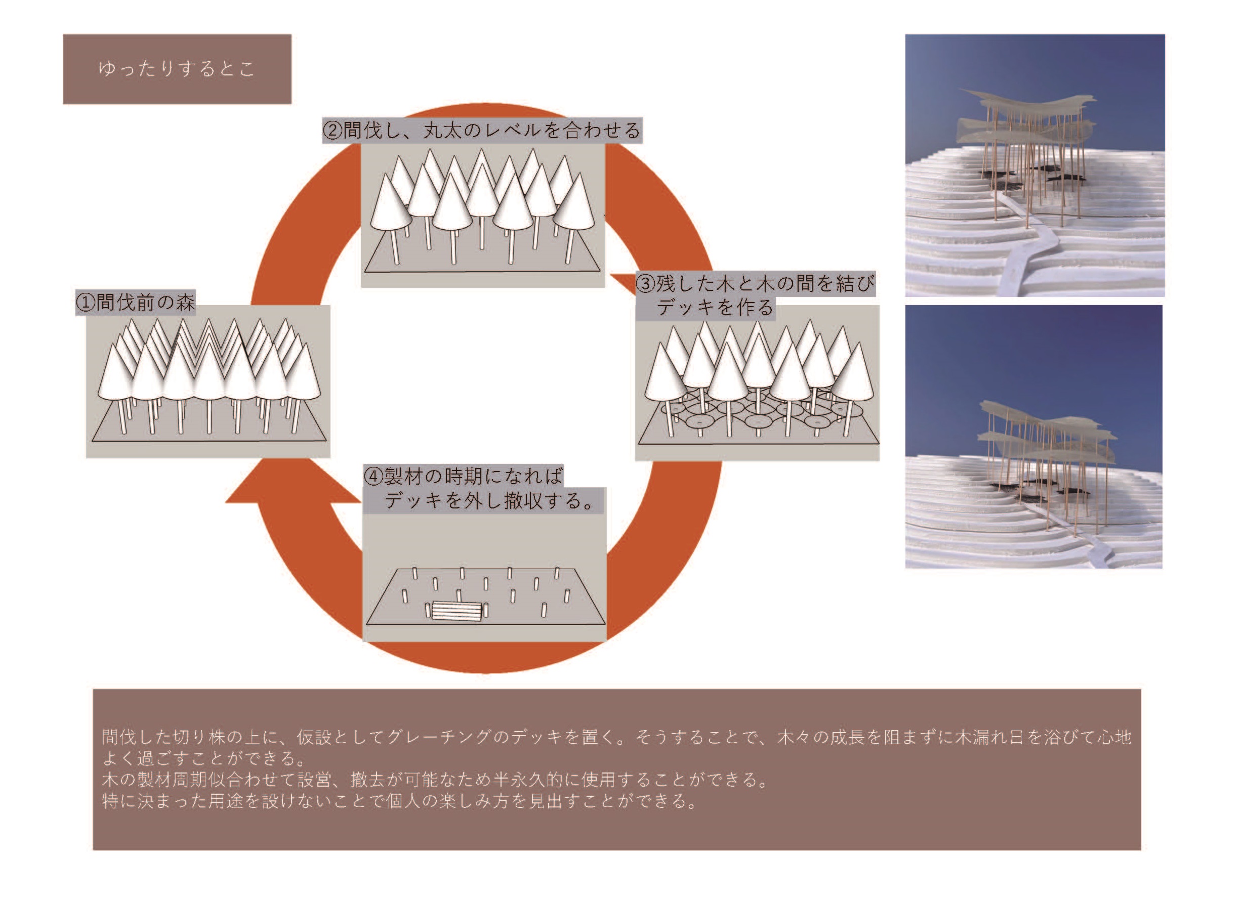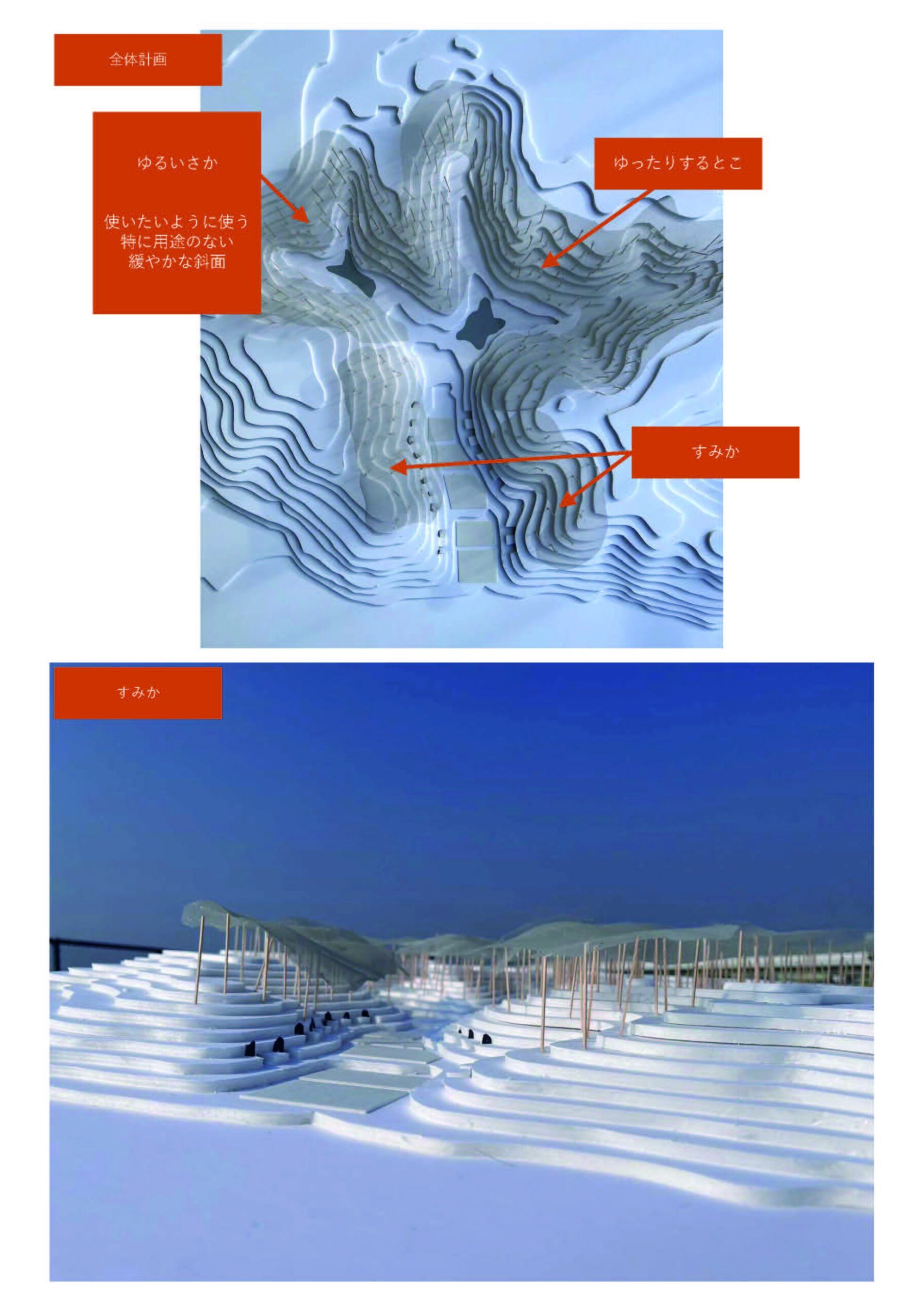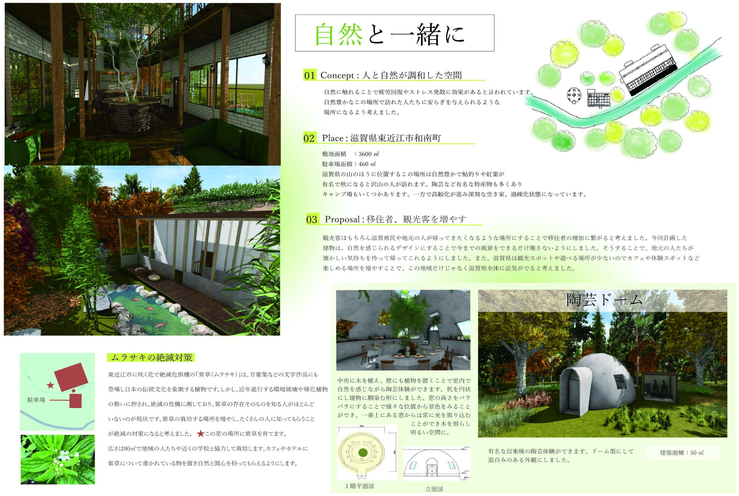 植物や動物を育てる大変さと命への責任などを高校で学んだ彼女だからこその着眼点と、優しさの詰まった提案となった。自然豊かで、大好きな祖父母との思い出が詰まったこの地域で、人間の一方的な計画ではなく、「自然からこの場所を貸していただく」気持ちと、「失われつつあるものを守り育てていく」使命感を持ち合わせた計画である。訪れる人々に安らぎを与えつつも、絶滅危惧植物である「ムラサキ」を通して、自然に対して、人間のこれからの在り方と、行動を考えさせるきっかけとなるだろう。<岡部優季>