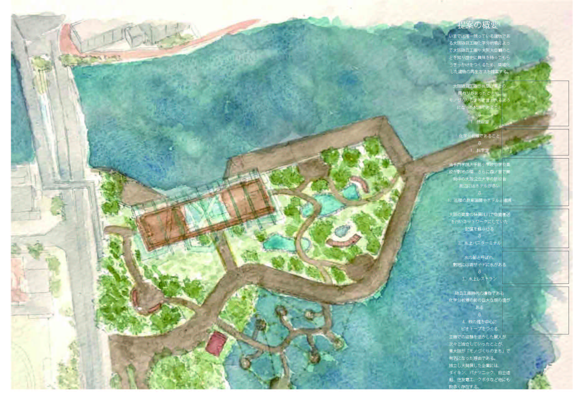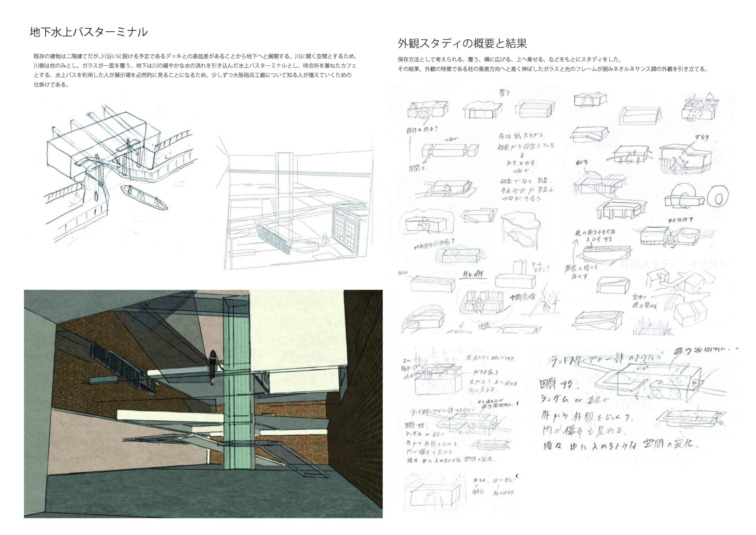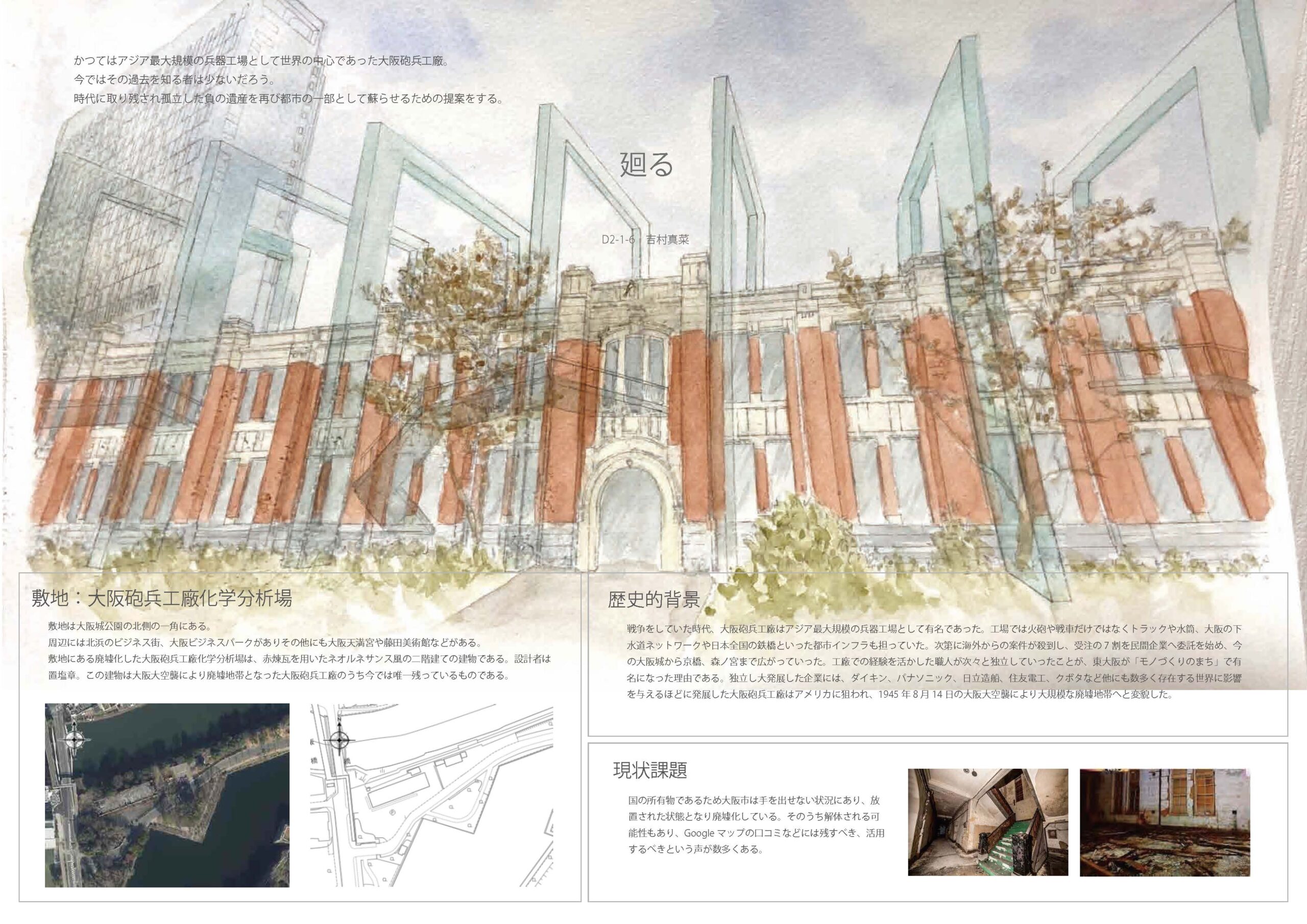 先の大戦から今日まで大阪の発展の歩みを見守ってきた歴史深い遺構の保存・再生が卒業設計の題材となりました。調べをすすめ工廠が未活用であるため解体をという声があがるなか、保存して欲しいという地域の声に耳を傾け、工廠のみではなく周辺の教育施設、環境等をいろいろな手法で繋ぐことで新たな人の流れを生み出しました。また、デザインの視点から建築物の保存・再生に取り組むことで、彼女が真摯に2年間で培ってきたデザイン力を十分に発揮し、彼女らしい素敵な価値・魅力を感じられる作品作りになったのではないかと思います。<大河千春>