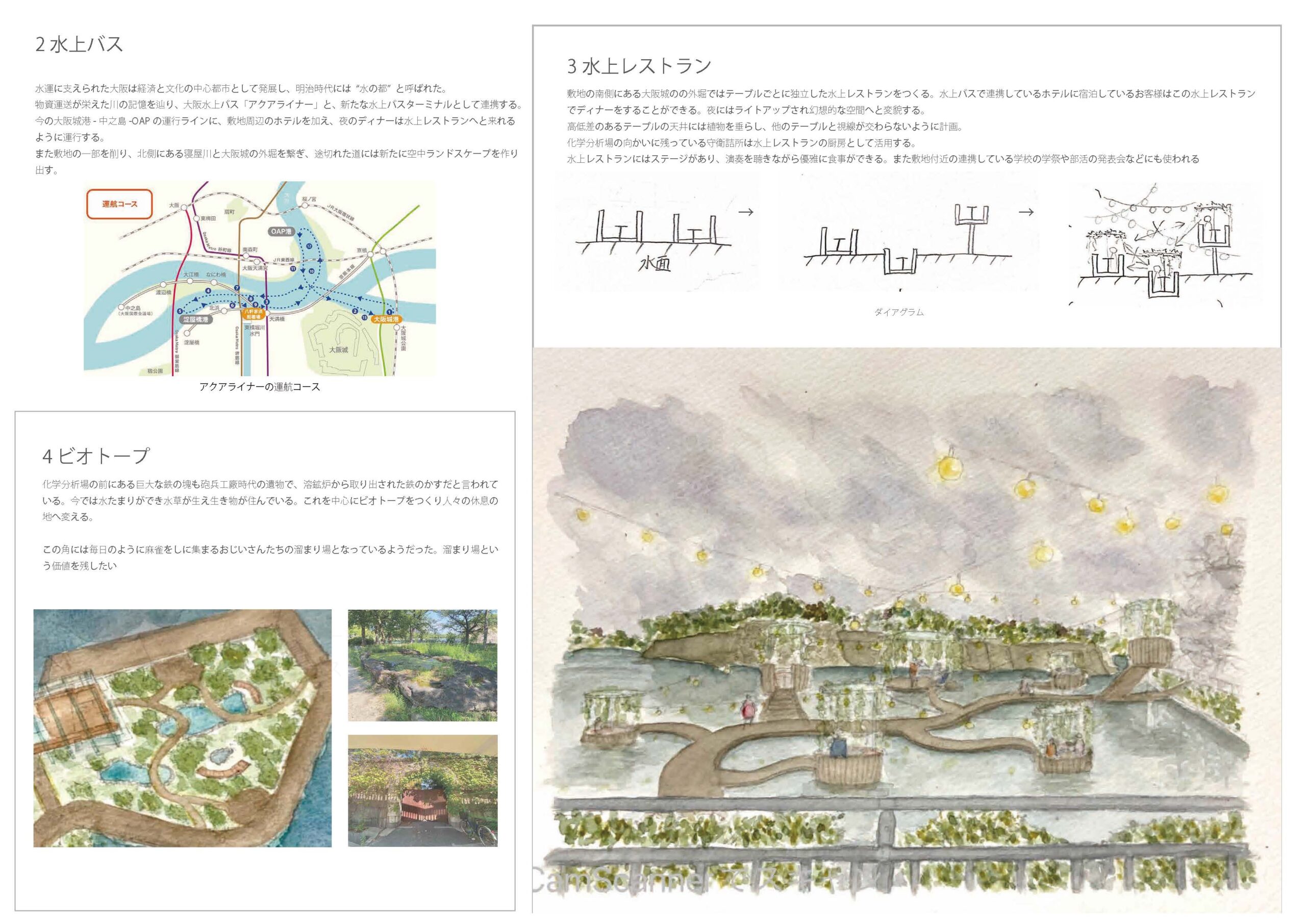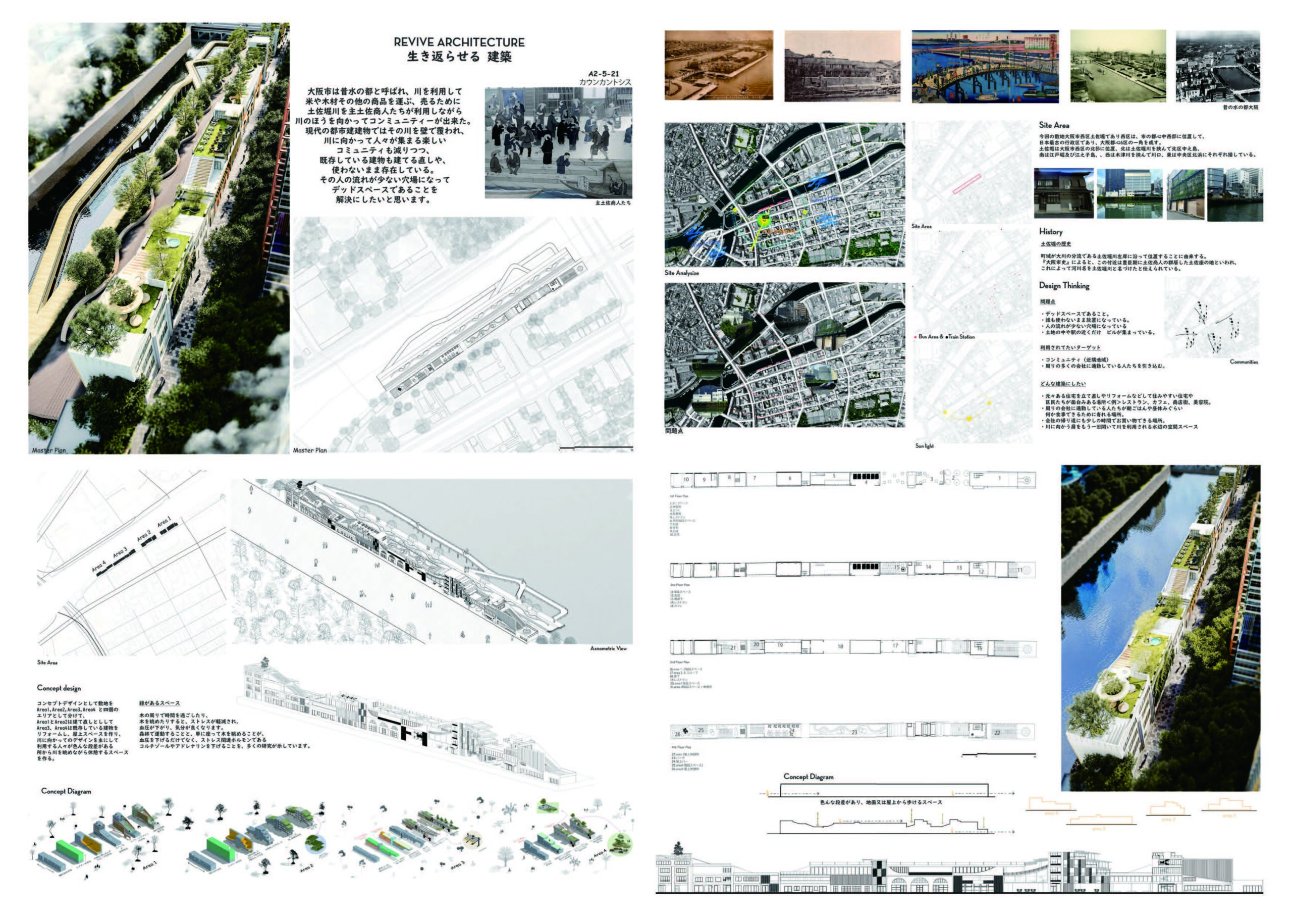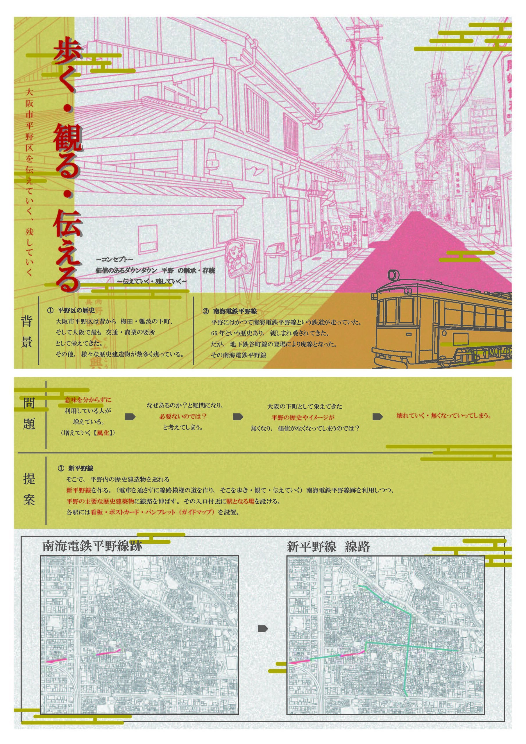 先の大戦から今日まで大阪の発展の歩みを見守ってきた歴史深い遺構の保存・再生が卒業設計の題材となりました。調べをすすめ工廠が未活用であるため解体をという声があがるなか、保存して欲しいという地域の声に耳を傾け、工廠のみではなく周辺の教育施設、環境等をいろいろな手法で繋ぐことで新たな人の流れを生み出しました。また、デザインの視点から建築物の保存・再生に取り組むことで、彼女が真摯に2年間で培ってきたデザイン力を十分に発揮し、彼女らしい素敵な価値・魅力を感じられる作品作りになったのではないかと思います。<大河千春>