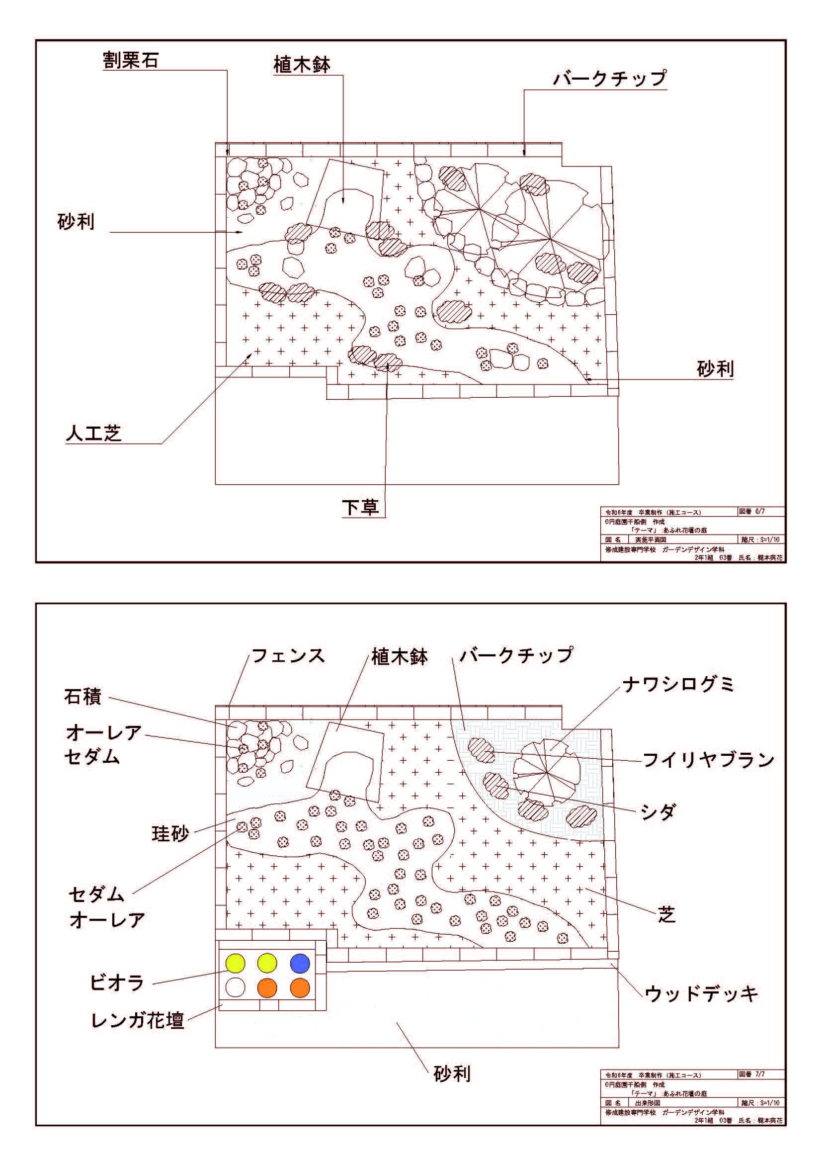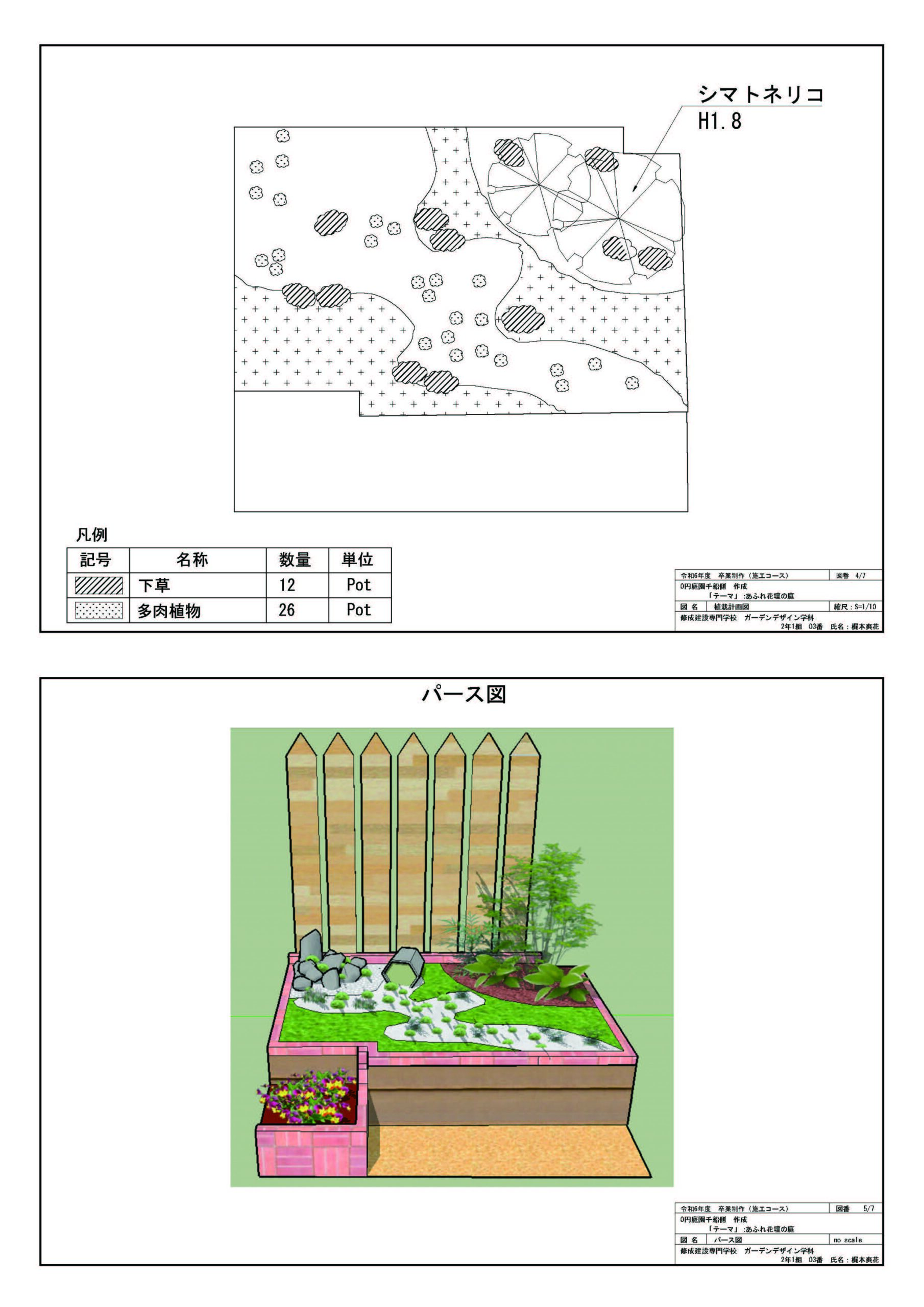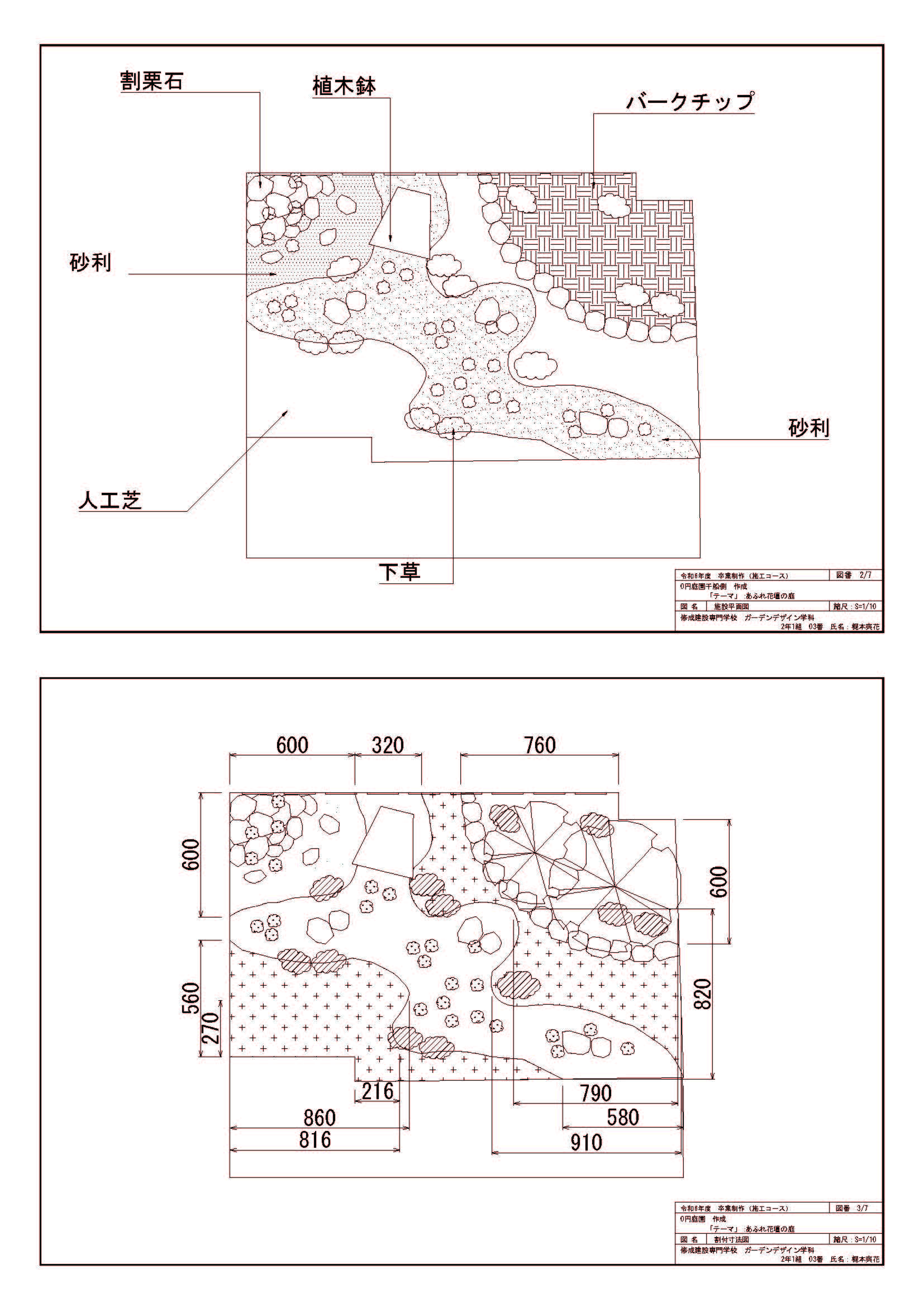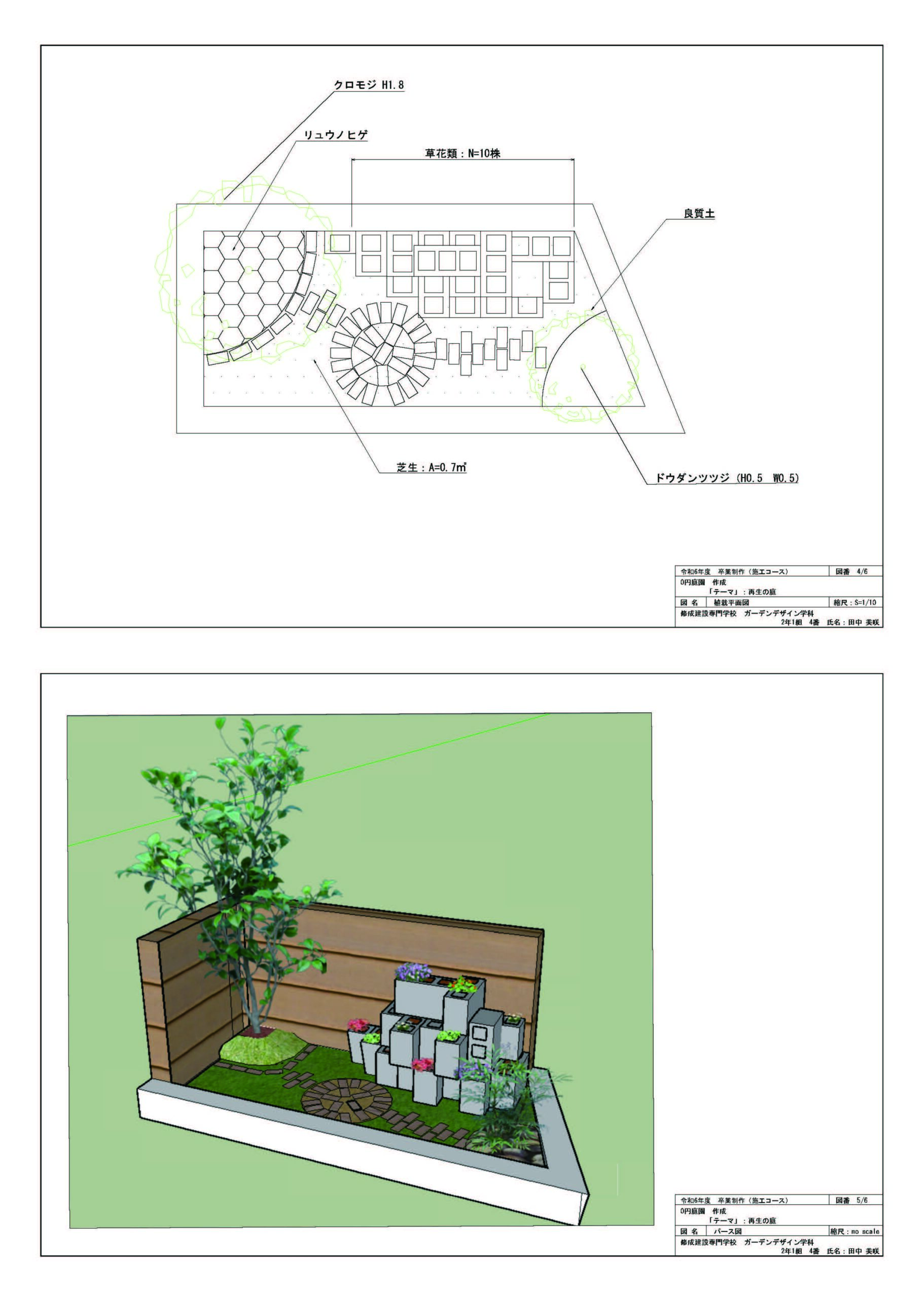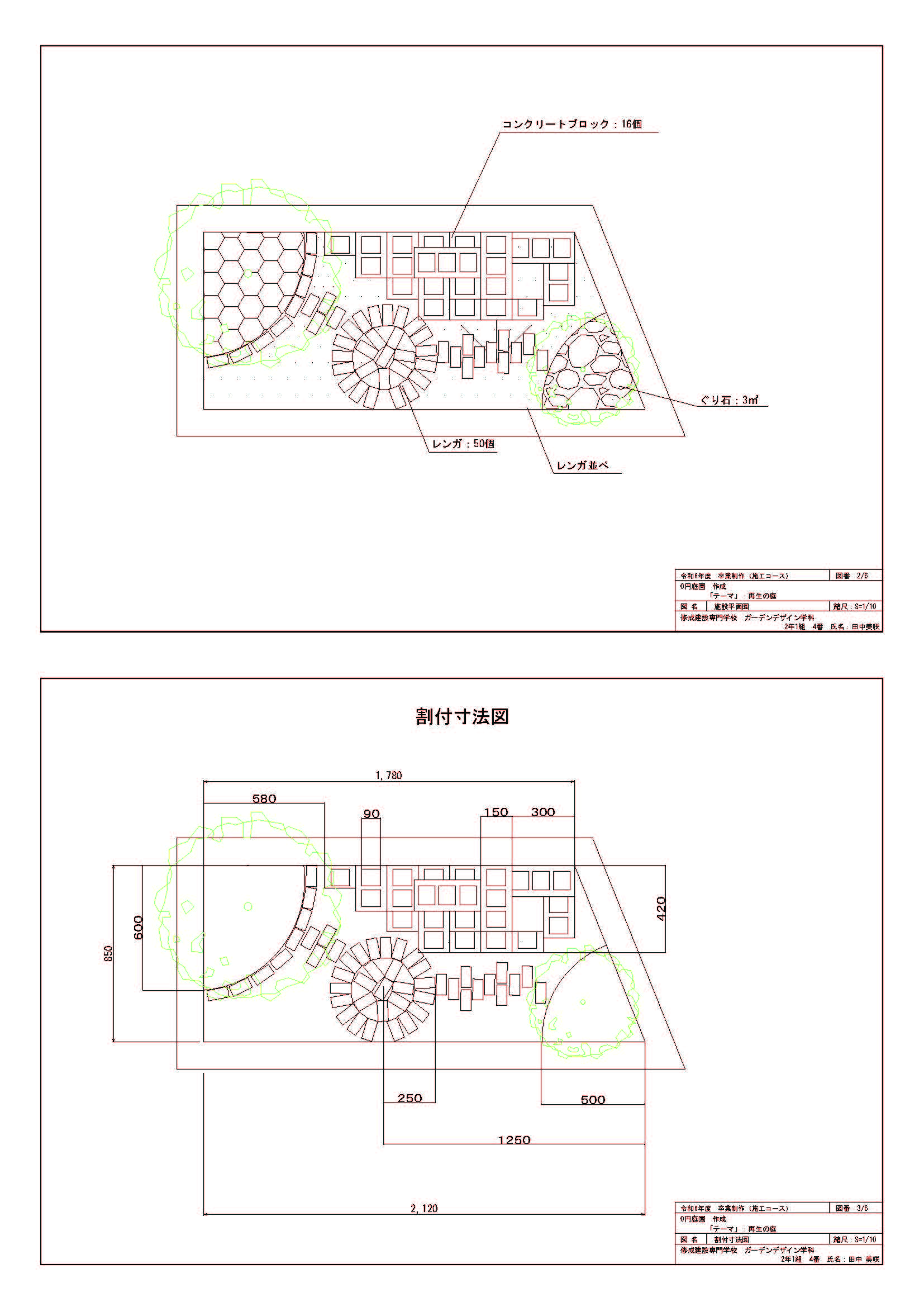この作品のこだわりはコンクリートブロックやレンガをメインに使用したデザインです。施工場所は過去の卒業生である先輩たちが造った庭を改修するということで、元あるものを撤去し私がデザインしたものを施工するということなので、“卒業した先輩たちが積み上げてきたもの“と”私たち学生がこの学校で積み上げていくもの“を表現しました。ブロック1つではなく何個も集まりモノが完成します。この作品を施工する時には1人では解決できないこともありましたが、ブロックのようにチームみんなで集まり協力して作り上げた作品です。廃材を収集してプランを計画して材料を検討してまた計画を練り直して竣工までたどり着きました。これから入学してくる後輩たちにもデザインから施工まで1から自分たちで造り上げる楽しさを、庭を通して伝わればいいなと思っています。最後になりましたが、ご提供いただいた皆様とご協力していただいた皆様にお礼申し上げます。
