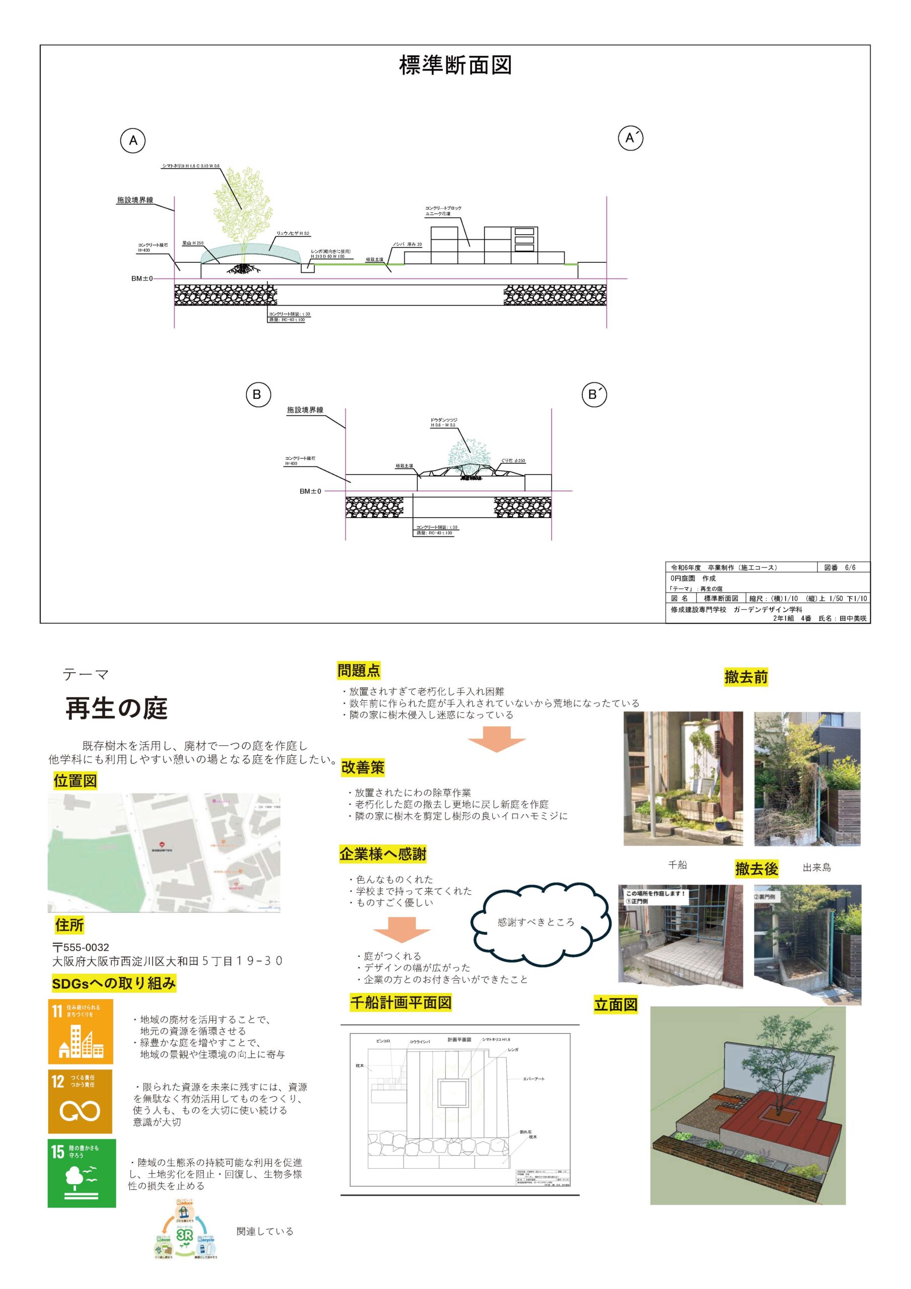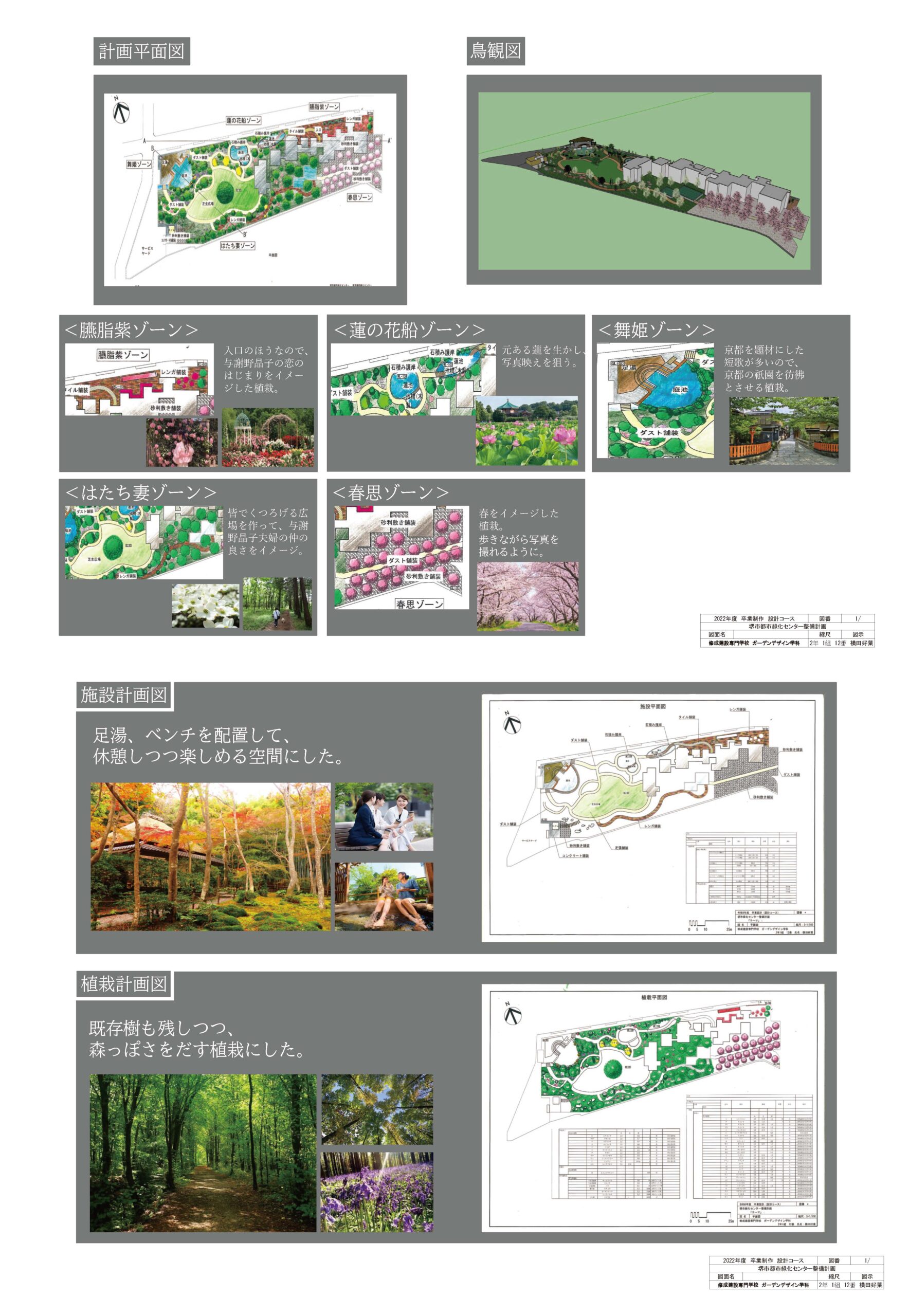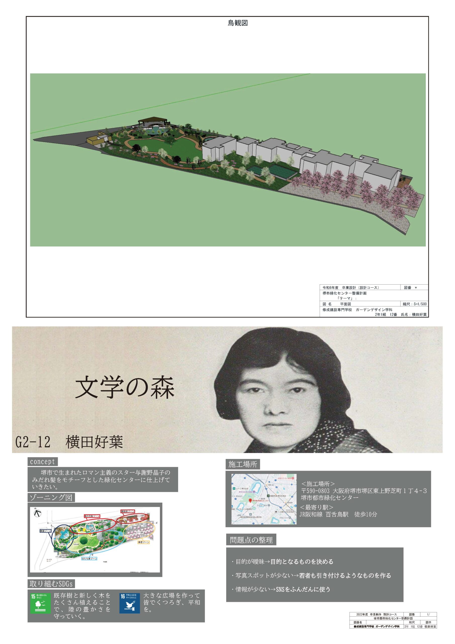 堺市は、豊かな歴史と伝承文化を有する文化都市として知られています。それらを守り堺市がたくさんの人があふれる場所にしたいと思い、SDGsの目標である15「陸の豊かさを守ろう」と16「平和と公正をみんなに」を掲げ、堺市生まれの作家与謝野晶子をモチーフに設計しました。SDGs15ではたくさんの緑とホタル保護を、SDGs16ではみんなの憩いの場となる大きな広場を設けました。また、実のなる植物を植栽することや写真映えするような植栽にすることで、ファミリー層や若者にアプローチをかけ、集客効果があるようにしました。こんなに規模の大きい計画設計をするのは初めての経験だったので、樹木選定や、どのようにすれば人が集まるかなどを考えて設計するのに苦慮しましたが、先生方の助言もありやり遂げることができました。自分の成長に繋がったと思います。この経験を活かし、卒業後も精進していきたいと思います。