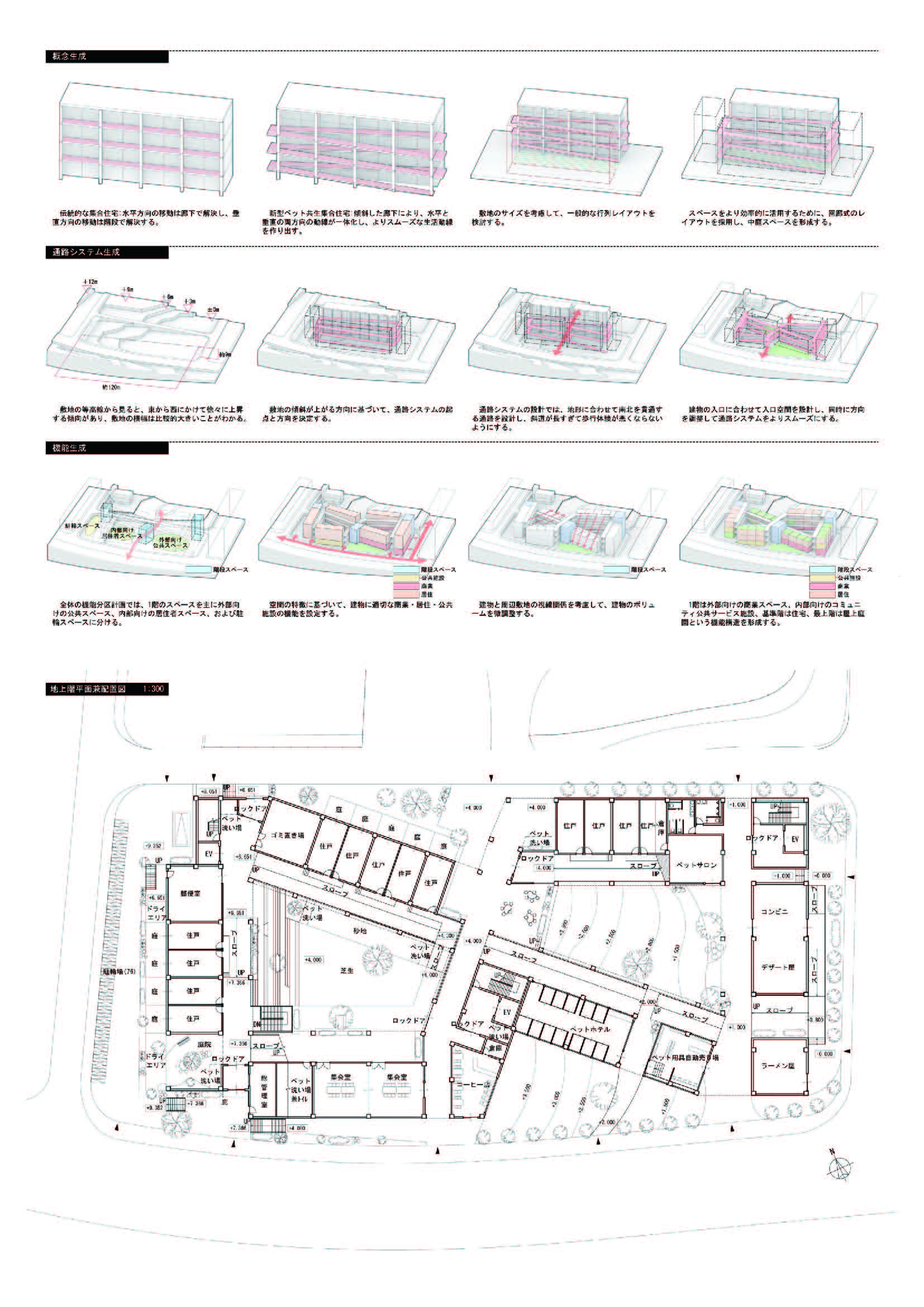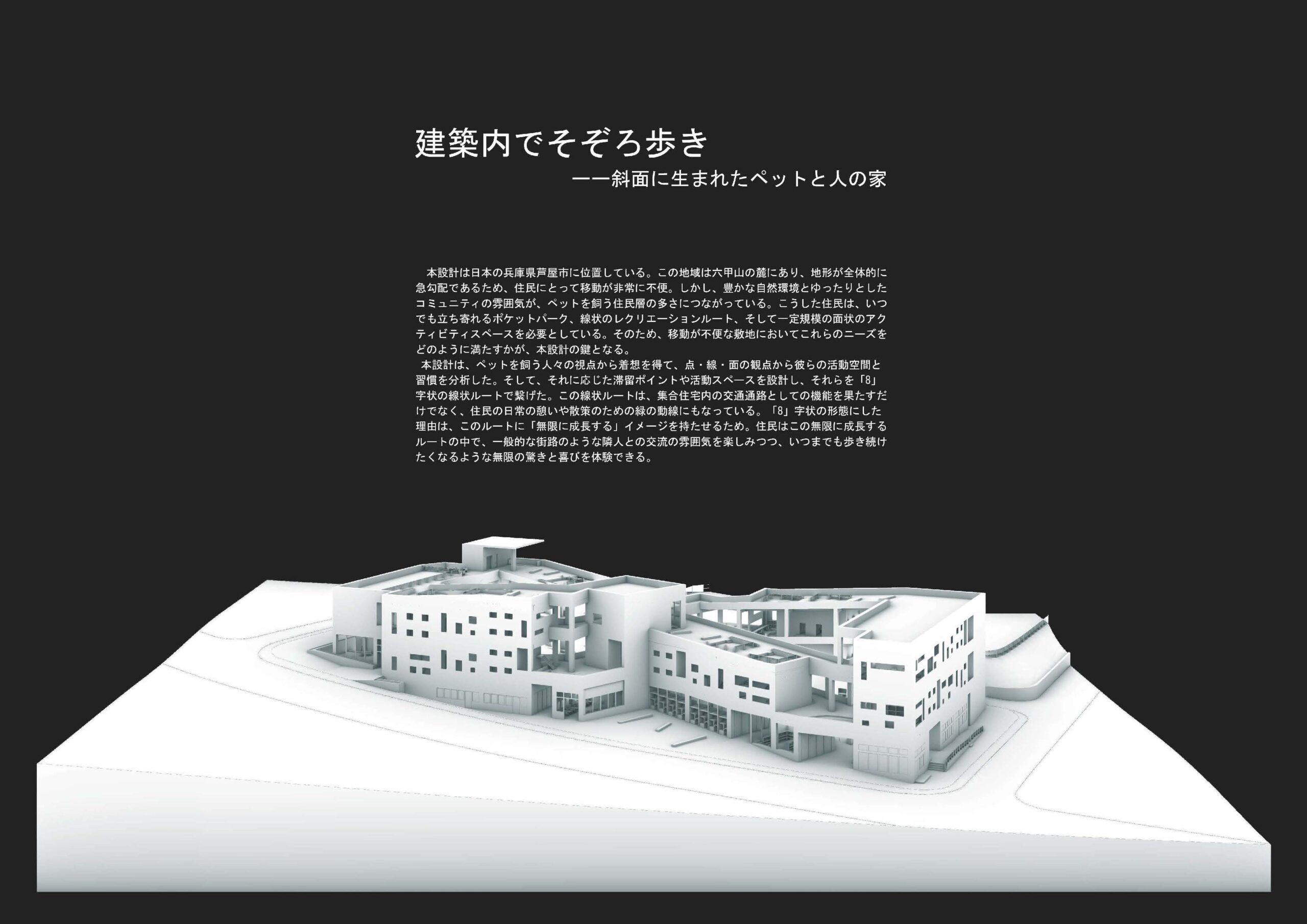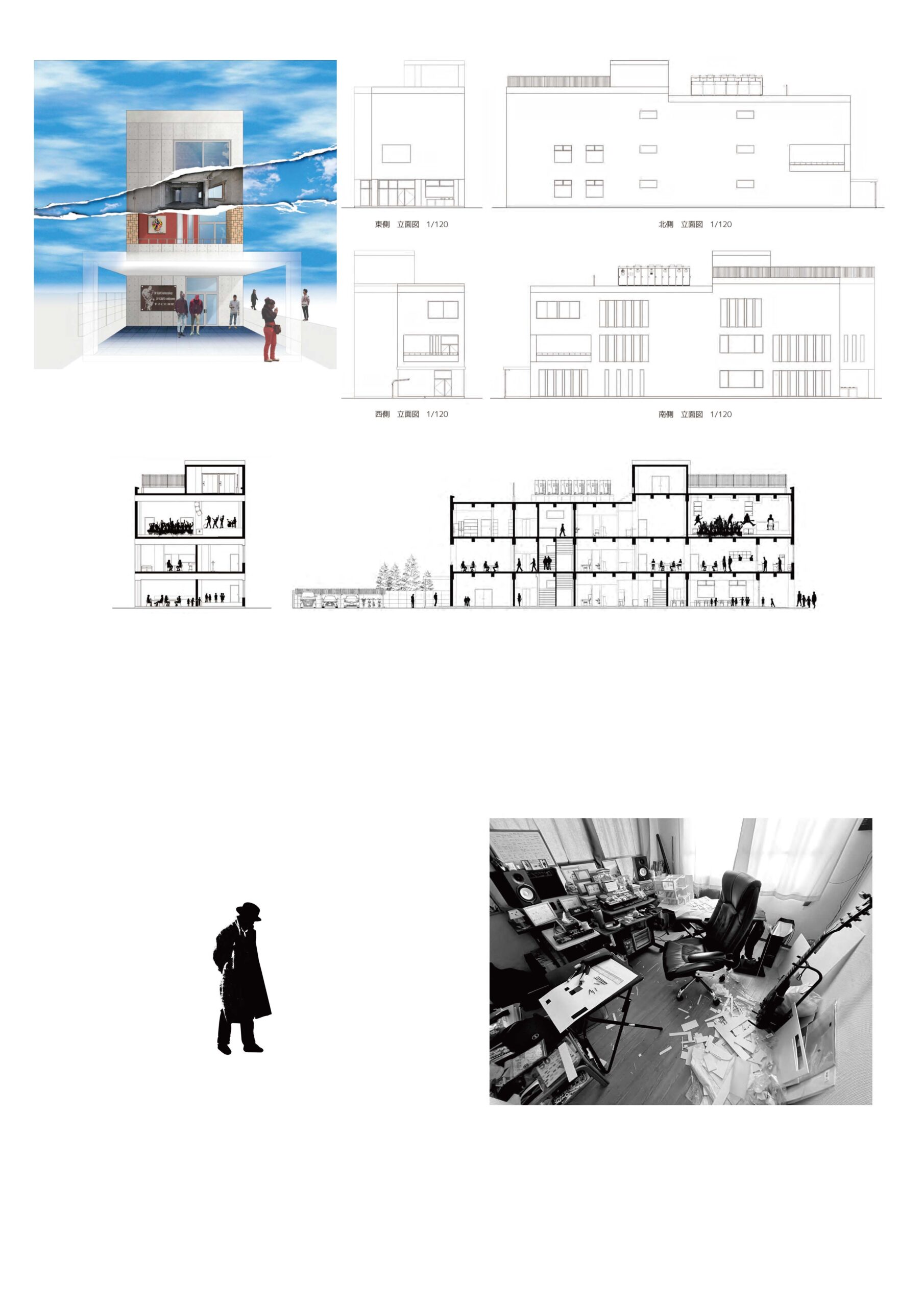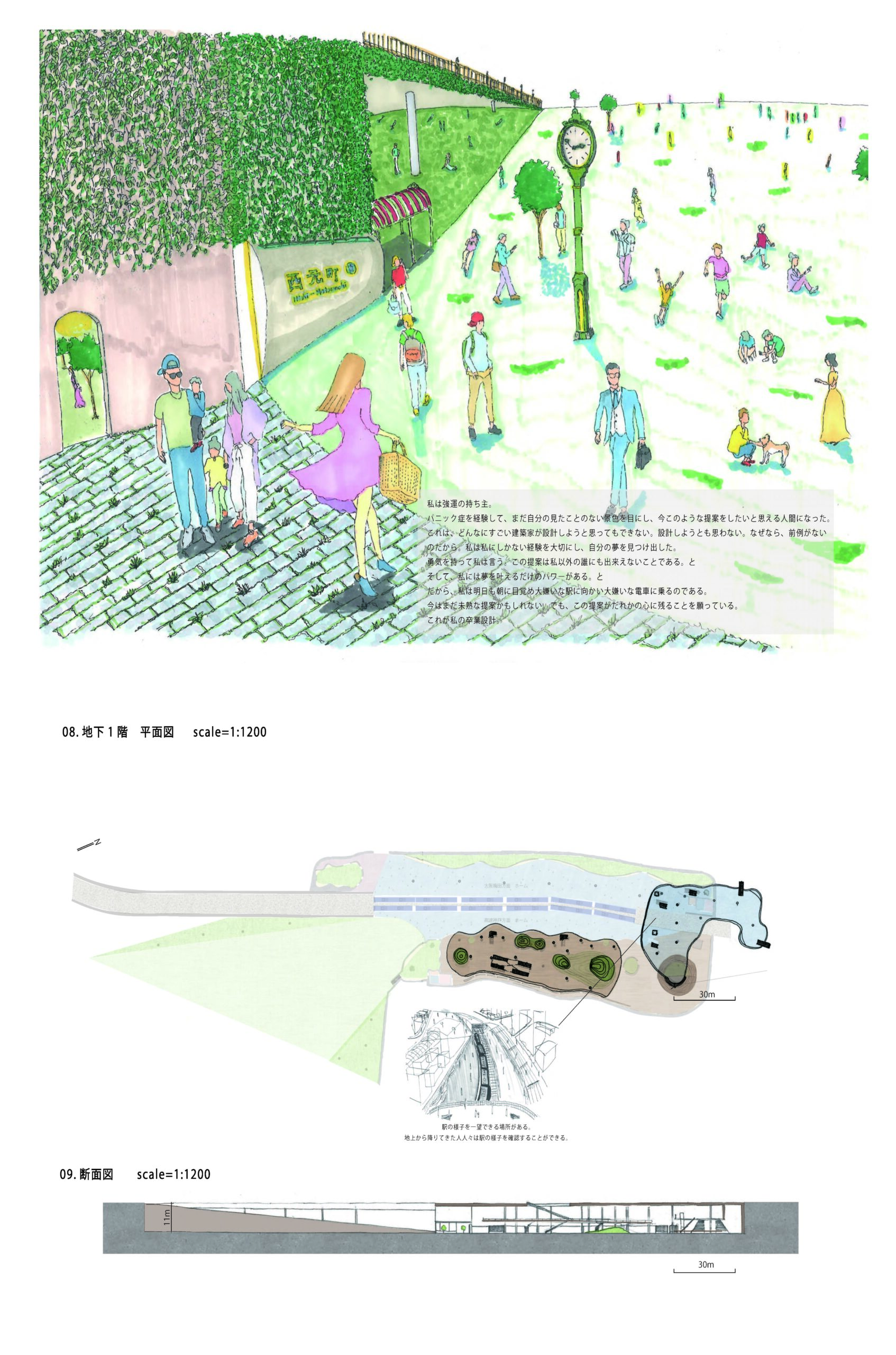 建築学科意匠設計コースにゼミ制度が導入されて7年目となる。学生の作品を見ると大きく変容を遂げたことがわかる。そこには大学の卒業設計に劣らない質を目指した作品もあれば、専門学校ならではの個性を磨き上げた作品もある。彼の作品は後者である。元々持っていた表現技術によるプレゼンテーションは審査会で「デベロッパーみたい」「どこかで見たように感じる」といった批判も受けたが突き進むよう指導した。担当教員間でしばしば議題となる「専門学校らしさ」の正解が一つ出たのかもしれない。<田中おと吉>