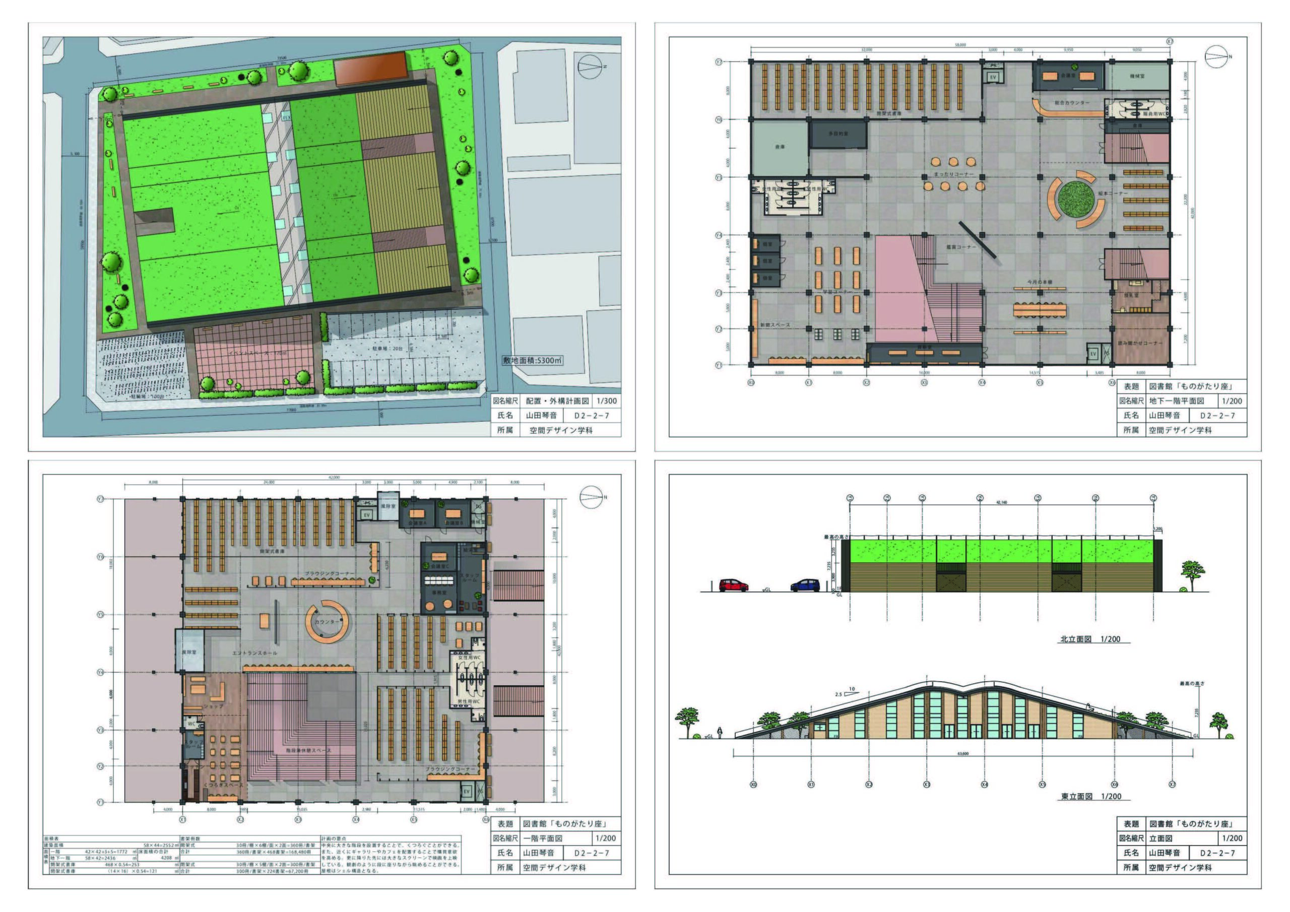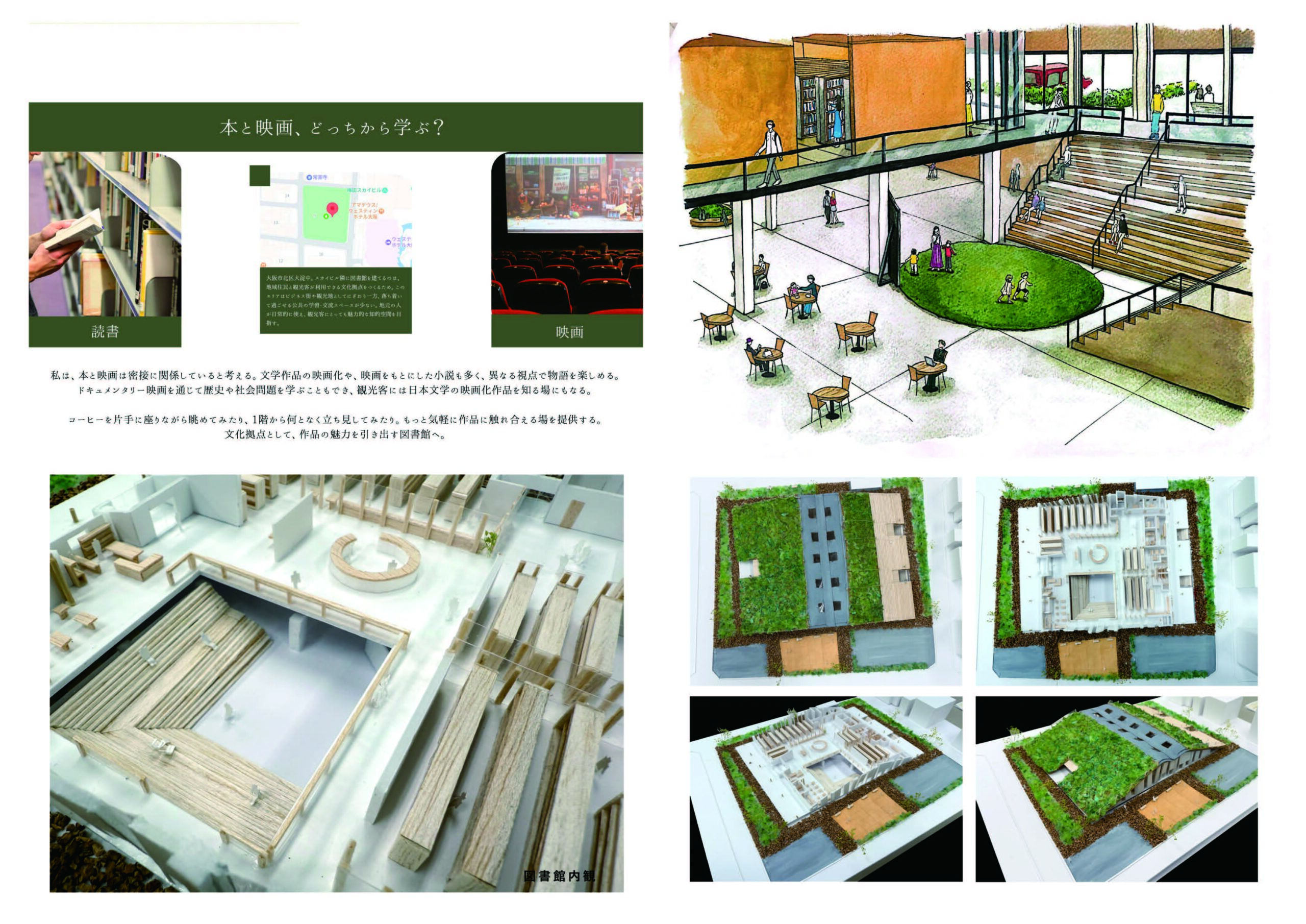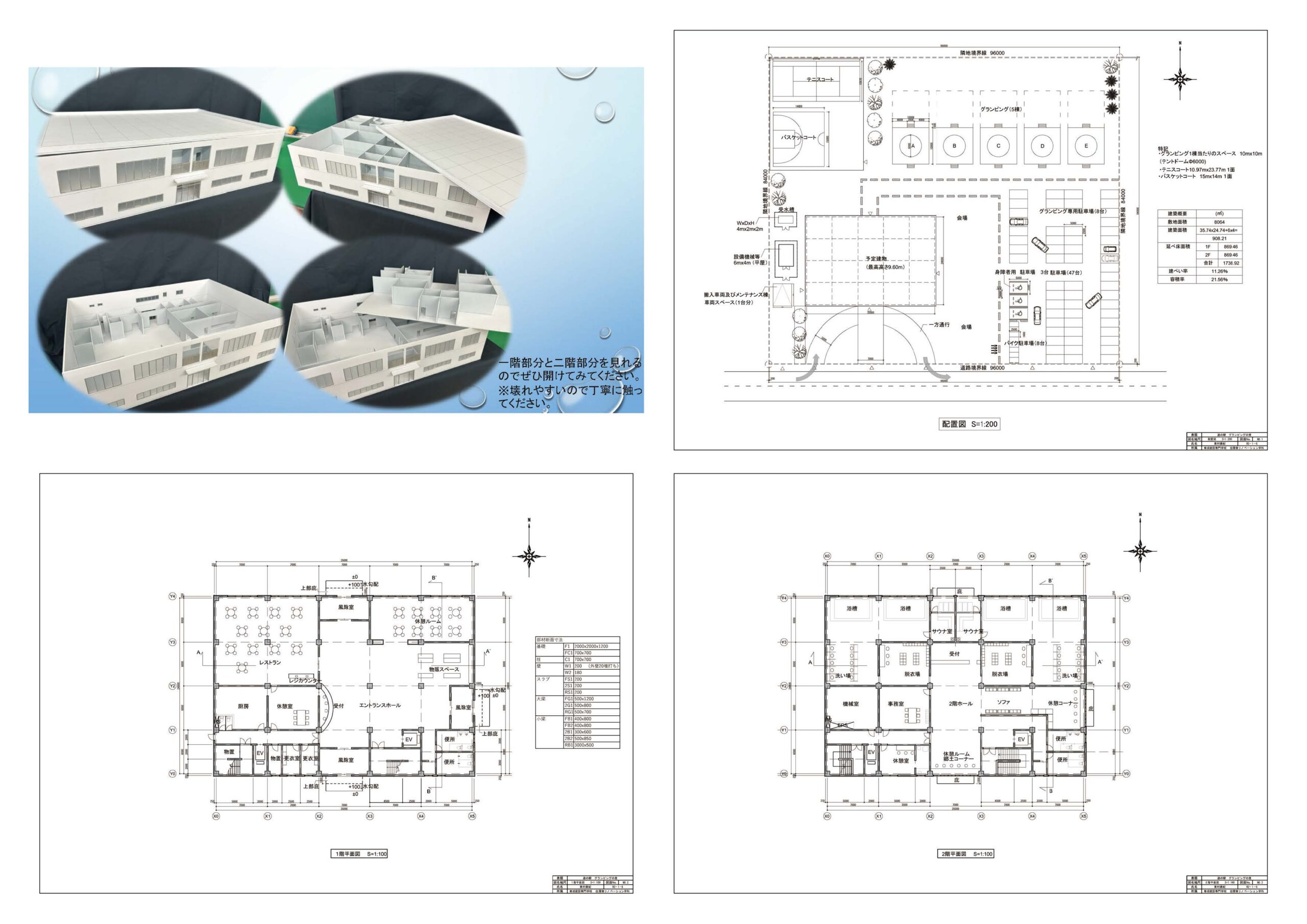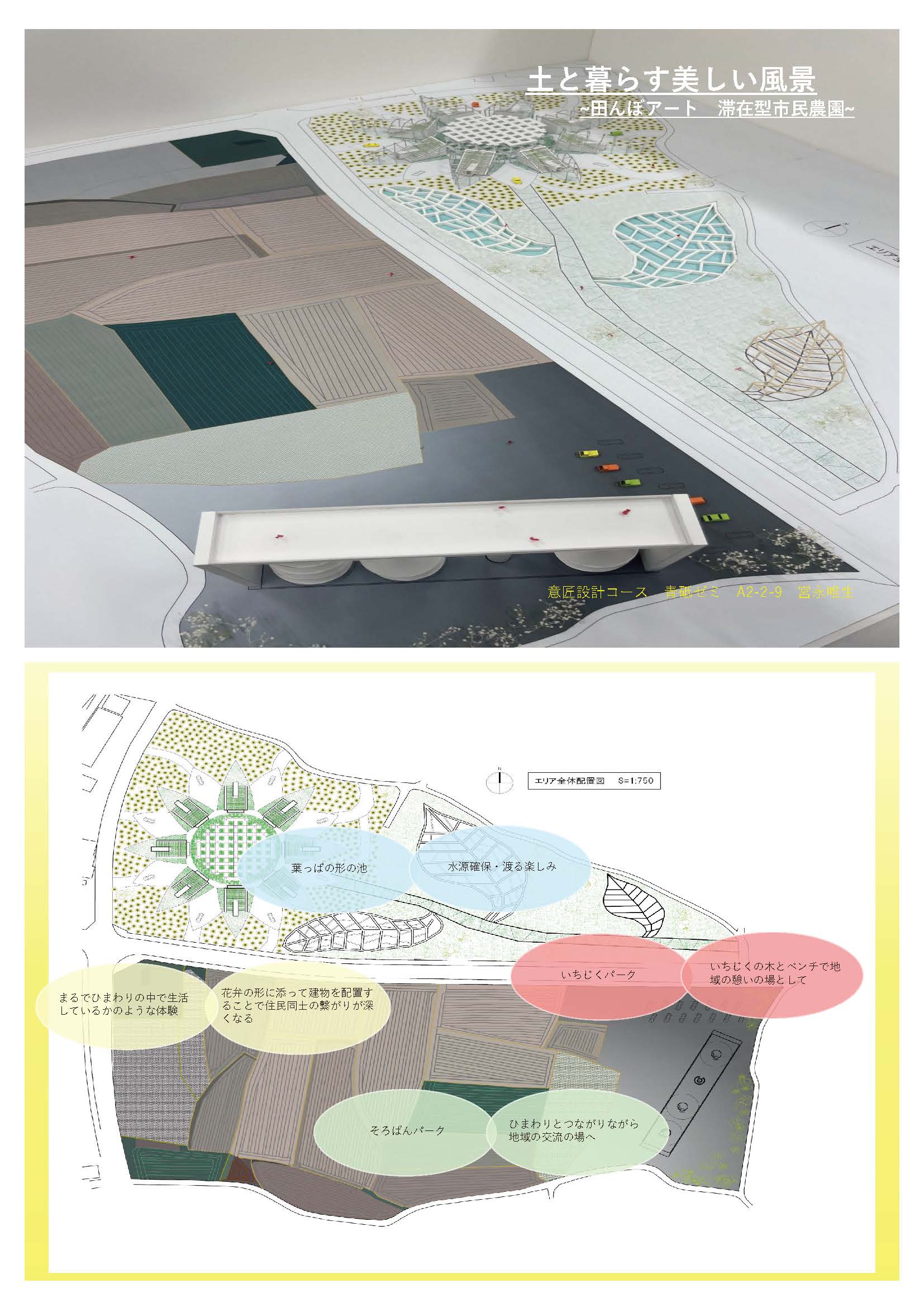 自由創作という幅広い捉え方のもと、パースやスケッチアップなどを使用せずに自分の持ったイメージを具現化するのに苦労し、行き着いたのがインテリアでした。彼女の実体験をもとに未就学児からお年寄りまでが幅広く使える施設を検討し、外構部分にも重きを置いて制作しました。舗装構成や植栽の計画にも手掛け「建設」として幅広く考えすべてのものに意味が存在する一つの空間を考えることで建築だけではなく土木や造園などの大きな分野で考えた「修成」ならではの作品が出来上がりました。1/300模型も細部にこだわり、書類関係もどうすれば手に取ってもらえるかを考えました。この先分野に捉われず「建設」を考えた経験が生きてくることを期待します。<広田莉音>