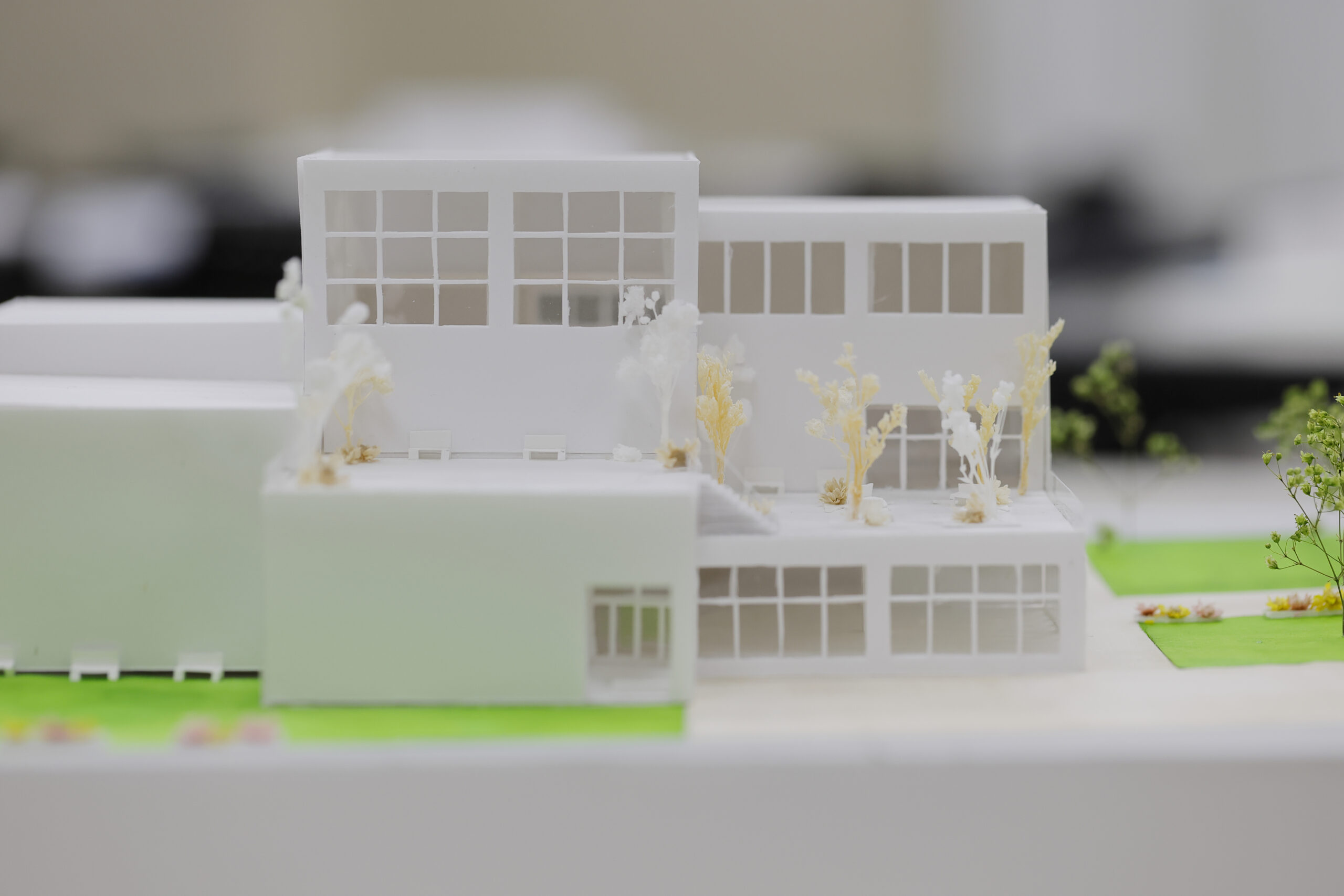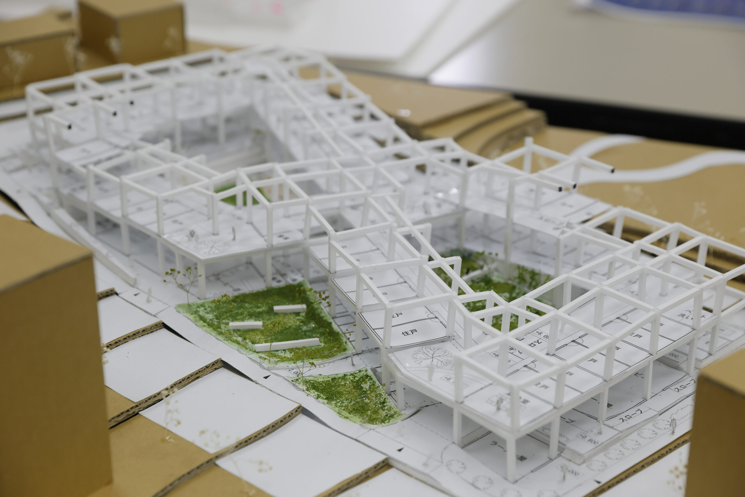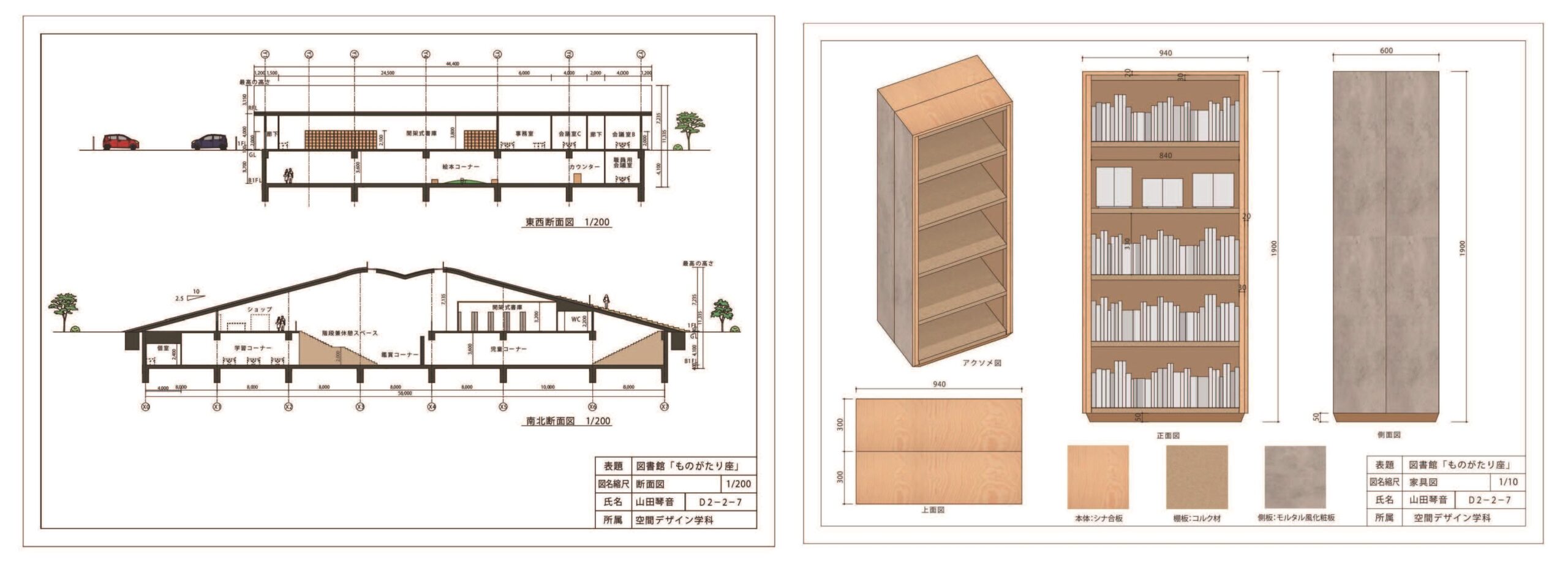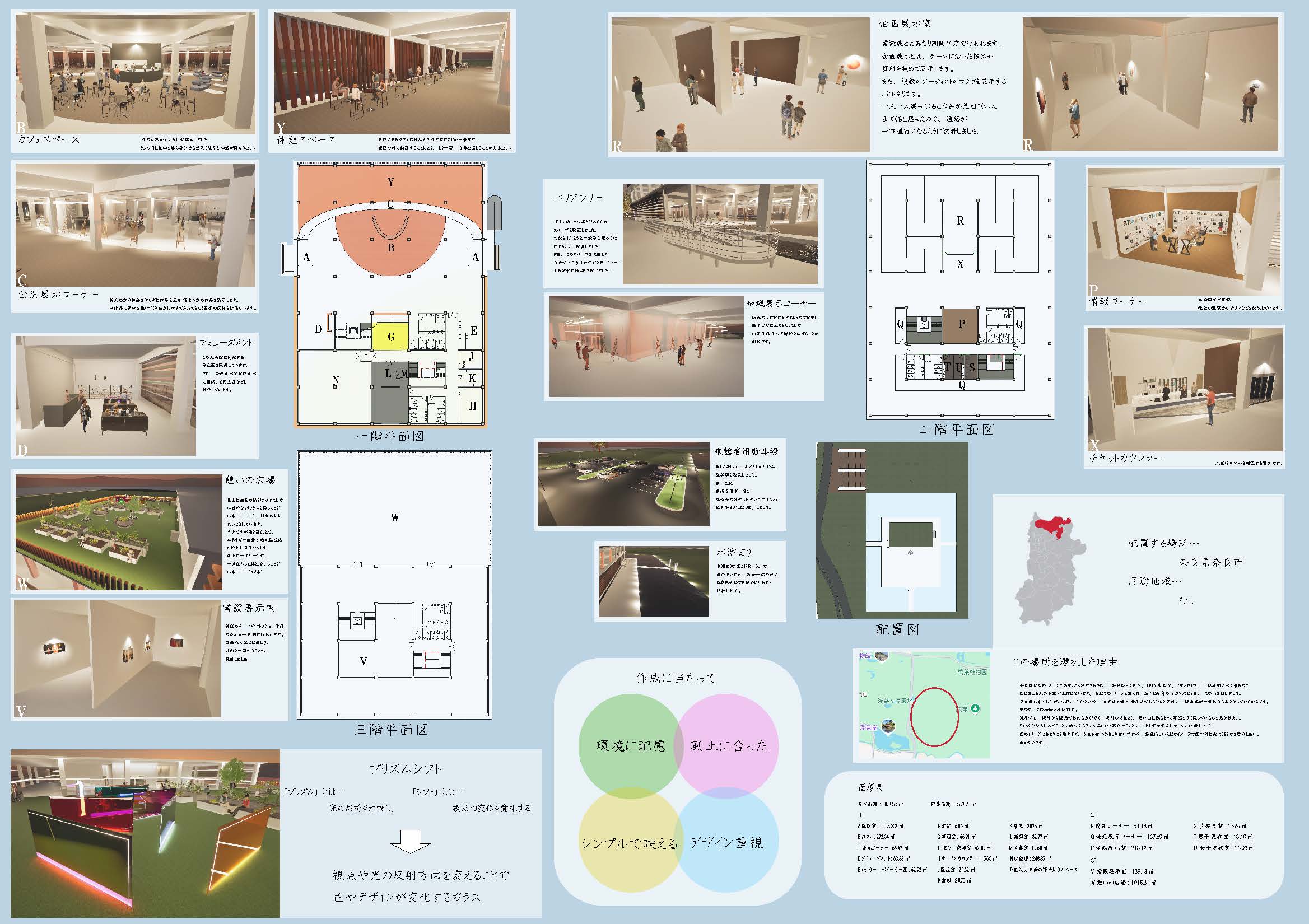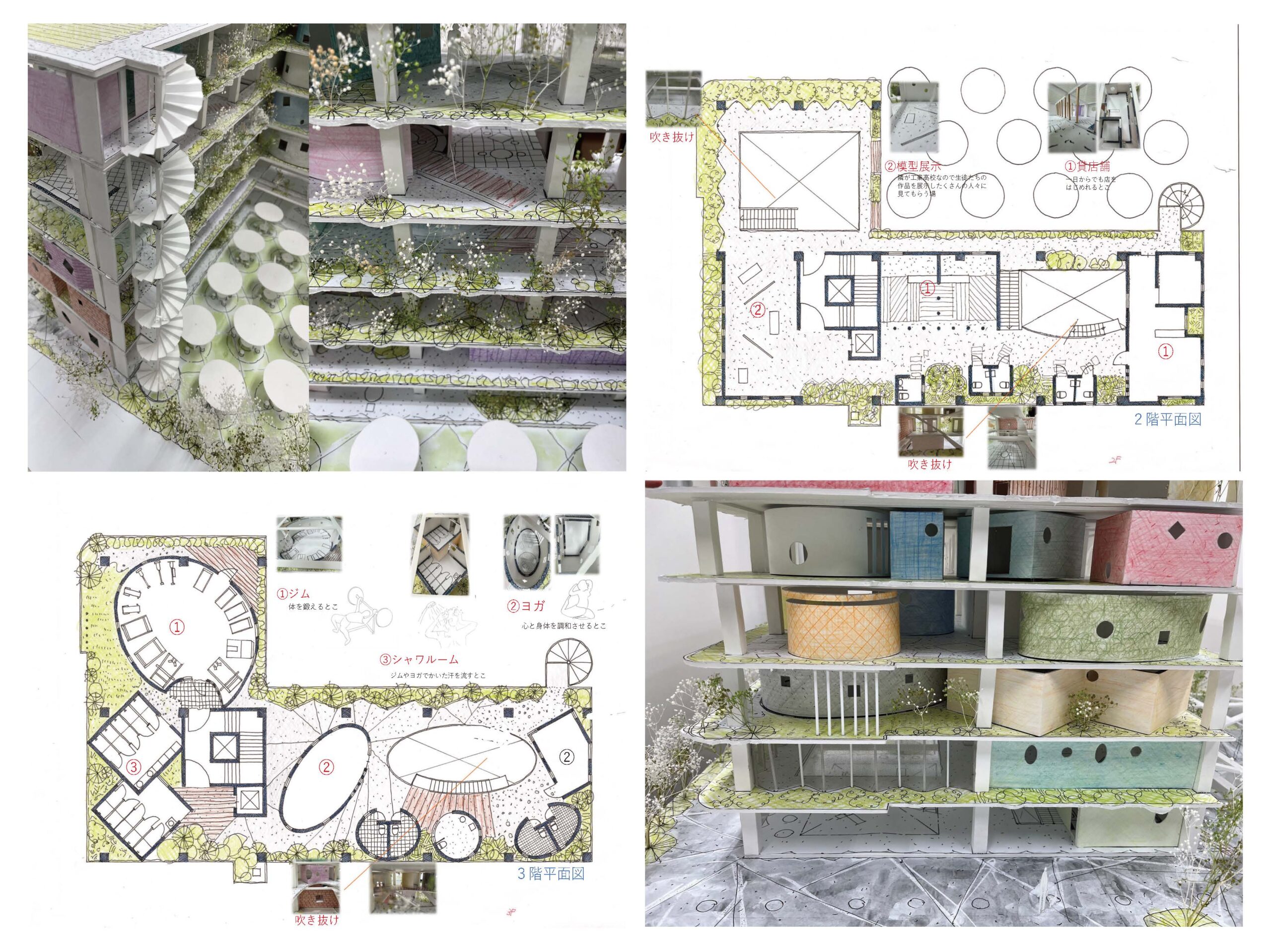 自由創作という幅広い捉え方のもと、パースやスケッチアップなどを使用せずに自分の持ったイメージを具現化するのに苦労し、行き着いたのがインテリアでした。彼女の実体験をもとに未就学児からお年寄りまでが幅広く使える施設を検討し、外構部分にも重きを置いて制作しました。舗装構成や植栽の計画にも手掛け「建設」として幅広く考えすべてのものに意味が存在する一つの空間を考えることで建築だけではなく土木や造園などの大きな分野で考えた「修成」ならではの作品が出来上がりました。1/300模型も細部にこだわり、書類関係もどうすれば手に取ってもらえるかを考えました。この先分野に捉われず「建設」を考えた経験が生きてくることを期待します。<広田莉音>