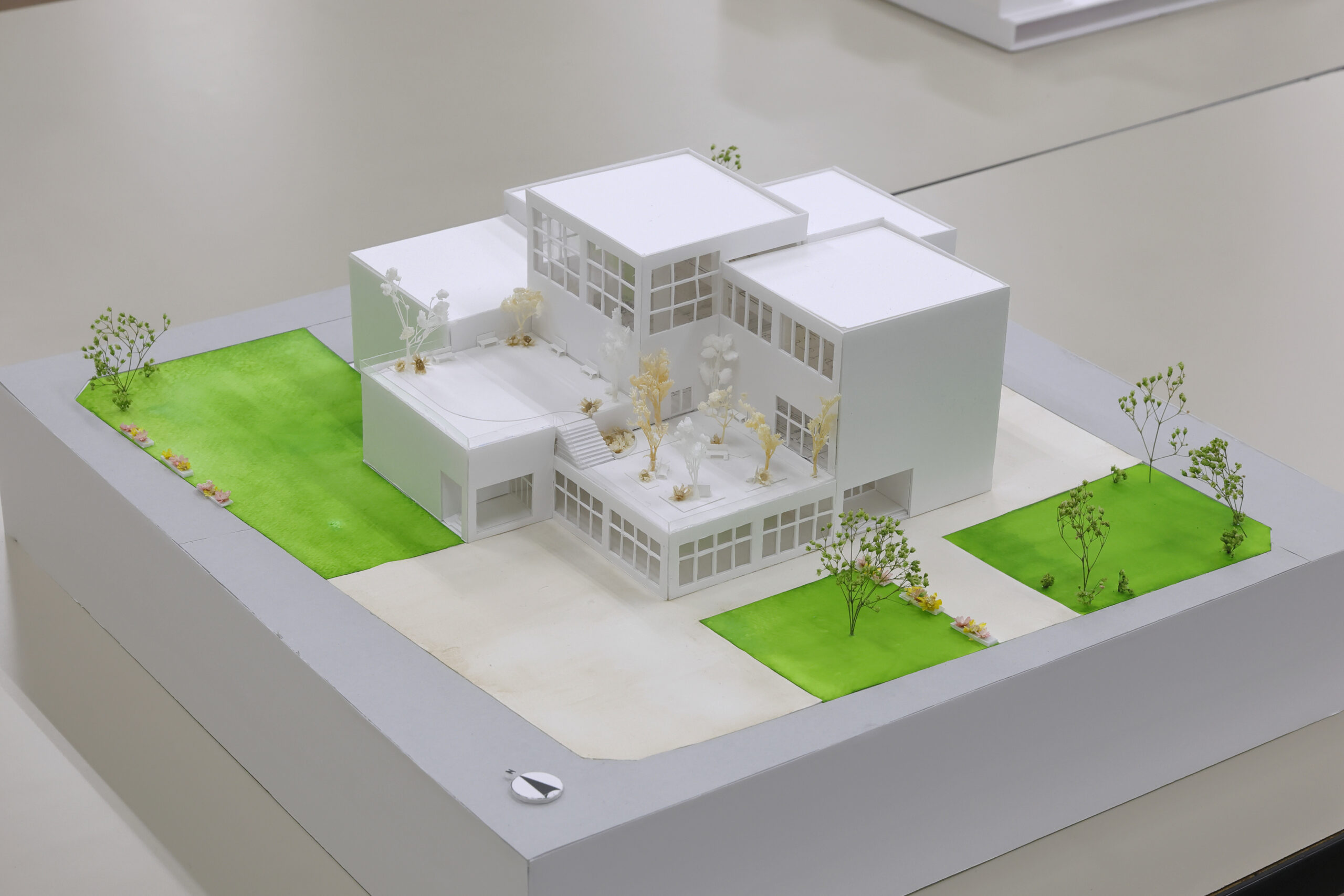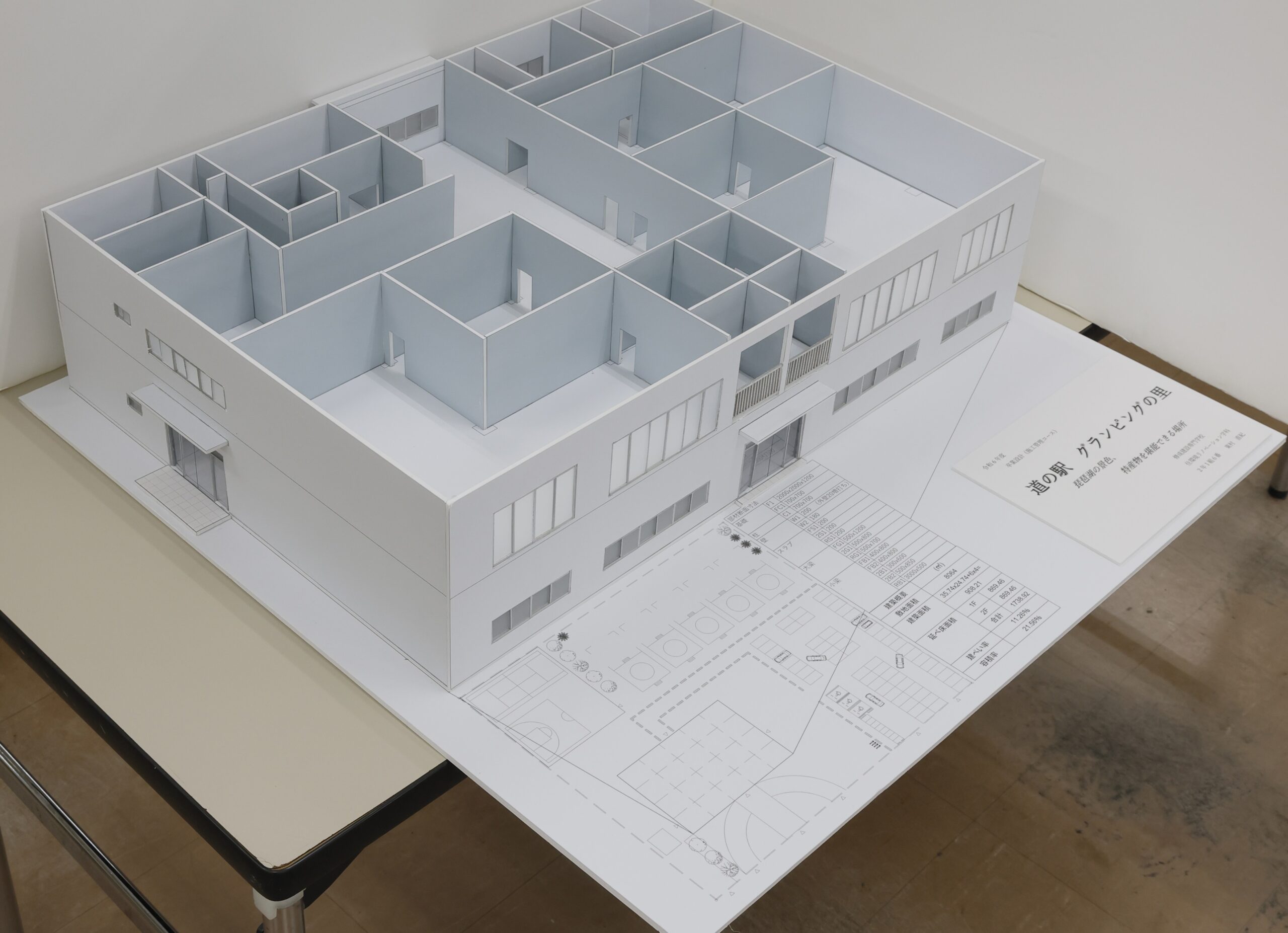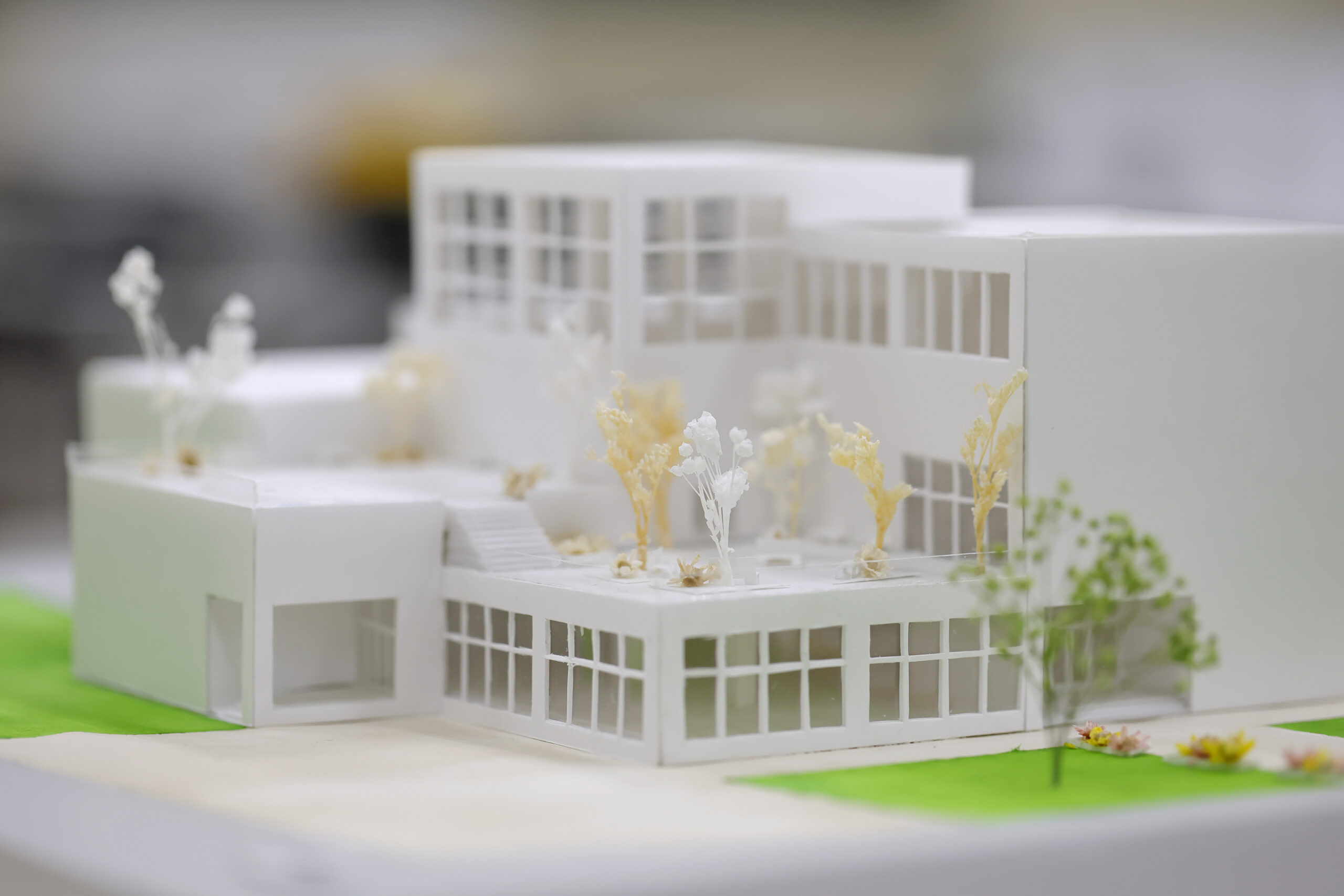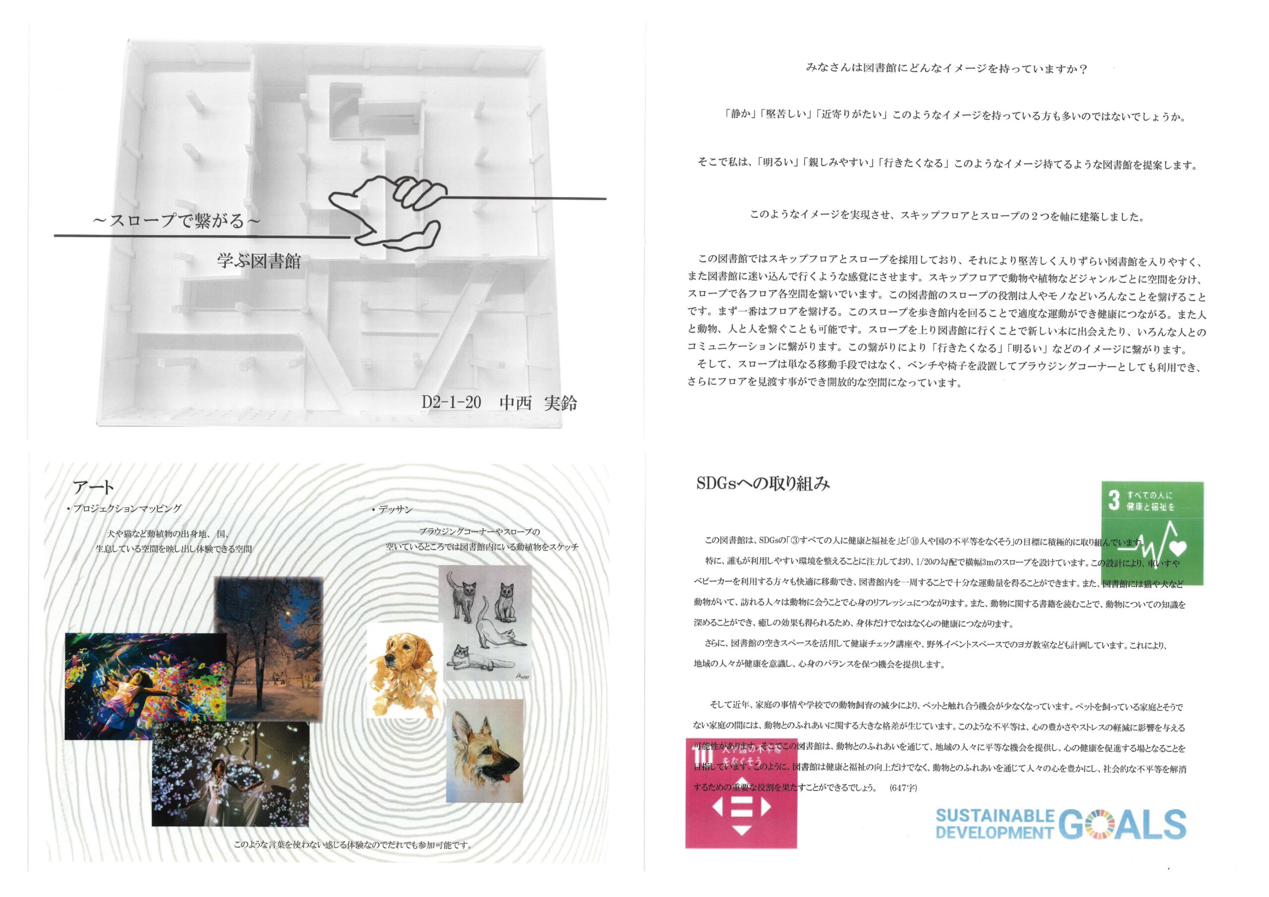 自由創作という幅広い捉え方のもと、パースやスケッチアップなどを使用せずに自分の持ったイメージを具現化するのに苦労し、行き着いたのがインテリアでした。彼女の実体験をもとに未就学児からお年寄りまでが幅広く使える施設を検討し、外構部分にも重きを置いて制作しました。舗装構成や植栽の計画にも手掛け「建設」として幅広く考えすべてのものに意味が存在する一つの空間を考えることで建築だけではなく土木や造園などの大きな分野で考えた「修成」ならではの作品が出来上がりました。1/300模型も細部にこだわり、書類関係もどうすれば手に取ってもらえるかを考えました。この先分野に捉われず「建設」を考えた経験が生きてくることを期待します。<広田莉音>