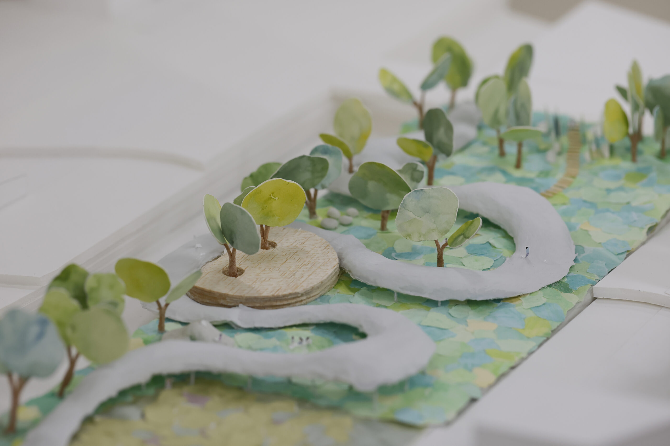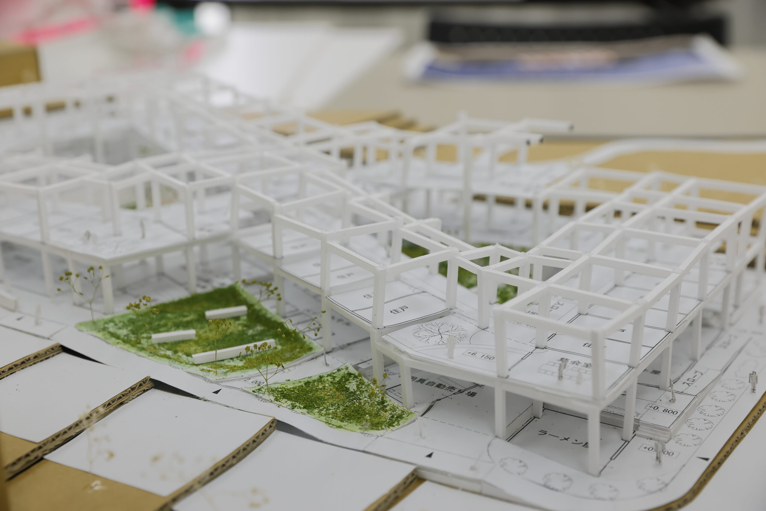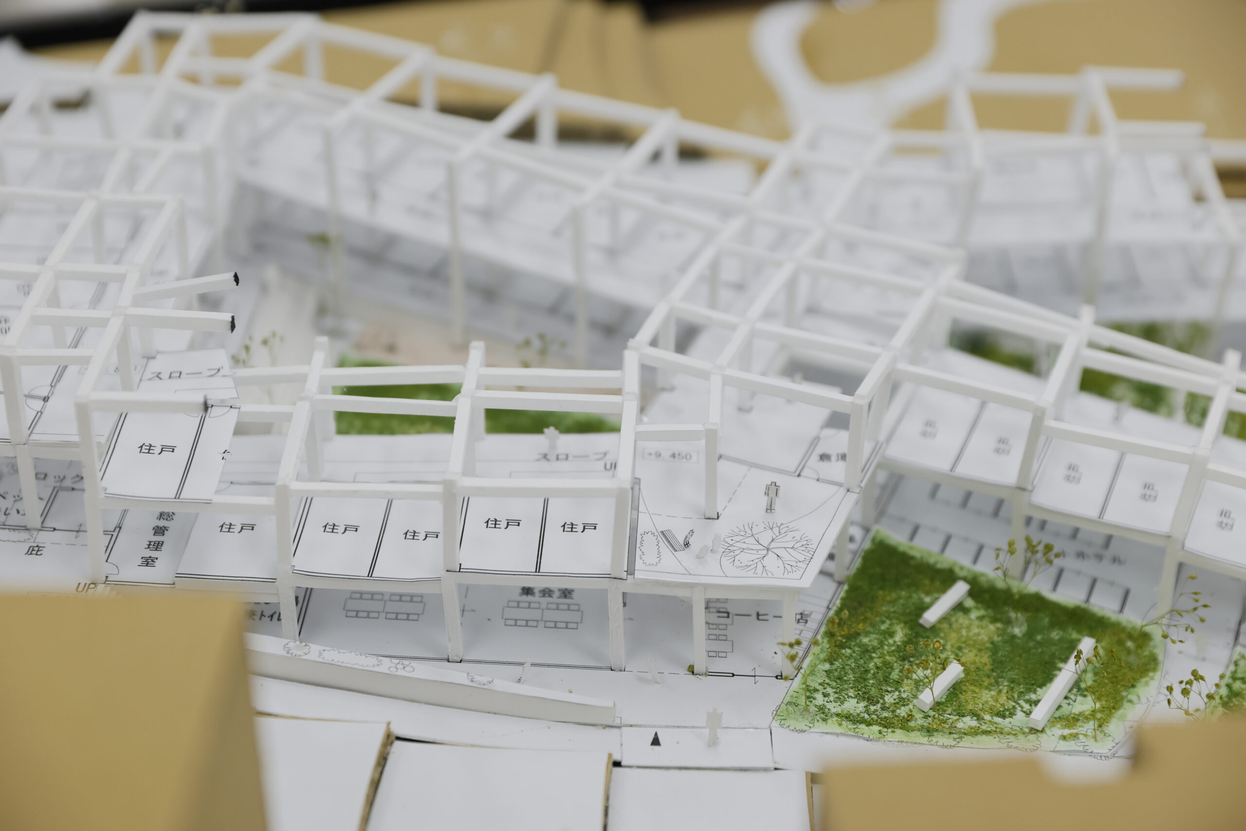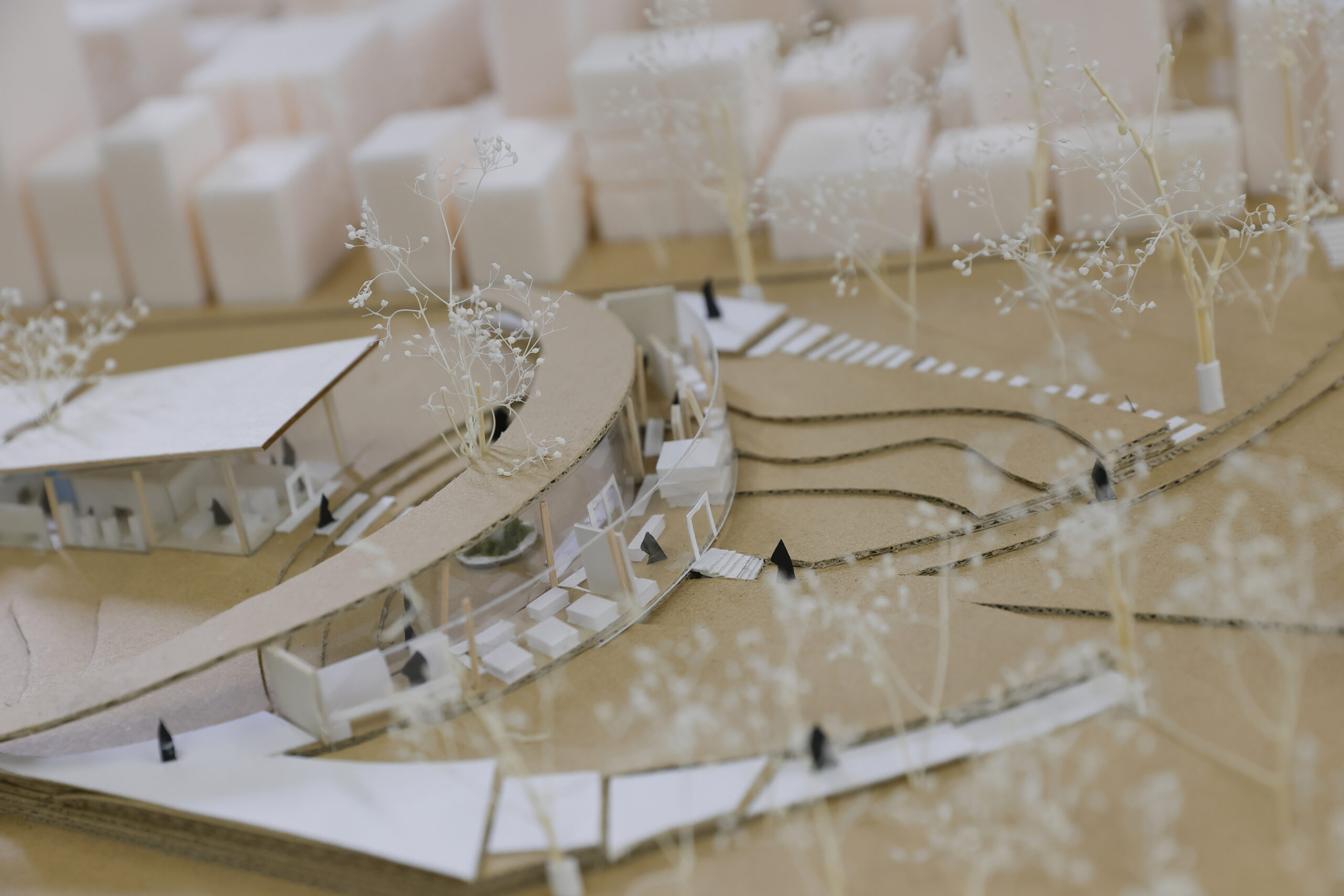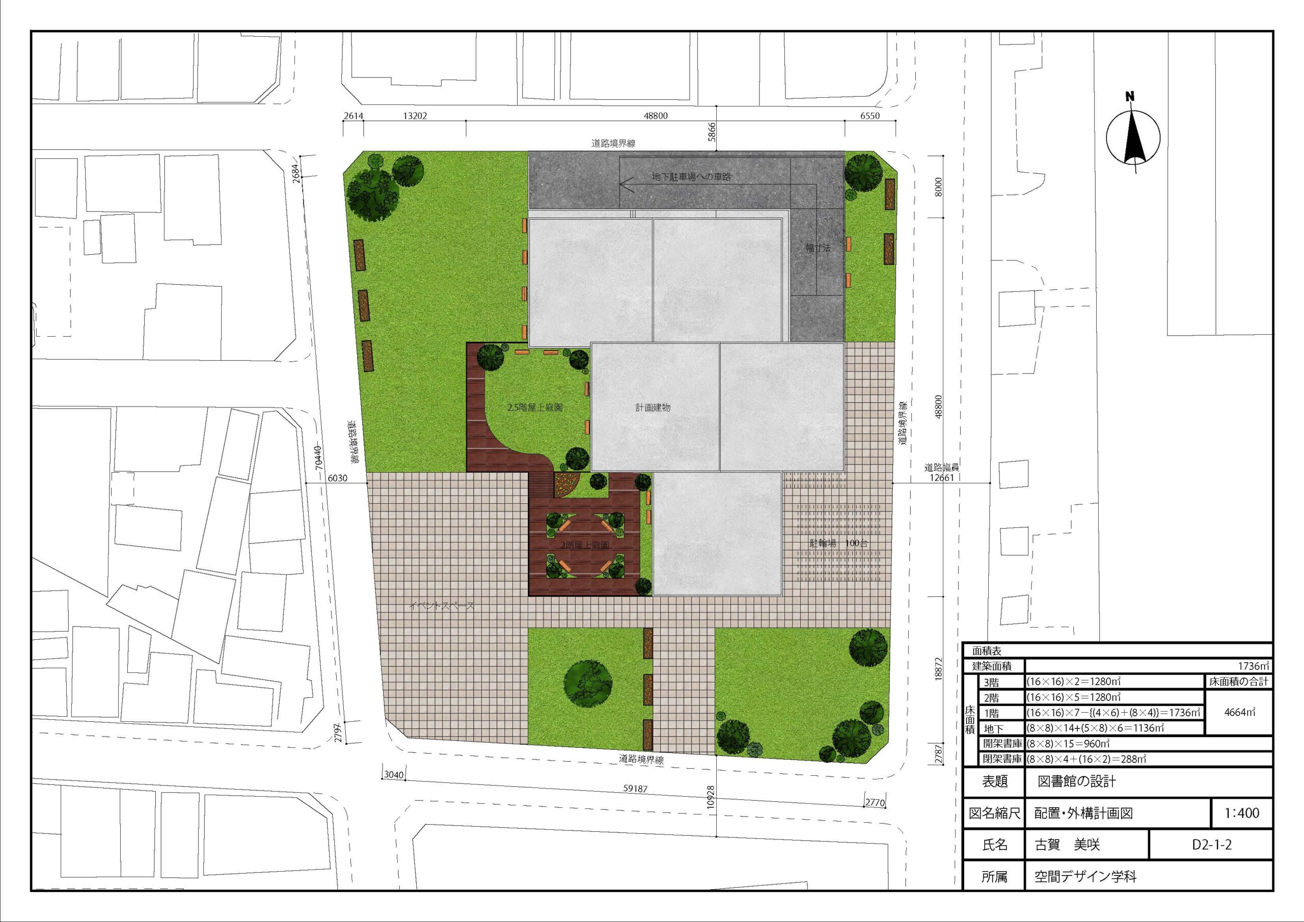 自由創作という幅広い捉え方のもと、パースやスケッチアップなどを使用せずに自分の持ったイメージを具現化するのに苦労し、行き着いたのがインテリアでした。彼女の実体験をもとに未就学児からお年寄りまでが幅広く使える施設を検討し、外構部分にも重きを置いて制作しました。舗装構成や植栽の計画にも手掛け「建設」として幅広く考えすべてのものに意味が存在する一つの空間を考えることで建築だけではなく土木や造園などの大きな分野で考えた「修成」ならではの作品が出来上がりました。1/300模型も細部にこだわり、書類関係もどうすれば手に取ってもらえるかを考えました。この先分野に捉われず「建設」を考えた経験が生きてくることを期待します。<広田莉音>