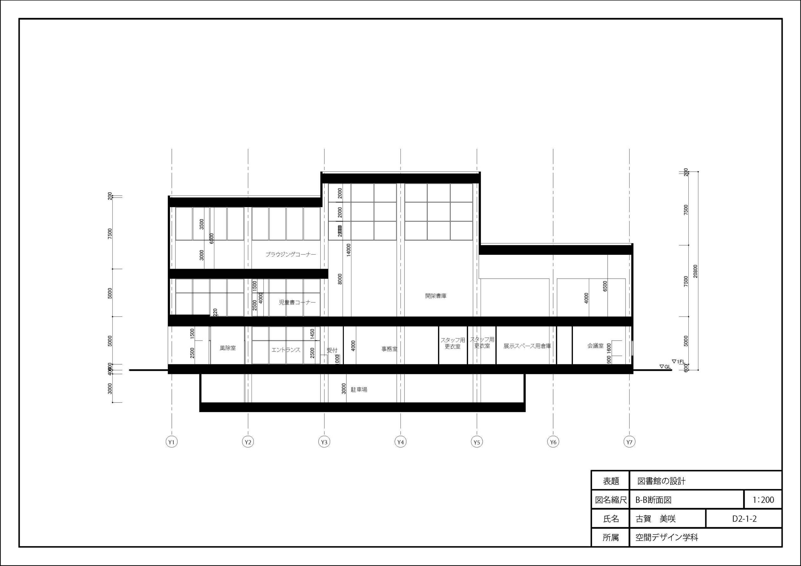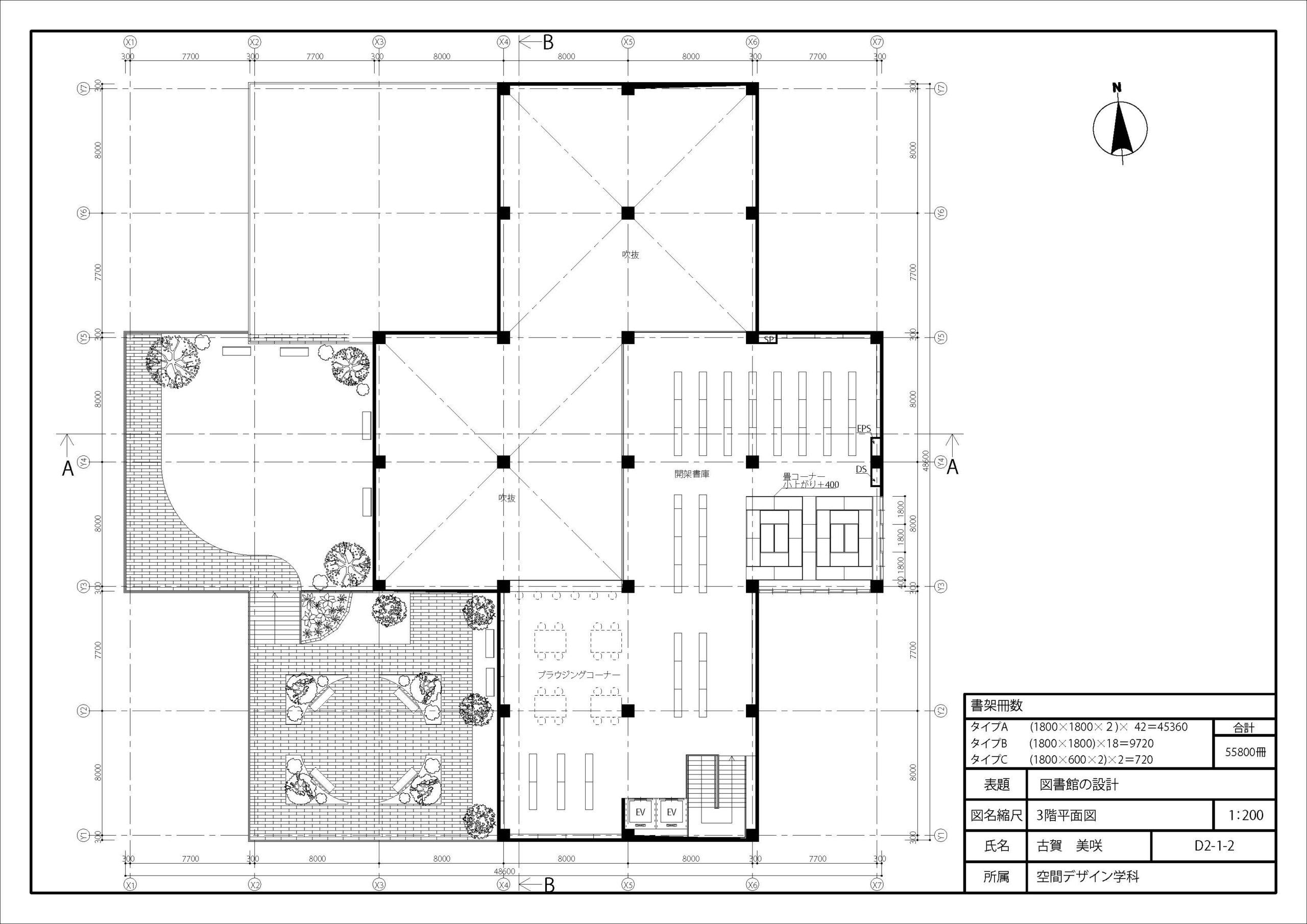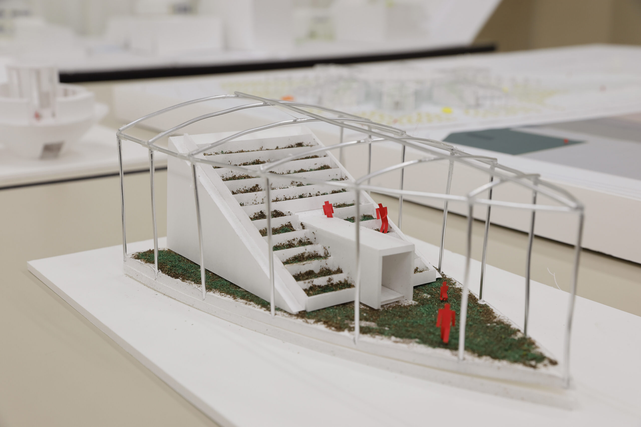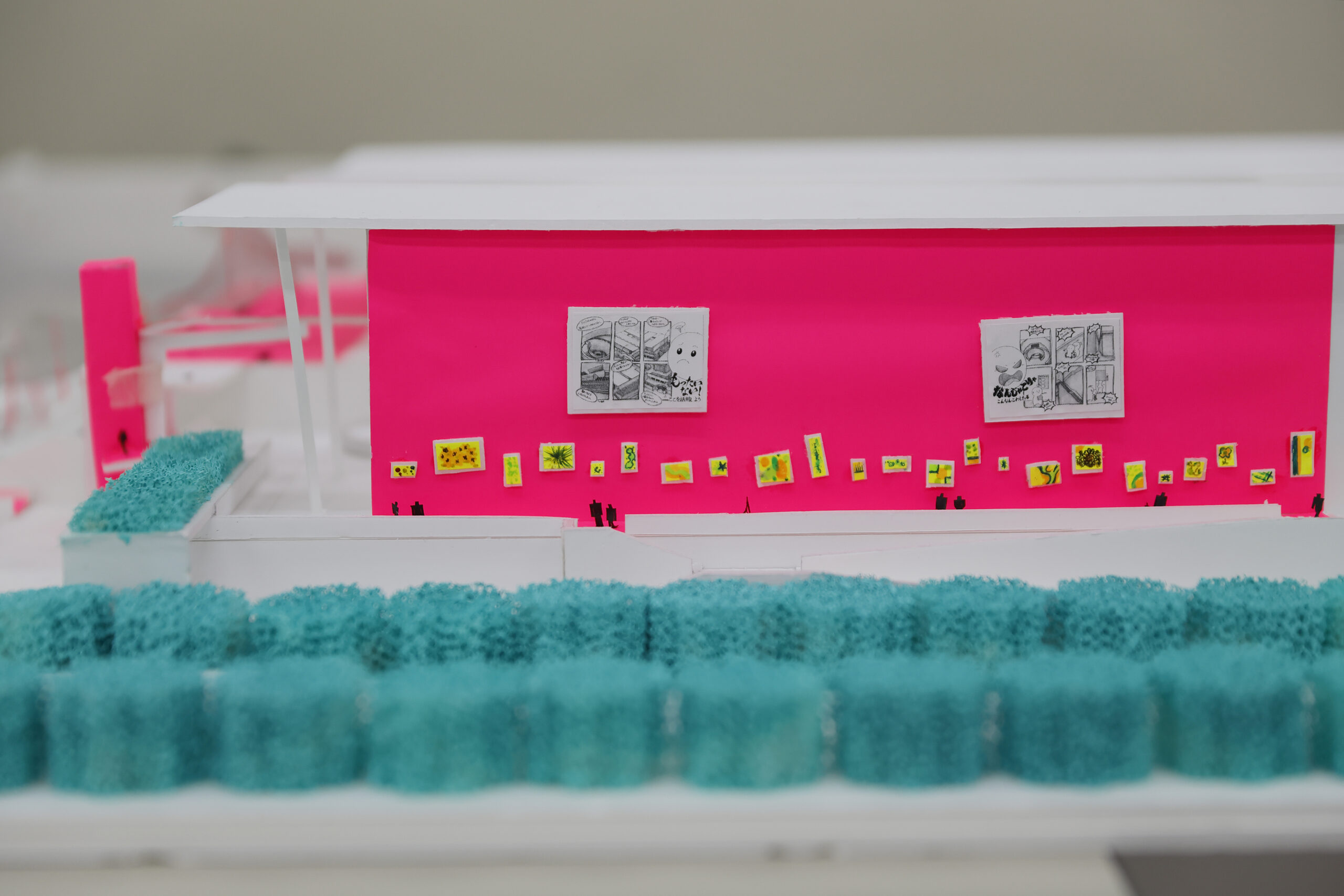 自由創作という幅広い捉え方のもと、パースやスケッチアップなどを使用せずに自分の持ったイメージを具現化するのに苦労し、行き着いたのがインテリアでした。彼女の実体験をもとに未就学児からお年寄りまでが幅広く使える施設を検討し、外構部分にも重きを置いて制作しました。舗装構成や植栽の計画にも手掛け「建設」として幅広く考えすべてのものに意味が存在する一つの空間を考えることで建築だけではなく土木や造園などの大きな分野で考えた「修成」ならではの作品が出来上がりました。1/300模型も細部にこだわり、書類関係もどうすれば手に取ってもらえるかを考えました。この先分野に捉われず「建設」を考えた経験が生きてくることを期待します。<広田莉音>
