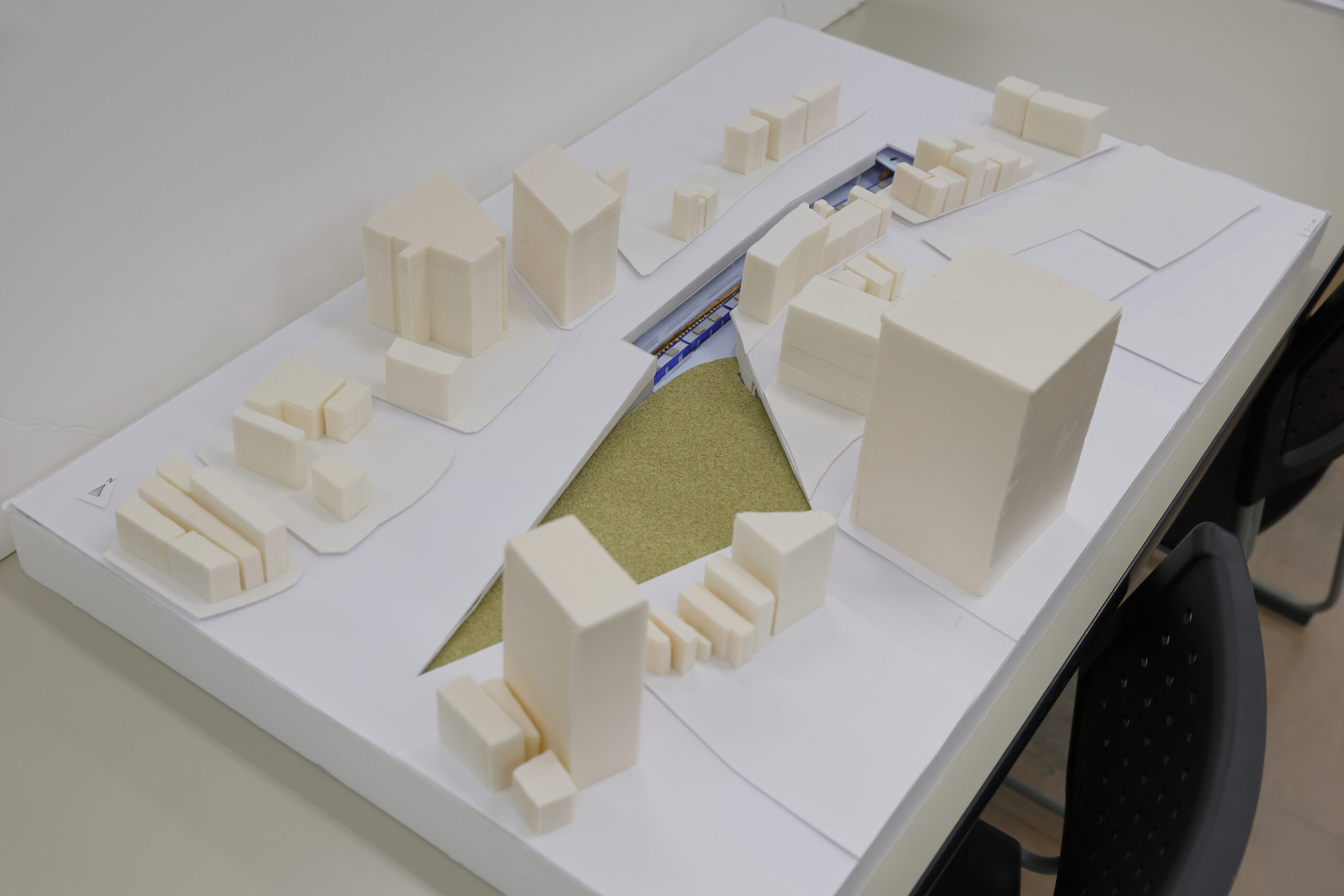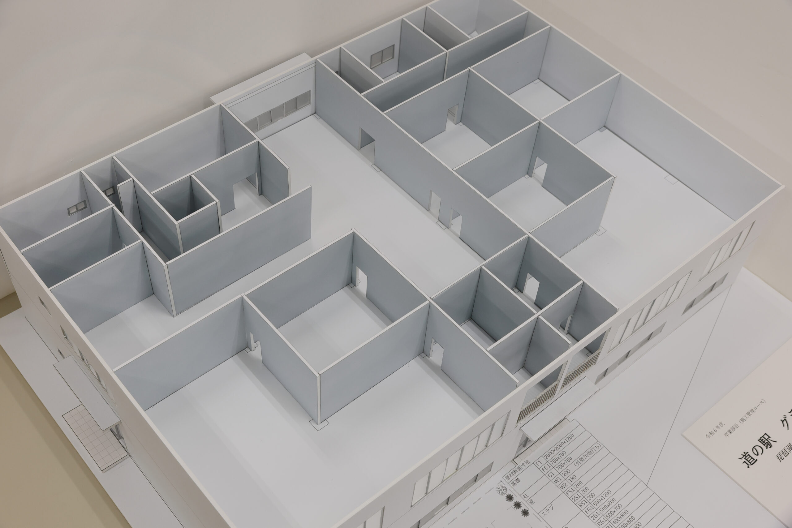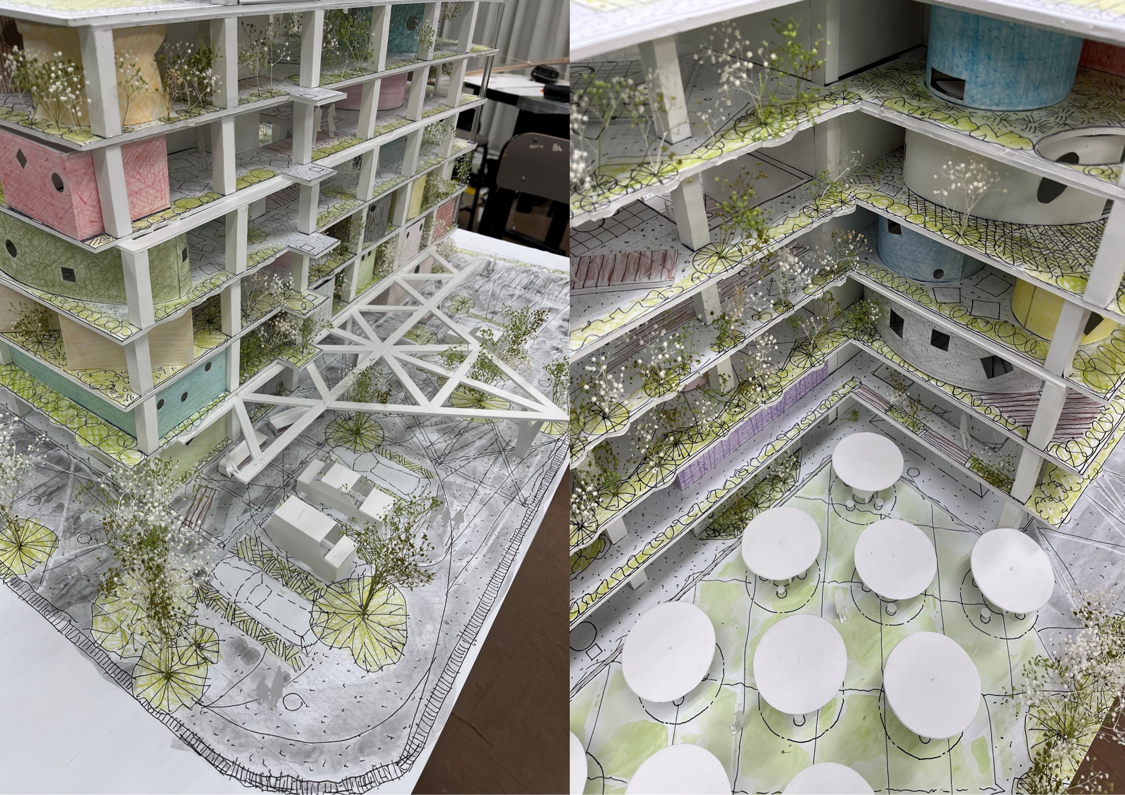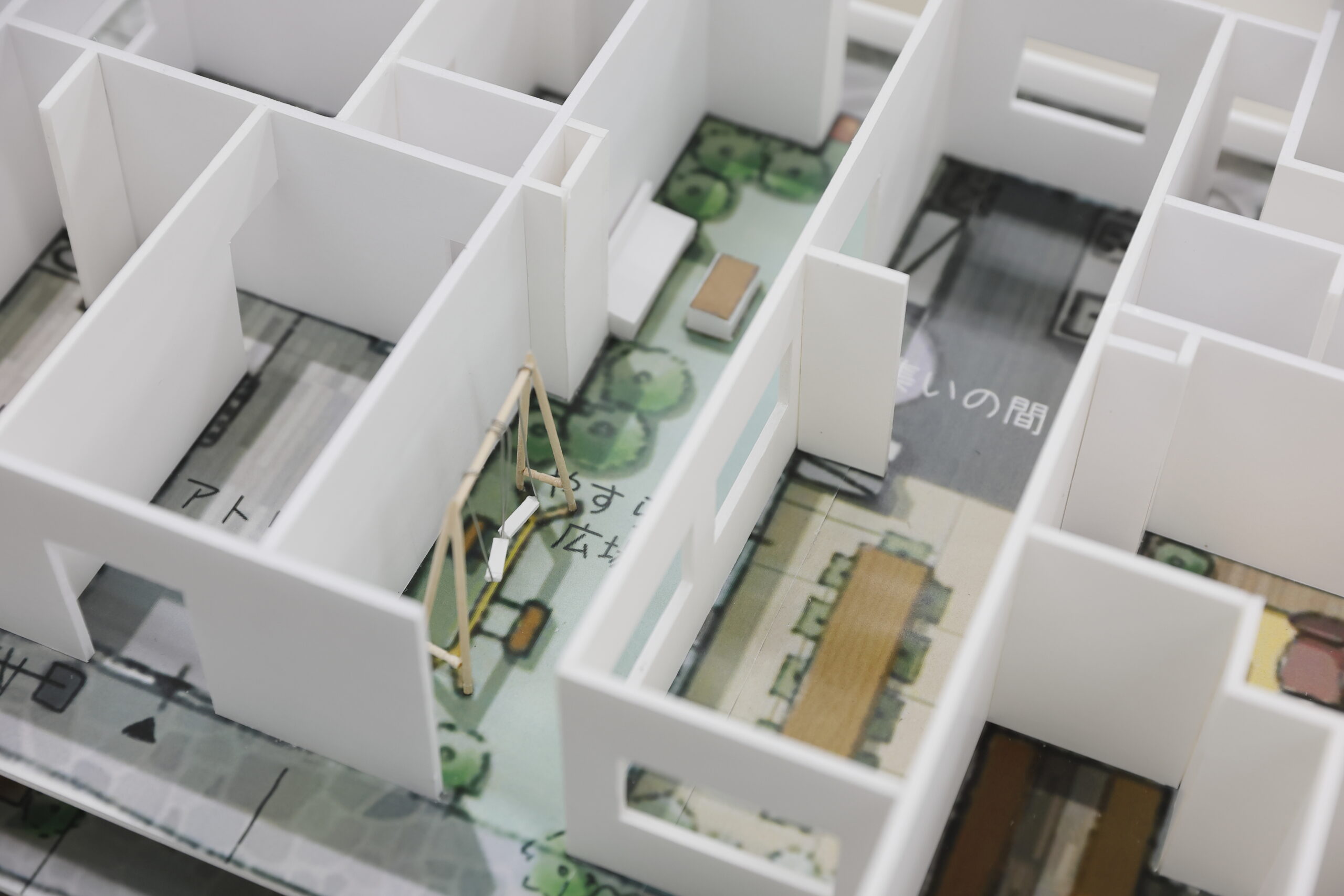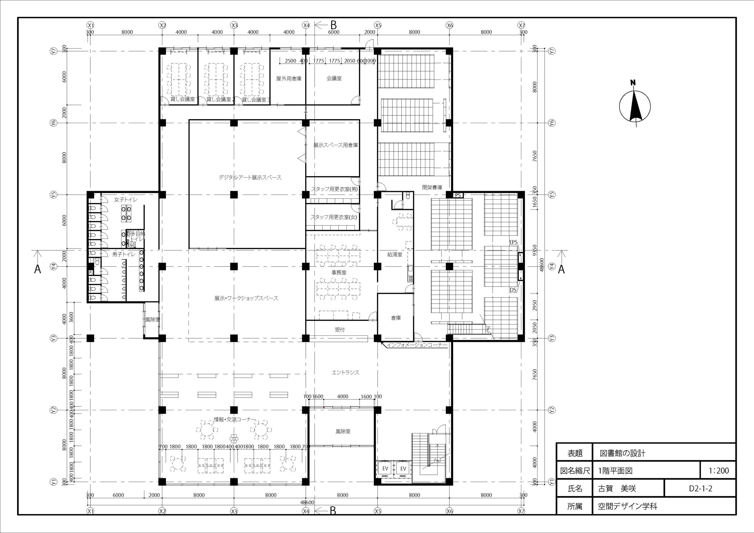 自由創作という幅広い捉え方のもと、パースやスケッチアップなどを使用せずに自分の持ったイメージを具現化するのに苦労し、行き着いたのがインテリアでした。彼女の実体験をもとに未就学児からお年寄りまでが幅広く使える施設を検討し、外構部分にも重きを置いて制作しました。舗装構成や植栽の計画にも手掛け「建設」として幅広く考えすべてのものに意味が存在する一つの空間を考えることで建築だけではなく土木や造園などの大きな分野で考えた「修成」ならではの作品が出来上がりました。1/300模型も細部にこだわり、書類関係もどうすれば手に取ってもらえるかを考えました。この先分野に捉われず「建設」を考えた経験が生きてくることを期待します。<広田莉音>