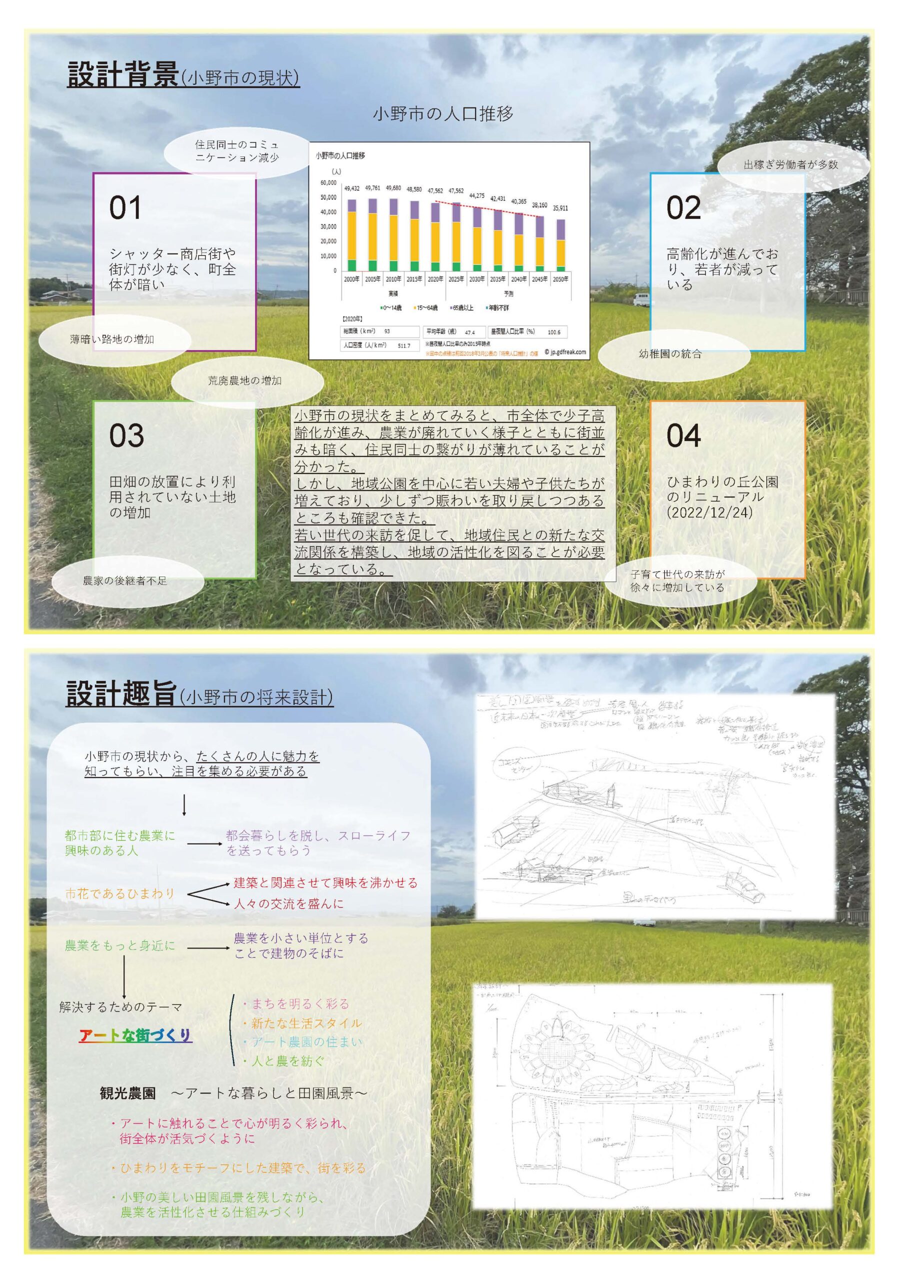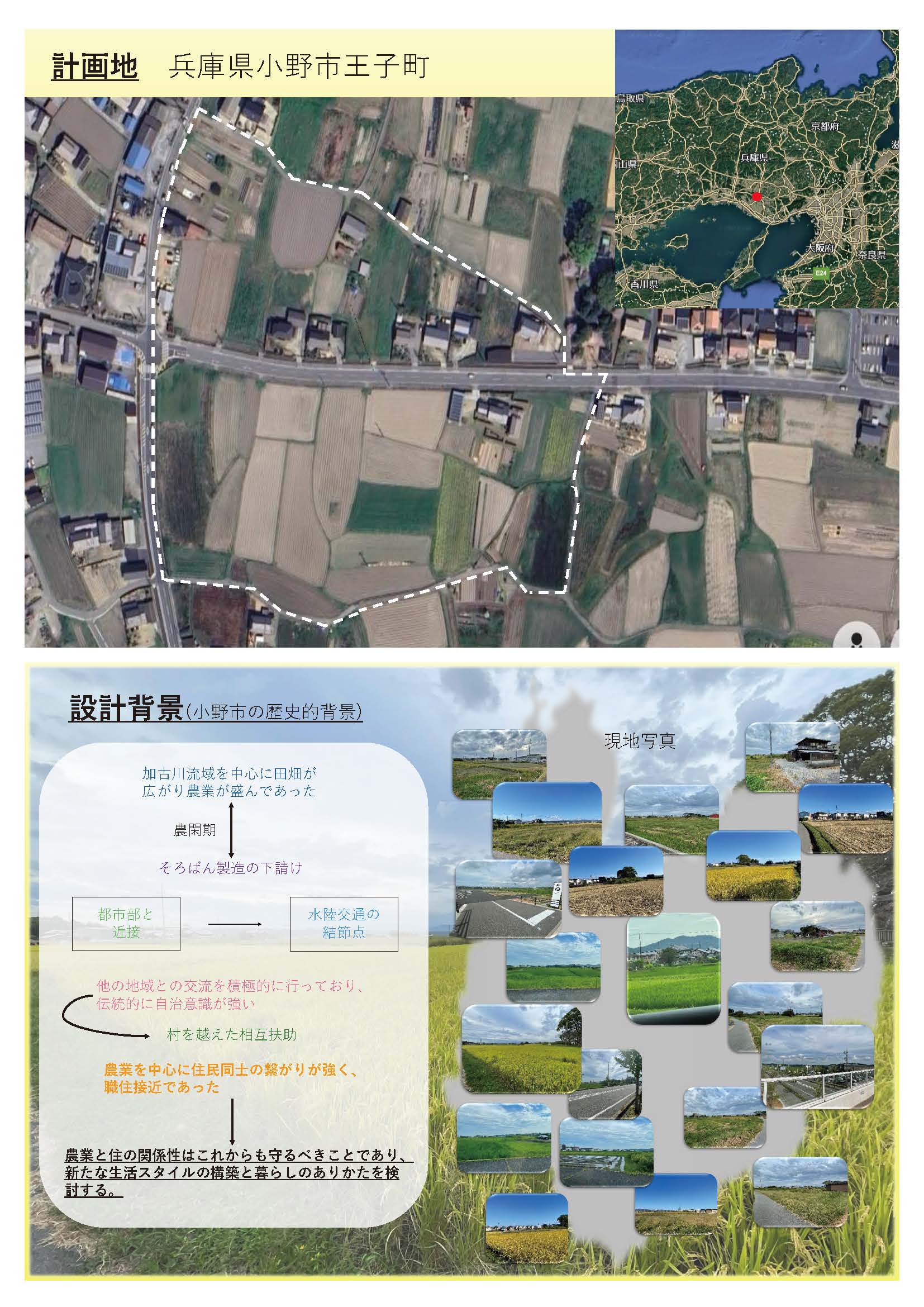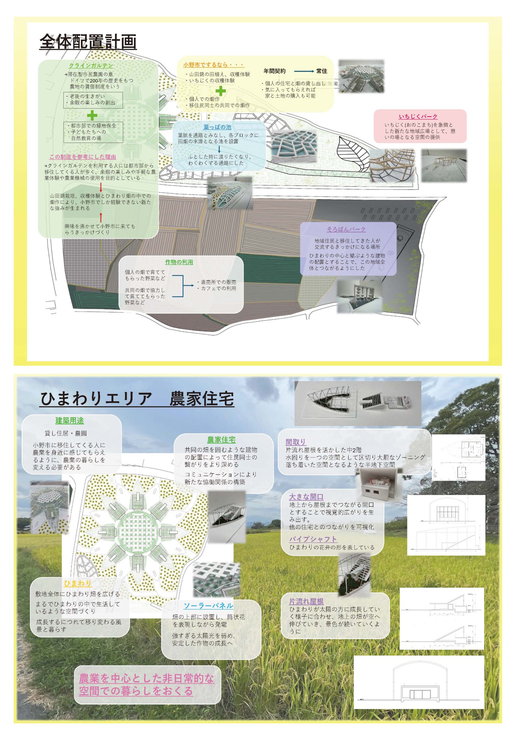 僕が今回の卒業設計を行うにあたって大きなテーマとして掲げていたのが、「地元である小野市をもっと盛り上げてたくさんの人に知ってもらいたい」という思いです。小野市はとても田舎で少子高齢化が進み、街灯が少なくまち全体が暗いイメージが強くありました。しかし、山田錦という有名な酒米の産地で田畑が広がっており、地域最大の公園では、夏には40万本のひまわりが、秋には400万本のコスモスがあたり一面に咲き誇っていたりと、美しい自然風景がたくさんあります。こういった風景を残しながらもっとたくさんの人に魅力を知ってもらうことを目指しました。今回提案するプランは都心部に住む人たちに農業を通じて小野市に訪れてもらい、実際に生活することでより身近に小野市の魅力を感じてもらえると考えました。近い将来小野市全体に今回のプランが広がっていけばいいなと思います。