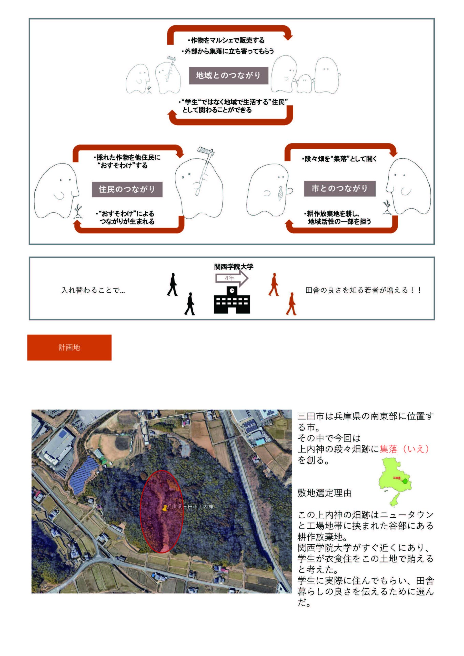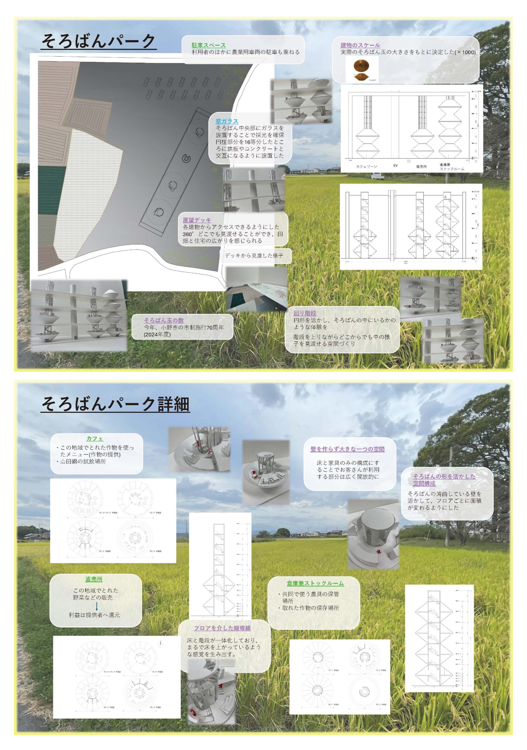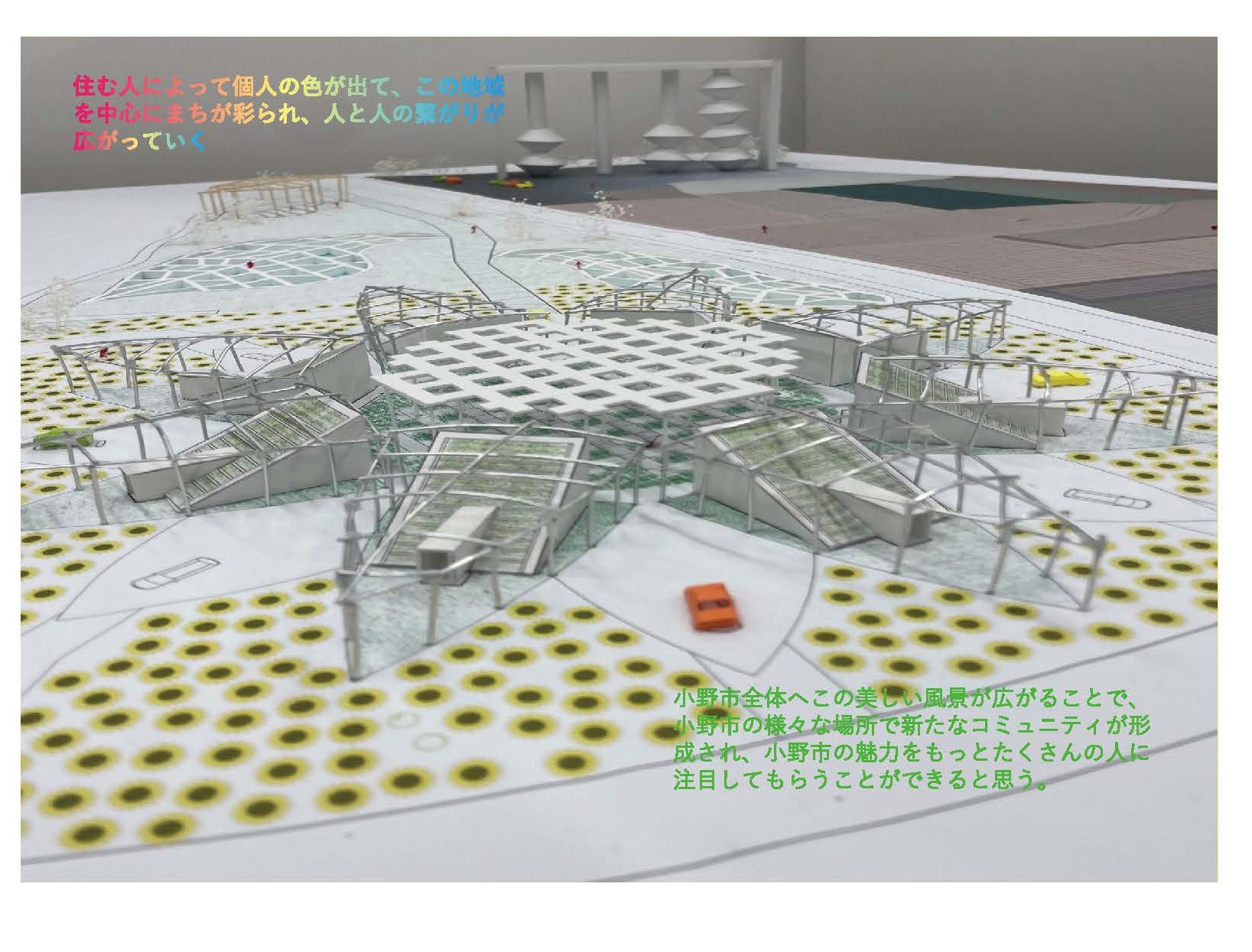 僕が今回の卒業設計を行うにあたって大きなテーマとして掲げていたのが、「地元である小野市をもっと盛り上げてたくさんの人に知ってもらいたい」という思いです。小野市はとても田舎で少子高齢化が進み、街灯が少なくまち全体が暗いイメージが強くありました。しかし、山田錦という有名な酒米の産地で田畑が広がっており、地域最大の公園では、夏には40万本のひまわりが、秋には400万本のコスモスがあたり一面に咲き誇っていたりと、美しい自然風景がたくさんあります。こういった風景を残しながらもっとたくさんの人に魅力を知ってもらうことを目指しました。今回提案するプランは都心部に住む人たちに農業を通じて小野市に訪れてもらい、実際に生活することでより身近に小野市の魅力を感じてもらえると考えました。近い将来小野市全体に今回のプランが広がっていけばいいなと思います。