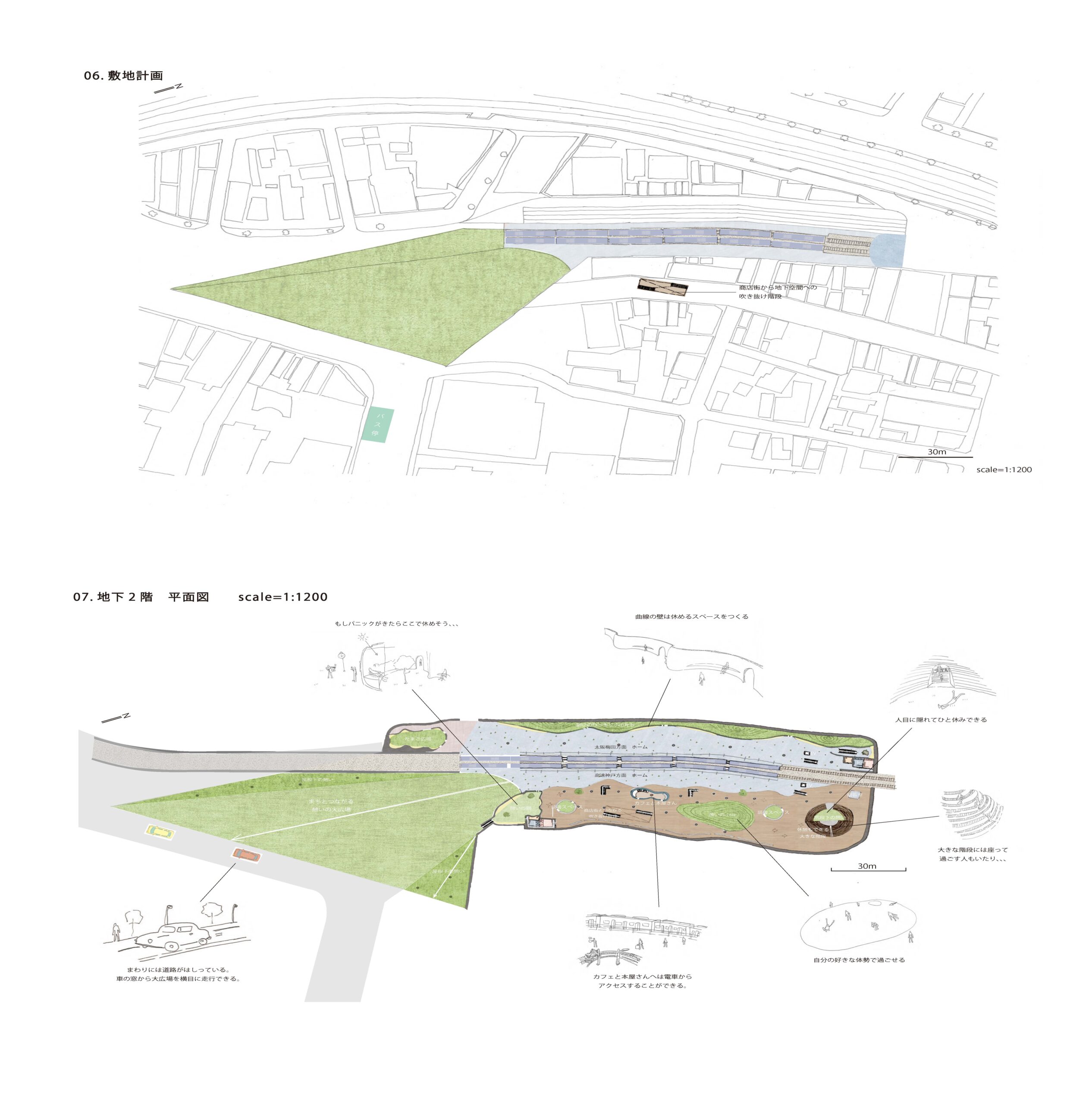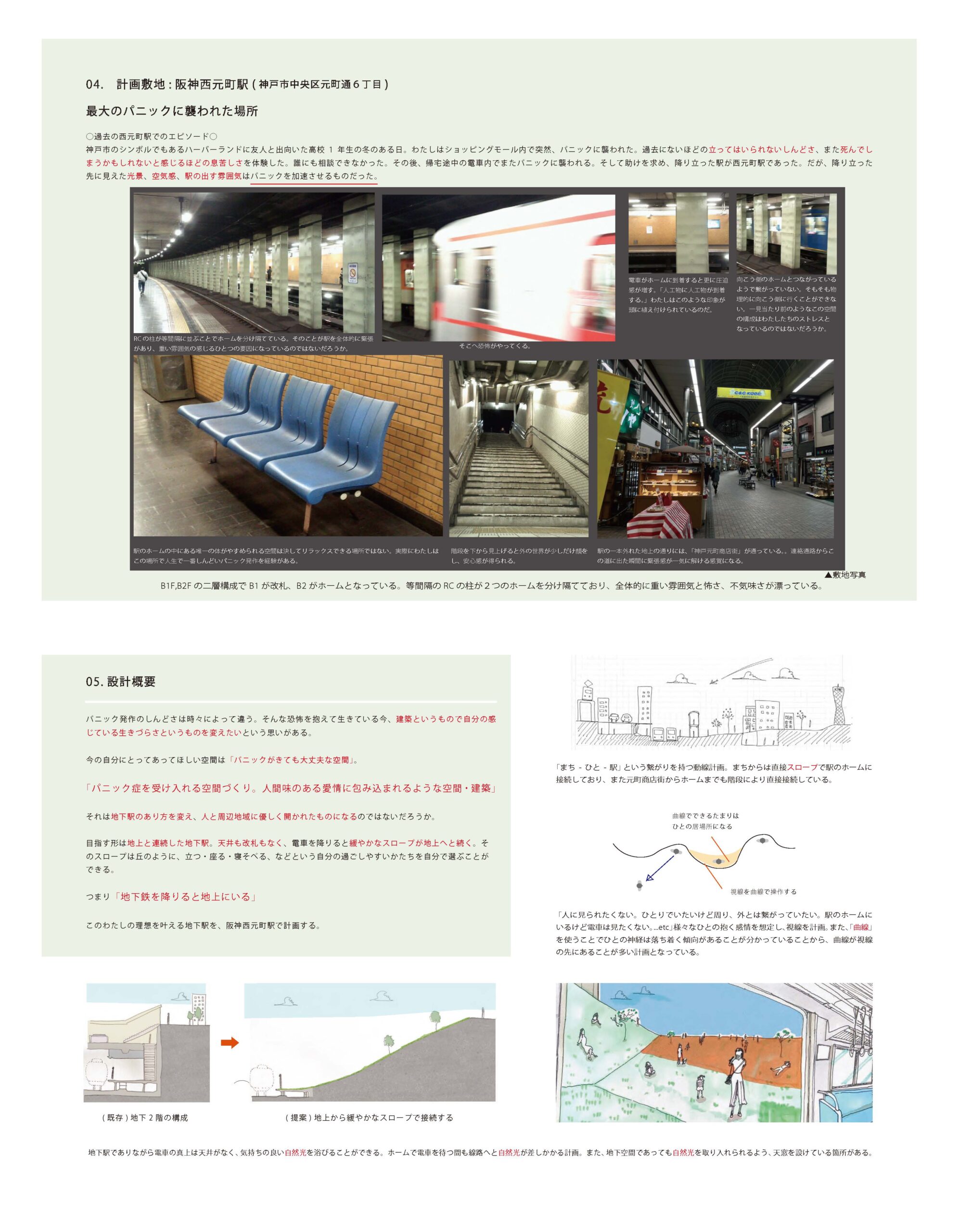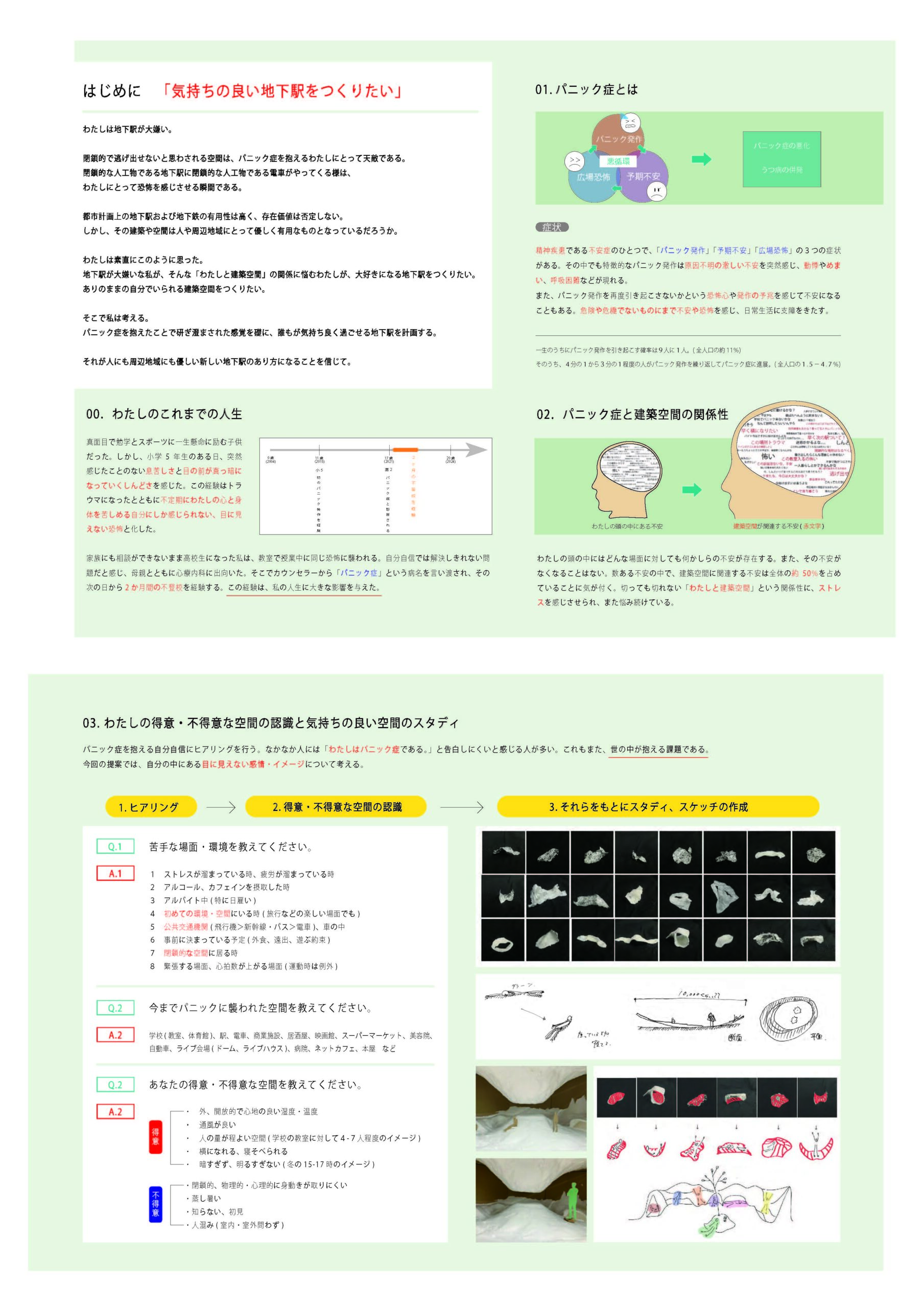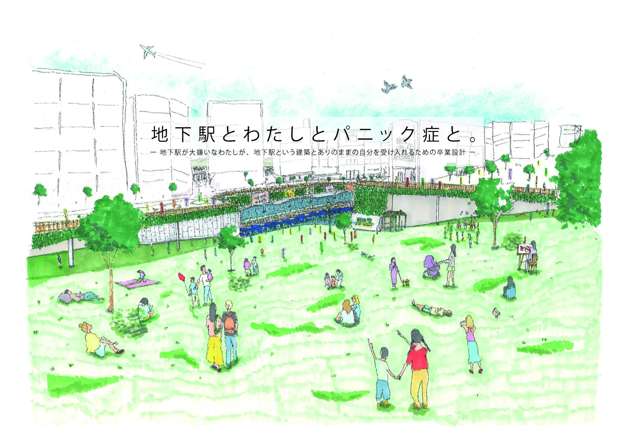 高校2年生の冬の頃、わたしはパニック症を発症しました。この出来事は、わたしにとって憧れでありパワー溢れる「建築」というものを恐怖へと化すものでした。子供の頃から大好きだった建築へと出向くことを恐れ、そして家の外へと出向くことさえも拒むようになりました。この恐怖は今もわたしの心の奥底に眠る忘れたくても忘れられない恐怖なのです。この自身の現状をもし自分が変えることができるならば、挑戦してみたいと強く思うようになり、今回の卒業設計で取り組むことを決心しました。わたしの大嫌いな地下駅を題材にした今回の作品はあくまで序章にすぎません。わたしの挑戦はこれからも自分自身を強くし、そして鼓舞してくれるものだと信じています。この作品がそしてこれから生まれるわたしの作品が沢山の人に影響を与えるものになるよう、これからも精進することを固く誓います。