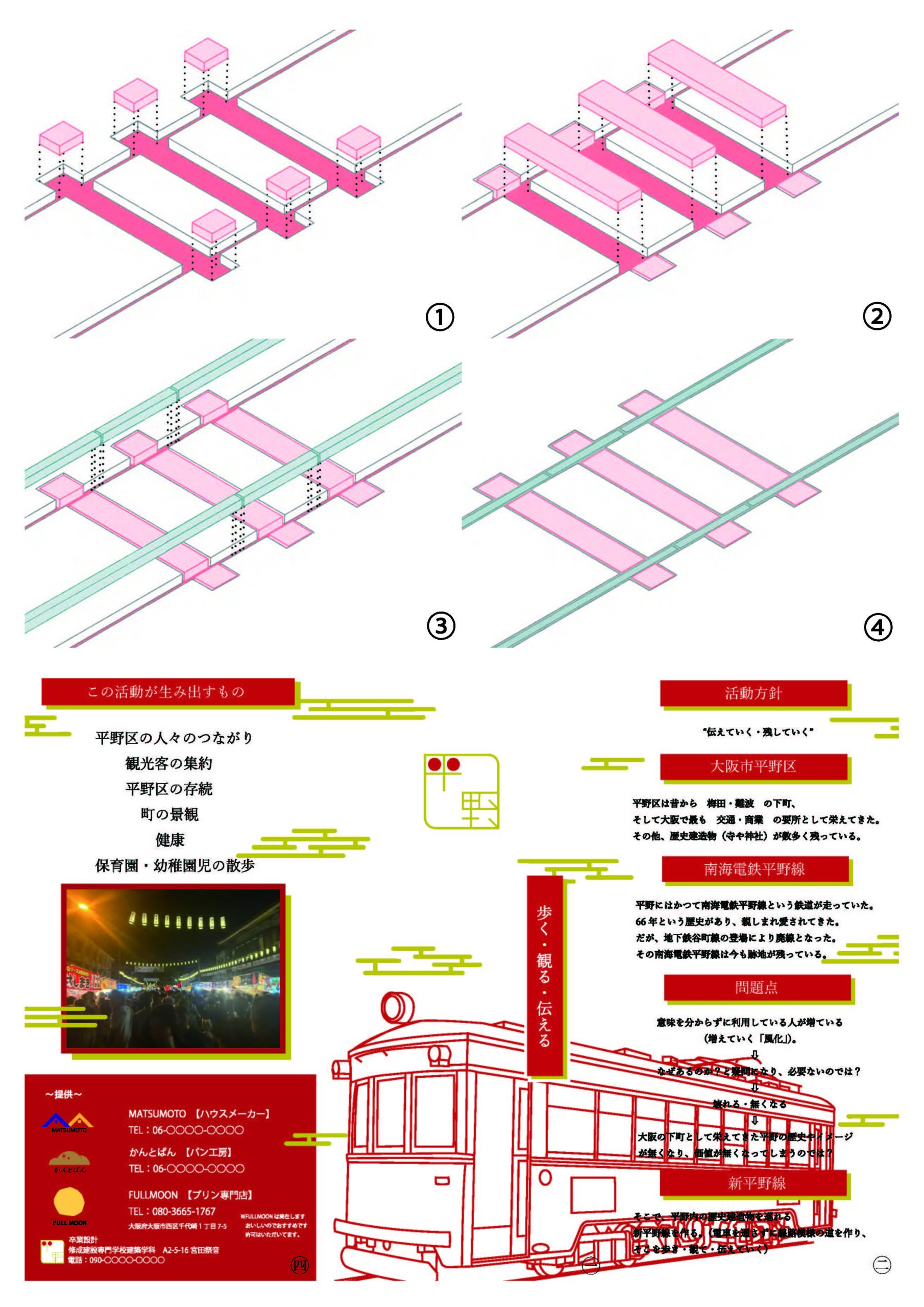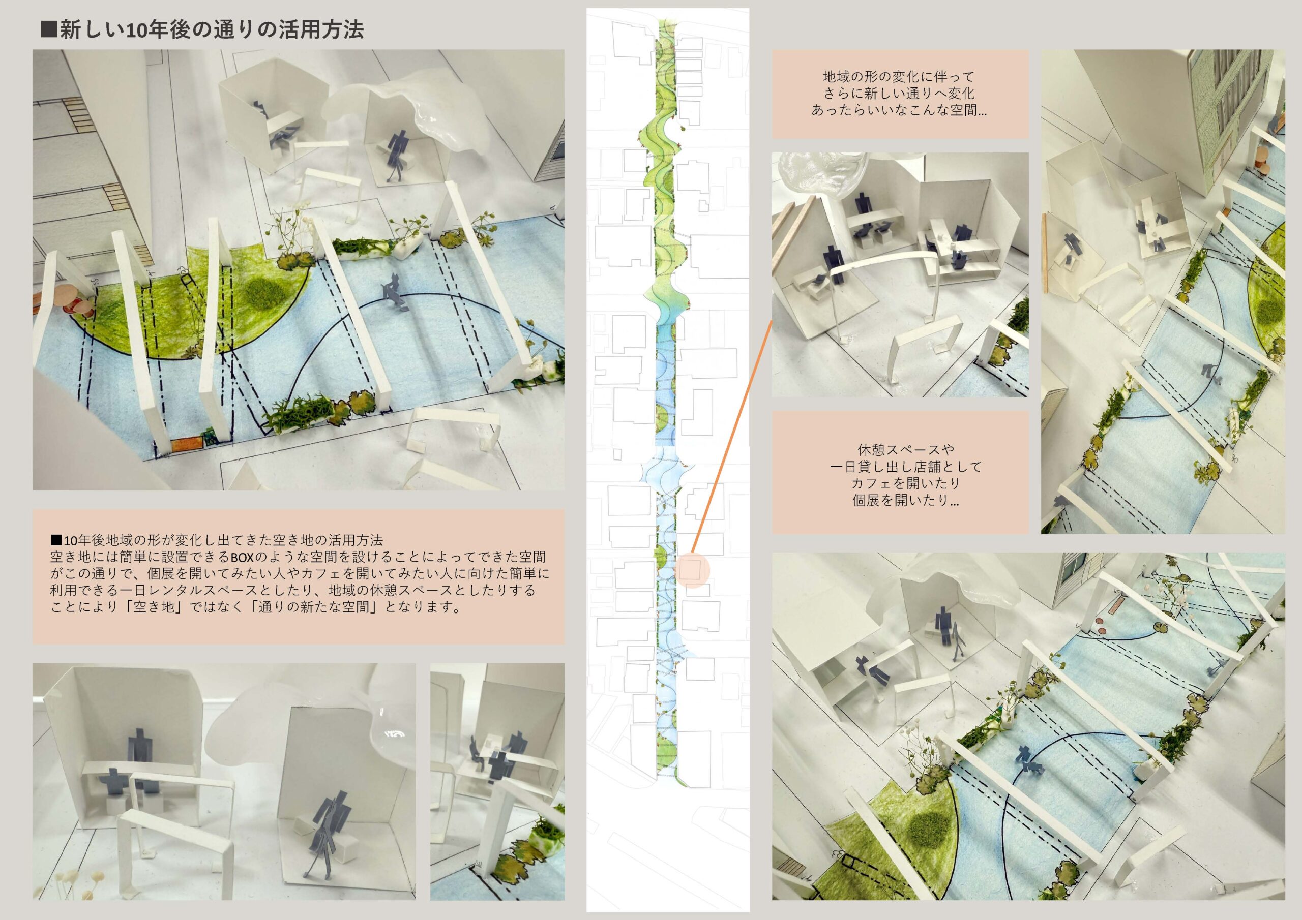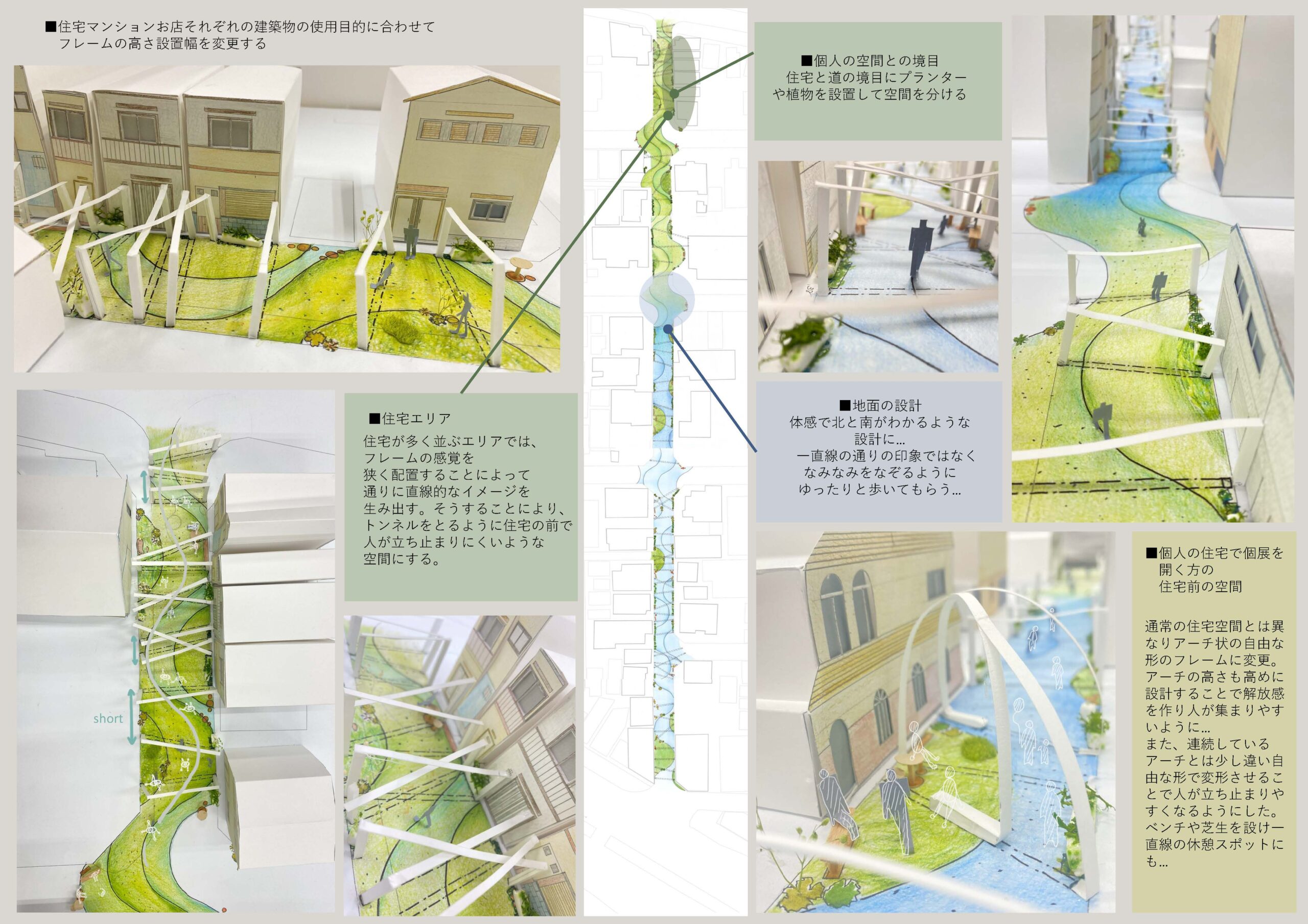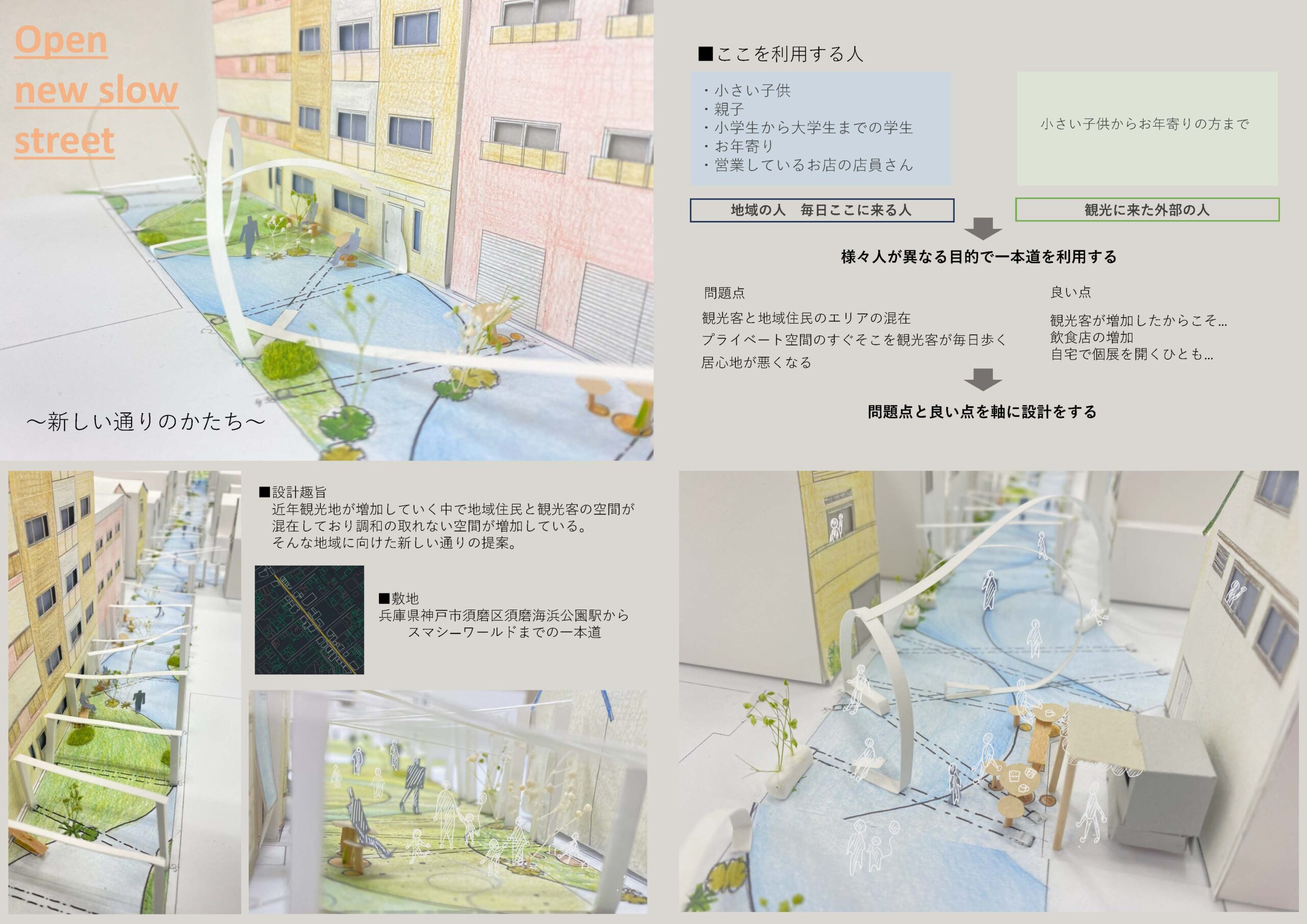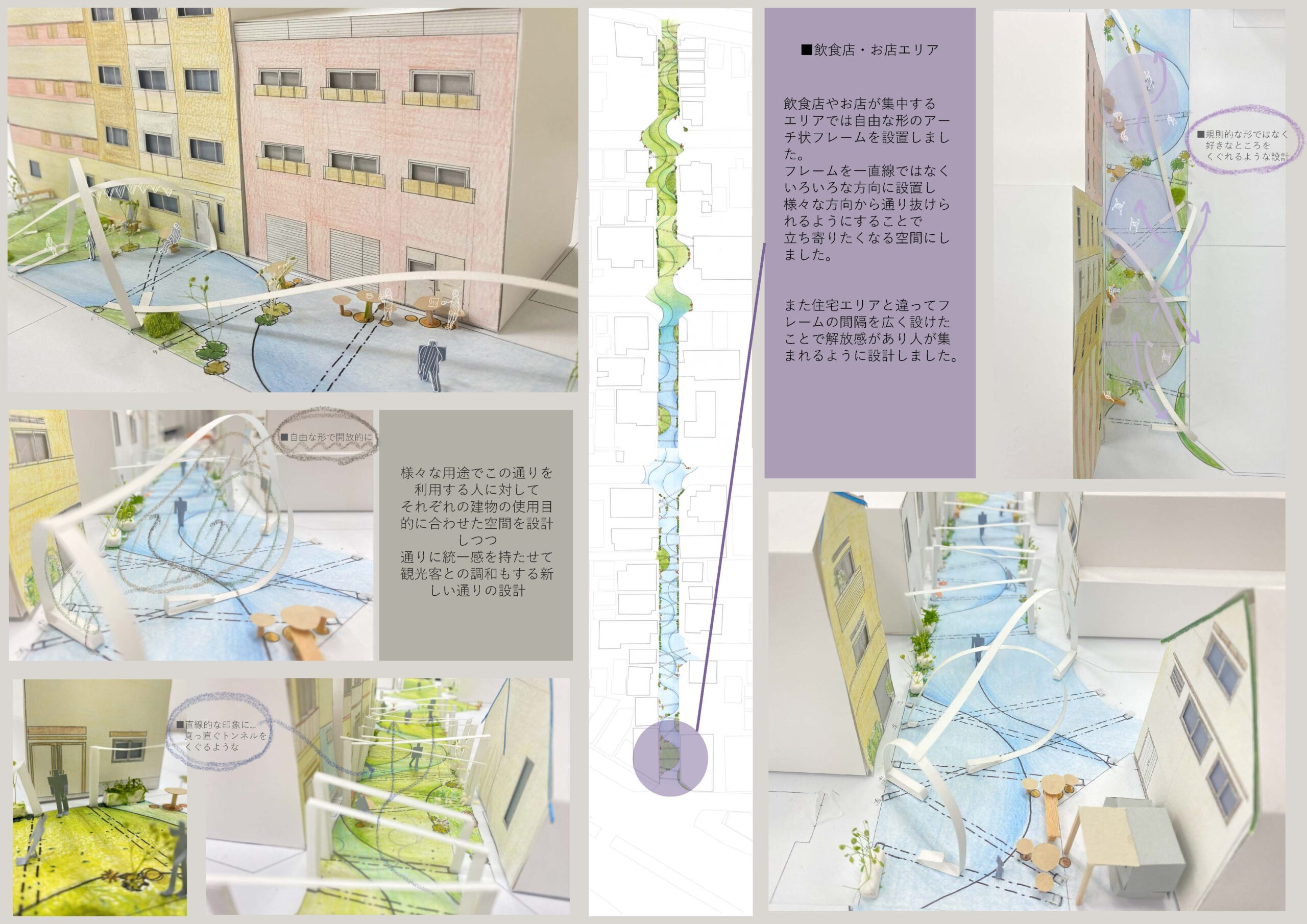 この卒業設計を作成するにあたって設定したこの敷地に対して何が必要か建築とは何かについて考えることが多くありました。この地域にできた観光地によっていつもの道が良くも悪くも変化し観光客と地域住民が混在している。そこで私はこの道を利用する観光客と地域住民が調和の取れる快適で楽しい通りに変化させたいと思い設計しました。私が実際にこの道を毎日利用するからこそここに住む人と観光に来る人がこんな新しい通りがあったらいいなと思ってもらえるよう考えながら作成しました。この卒業設計をしたことにより建築とは建物の設計するだけでなく利用する人の動きを誘導する空間を設計することも建築だということを学ぶことができました。