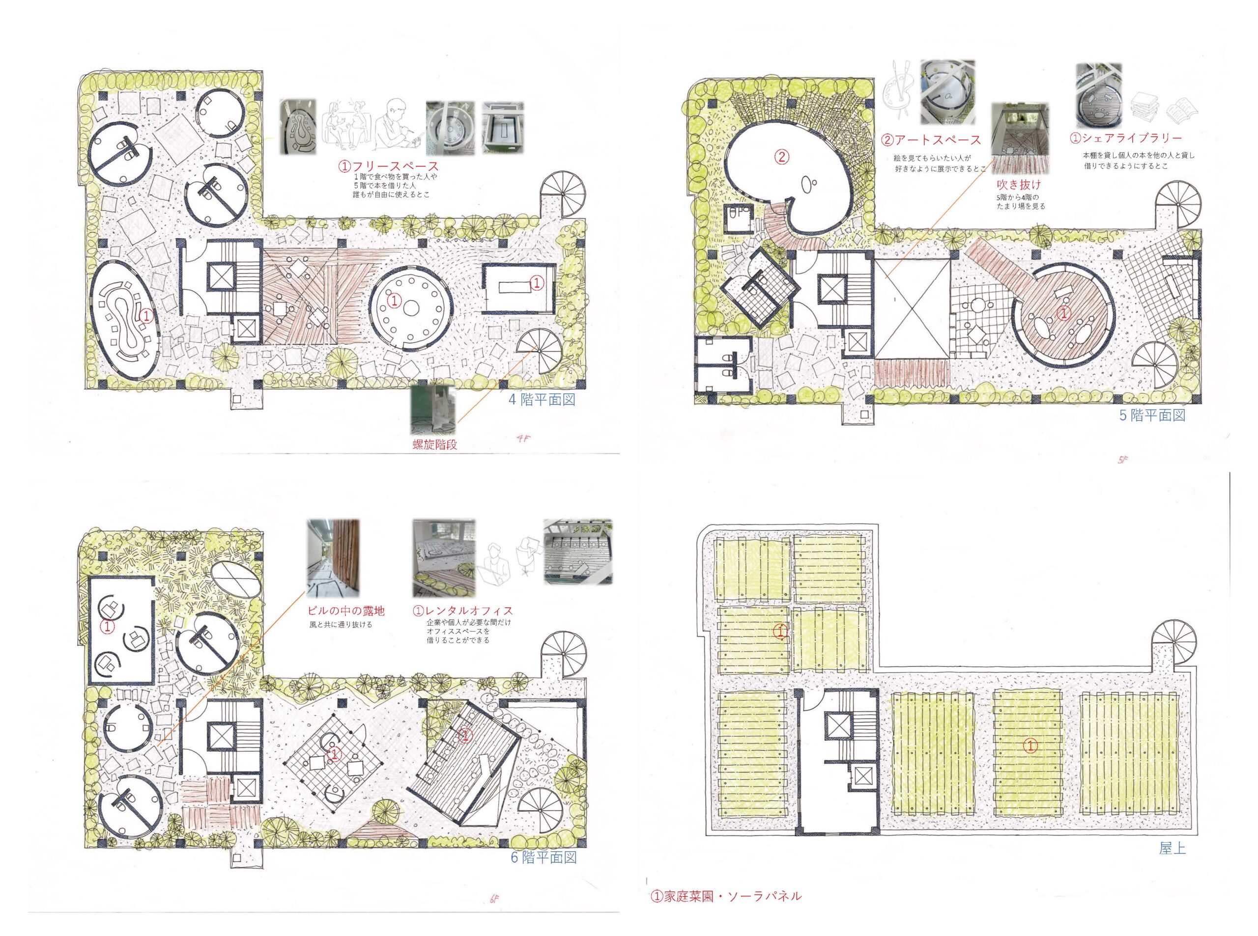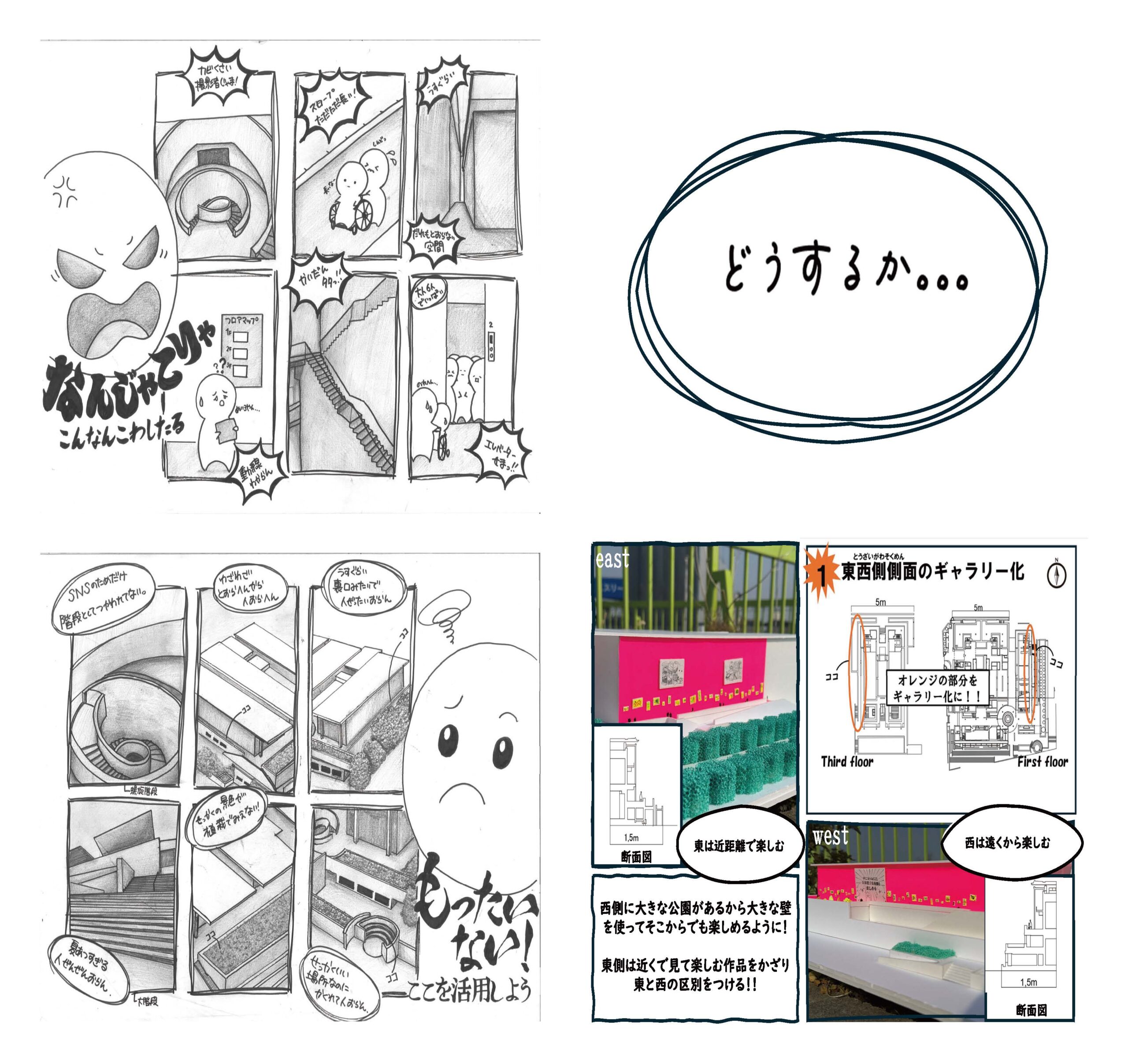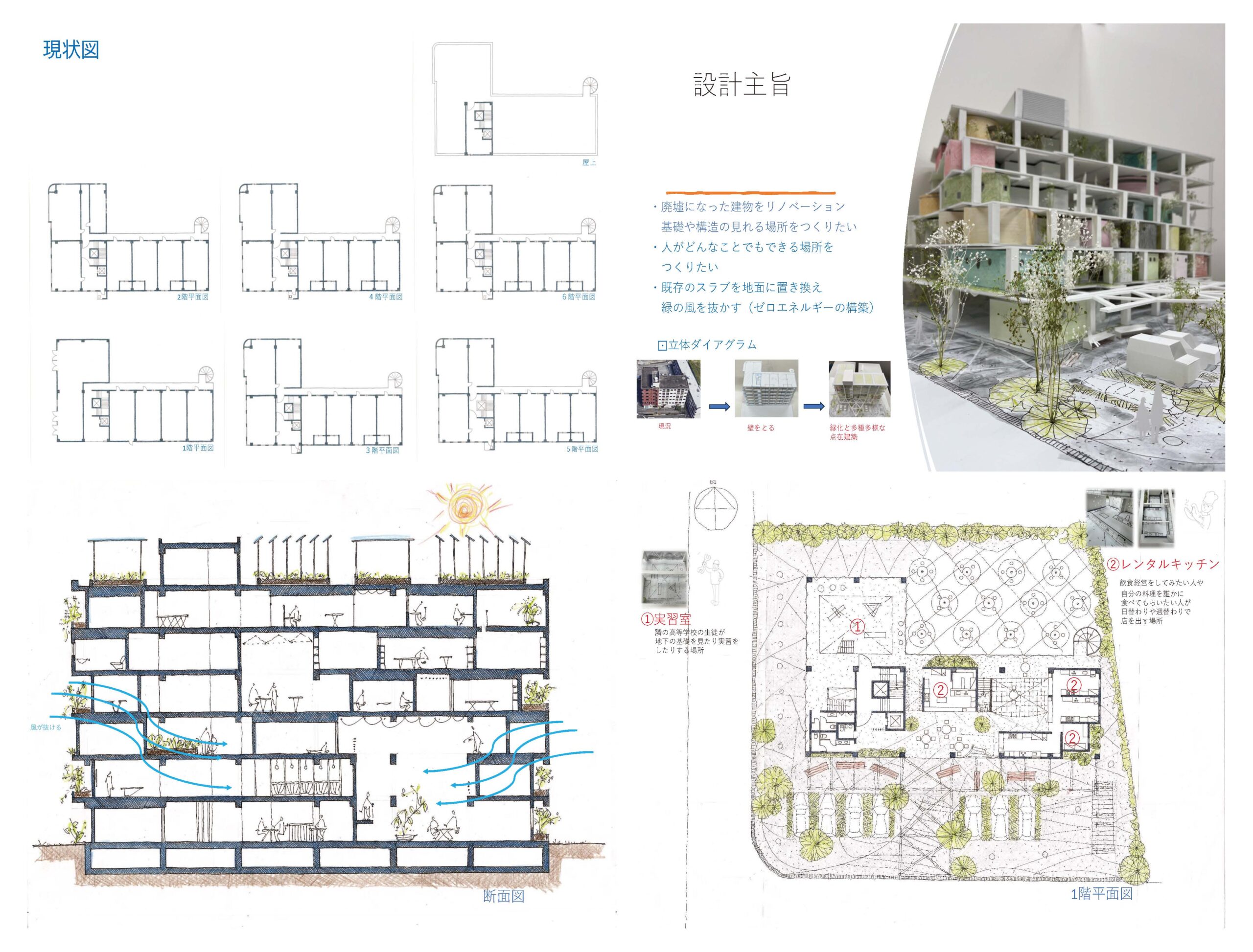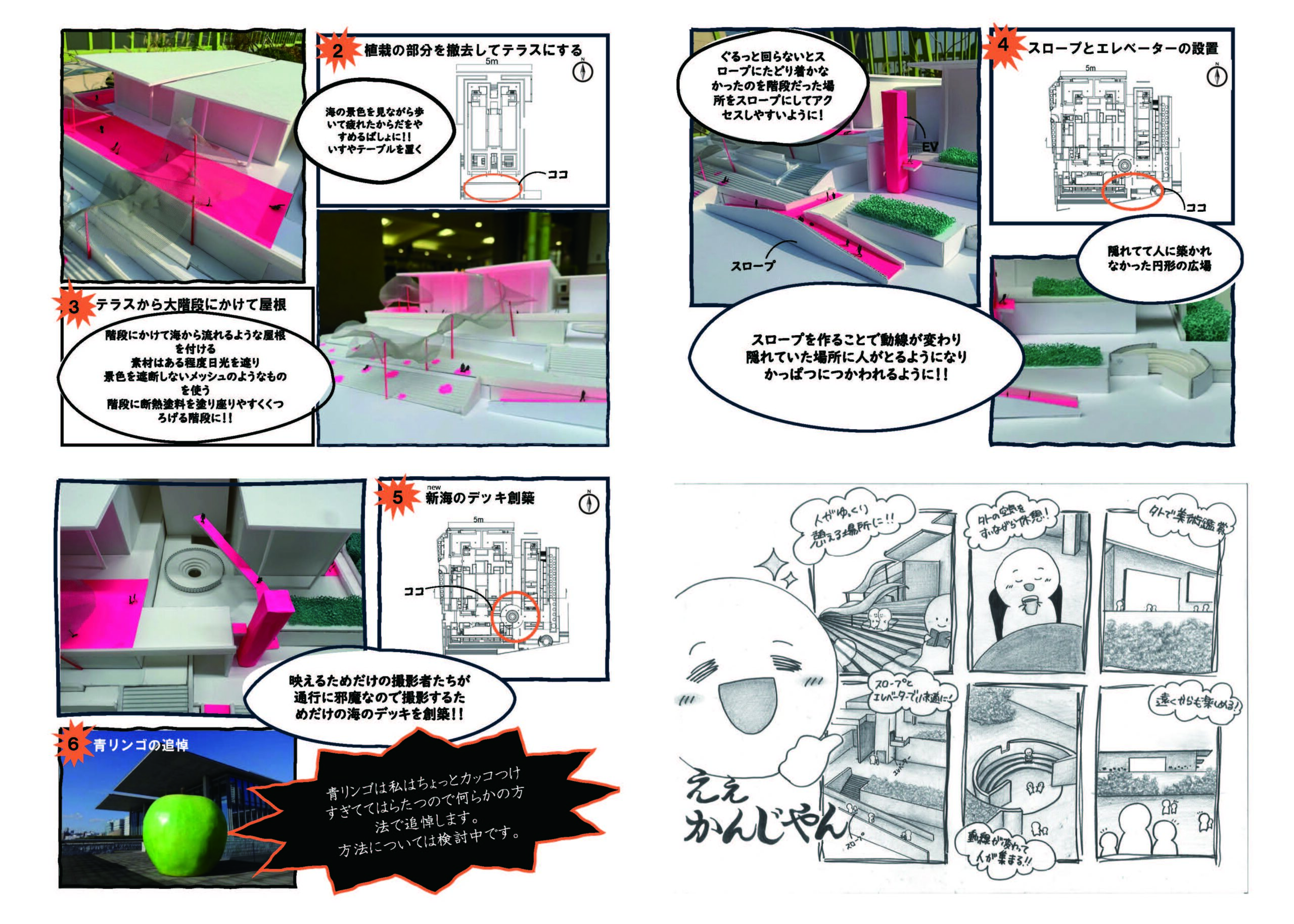 こんなテーマでいいのかな?と不安な思いを持ちつつも、彼女独自の表現方法は審査会を経るたびに進化した。最終審査会で青砥先生から「マンガにするといい」というアドバイスを頂き、それを活かしての最終データとなった。改修が困難なRC造の既存建物への不満を自分の改善計画で覆い尽くす提案は、見た目はラジカルだけれども、実は無理の少ない優しい提案として結実している。<田中おと吉>