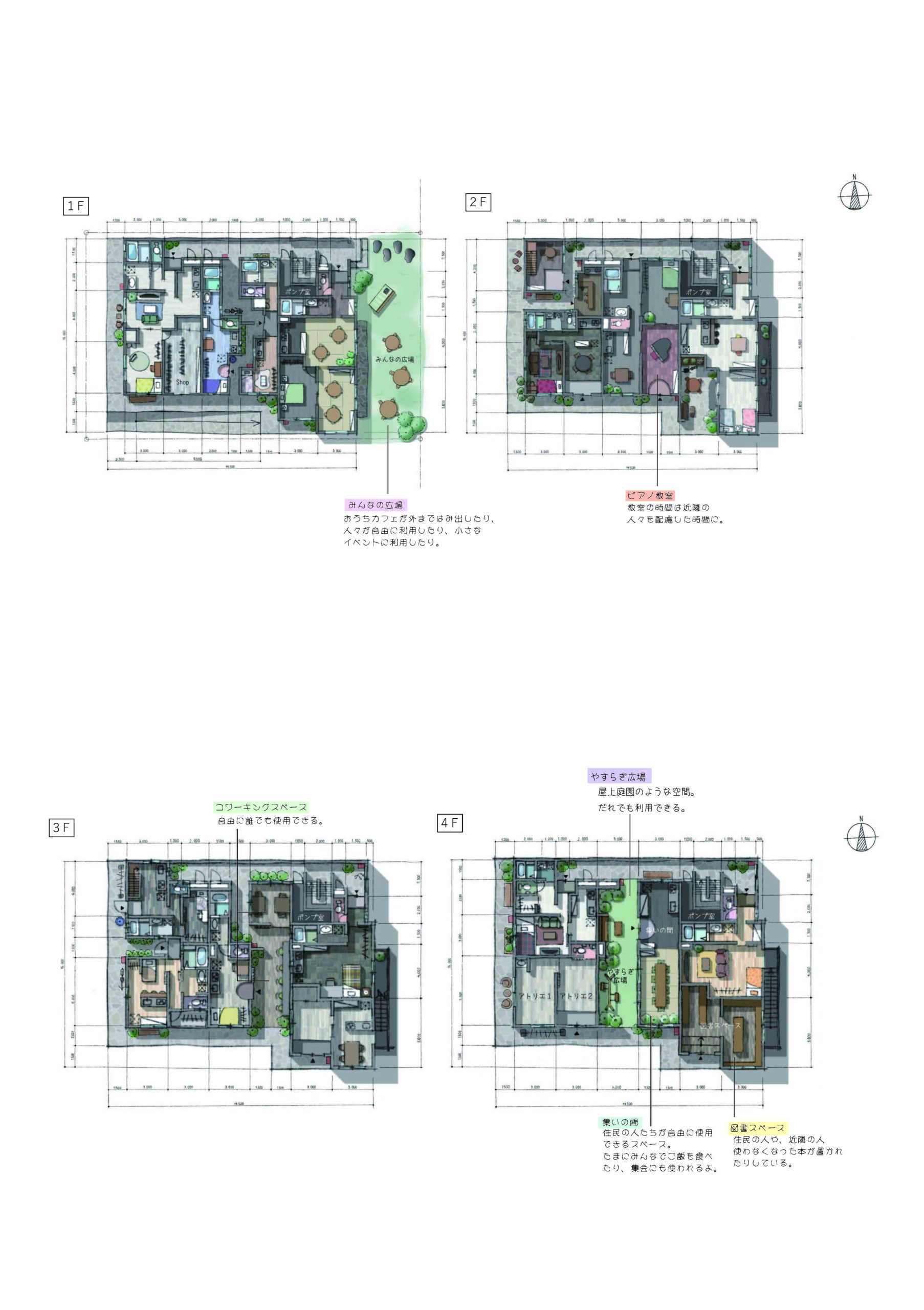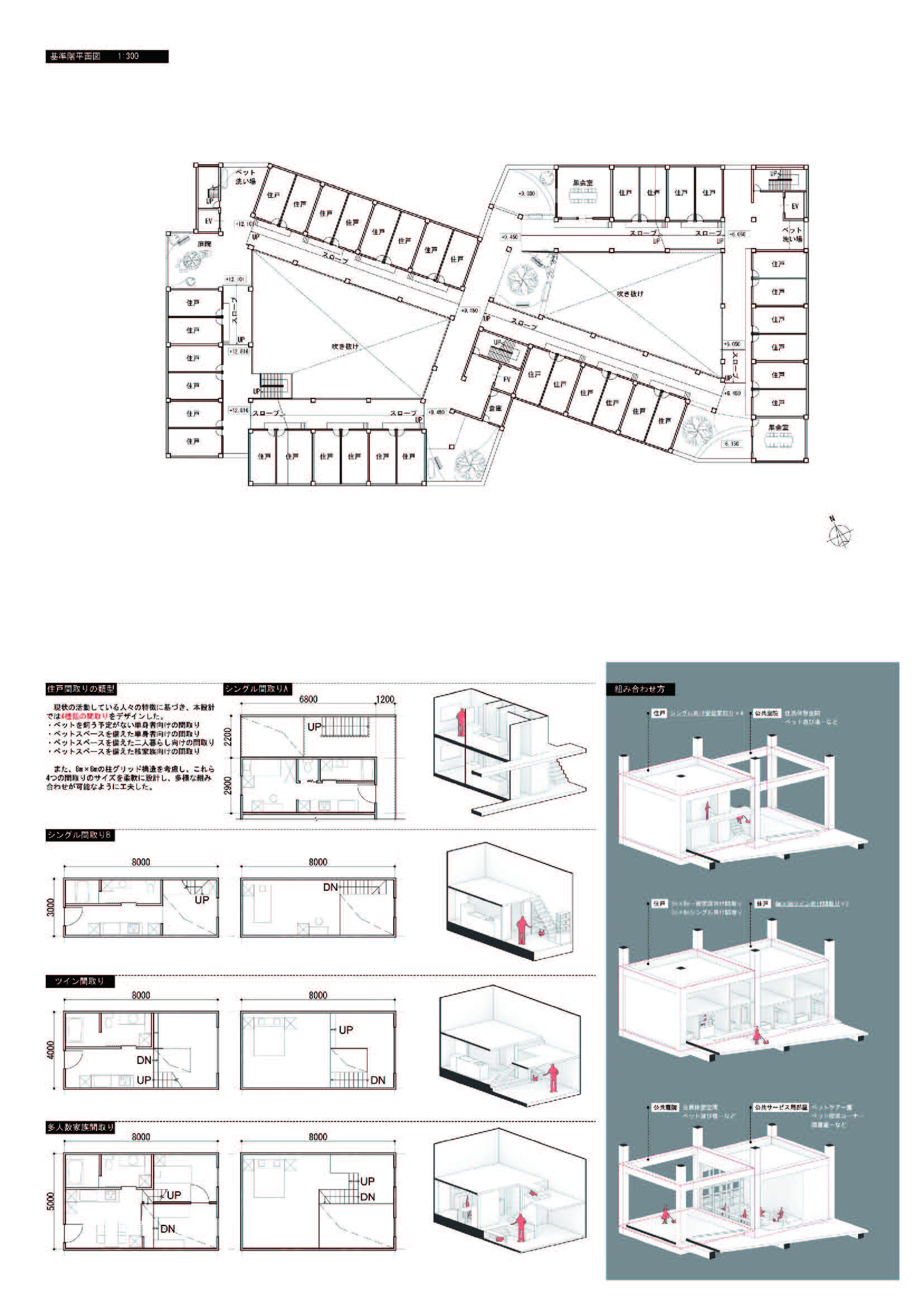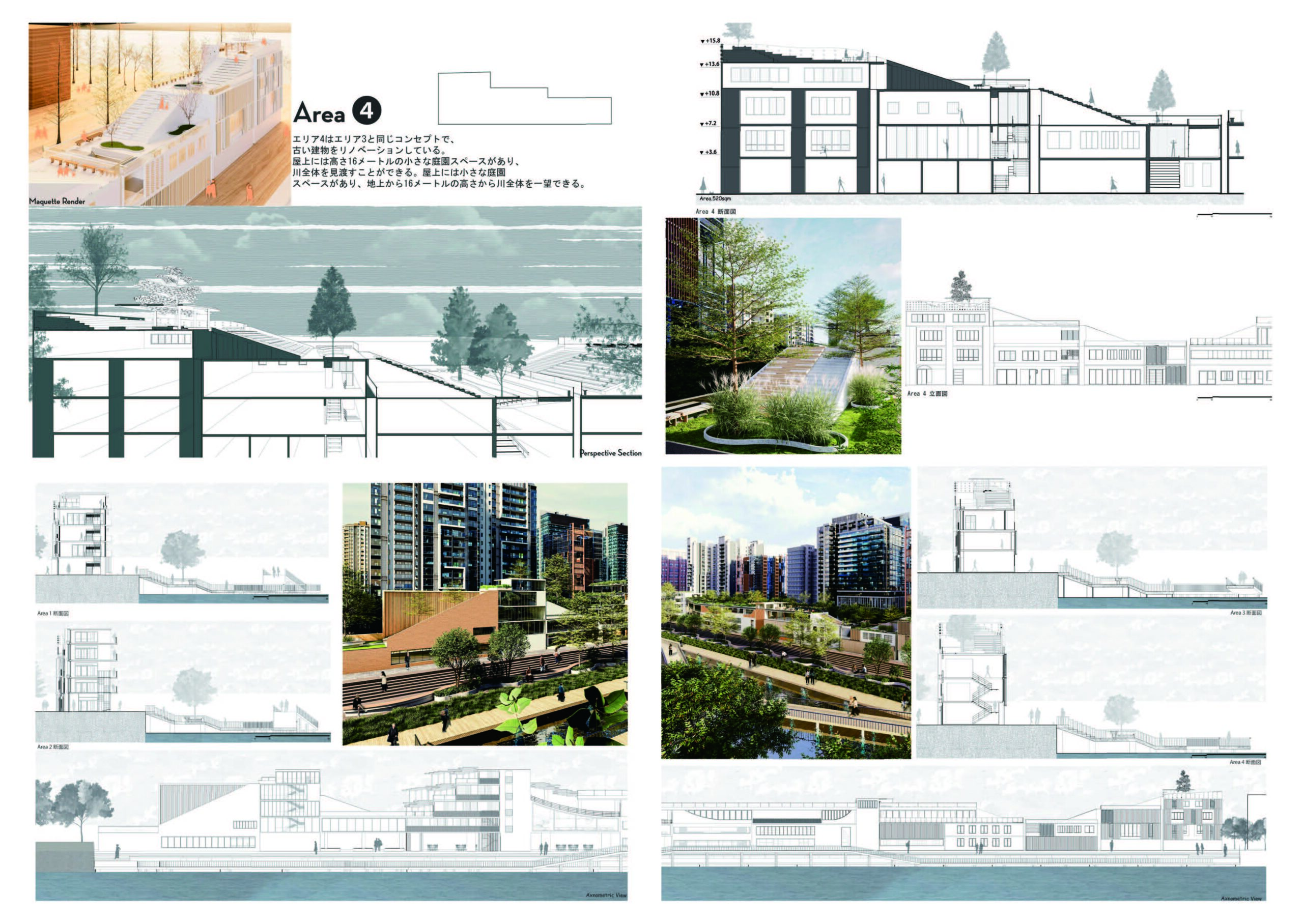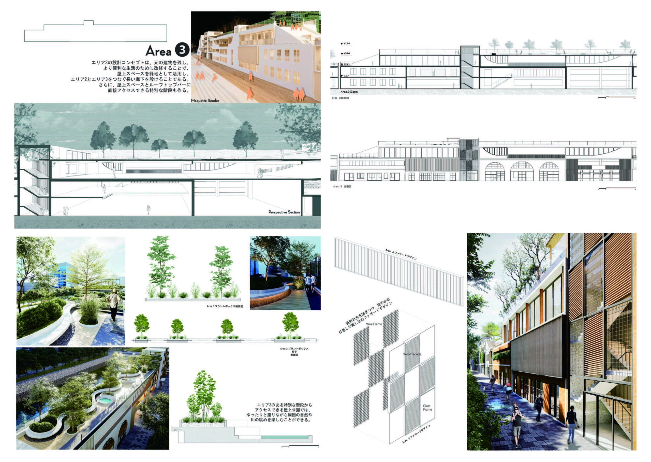こんなテーマでいいのかな?と不安な思いを持ちつつも、彼女独自の表現方法は審査会を経るたびに進化した。最終審査会で青砥先生から「マンガにするといい」というアドバイスを頂き、それを活かしての最終データとなった。改修が困難なRC造の既存建物への不満を自分の改善計画で覆い尽くす提案は、見た目はラジカルだけれども、実は無理の少ない優しい提案として結実している。<田中おと吉>