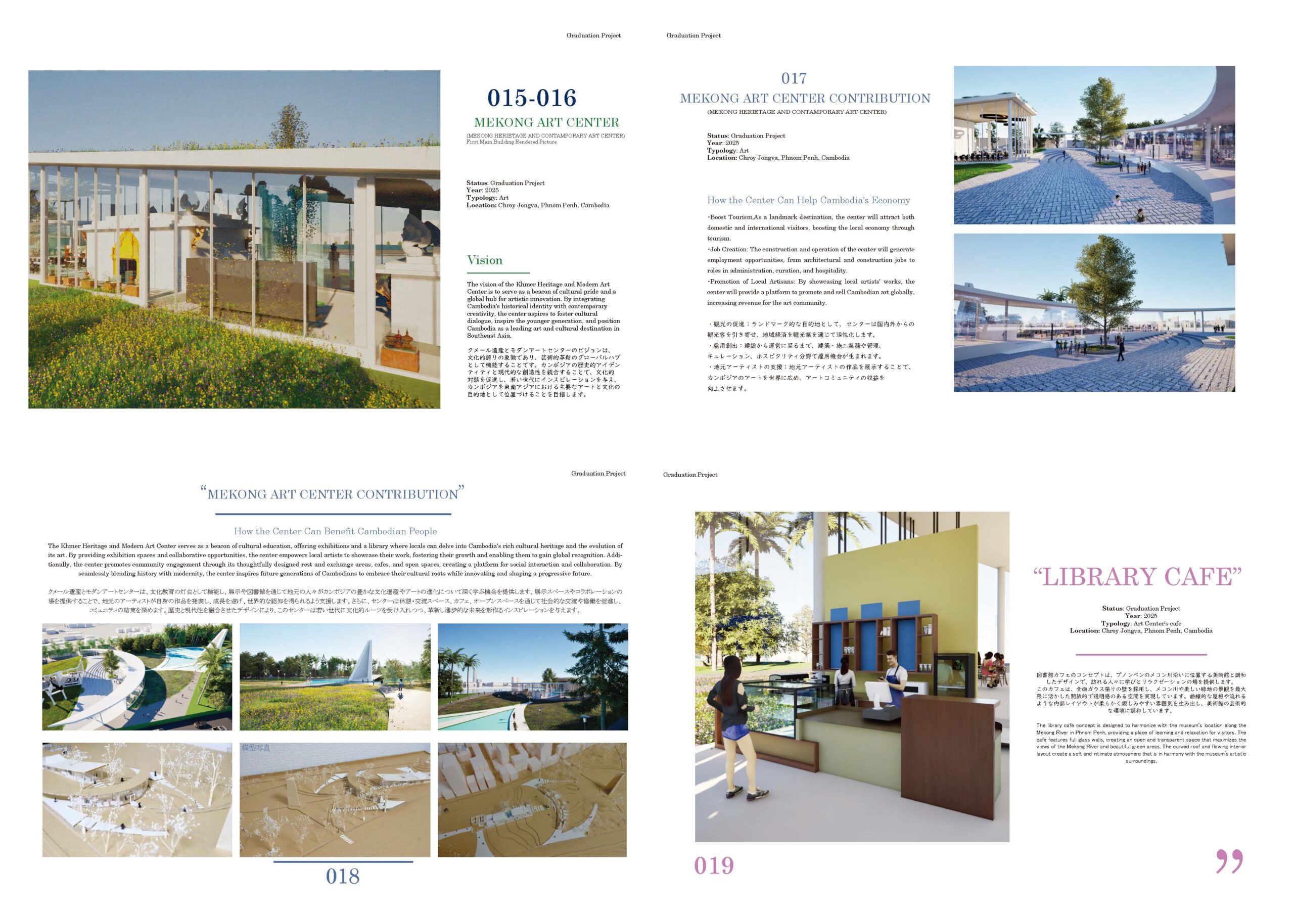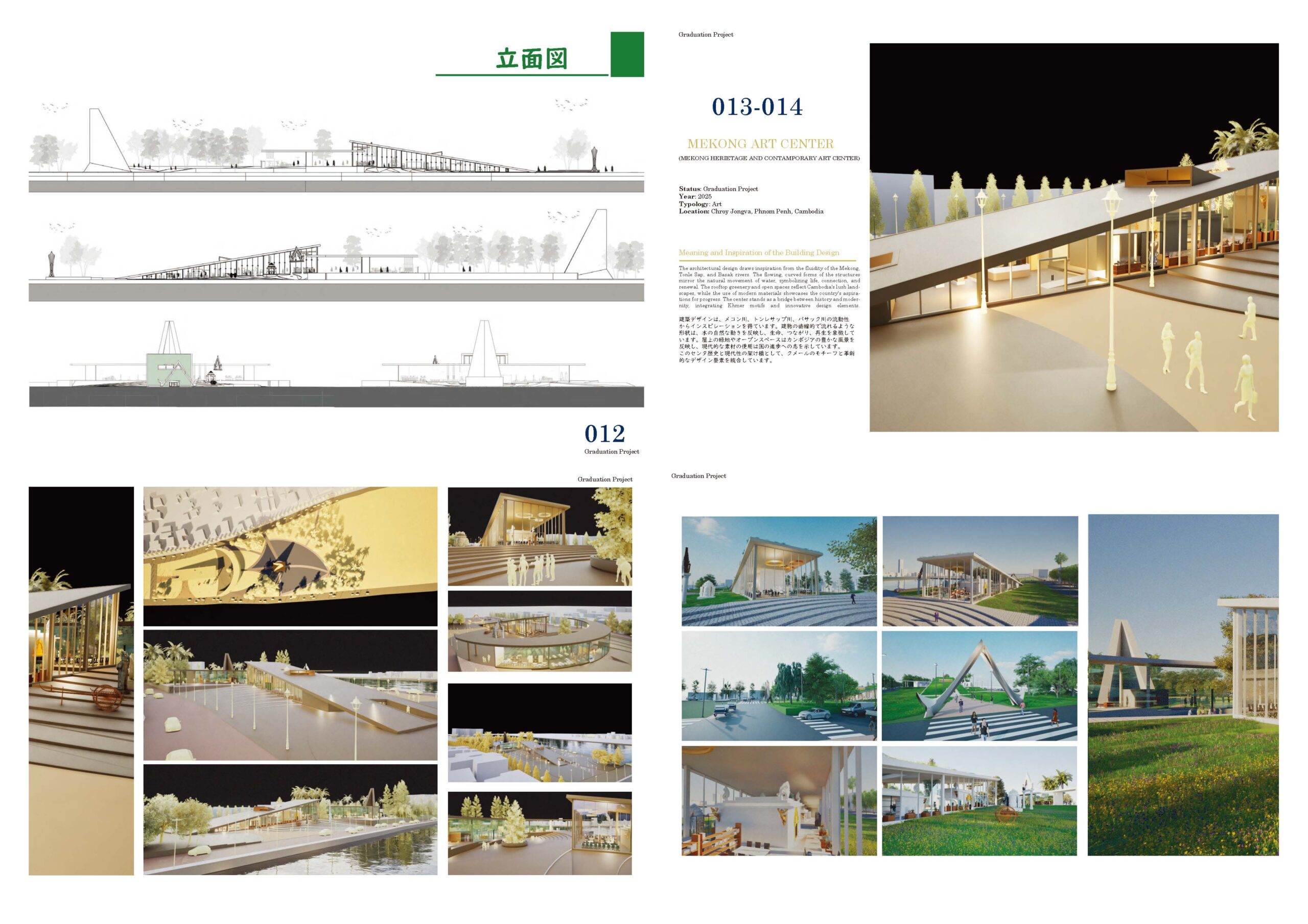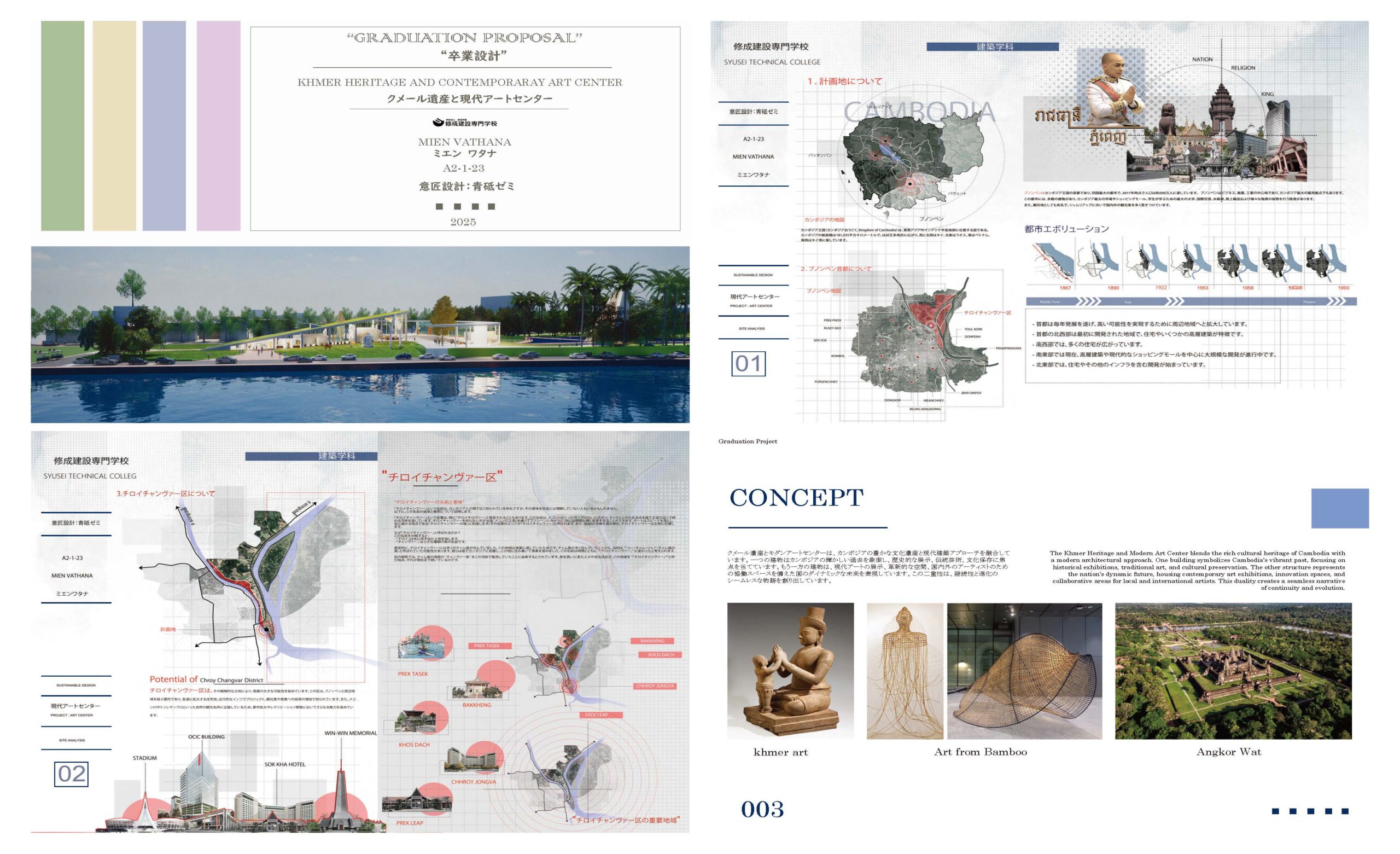 私の卒業設計では、カンボジアの豊かな文化遺産を現代的なアートと融合させる新しい拠点の設計に挑戦しました。このプロジェクトでは、地元の遺産である伝統的な建築スタイルを尊重しながら、現代社会に適応した持続可能なデザインを提案しました。特に、地域の文化を次世代に継承することの重要性を意識し、訪れる人々が学び、楽しみながらカンボジアの魅力を感じられる空間を目指しました。さらに、現代アートを取り入れることで、地域アーティストが活躍できる場を提供するとともに、国際的な交流も促進することを目標としています。設計過程では、学校の先生方やゼミの先生から多くのアドバイスをいただき、社会や環境への貢献を意識したプロジェクトとして形にしました。このプロジェクトが地域社会や文化の発展に役立つことを願っています。