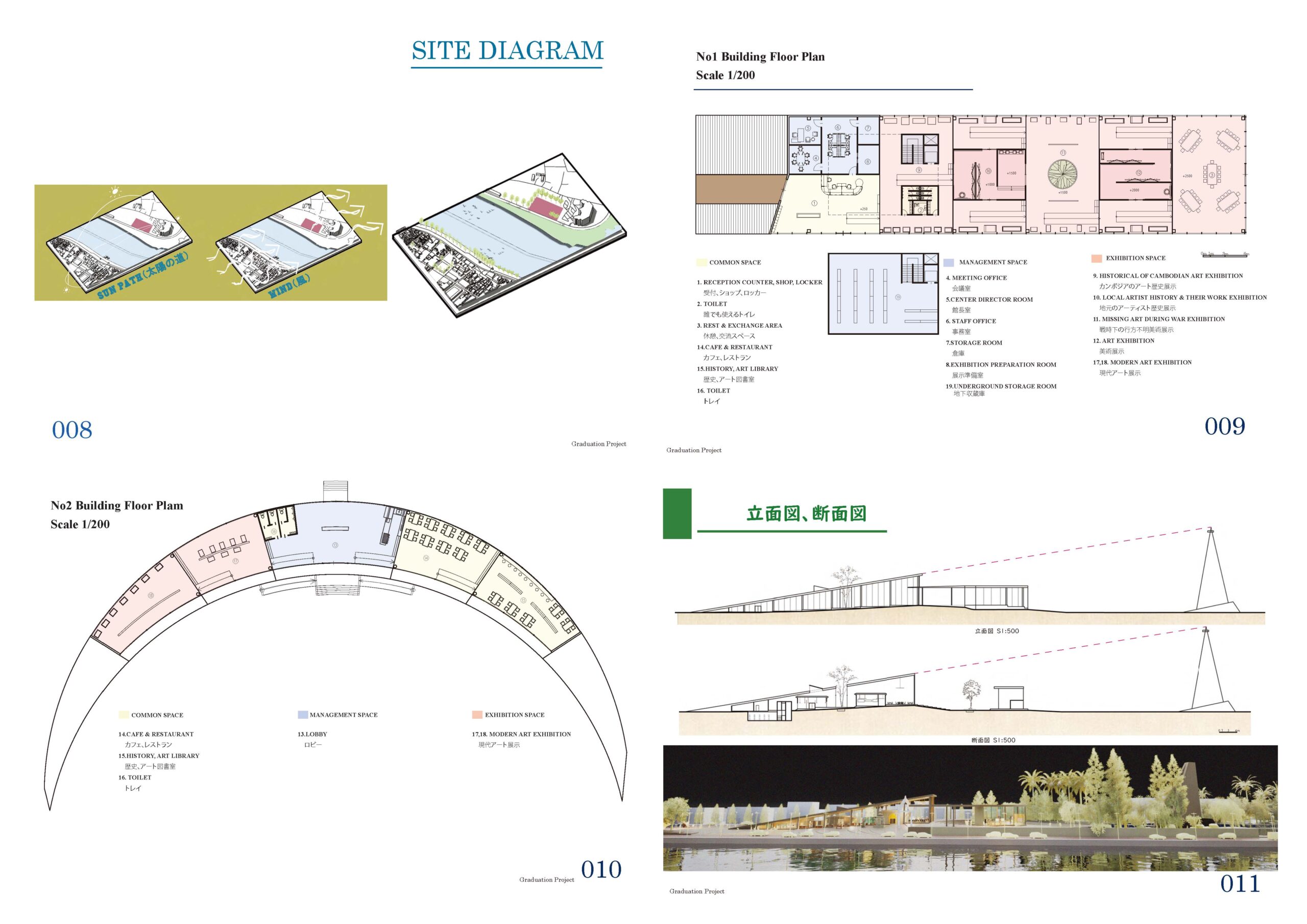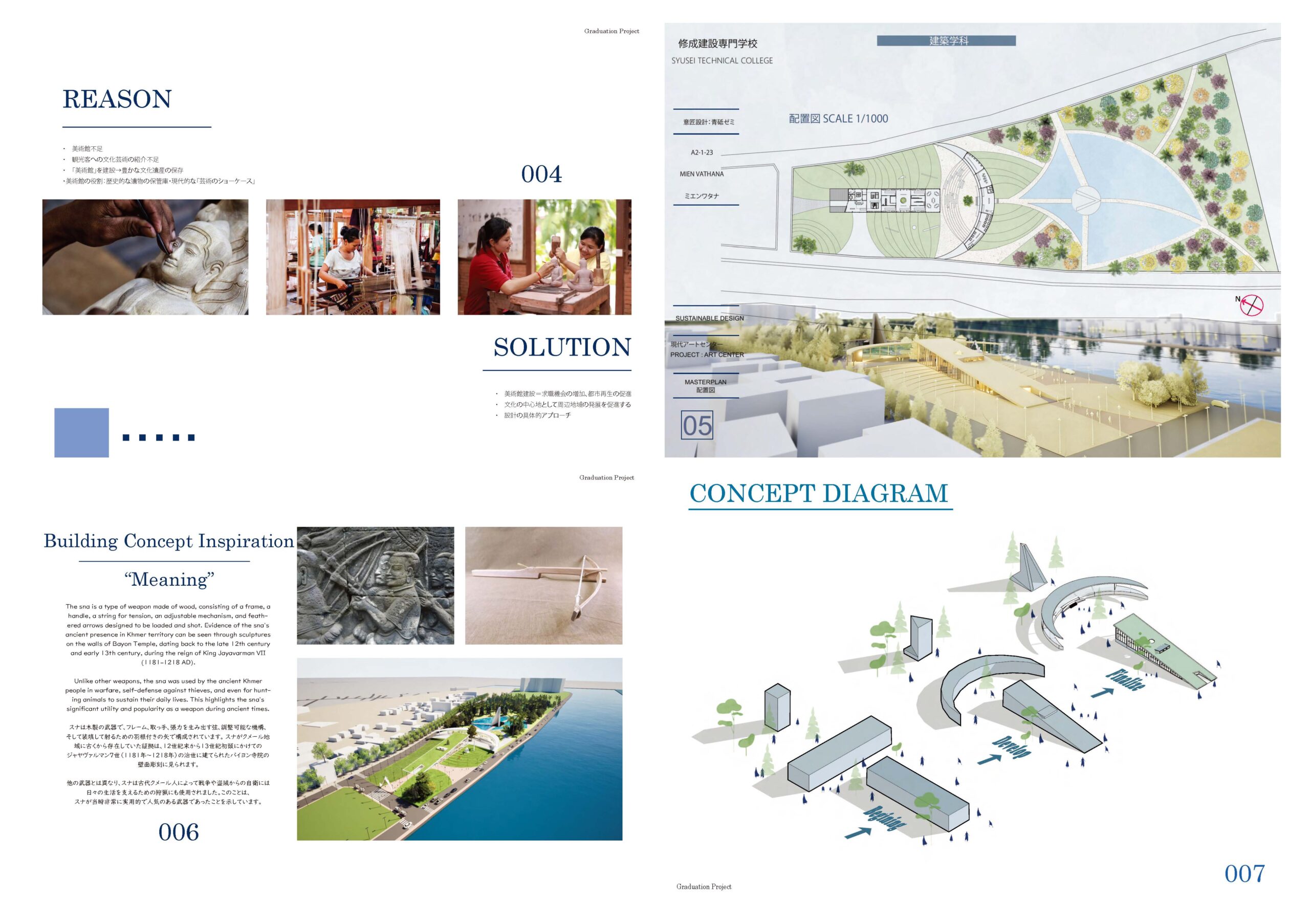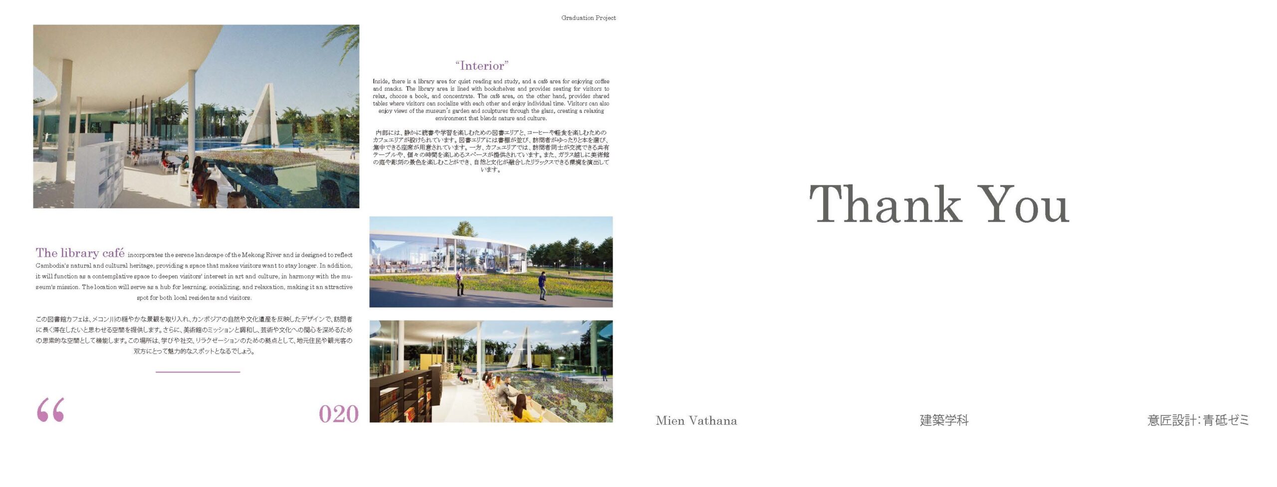 私の卒業設計では、カンボジアの豊かな文化遺産を現代的なアートと融合させる新しい拠点の設計に挑戦しました。このプロジェクトでは、地元の遺産である伝統的な建築スタイルを尊重しながら、現代社会に適応した持続可能なデザインを提案しました。特に、地域の文化を次世代に継承することの重要性を意識し、訪れる人々が学び、楽しみながらカンボジアの魅力を感じられる空間を目指しました。さらに、現代アートを取り入れることで、地域アーティストが活躍できる場を提供するとともに、国際的な交流も促進することを目標としています。設計過程では、学校の先生方やゼミの先生から多くのアドバイスをいただき、社会や環境への貢献を意識したプロジェクトとして形にしました。このプロジェクトが地域社会や文化の発展に役立つことを願っています。