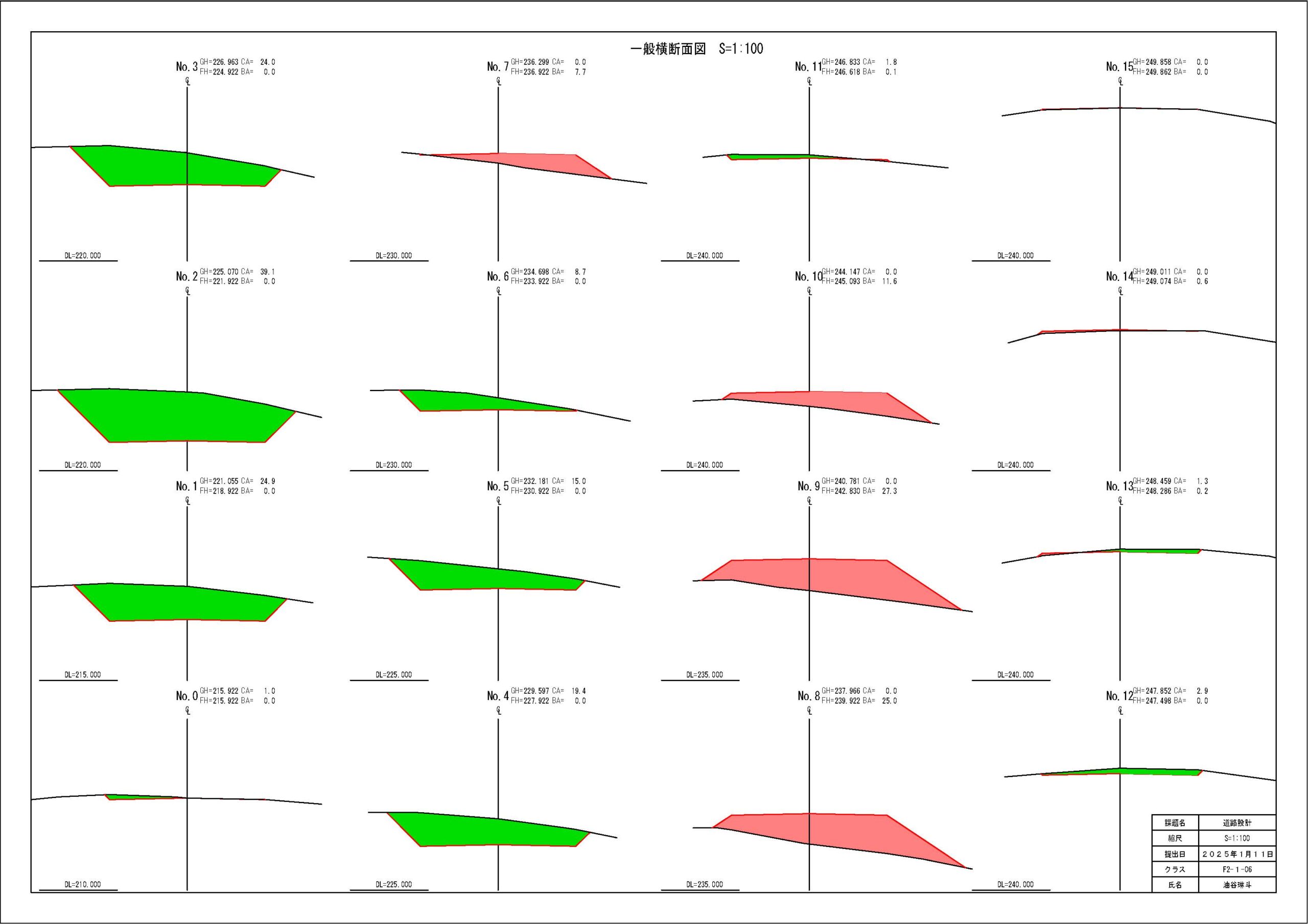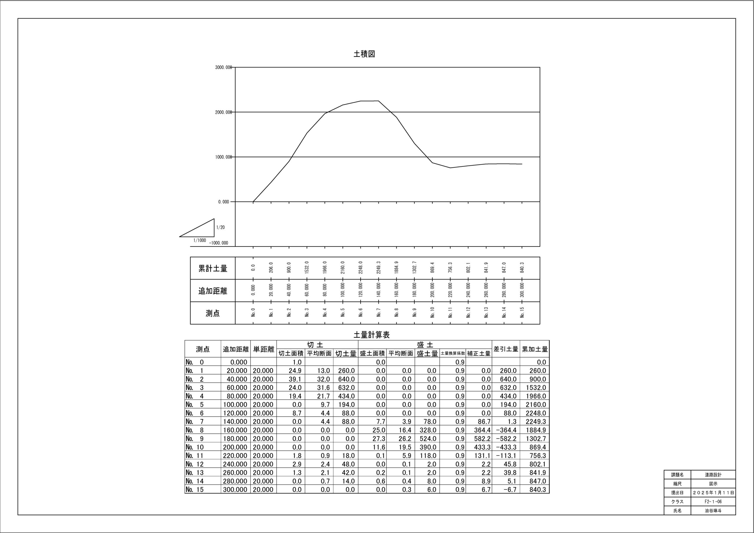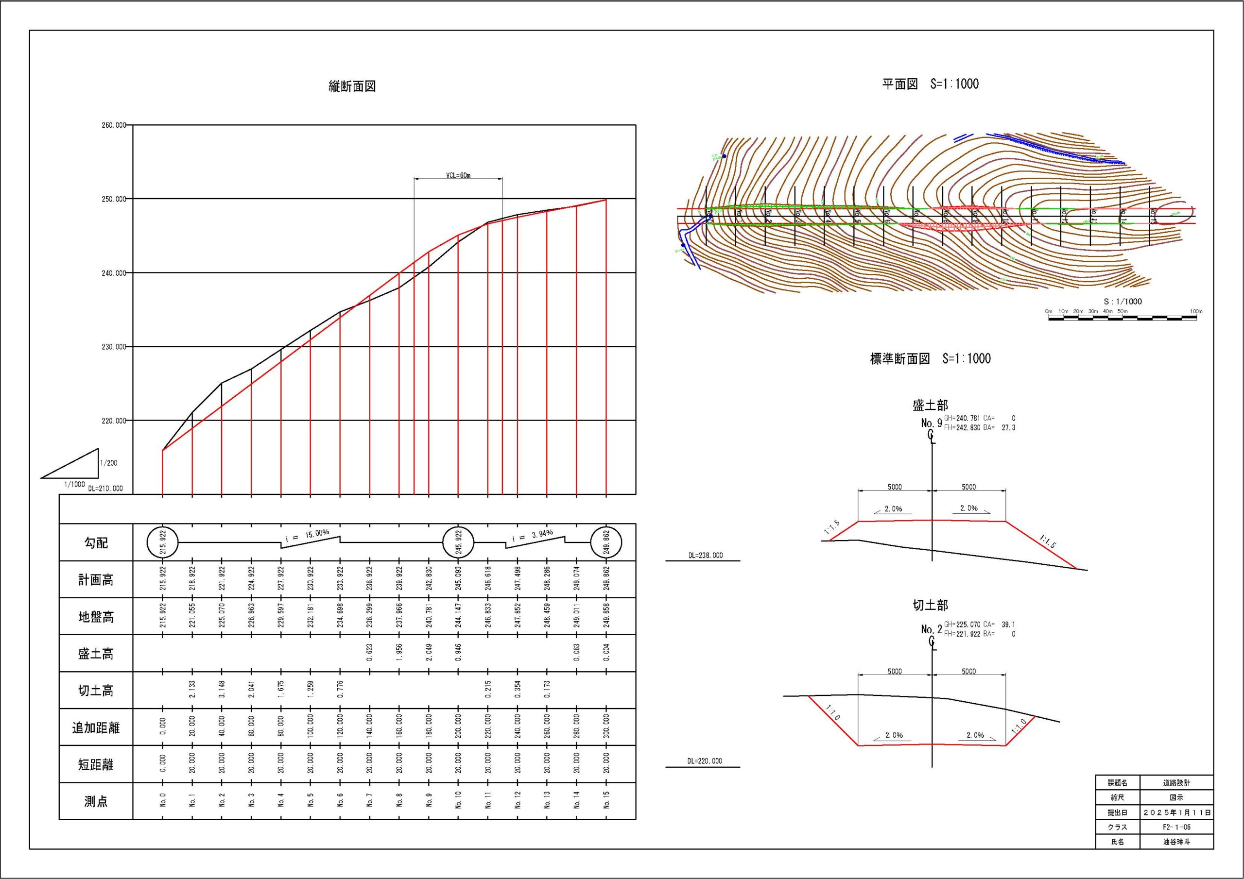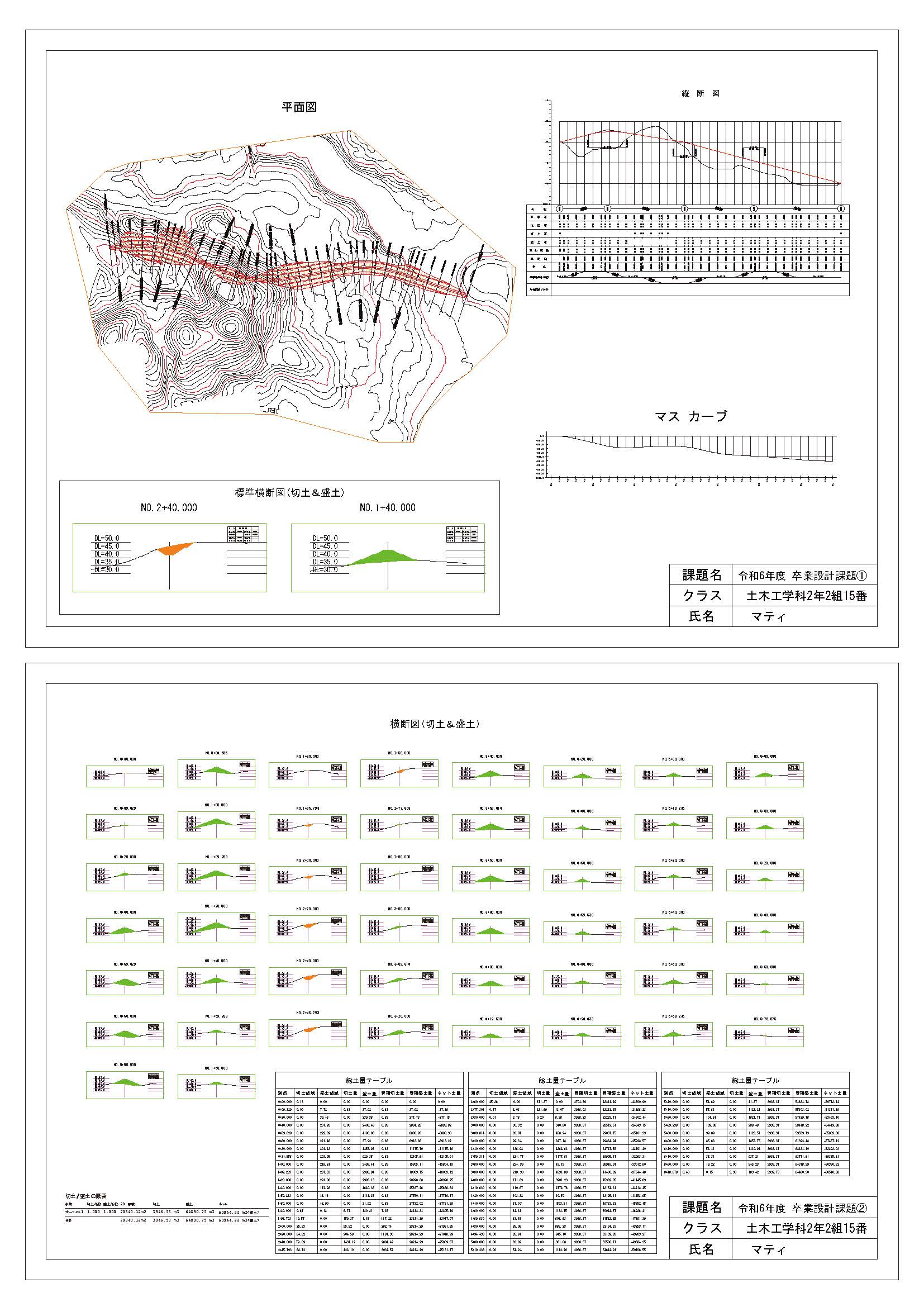 卒業設計は、地形図を使い、山頂に向かって片側幅員5m全幅10mの道路を300m計画するというものでした。まずは配布された地形図上の等高線を読んで現地の縦断図と横断図を作成しました。その横断図に縦断計画した道路を記入し、切土は1:1盛土は1:1.5ののり面こう配で横断図を作成した。その後、土量計算のために必要な切土面積、盛土面積をAutoCADの面積計測の機能を活用して求め、土量計算書と土積図を作成した。この作業を通して難しかったのはAutoCADとExcelを併用して作成していくところでした。図面の寸法や値を読み間違えるとExcelも修正しないといけなかったので苦労しました。この卒業設計ではCAD作成技術やExcelでのまとめ方などを学びまた作成にあたり正確さとより迅速に作成することが大切だと知り今後の仕事にも活用していきたいです。