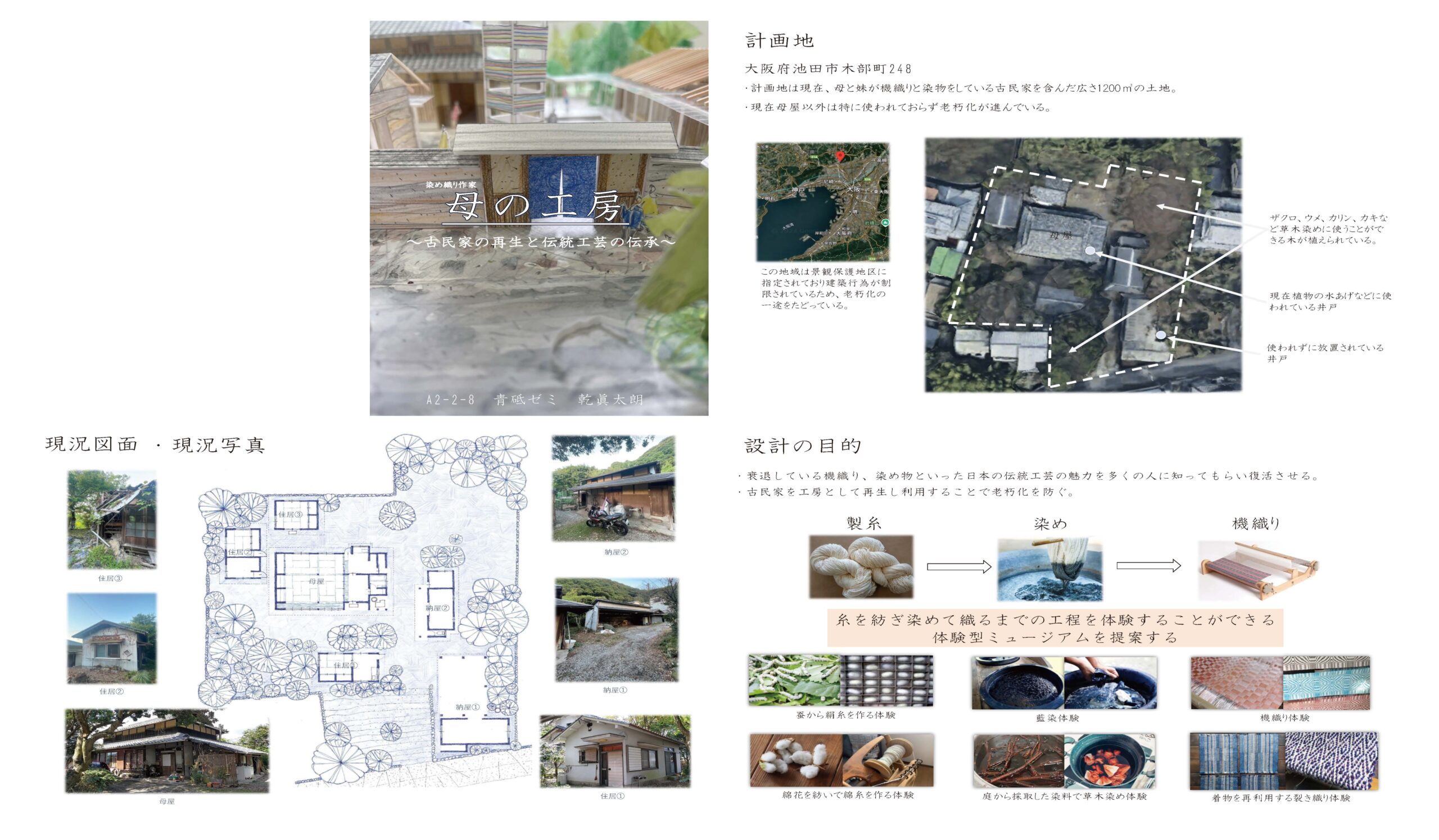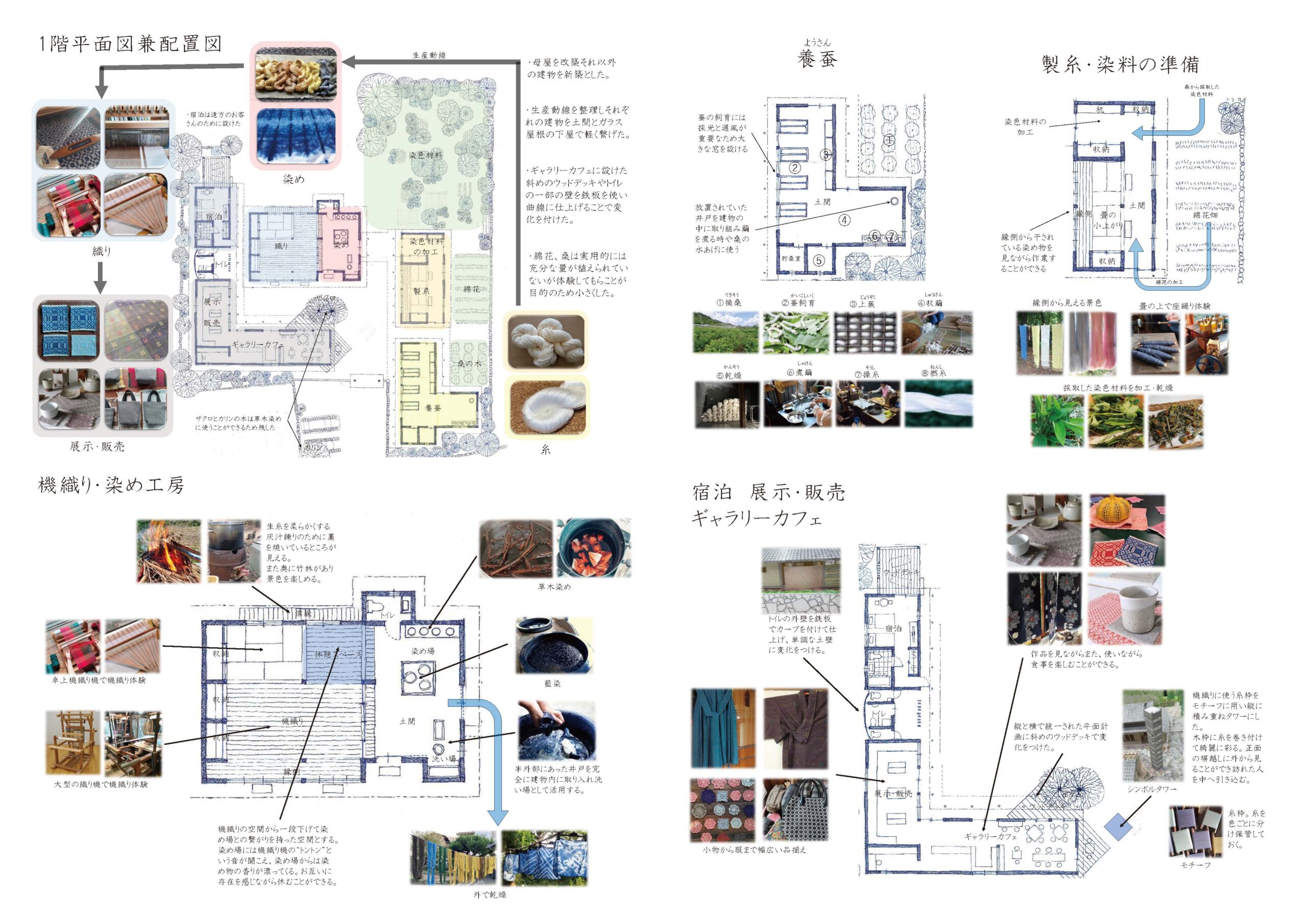 私は景観保護地区として建築行為が制限されているがために古びてゆく母の工房を救いたいという思いからこのテーマで卒業設計を進めました。また機織り、染め、養蚕といった、廃れてゆく伝統工芸が幼少期から身近にあり魅力を知っているためこの素晴らしさを多くの人に知って欲しいという気持ちもありました。この卒業設計をきっかけに多くのインタビューや体験を通してより母の行っている機織りや染めといった伝統工芸についてより深く知ることができより一層この技術が失われてはならないと思うようになりました。私はこの建物を将来実現することが夢です。それを叶えるため建築士として一人前になれるよう努力していきたいと思います。