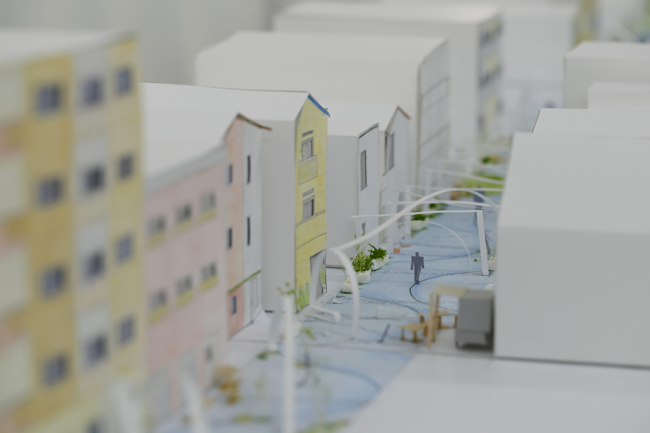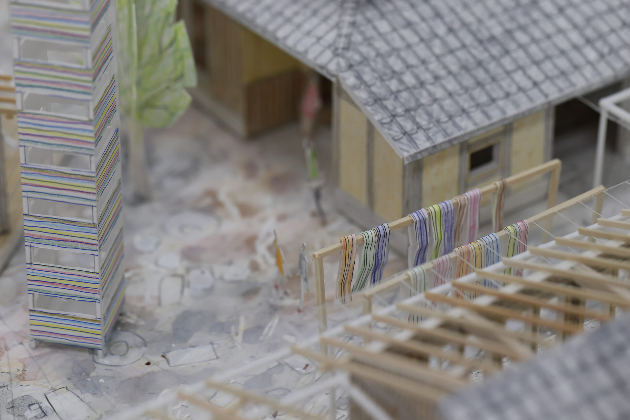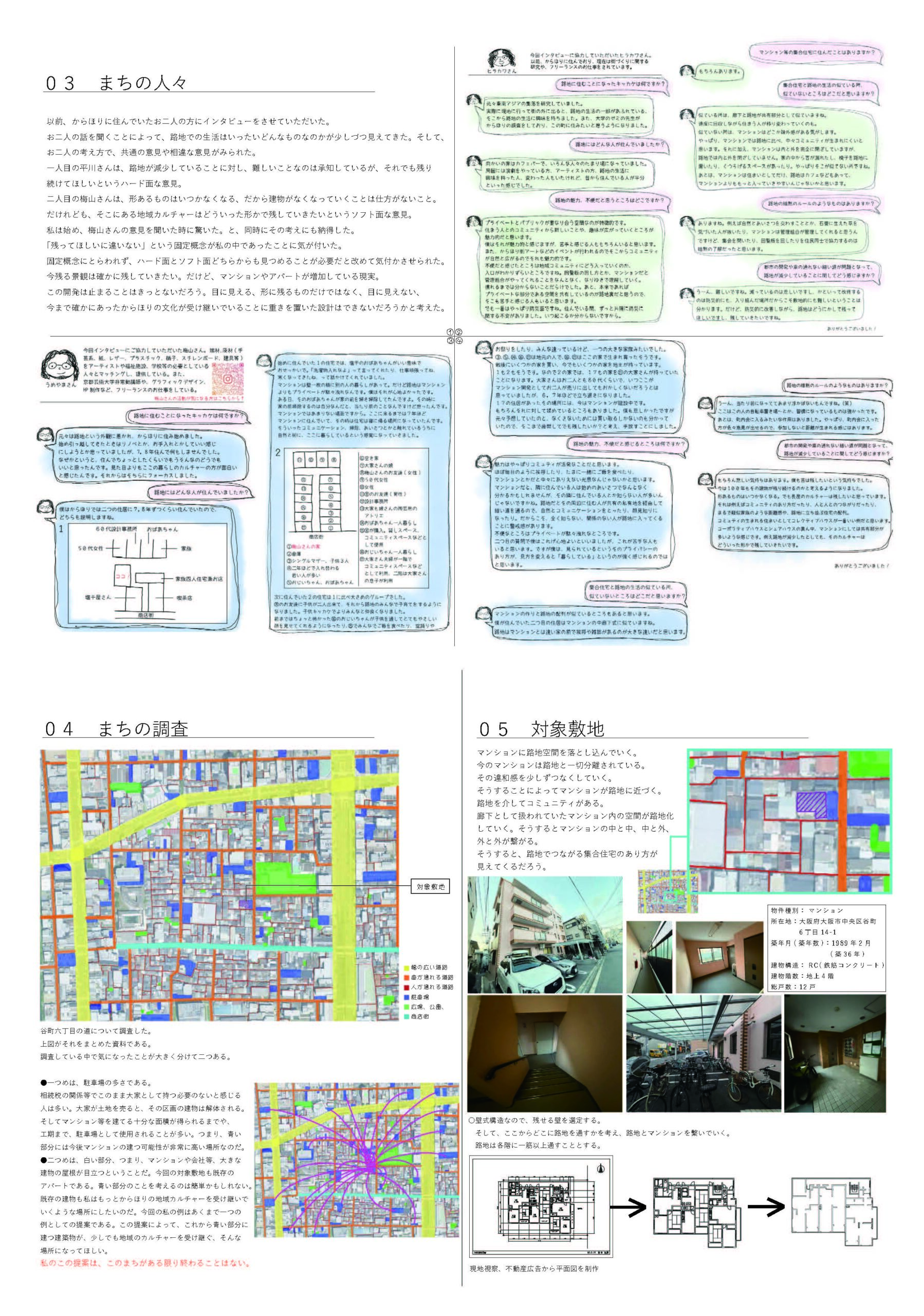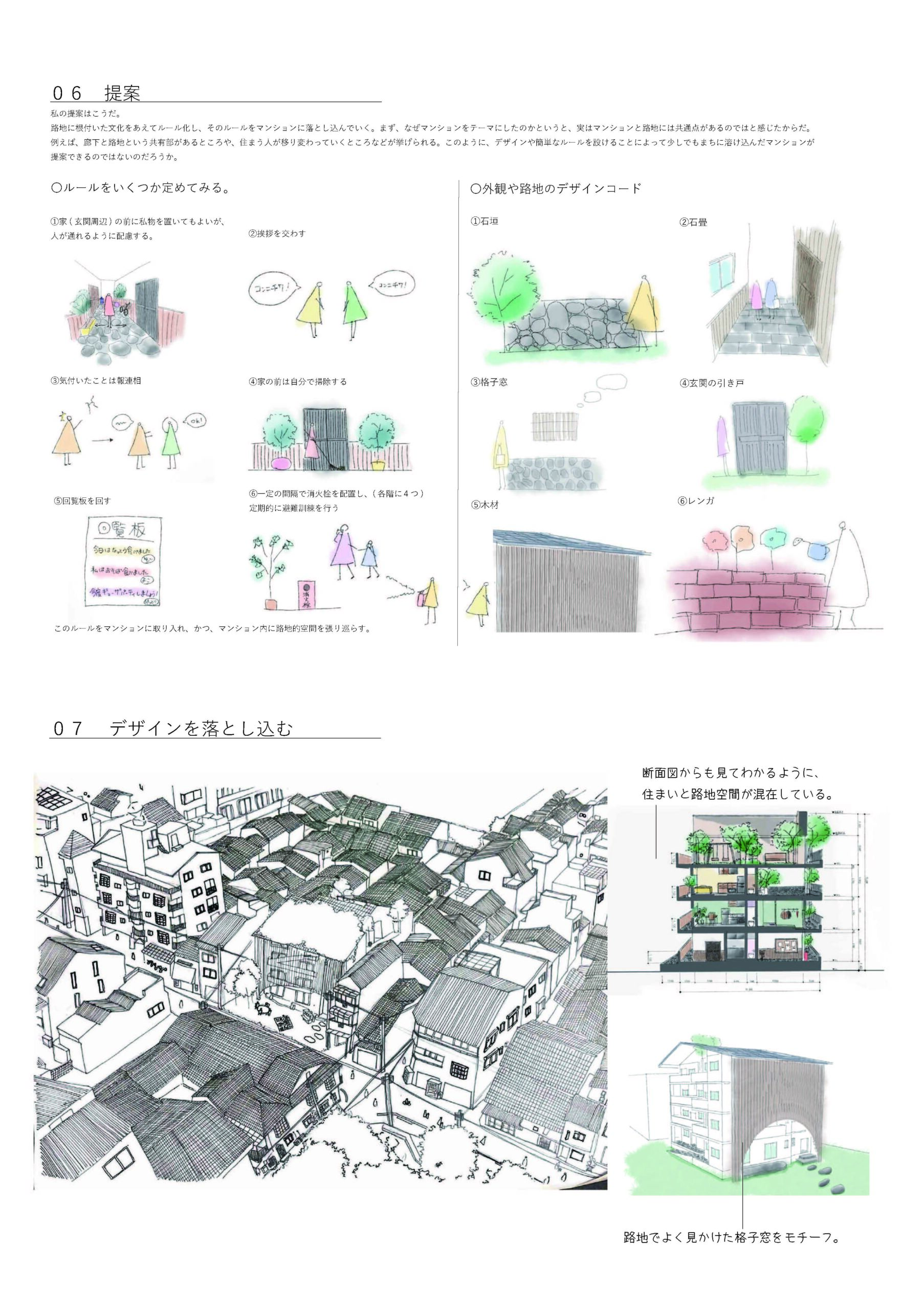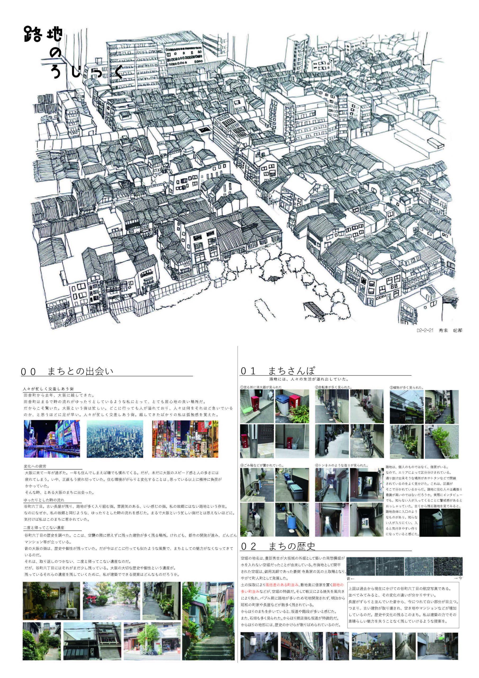 松屋町~上町筋まで東西約800mつづく商店街を中心に、空襲の被害が少なかったためにいち早く復興したという歴史があります。周辺には昭和時代初期の長屋や路地が残り、近年、地元建築家らが長屋を改装した雑貨店などができ活況を呈しています。しかし高齢化や無秩序なマンション開発で、本来とは異なったカタチになってきています。彼女はこの街を歩き、多くの路地居住者にインタビューし分断された長屋界隈とマンション、それぞれの居住者をつなぐために街全体に路地を張り巡らせるリノベーションを考えました。タイトルの「路地のロジック」は言いえて妙です。道路ではなく、人が中心の路地幅スケールで街が毛細管現象のように潤っていく、そんな卒業設計になりました。<眞野サトル>
