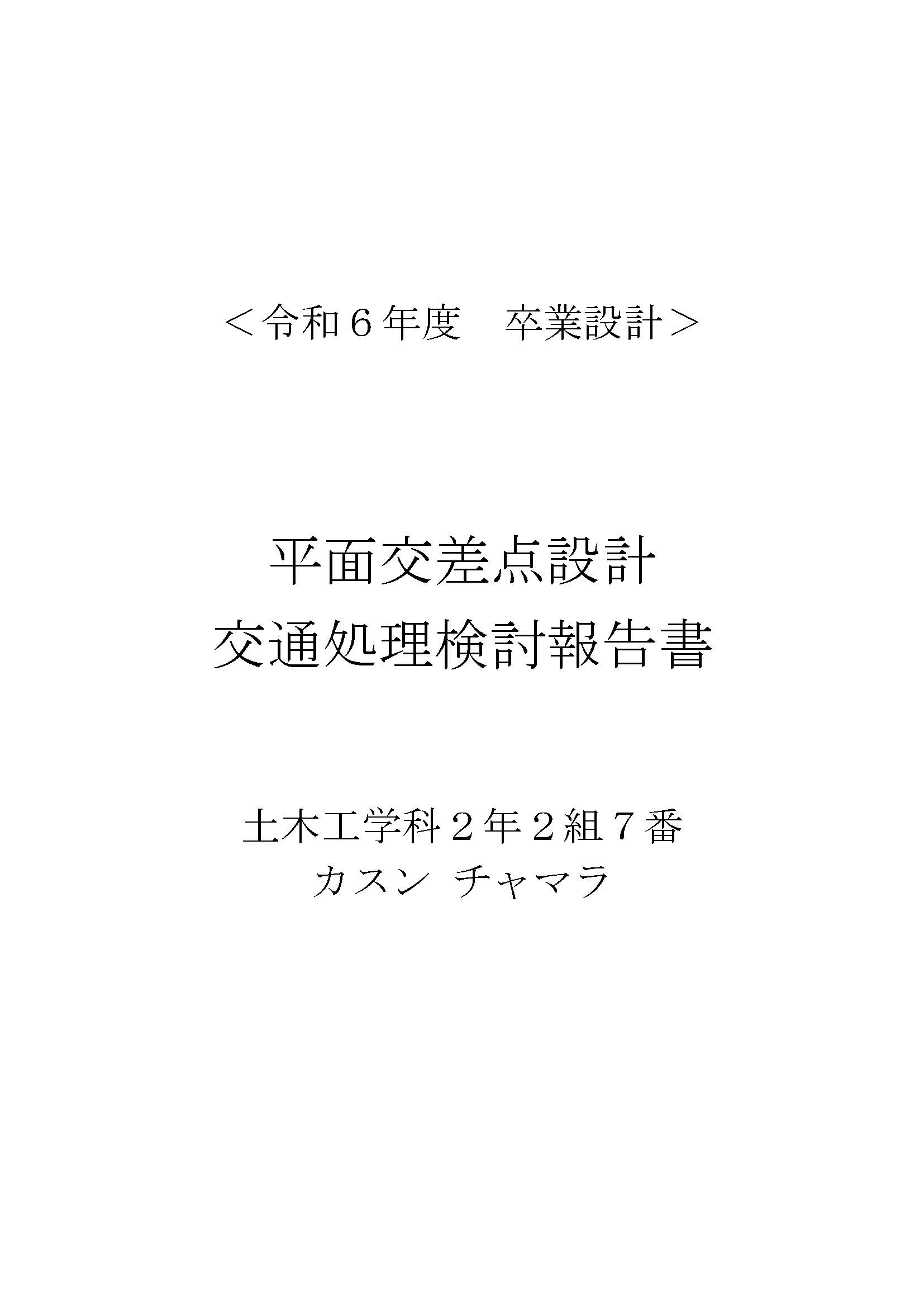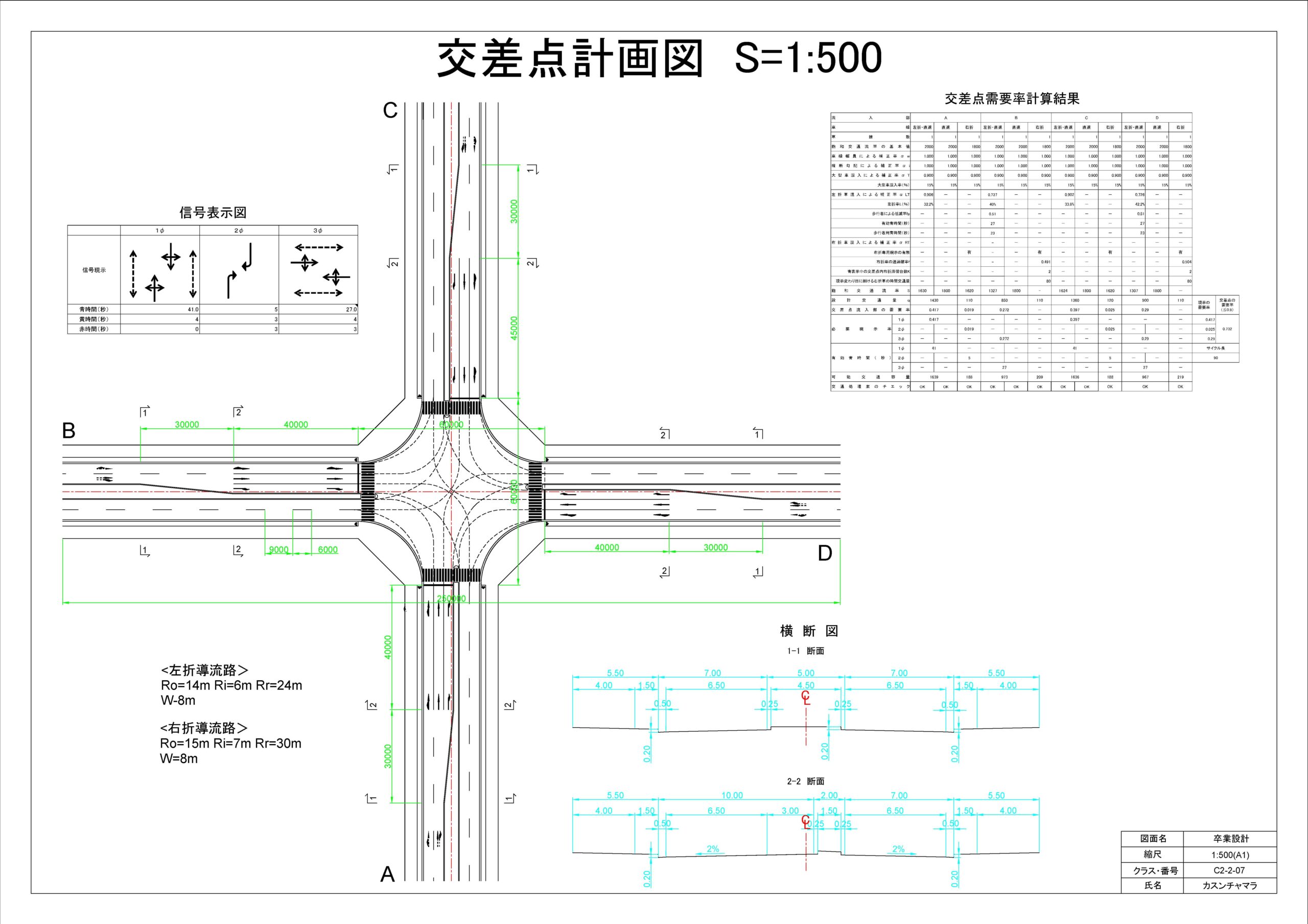 この作品は、私たちが日ごろ頻繁に使用している交差点の設計です。与えられた交通条件をもとに、交差点で渋滞が発生しないよう、信号の長さを調整するなどして計算した上で、交差点の幾何構造を決めました。先生から提供されたPDFの資料によって基本的には作業が円滑に進みましたが、設計の過程では計算が多く、excelでは時々エラーが発生し、電卓で計算してまたexcel入力を確認するというトライ&エラーの繰り返しに時々苦労しました。それが一番頑張ったところです。またこの卒業設計では、友達と話し合って図面のあいまいな部分が明確になったところもあります。協力してくれた方々に感謝いたします。