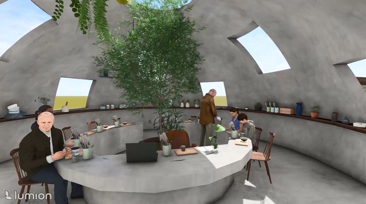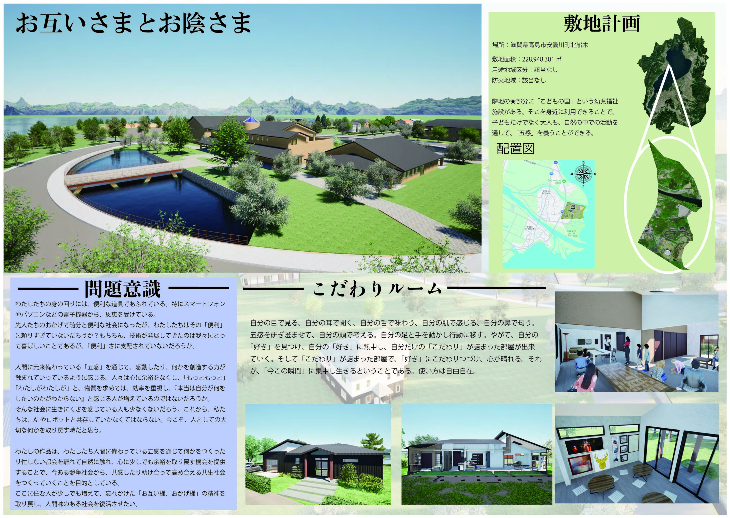 技術の発展によって失われつつある「お互い様とおかげ様」の精神を取り戻すため、この集落を設計しました。技術の発達により生活は便利になりましたが、能動的な行動や人との温かいつながりが希薄になっています。また、五感を通じた創造の力も衰えつつあります。本作品では、五感を活かし、心に余裕を持てる環境を提供することで、競争から協調へと意識を転換し、共生社会を築くことを目指します。「こだわりルーム」を備えた家では、住人が自身の「好き」を追求し、縁側や庭で自然な交流を育みます。集落の中心には「センターサークル」があり、住民のふれあいの場となるほか、介護・学童施設を併設し、お互いを支え合う環境を整えました。この集落を起点に、人間味ある社会を取り戻していきます。