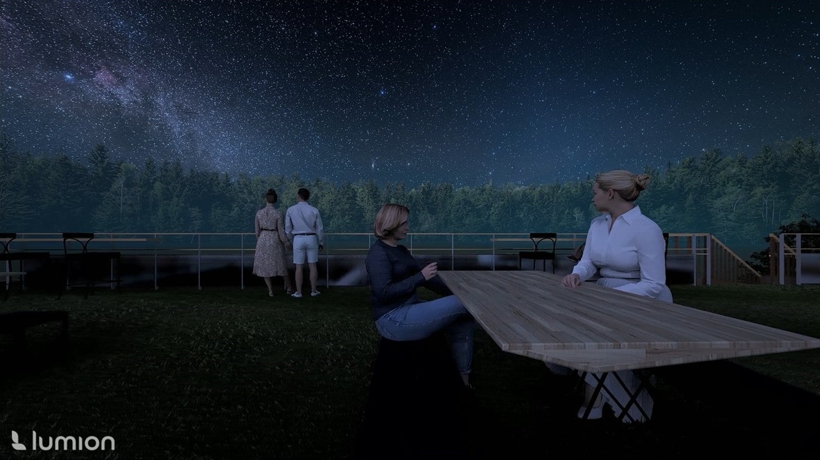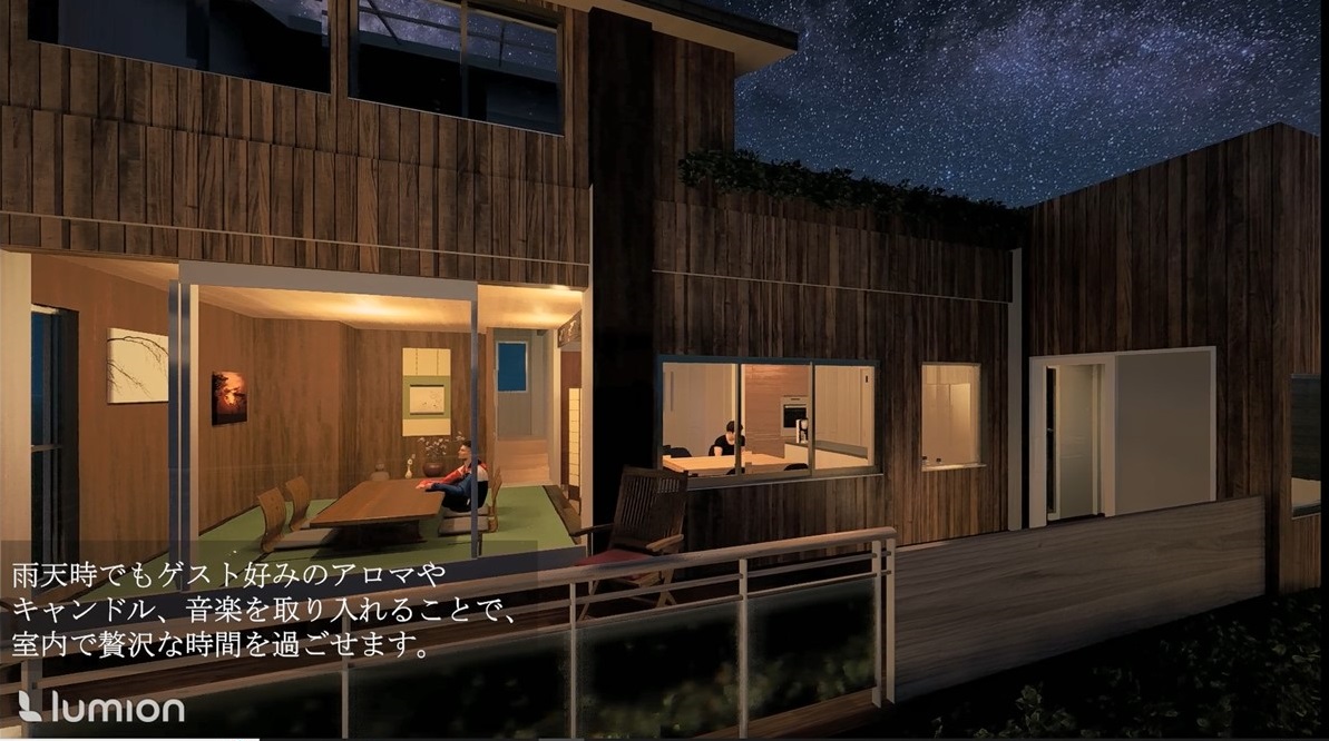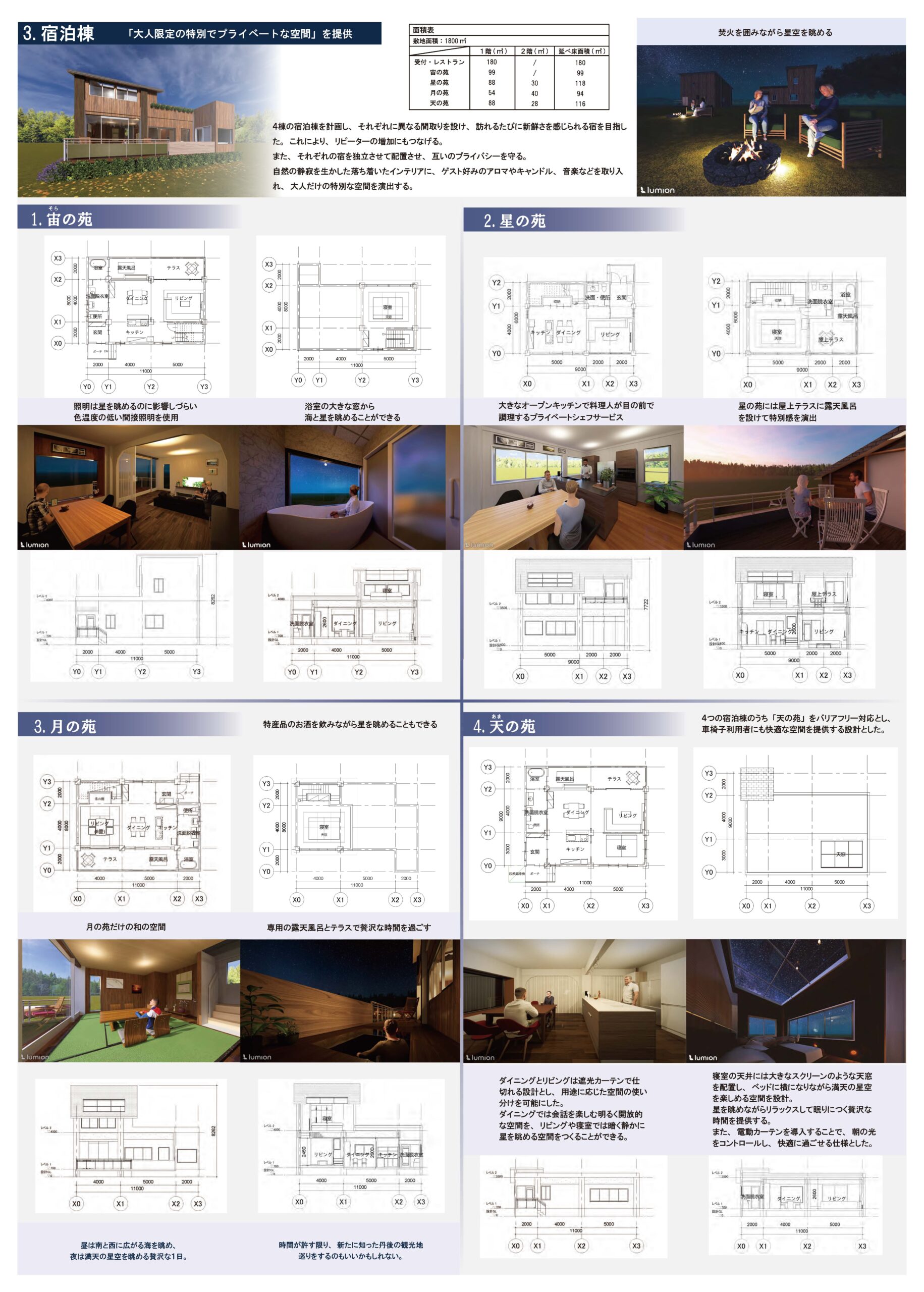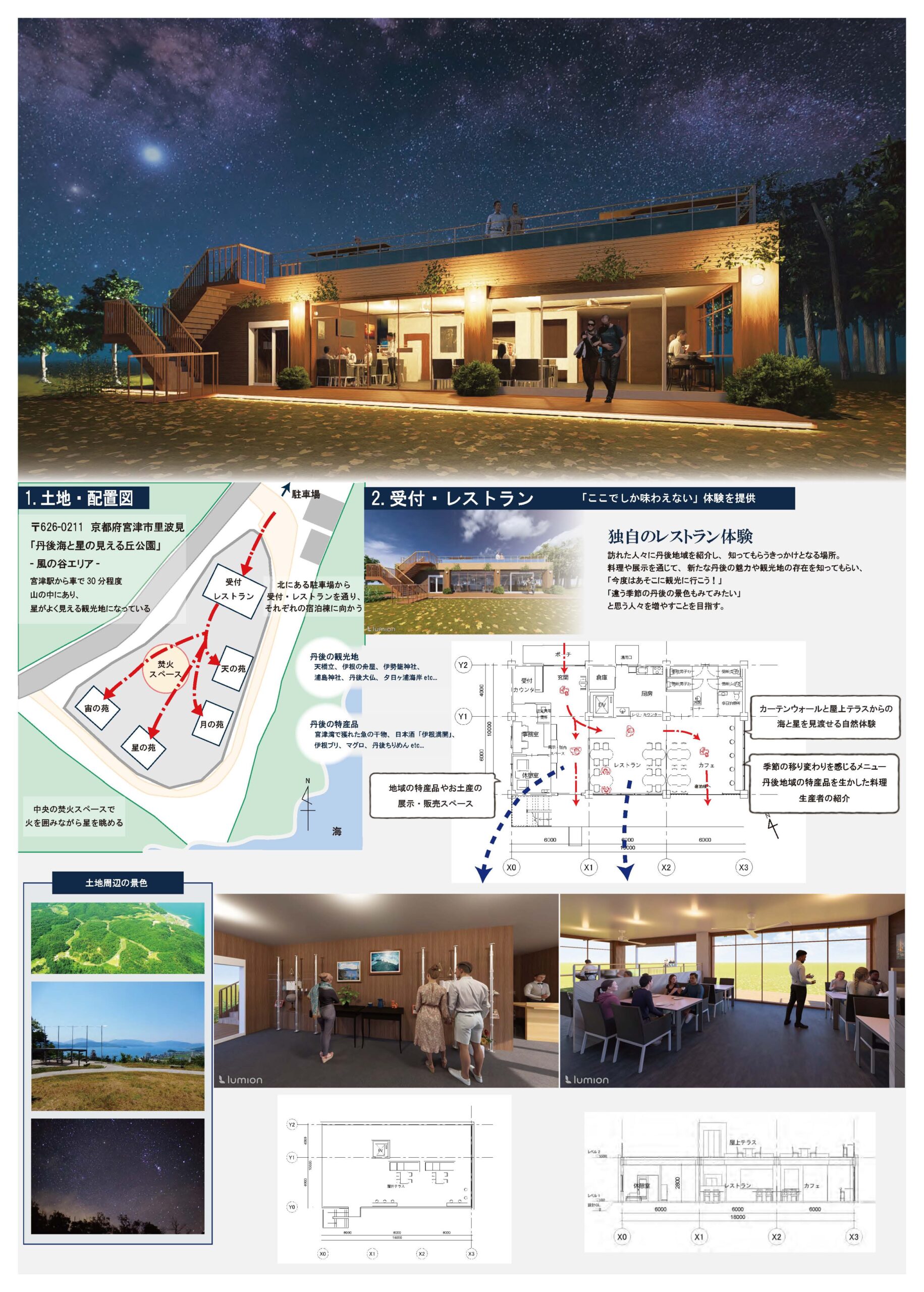 私が計画したのは、「海と星が寄り添う宿」。大人限定の特別な宿泊施設です。京都府北部・丹後地域の魅力を伝え、観光のきっかけとなることを目的としています。宿は星がよく見える山中に位置し、4棟の独立した宿泊棟と、地域の特産品を生かしたレストランを設けました。寝室には大きな天窓を配置し、ベッドに横になりながら満天の星を楽しめます。また、専用の露天風呂やプライベートシェフサービス、リビングとダイニングを遮光カーテンで仕切る工夫など、大人が贅沢に過ごせる設計としました。この宿を通じて、丹後の新たな魅力を知ってもらい、再訪する人を増やすことを目指します。