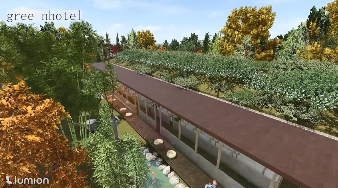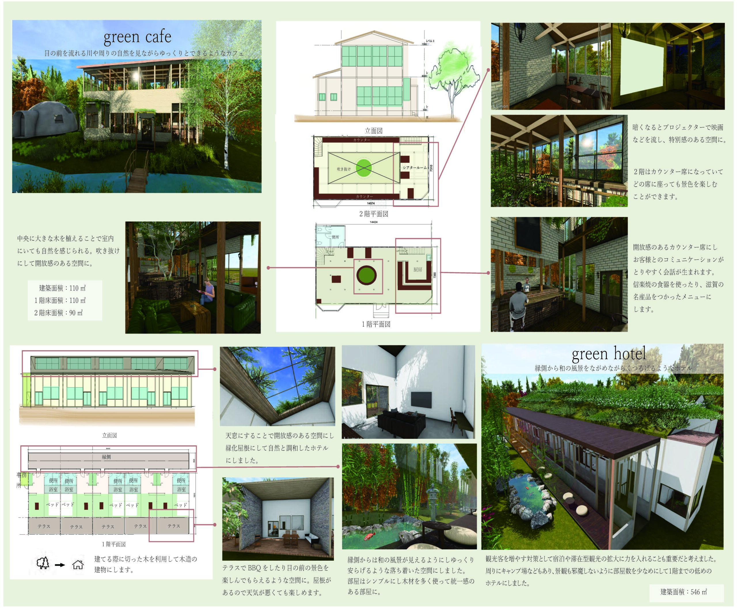 今回計画した地域は私の祖父母が暮らしている地域になっており、高齢化や過疎化が深刻な地域でもあります。思い出が詰まったこの場所を大切にしたいという思いが強く、できるだけ自然豊かなこの風景を壊さないように活かし、人と自然が調和した空間をコンセプトにし今回デザインしました。