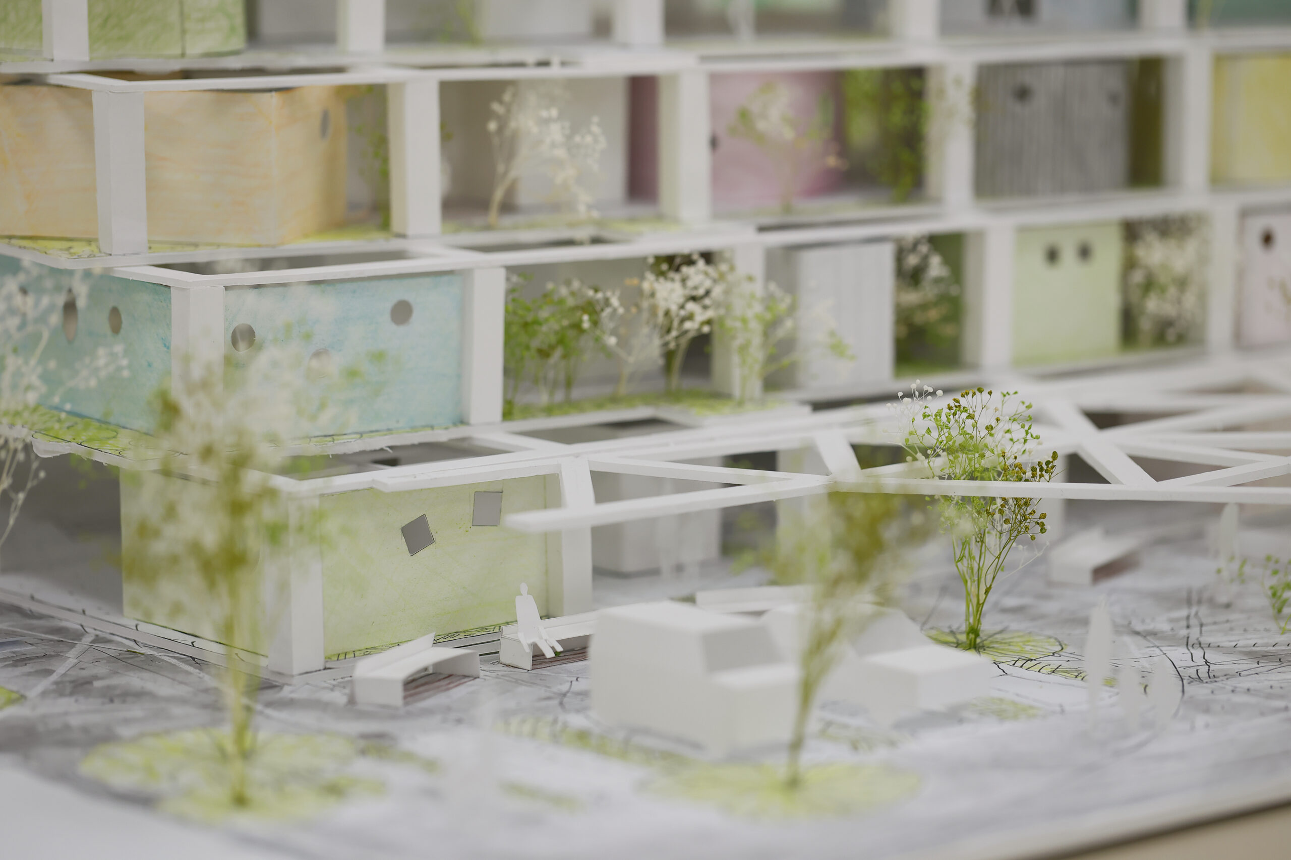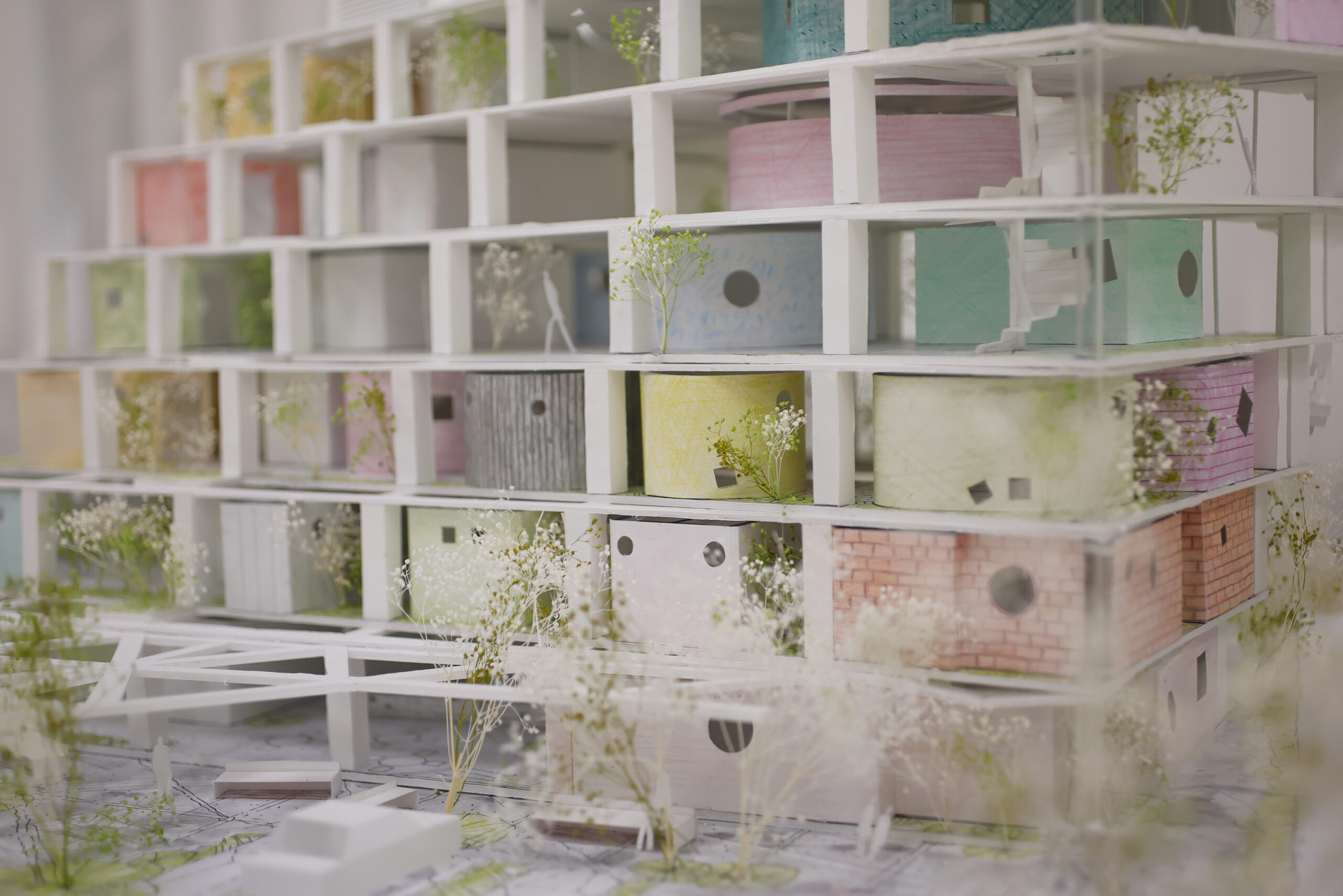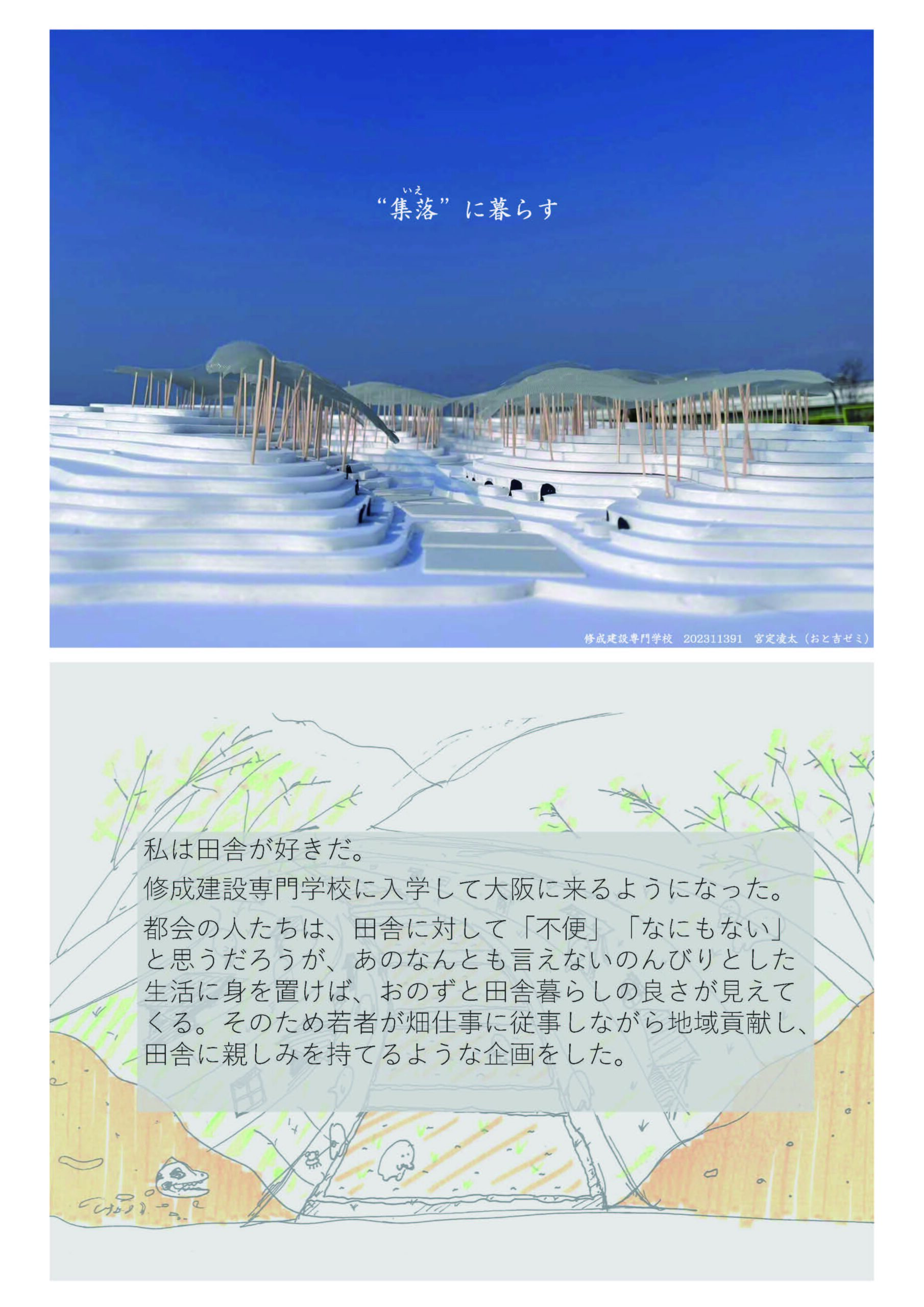 彼は以前より、人間の「能動的な行動や、人との温かいつながり、五感を通じた創造の力が衰えている」と感じており、対策を考えていた。そして今回この問題に対して「競争から協調へ意識転換」をキーワードに成長する集落を提案する。これは始まりであり、人と人とが縁を結ぶように、徐々に広がっていく。家をあえて点在させ、曖昧な空間(自由空間)を持たせることで、自然と人々が集まり思い思いに過ごすことができる。「こだわりルーム」を持つ家では、同じ「好き」を持った人同士が縁側や庭で集い交流する。ちょっと離れたところでなんとなく人の気配を感じれて、1人ではない安心感と、「困った時はお互い様よ」と言い合えていた懐かしい場所と時代を思い出させる作品である。<岡部優季>