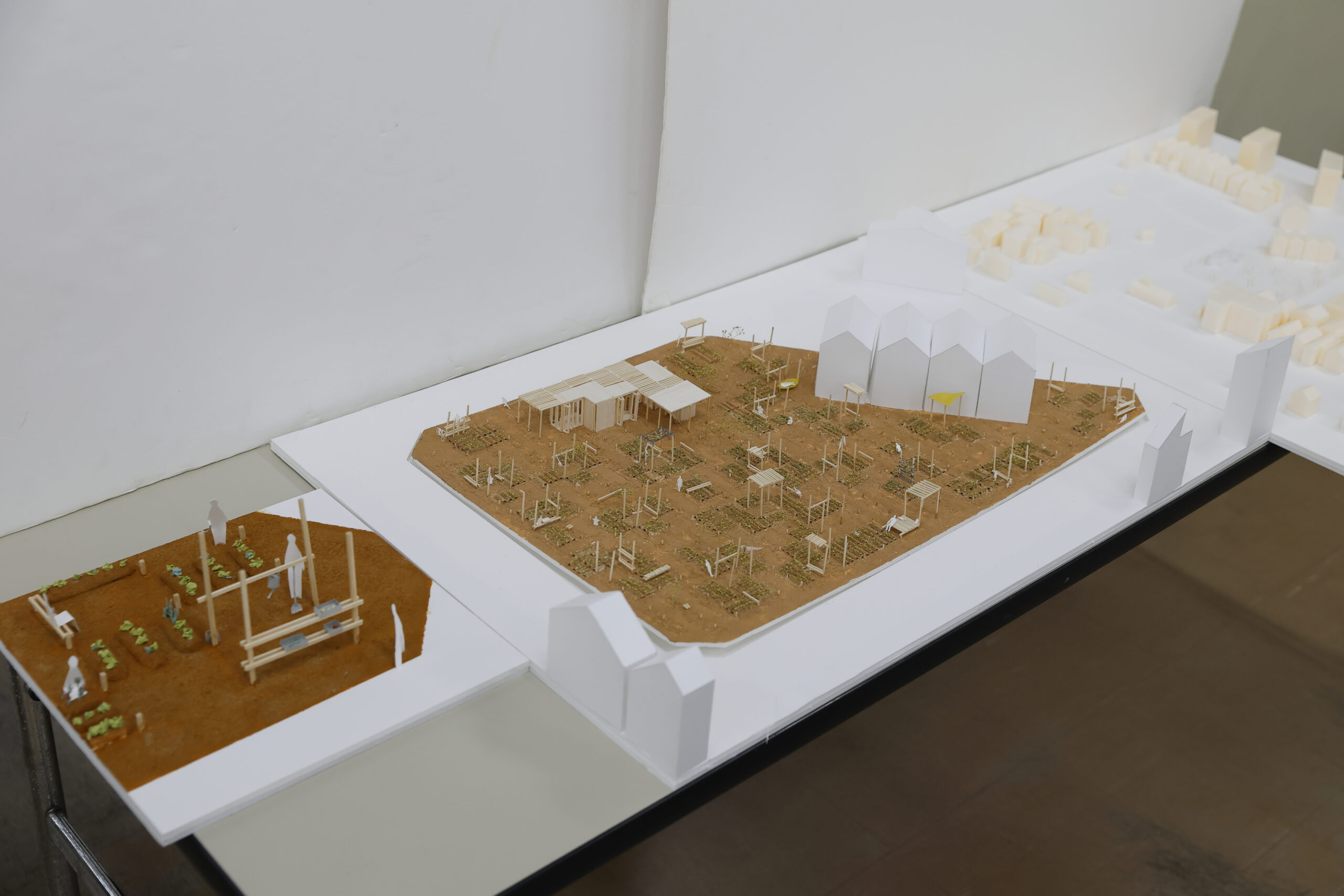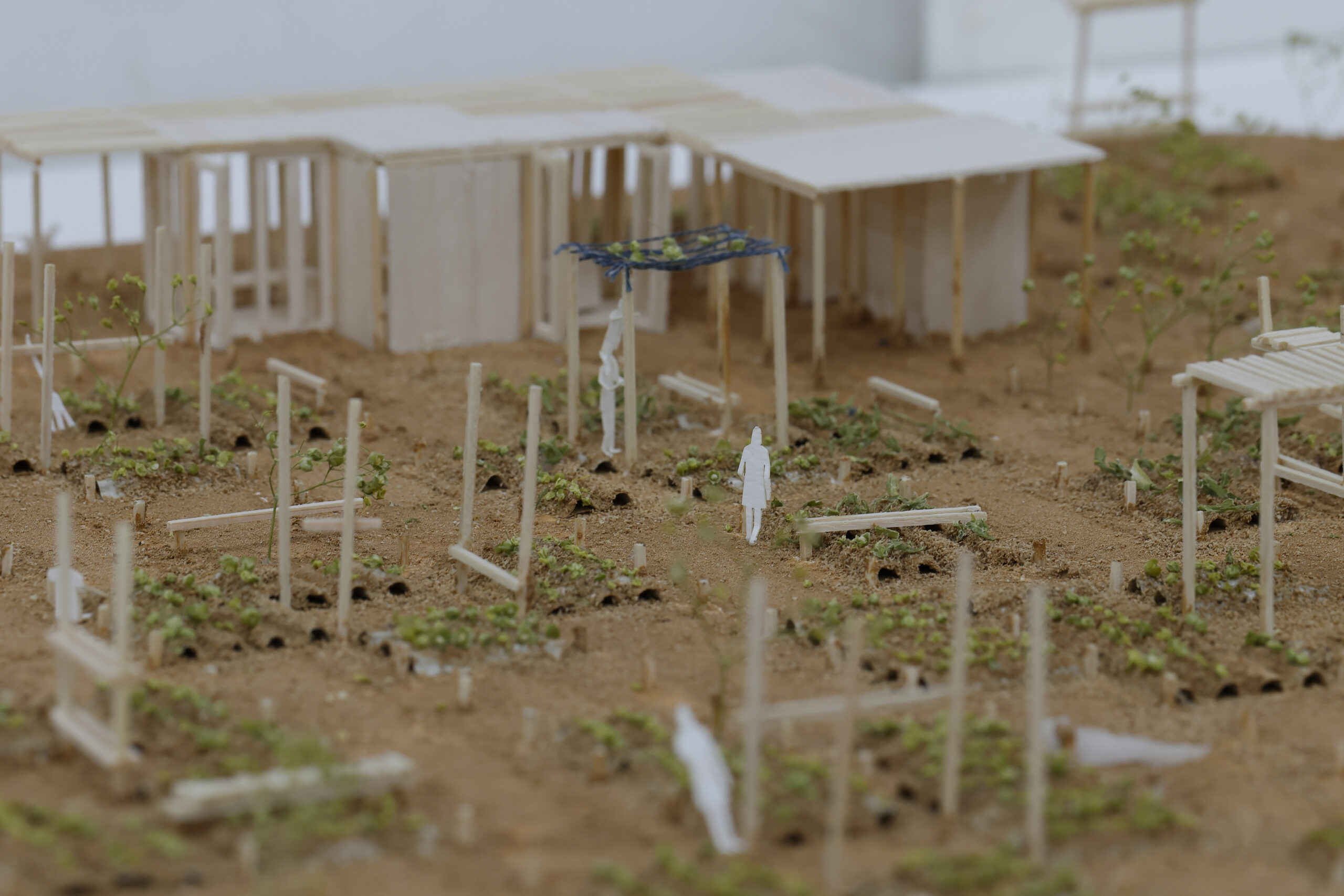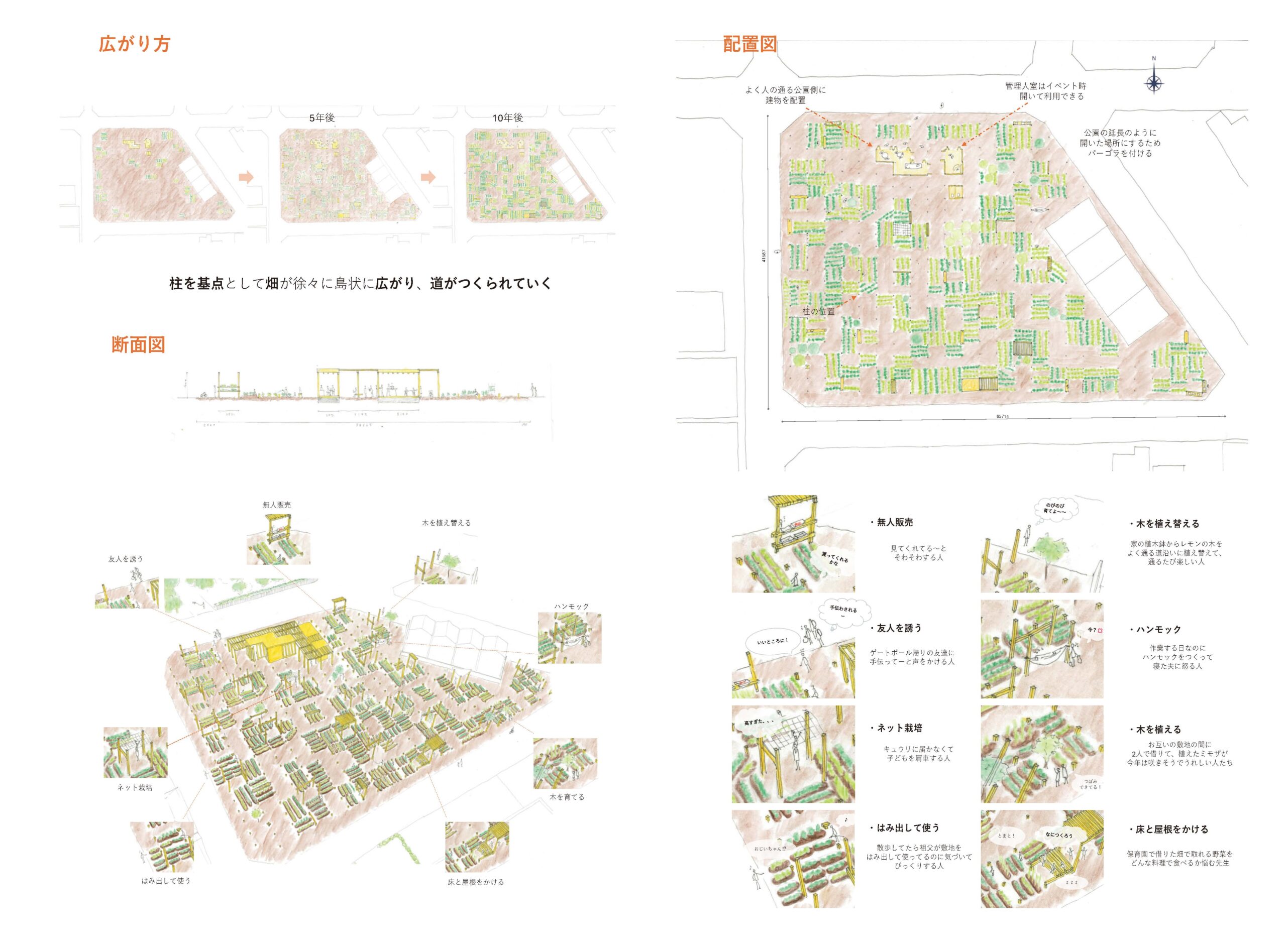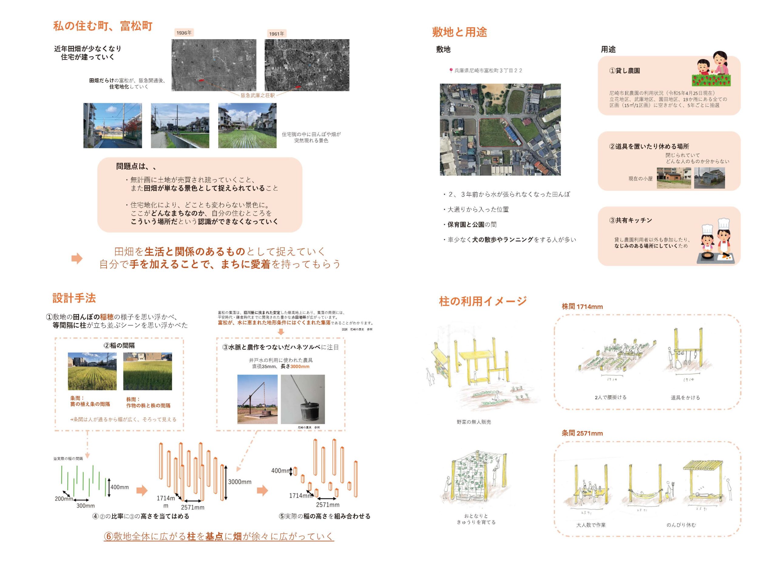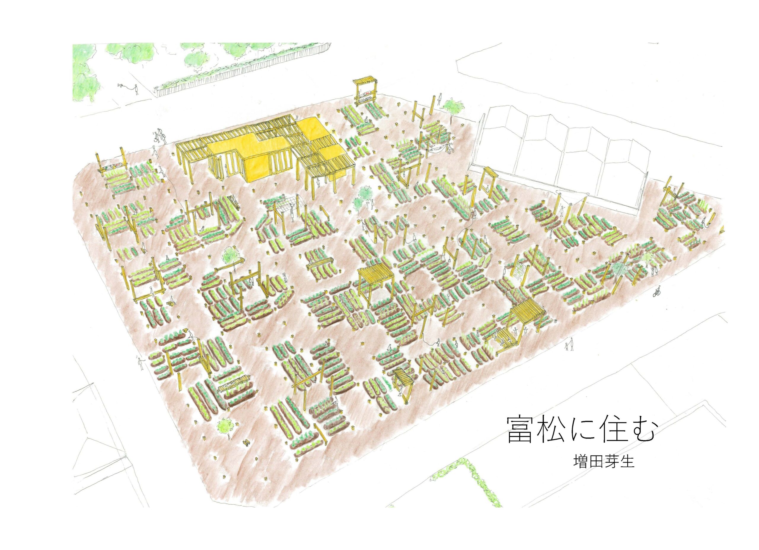 生まれ育った街である富松の田園景色が段々と住宅地に変わっていくのを見て、ここ数年水張りが行われていない田んぼを貸農園にし、住民が実際に手を加えていくことで街や景色に愛着を持ってもらう提案を考えました。敷地には稲穂に見立てた柱を等間隔に建て、利用者は柱に道具を掛けたり休憩したりと、小屋のように使いこなしていきます。畑と場が耕されていく様子を思い描きました。