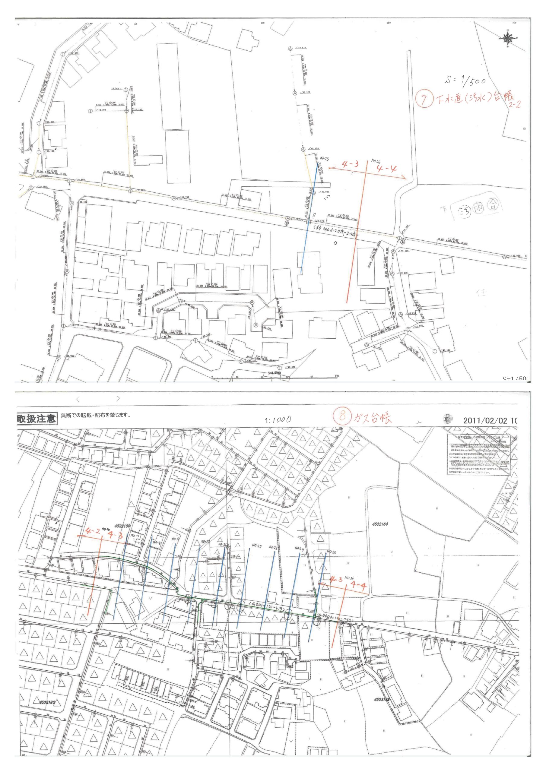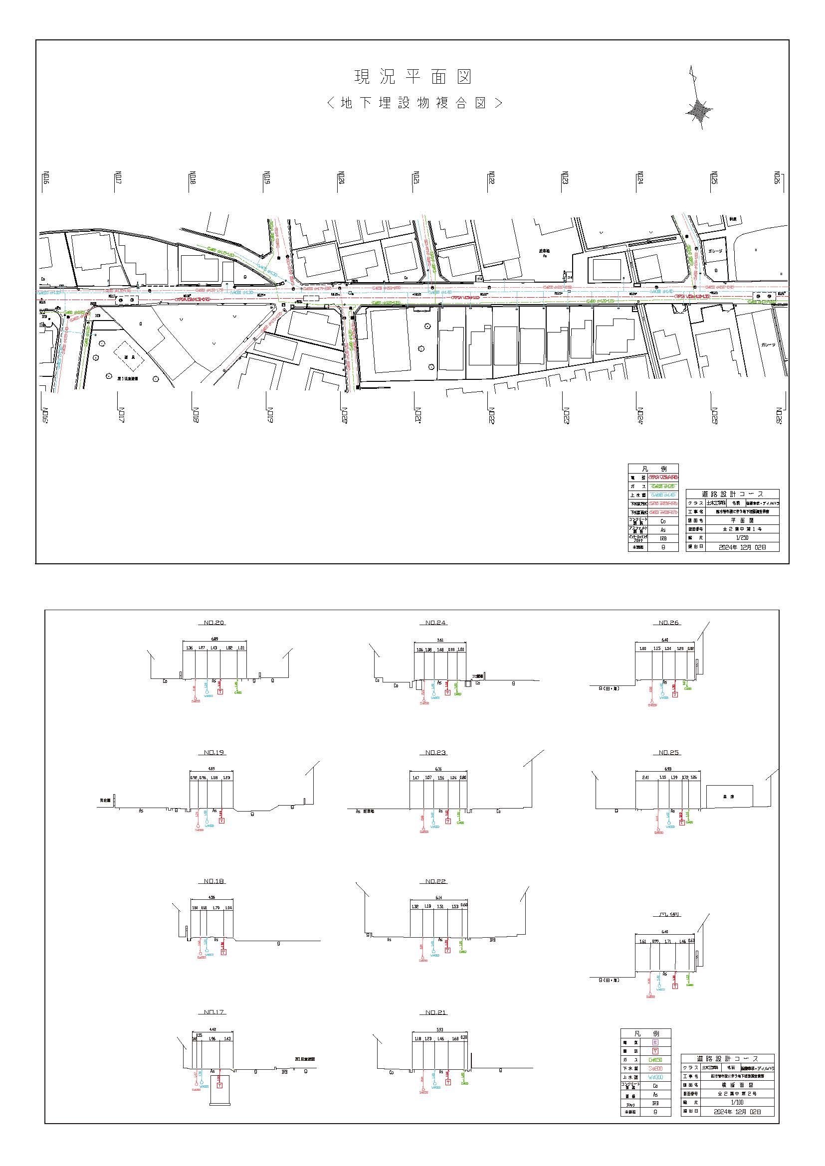 本作品は、道路敷に埋設されている上下水道、ガス、電話などの位置情報を調査し、それを基に作成された複合平面図および複合断面図が非常に正確かつ明確に表現されている。特に、埋設管の勾配計算や、台帳記号の解読など成果品に至るプロセスが丁寧に進められている点が高く評価されます。埋設管調査は、埋設年度や素材の情報も再認識でき老朽化による事故防止や災害復旧などに役立つ大切な業務です。この研究経験が埋設物管理における効率化と安全性向上への一助となることを期待します。<川西幸男>