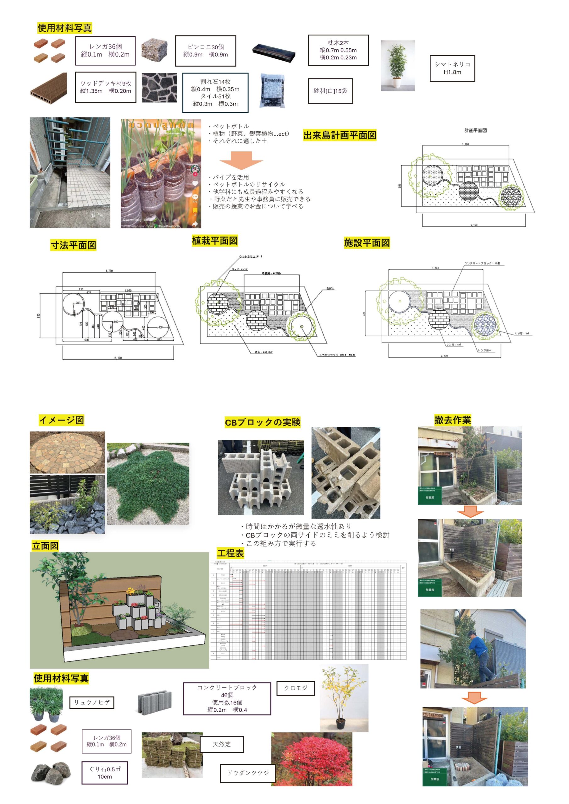 今回のプロジェクトは初めての試みであり、まさに0からのスタートである。庭を完成させるためにいろいろな企業様に直接問い合わせたりSNSでPRしたりと収集活動に尽力した。材料を収集していく中で提供してくださる方の温かみや卒業生のつながりが感じられる経験が“積み重なった”プロジェクトとなった。また、ブロックは1つではなく何個も集まりモノが完成する。この作品を竣工させるには作者1人では解決できないこともあった。だがブロックのようにチームみんなで集まり協力して作り上げた作品である。<窪田彩音>