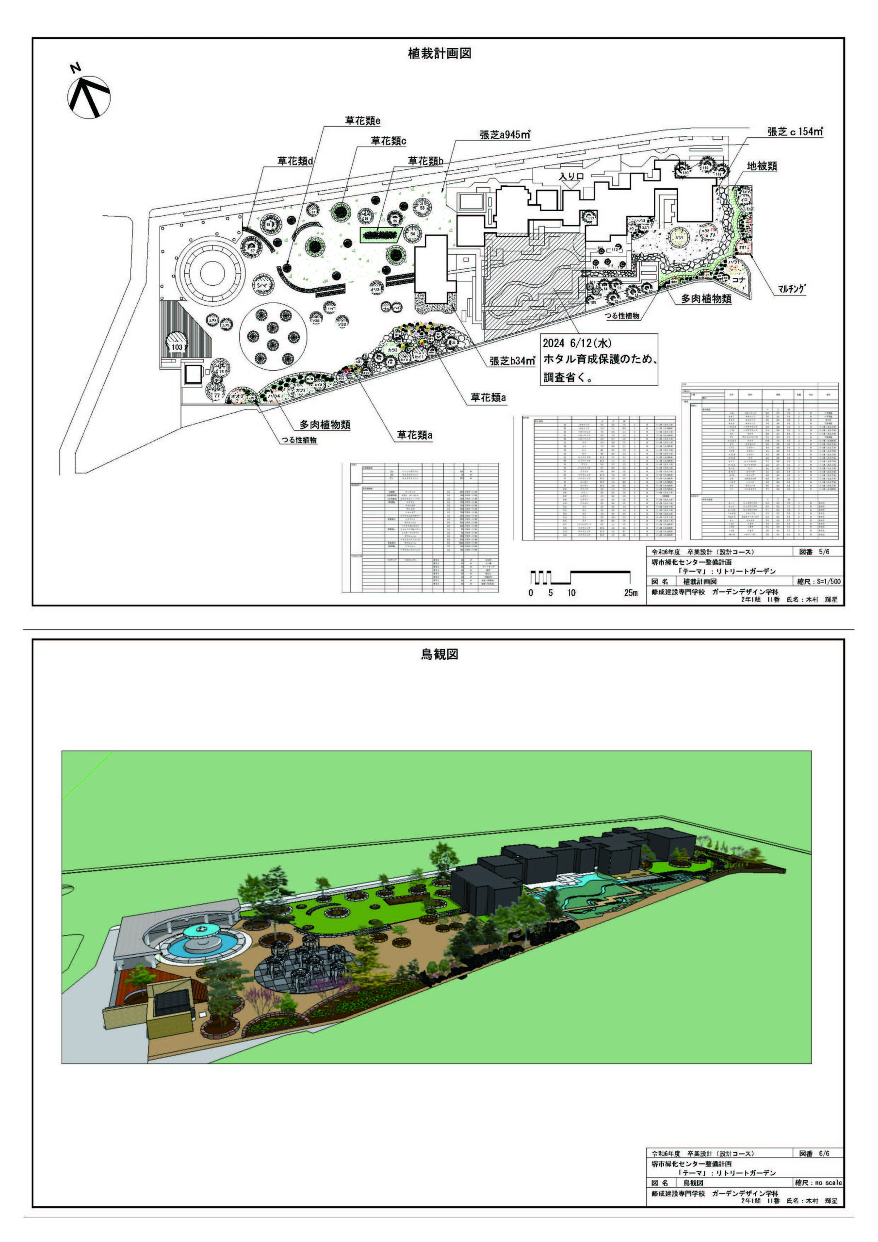 堺市都市緑化センターでは「みんなが楽しくなる体験型植物園」を目指して植物を暮らしに取り入れ様々なイベントが開催されています。ですが、現在の緑化センターには植物に興味を持たない方々を惹きつける魅力が十分ではないという課題があります。その改善案として今回の「リトリートガーデン」を提案しました。植物にまだ興味のない方も、魅力ある様々なイベントを通して間接的に植物に触れ興味を持って貰うことで新たな顧客を獲得することが今回の計画の目的です。多くの時間を費やし、行き詰まることも何度かありましたが先生方に助けられ仕上げることができました。今回の取り組みで得た経験を、これからの成長につなげていきたいと考えています。