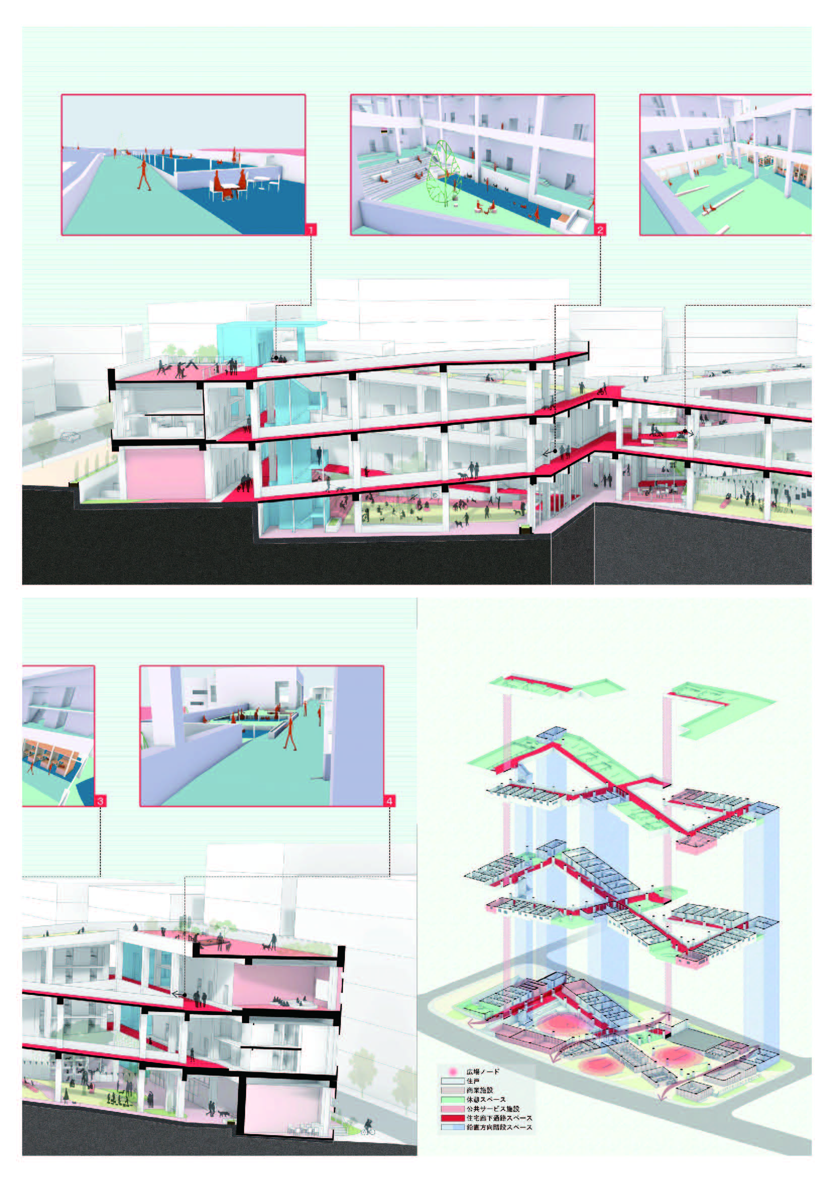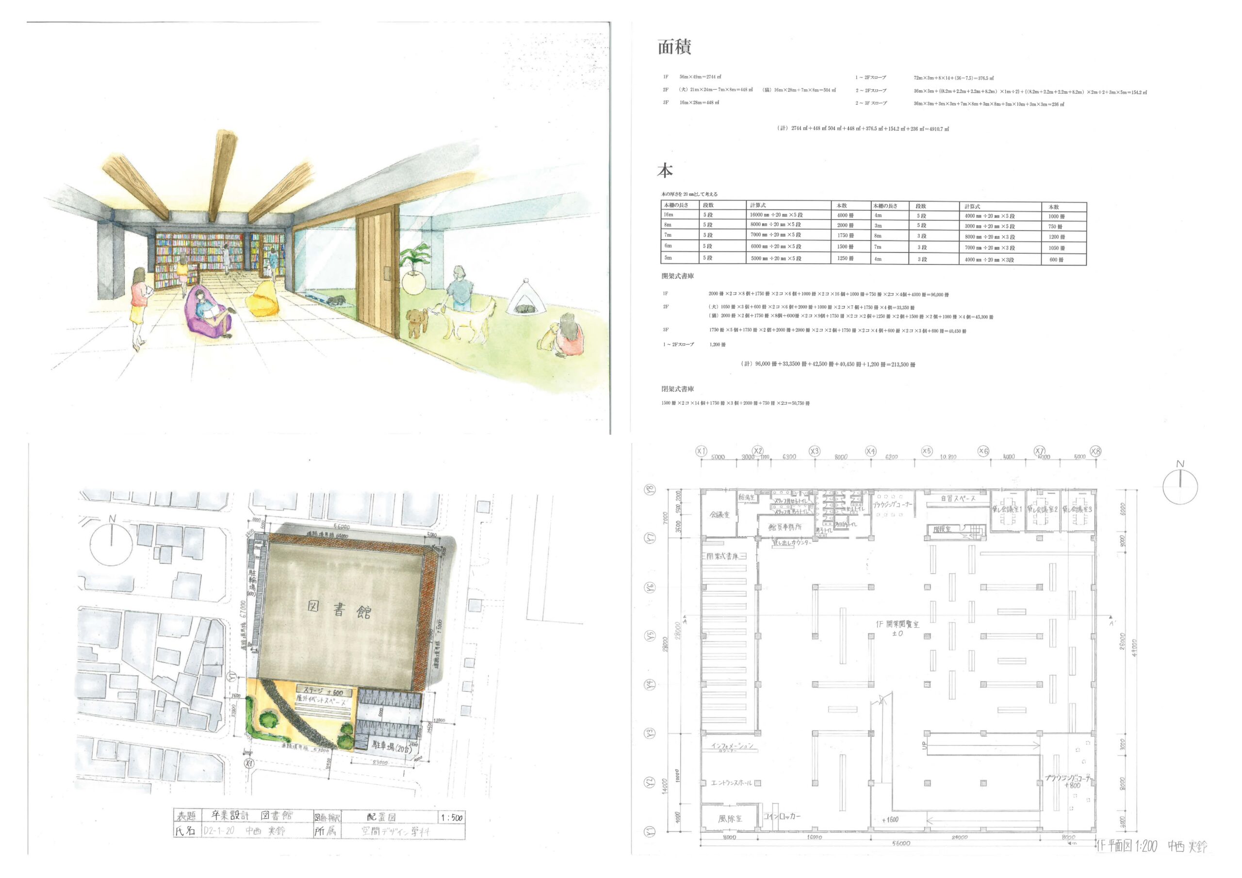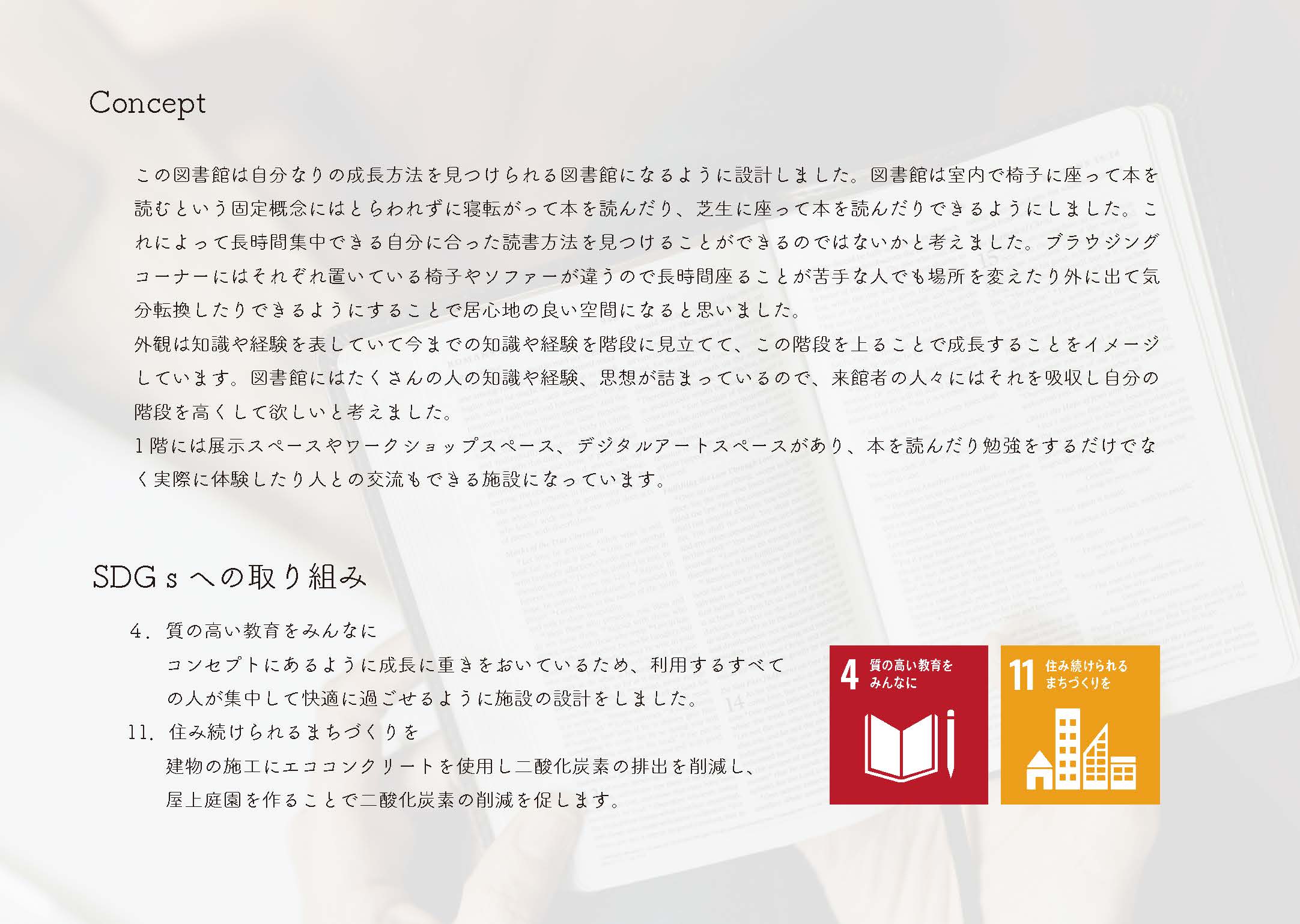 本が苦手な私にとって図書館は近寄りがたい場所でした。そこで、本を読むだけじゃない図書館を考えました。「歩く」と「読書」は一見ミスマッチのようですが、実は適度な運動と知識による脳への刺激はとても親和性が良いとされています。この図書館は館内にめぐらされた非常に長いスロープで本の居場所が結ばれていおり、気に入った本を持ち、少し散歩し、また本を追う、そんな風景がこの図書館では日常の景色になっているでしょう。またこの図書館は「本」と「生き物」が一緒の空間にあります。例えば図鑑を読み、そこに載っていた生き物をリアルに見たり触れたりという体験ができます。これからのスタンダードになりそうな近い未来の図書館です。