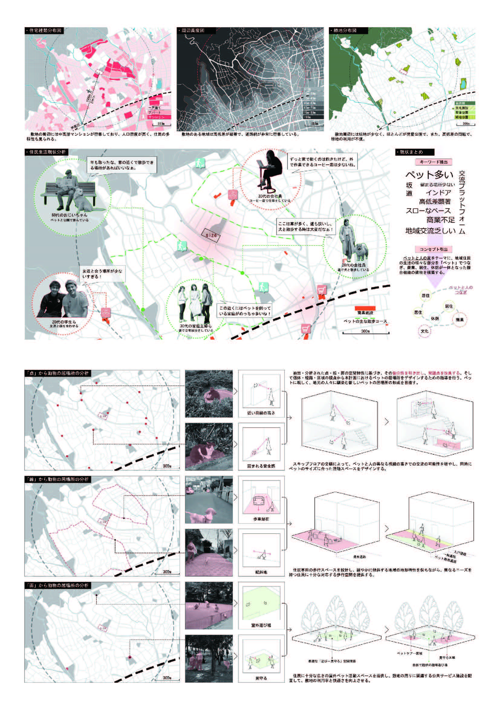 「建築」は、建物をつくるだけではなく、快適さを求めて、それ以外の余白を空間としてどう取り込むかにある。突然の大きな観光施設の出現により、外部の侵入者によって、自分たちの日常が奪われた。車の為の道ではなく、観光者の道でもない。楽しく軽快にデザインして、道ではなく「通り」にしたことを評価する。「こんな自分たちの道があったらいいな?!」子供達からもそう言われたい、学生らしい作品である。<青砥聖逸>