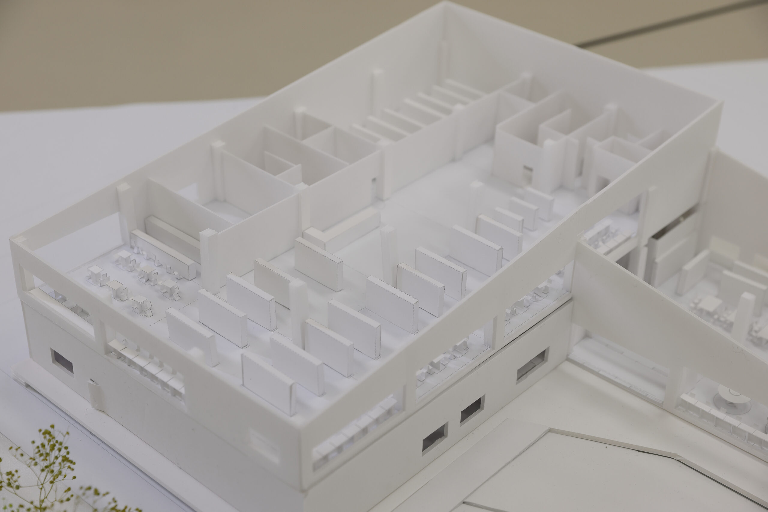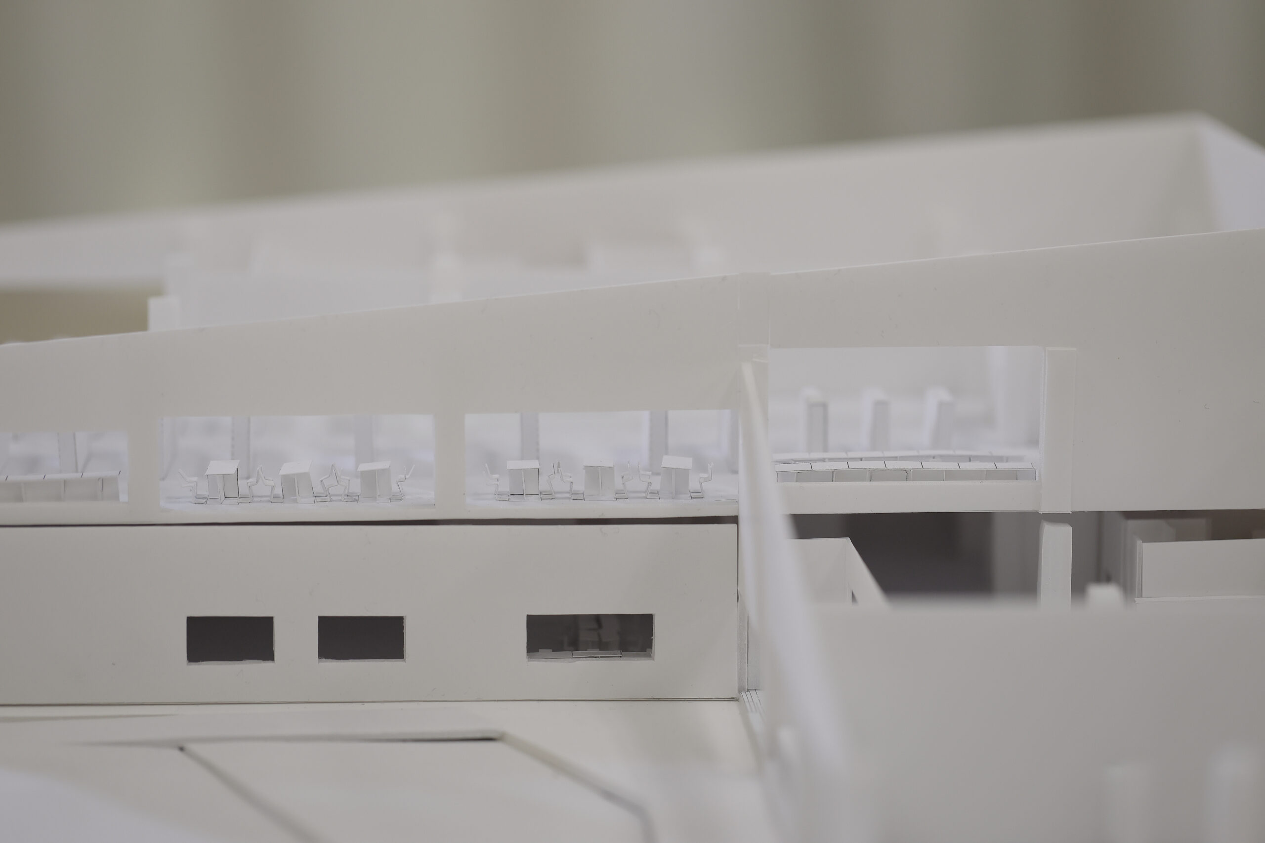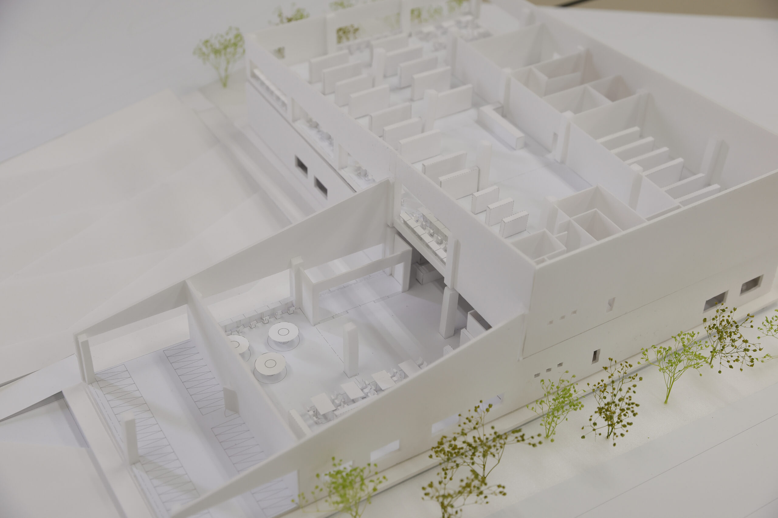 設計に挑む前に参考にするために、幾つかの建築物を参考に見て歩いている。複合施設の構成の仕方も取り入れた計画である。矩計図に代わるものとしての手の込んだ建築模型。内部空間の書架からテーブル椅子なども丁寧に作成しているところが「学生らしさ」を物語る作品である。<青砥聖逸>