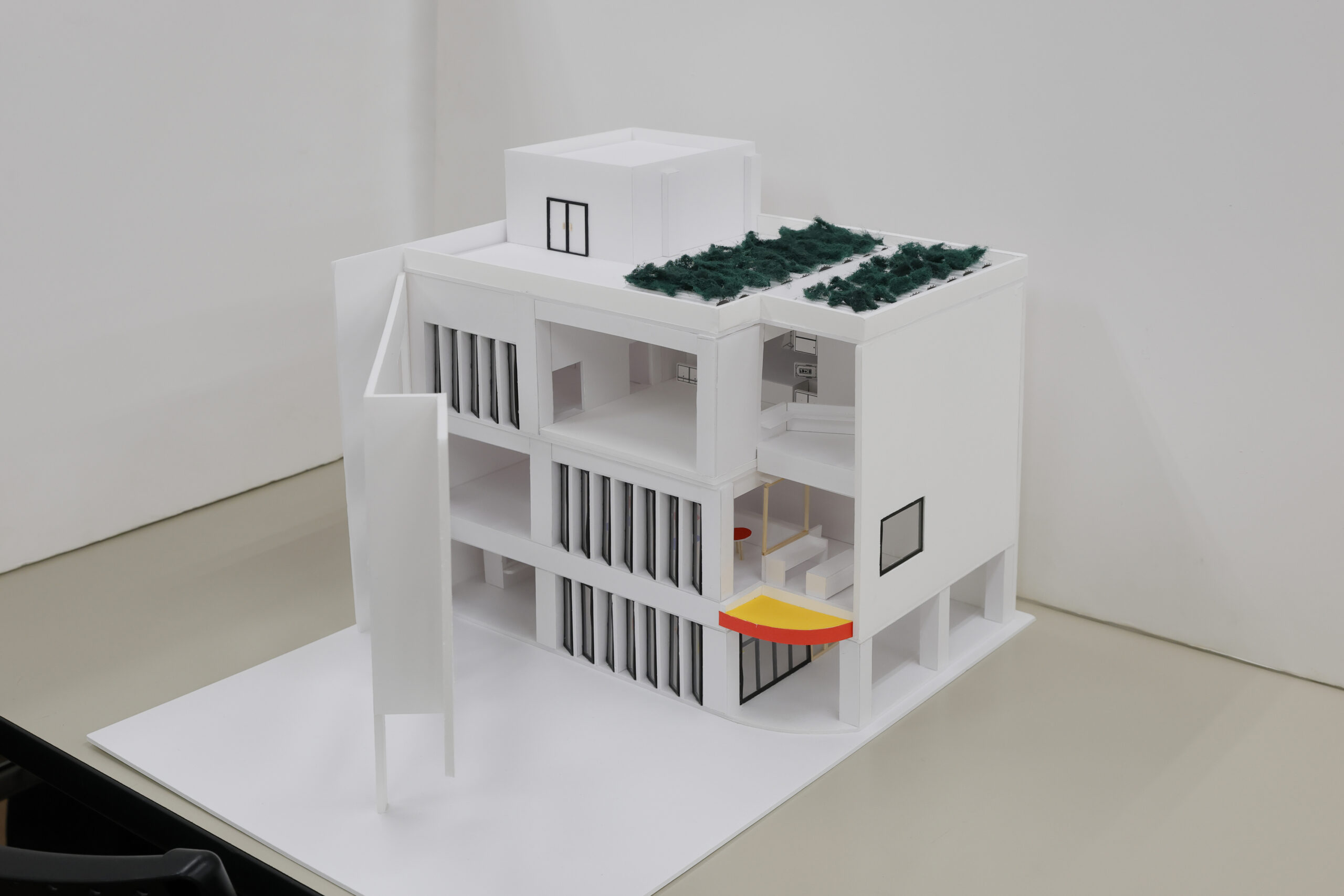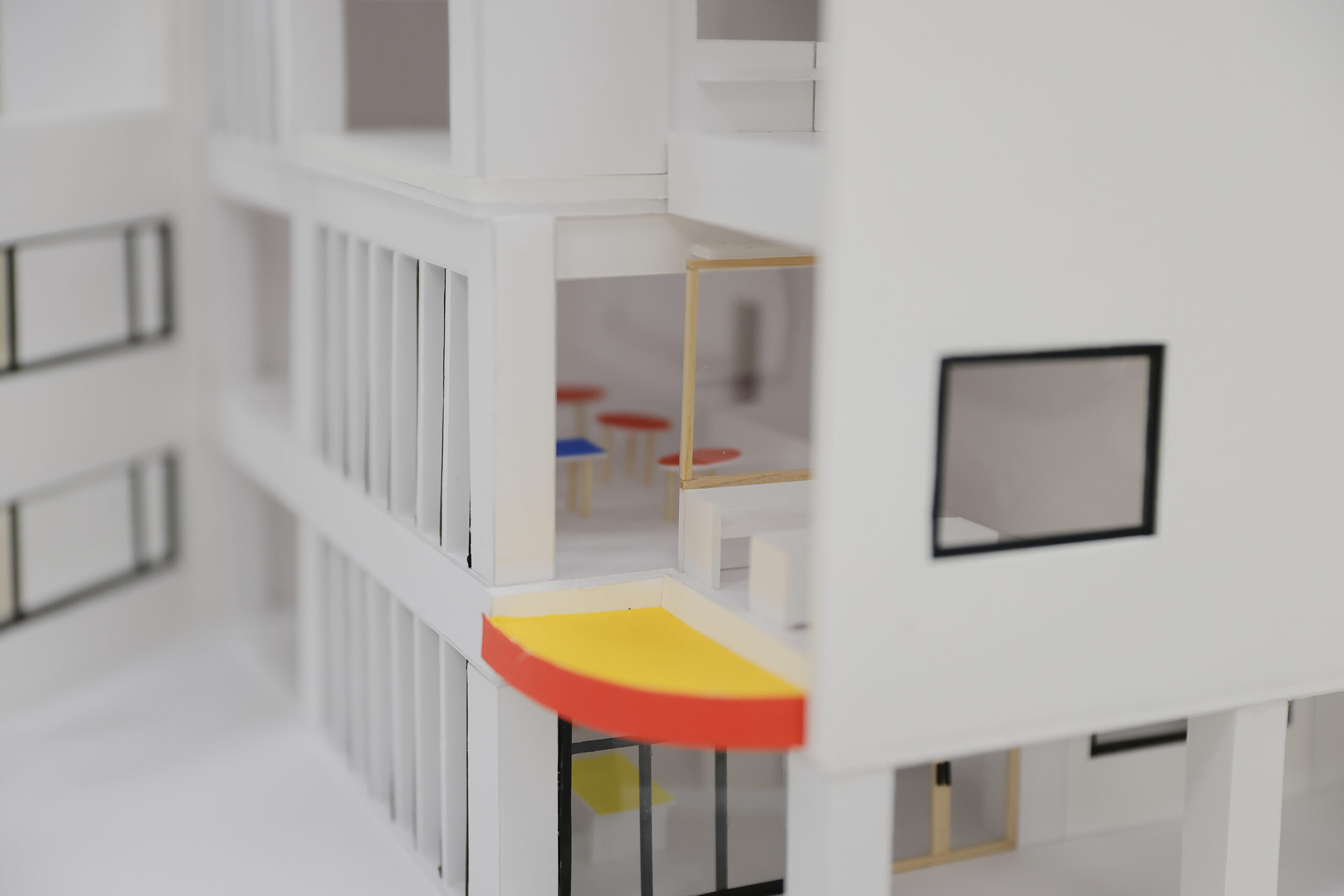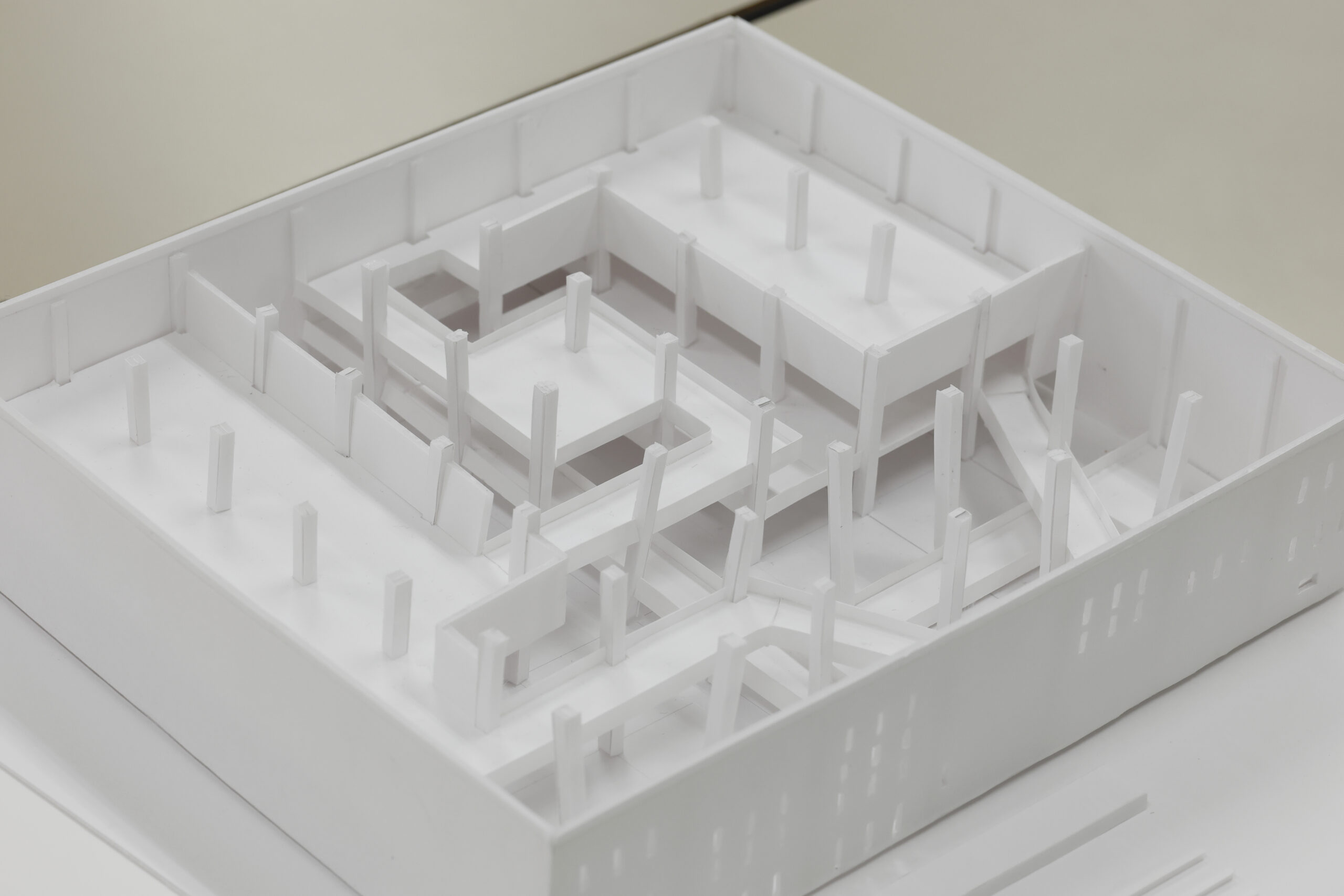 設計に挑む前に参考にするために、幾つかの建築物を参考に見て歩いている。複合施設の構成の仕方も取り入れた計画である。矩計図に代わるものとしての手の込んだ建築模型。内部空間の書架からテーブル椅子なども丁寧に作成しているところが「学生らしさ」を物語る作品である。<青砥聖逸>