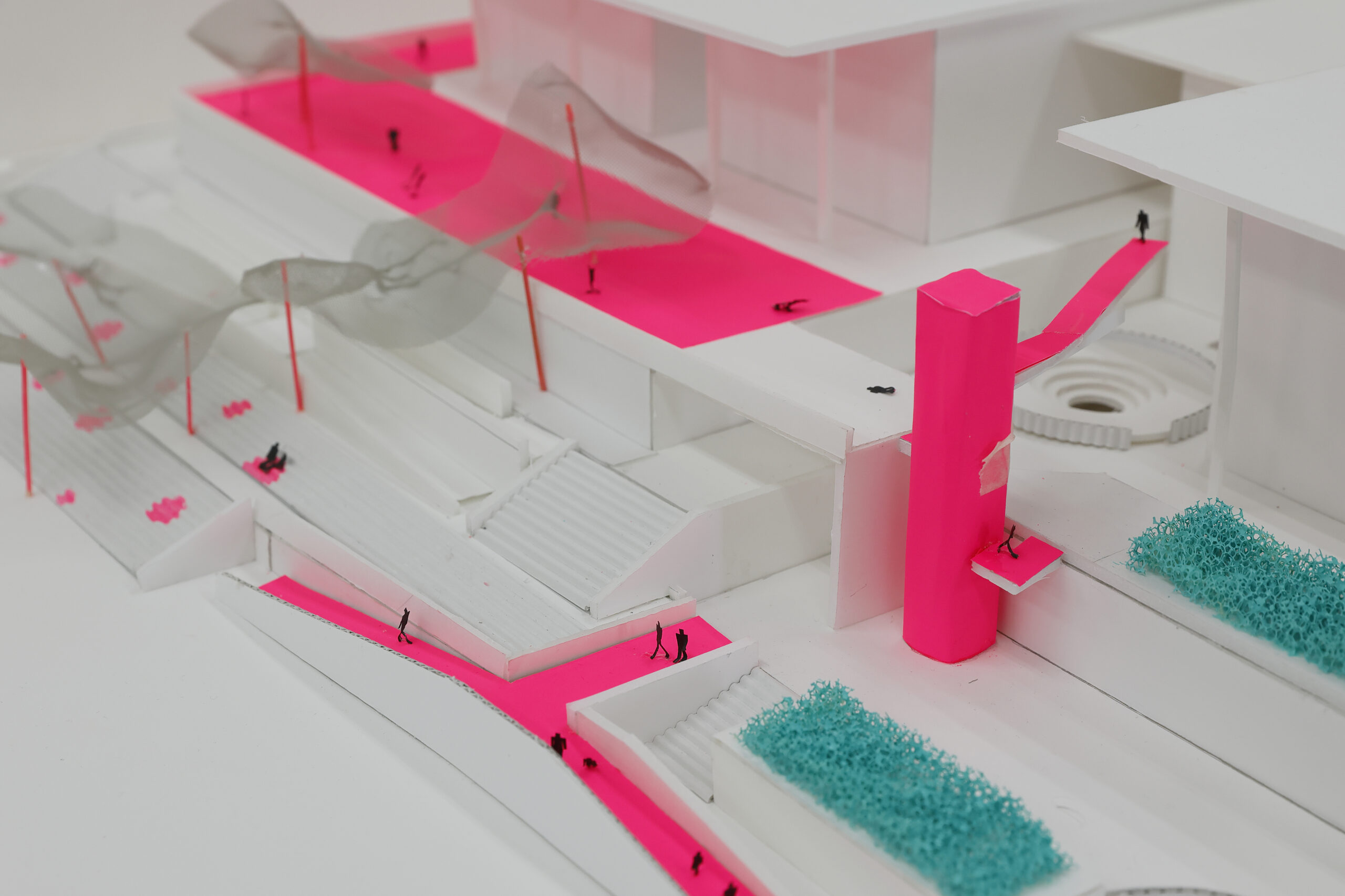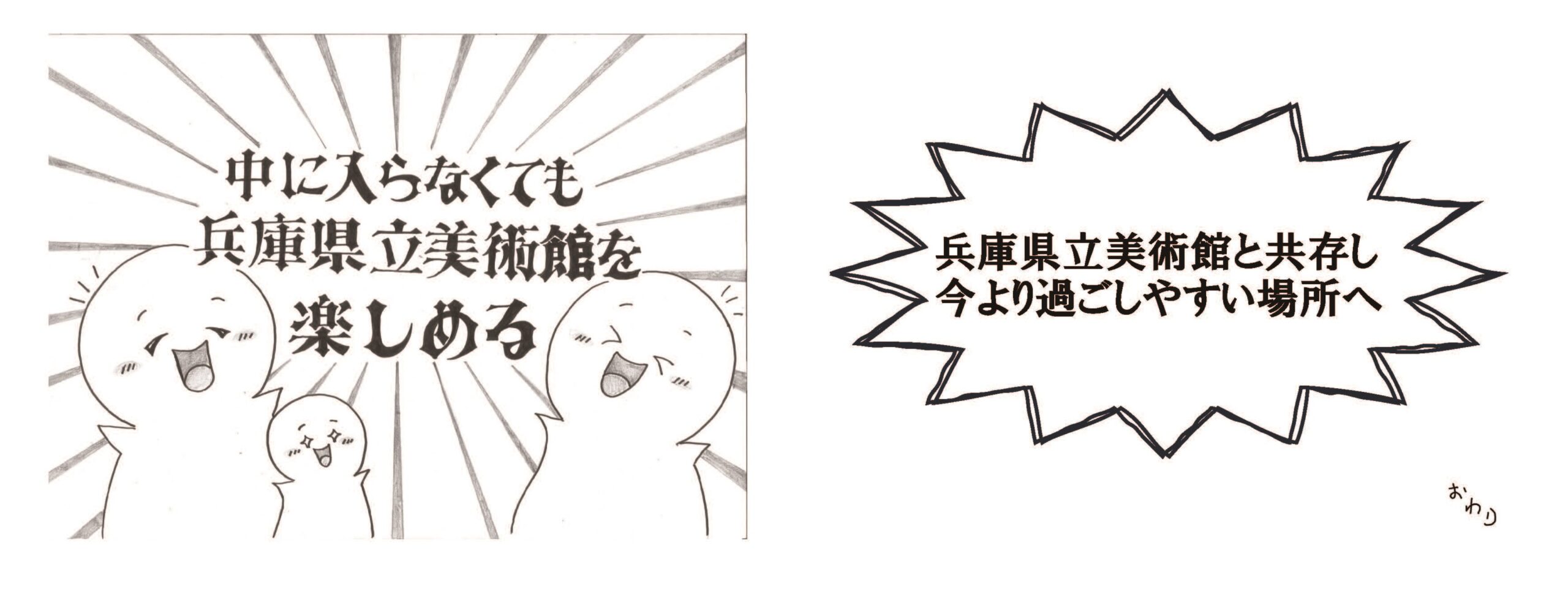 私が小学生の時に私が描いた作品が兵庫県立美術館に展示されました。それを車椅子で生活をしている父を含めて家族で見に行った際にとても不便に感じました。当時は小学生で「建築」について何も知らなかった私にとってこの場所は、二度と来たくないと思うほどとてもしんどい思いをしました。高校で建築を学ぶようになり、再び兵庫県立美術館と触れ合うことが多くなり、建築を学んでいくうちに兵庫県立美術館への怒りがふつふつと湧き上がってきました。そこで今回、卒業設計としてその抑えきれない怒りを込めてこの作品を制作しました。有名建築家が建てたというだけで使い勝手の悪い兵庫県立美術館を私の優しさで包み込んだ作品となっています。