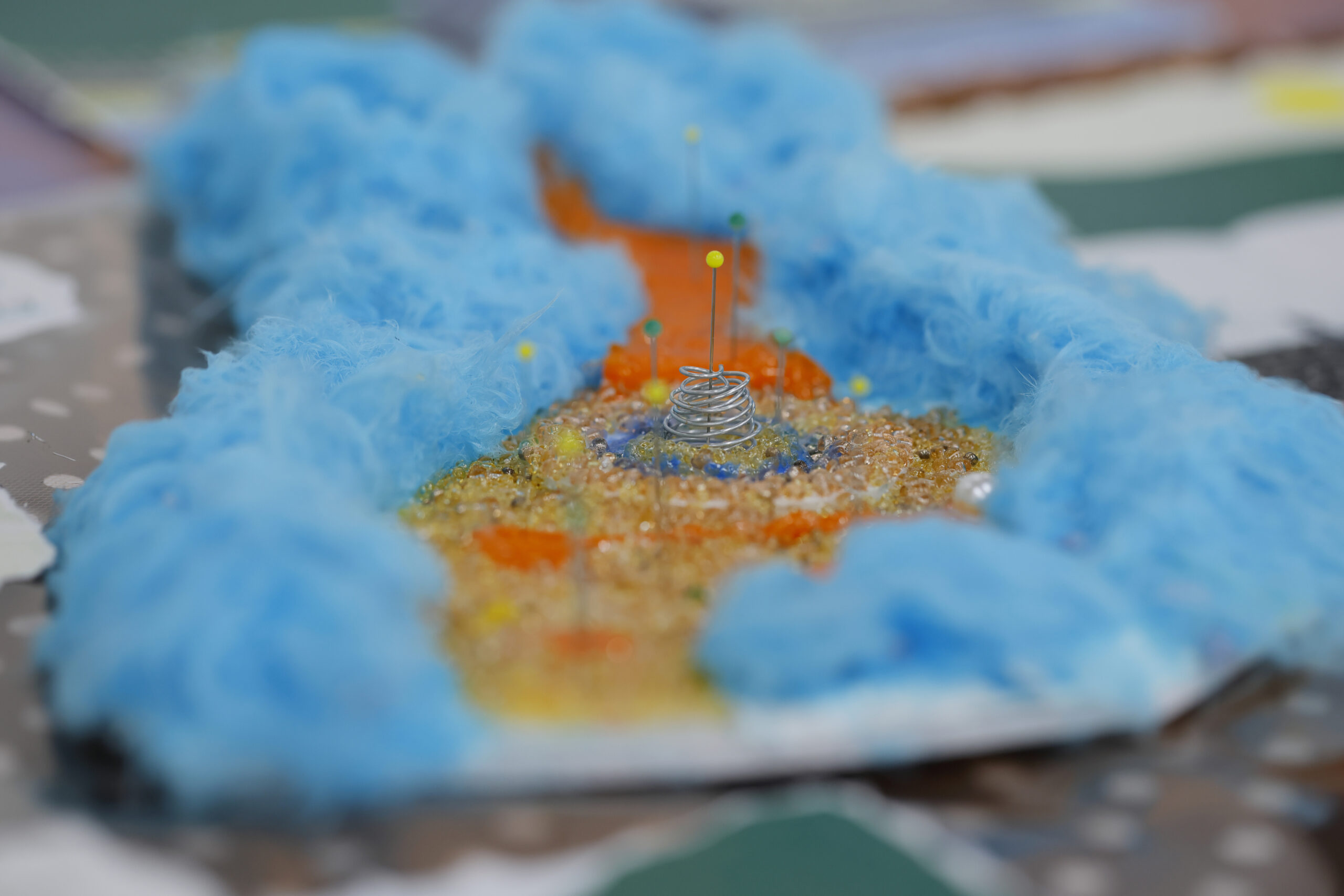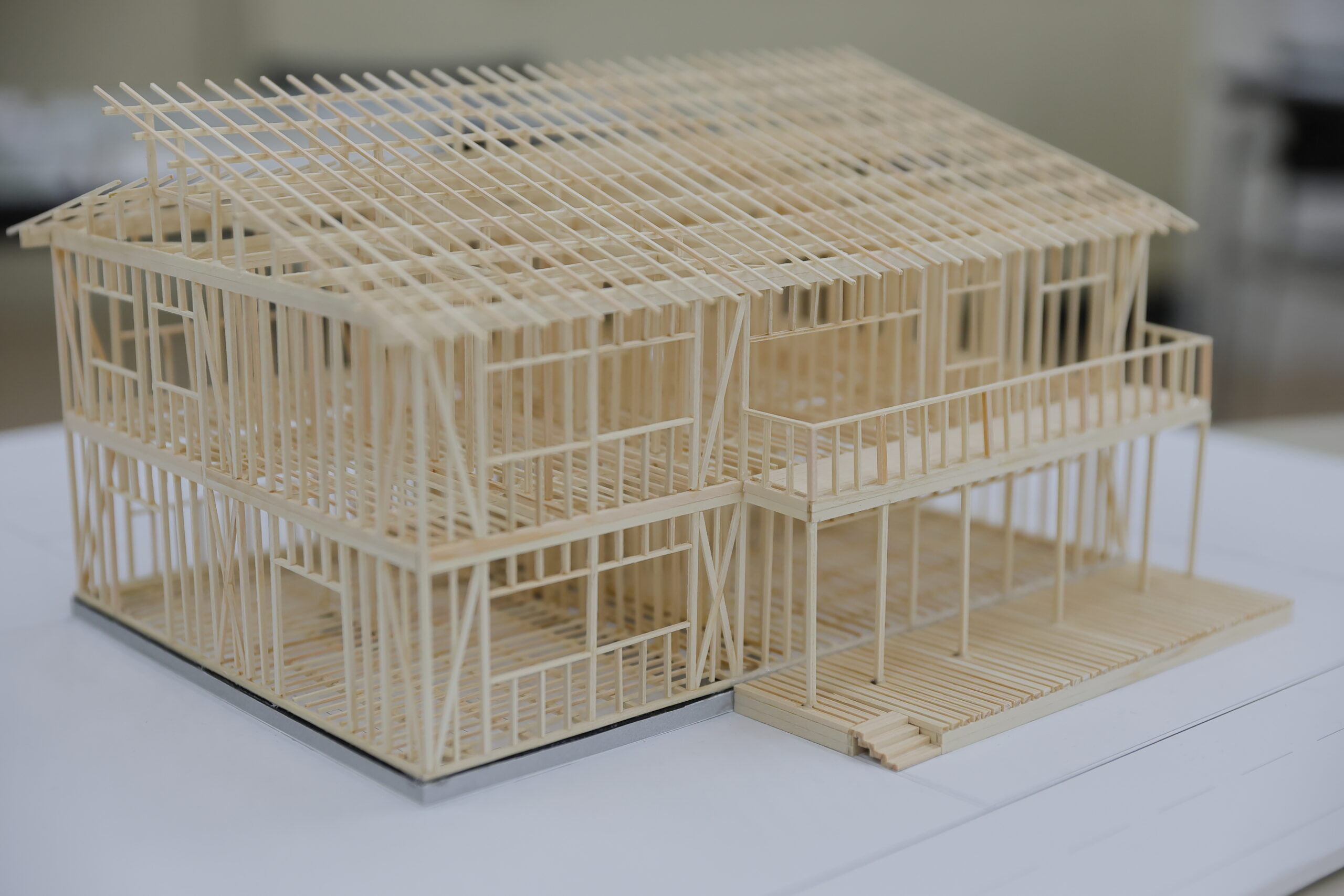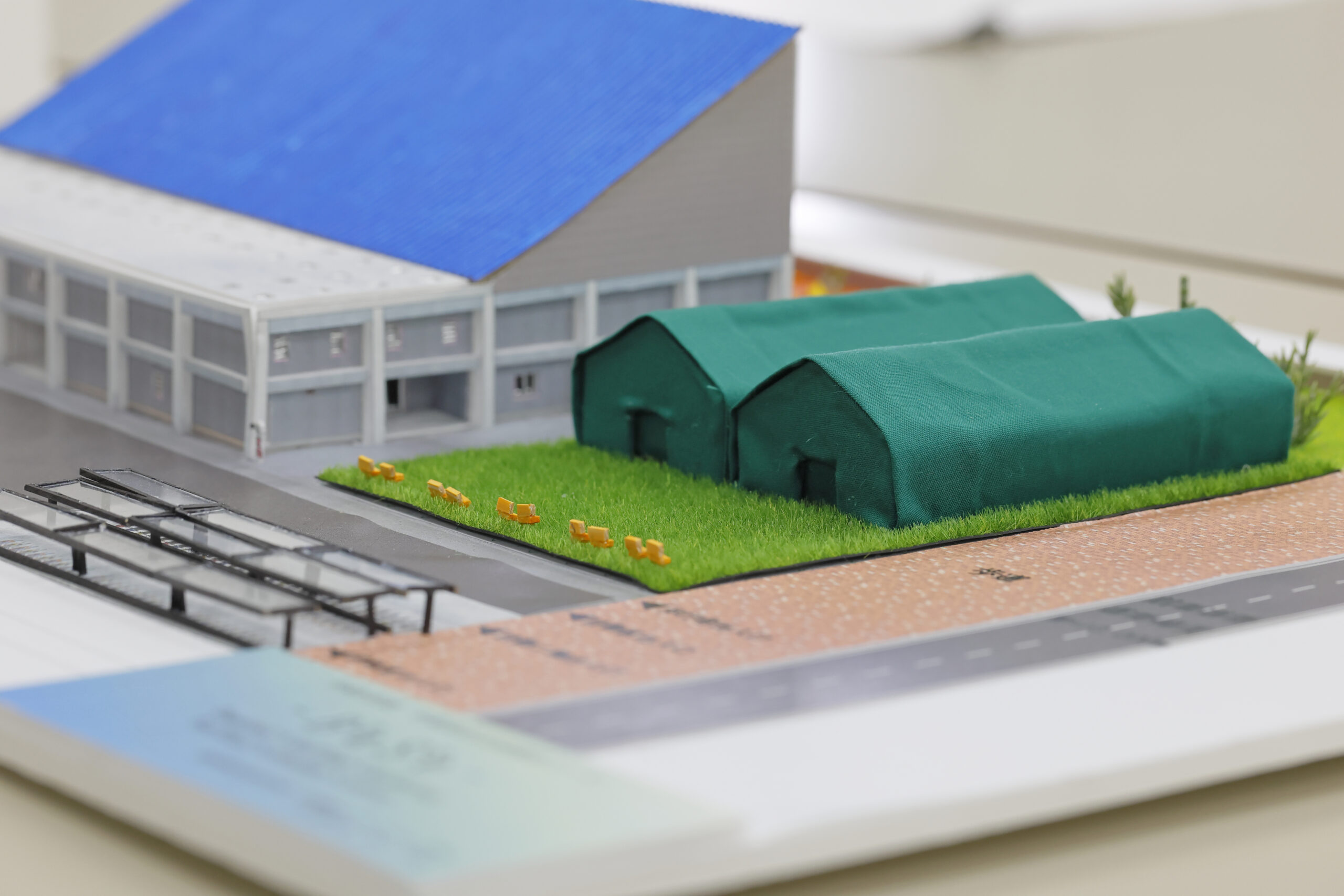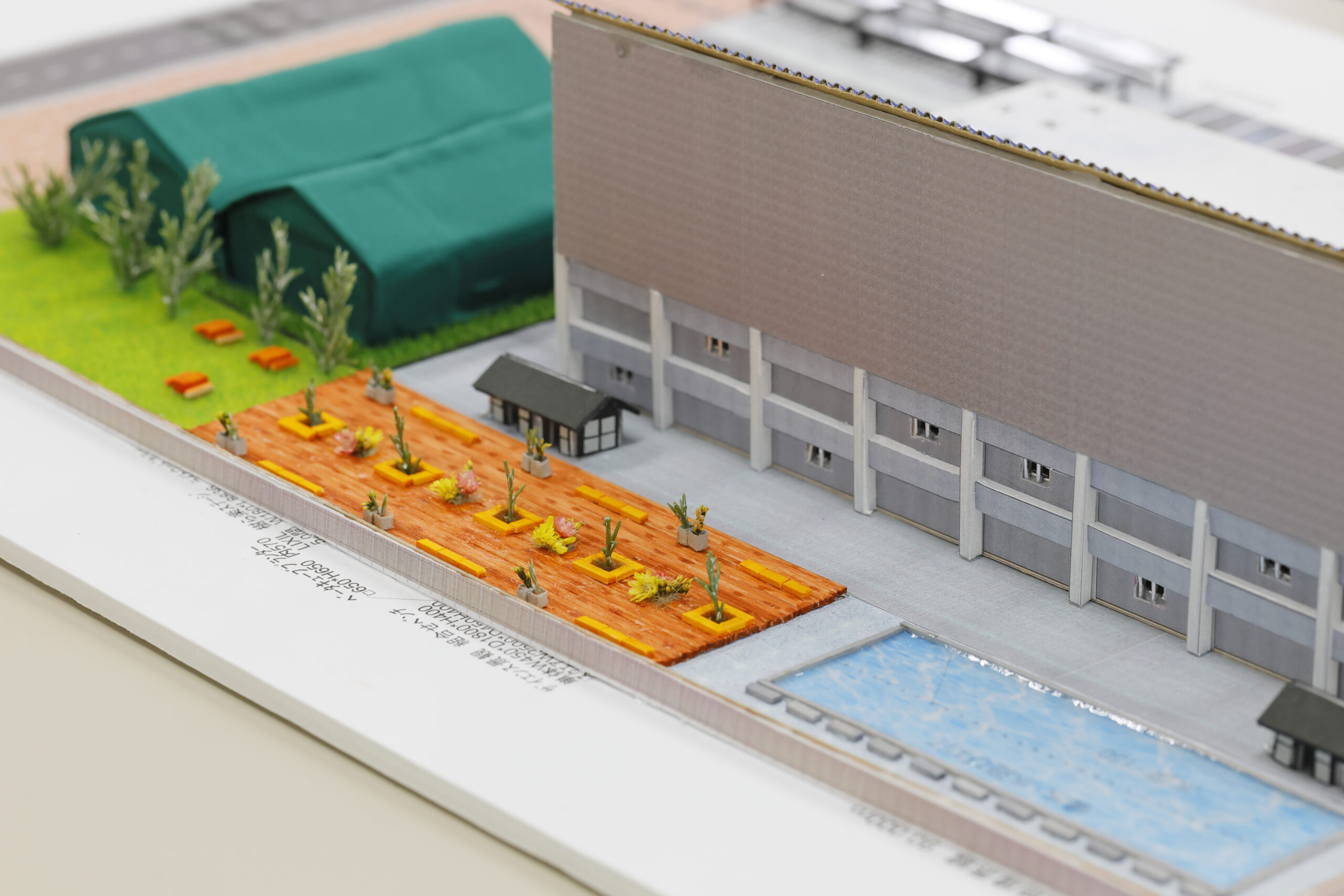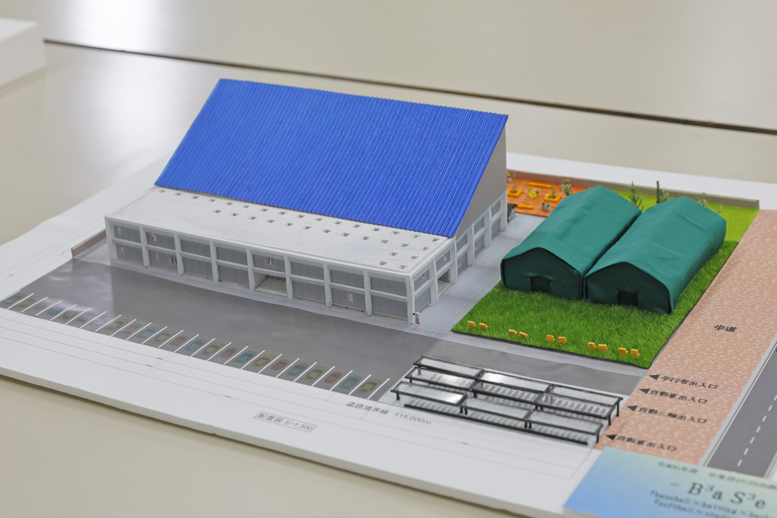 このバッティングセンターは境港市内の人たちだけでなく他の地域の人たちにも利用してもらえるように建造し、たくさんの人が境港市に来てもらいたいという思いから設計しました。模型で工夫したところは、窓のサッシの部分とガラスガラリの部分もを細かく針金で作製したところです。他にも、水の部分はUVレジンで透明感をだし、ウッドデッキの部分は、1×1の木に色を塗り、切り込みをいれ、板同士のつなぎ目を再現しました。土の部分は毛糸を使用しています。屋根の部分は、使用したガルバリウム鋼板の色に似た紺色を探し、太陽が当たり光っているようにみせるため、パール入りの絵の具を選びました。見る角度によって色が変わって見えるのもポイントです。そして、バッティングセンター、ピッチング、トイレの3つの建物全て入り口を細かく作製しました。建物の柱と梁が出ている立体感も見所です。