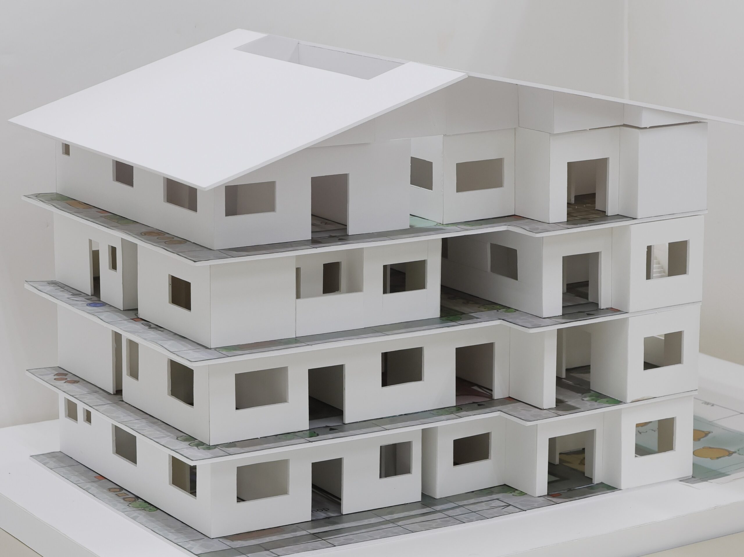 非木造コース選択者が彼だけでした。当初は不安を抱えながらスタートしました。努力家の彼は、何より私のところへ卒業設計においての相談に何度もきてくれました。卒業設計を通じて、鉄筋コンクリート造に関する知識や施工図の描き方、工事中の仮設計画、コンクリートの拾い出し方などが習得できたと思います。模型においては、サイズ規定から周辺環境より建物を重視したいという意向を尊重しました。例年にない開口部の作成や、セパレートできるように作成しております。住環境リノベーション学科最後の施工管理コースにふさわしい作品になりました。彼のコメントにもあるようにマイナスから入ったとしても、努力し、やり遂げることで自信にもつながり、「やればできる」ということを実感したと思います。目指せ!スーパー現場監督!ありがとうございました。<樋下 昌俊>