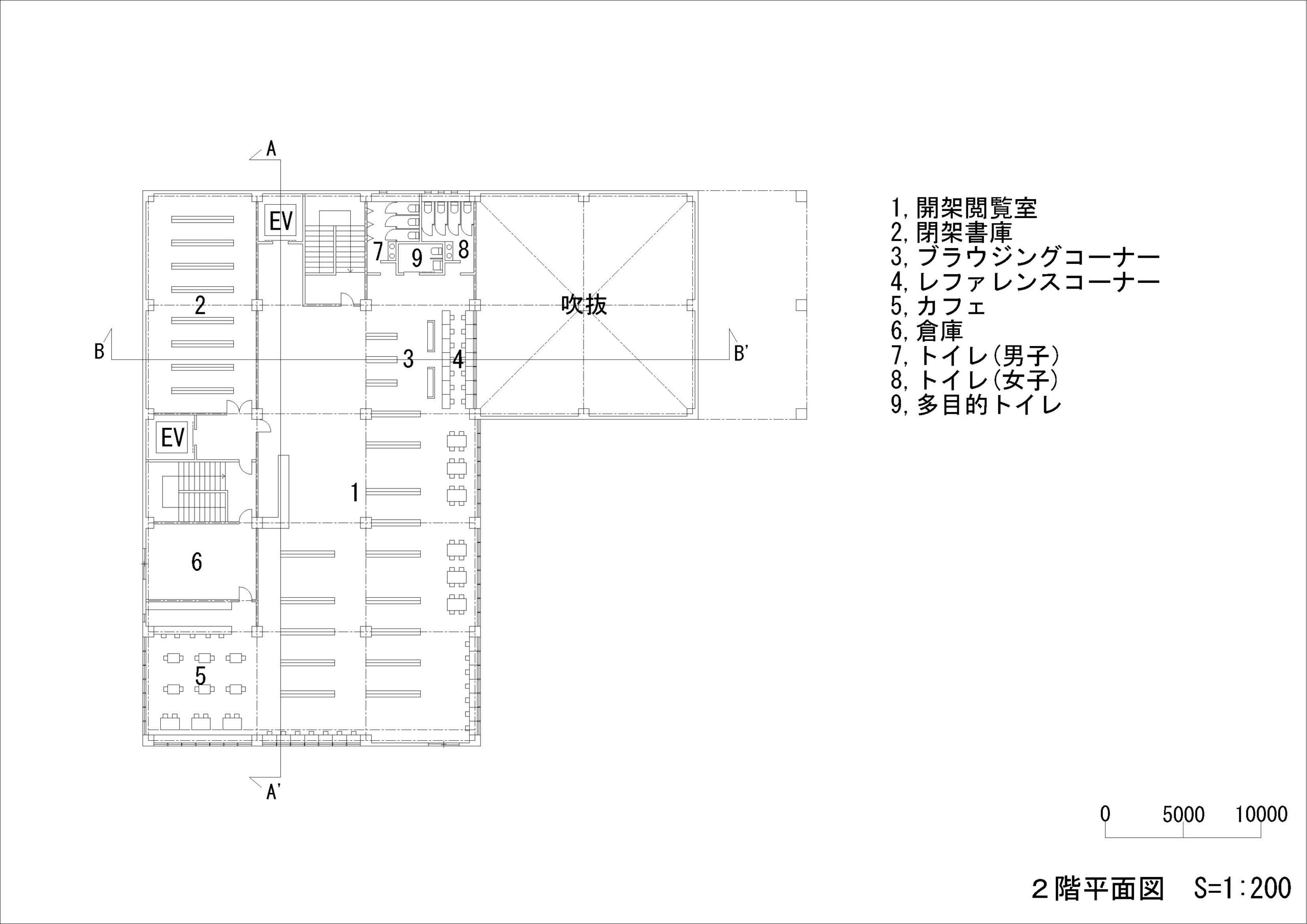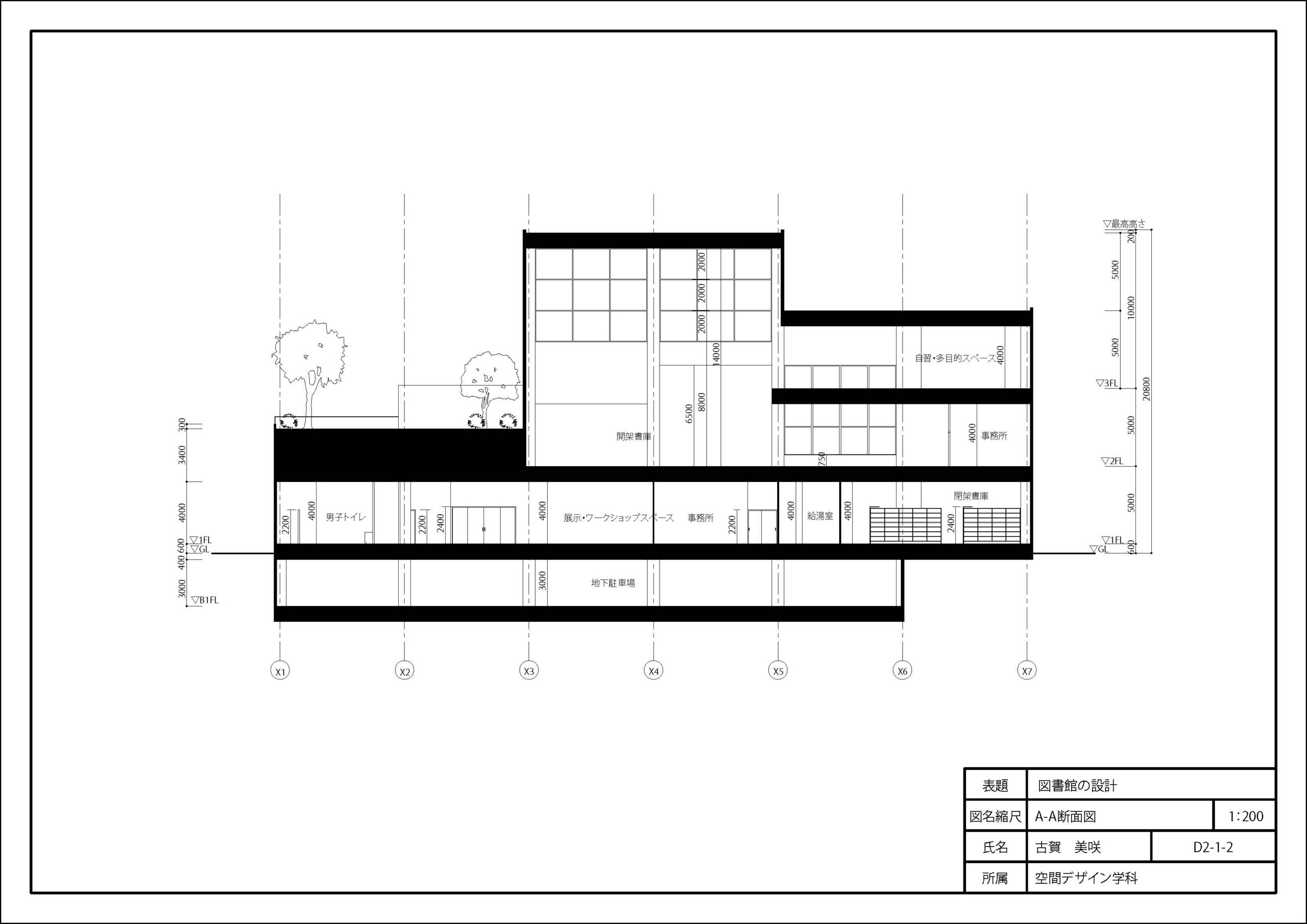 この図書館は「成長」をテーマに設計しました。外観を階段状にすることで積み上げてきた知識や経験を階段に見立てて、その階段を上ることで成長していく過程を表しています。私の中での図書館は静かにしなければいけない雰囲気に息が詰まるような場所で、勉強には適しているとは思いますがリラックスして本を読むには少し居心地の悪さを感じることもありました。そのため机に向かって過ごす場所だけでなく姿勢を崩して過ごせる場所も作ることで自分の目的に合った過ごし方ができ、より多くの人に利用してもらえるのではないかと考えました。