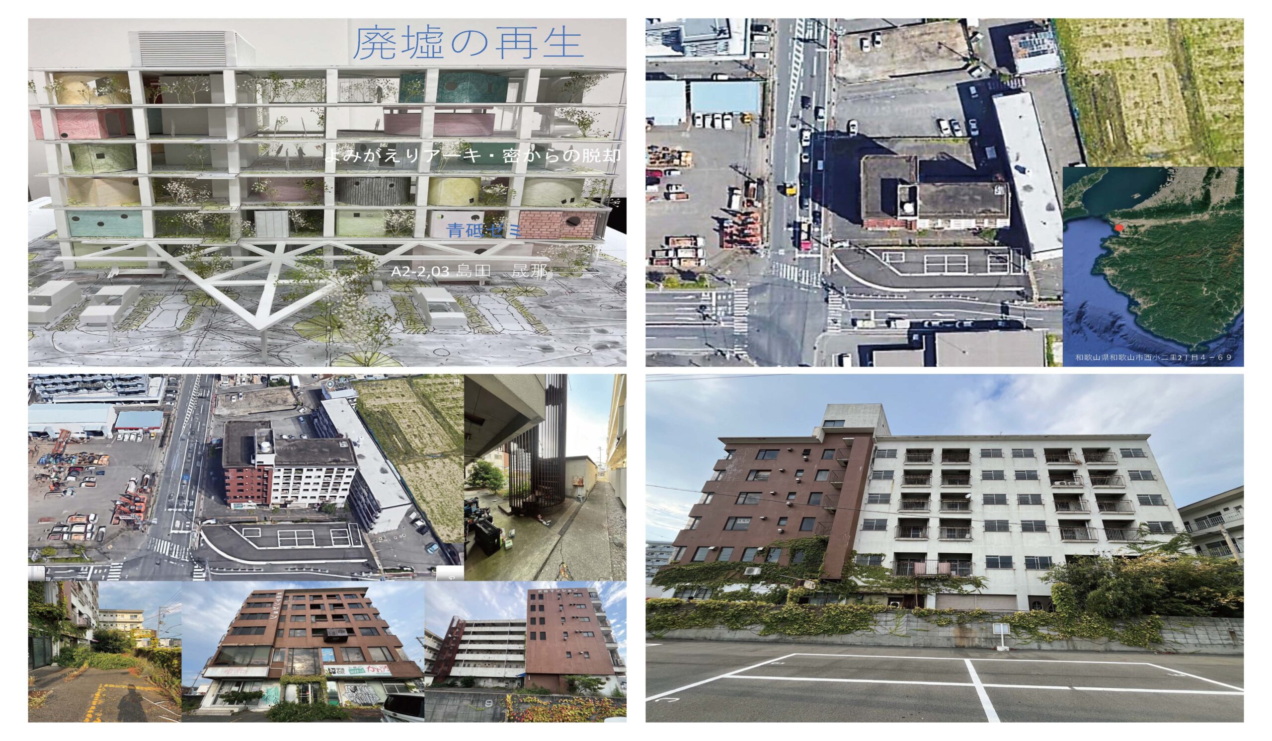 量から質へ、与えられることから求める事への転換期として時代を迎えるべきである。知らぬ間に取り残された建物は廃墟となり、放置するのではなく、魅力的使い方で建築となり、市民の場となる。何処にでも、又これからも増加の一途を辿る都市の中の負の遺産。ZEBを加えたリノベーション計画で資産価値を挙げることが可能ではないか?!身近な社会問題提起として、諦めない提案で世に問う作品として秀逸である。<青砥聖逸>