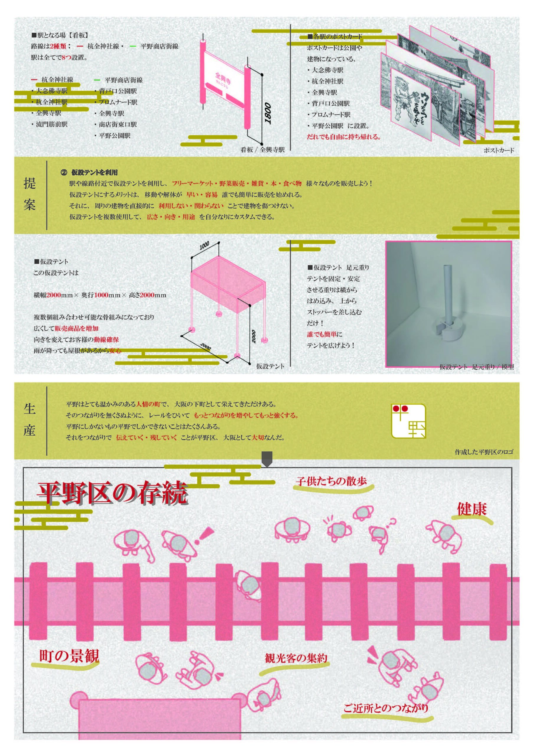 路地の暮らしについて考えました。谷町六丁目を調査していくうちに、住む人たちと接する機会が増えたり、路地の多くの魅力に出会えたと同時に、路地の暮らしやカルチャーが、段々と街の開発によって廃れてしまっていることを知りました。廃れしまっている大きな原因としては、どんどん古い町屋は消えてゆき、マンションや集合住宅が増加しているのが一つの原因だと私は考えます。路地には、受け継ぐべきカルチャーがあると私は思います。それは住まい方だったり、人と人との何とも言えない距離感だったり、伝統や文化だったり。建物の形態が変化しても、この暮らしを受け継げるような、ほんの少しのロジックを提案します。