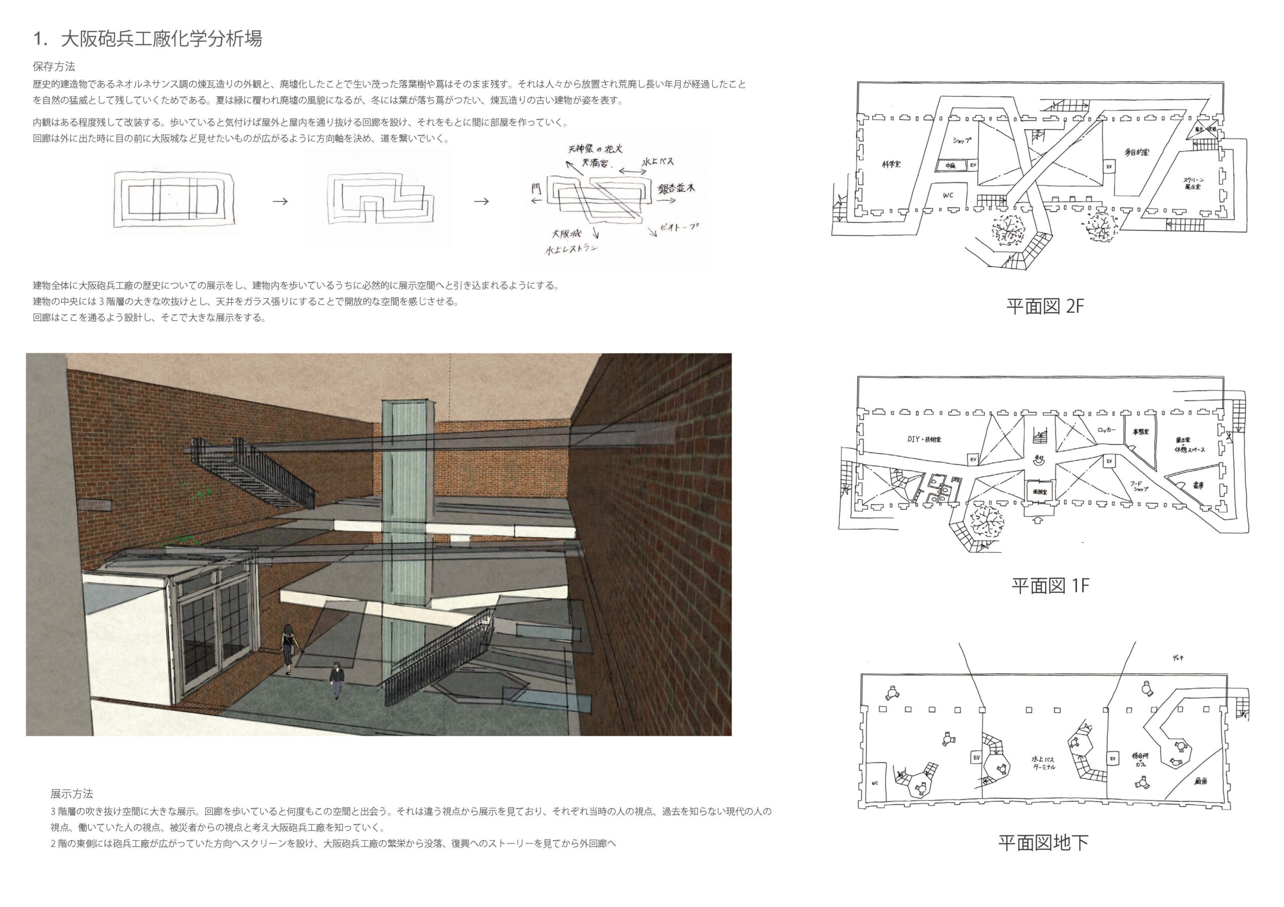 私の卒業設計は、廃墟の持つ美しさに魅力を感じたことがきっかけでした。敷地は大阪城公園の一角にあり、砲兵工廠化学分析場という建物があります。今では廃墟化しており、解体される可能性のあるこの負の遺産を再生するための提案をします。担当してくださった大河先生が仰っていた、「学生のうちにしかできないような、自分の好きなようにできるという学生の特権をたくさん使って卒業設計を考える」この言葉を常に意識していました。この作品は私が憧れていた、歴史を辿りその場所の記憶を知ることで設計をすることに挑戦した作品です。見てくださった方が歴史を知り、残していきたいと思ってもらえるきっかけとなることを願います。