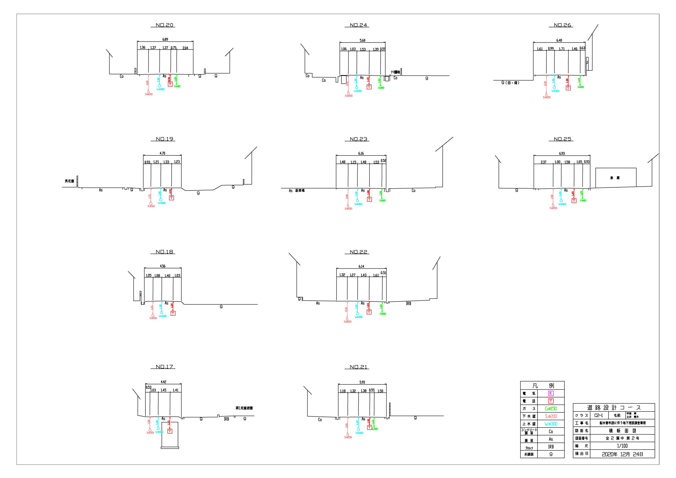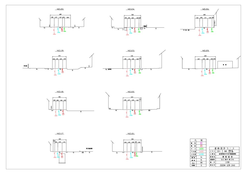 各管理者の図面の専門記号や用語の解読は容易ではなく、測点毎に埋設物深さ(土被り)の比率計算や道路肩からの寄り寸法、管径の割出など地道な作業の積み重ねにより完成させた。<川西 幸男>