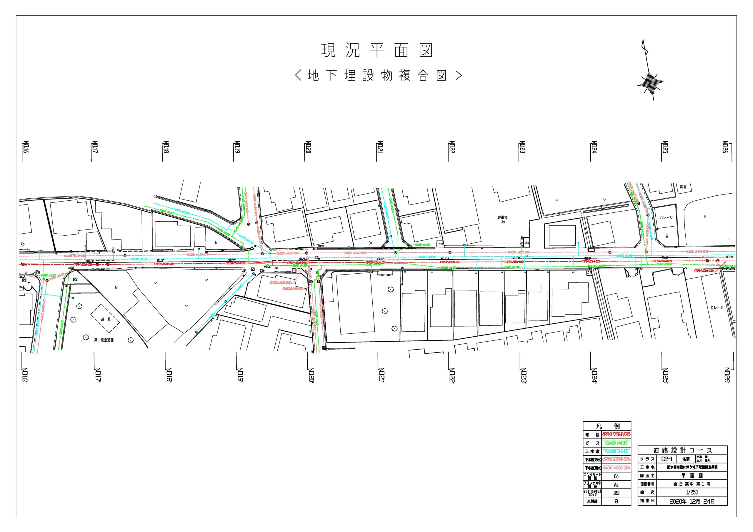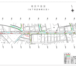 この作品は、水道・下水道・ガス・電話等の管理者が個別に保管している台帳(地下埋設状況が把握できる図面)を基に、地下埋設物の『全体状況を見える化』するため複合平面図および複合断面図を作成した。