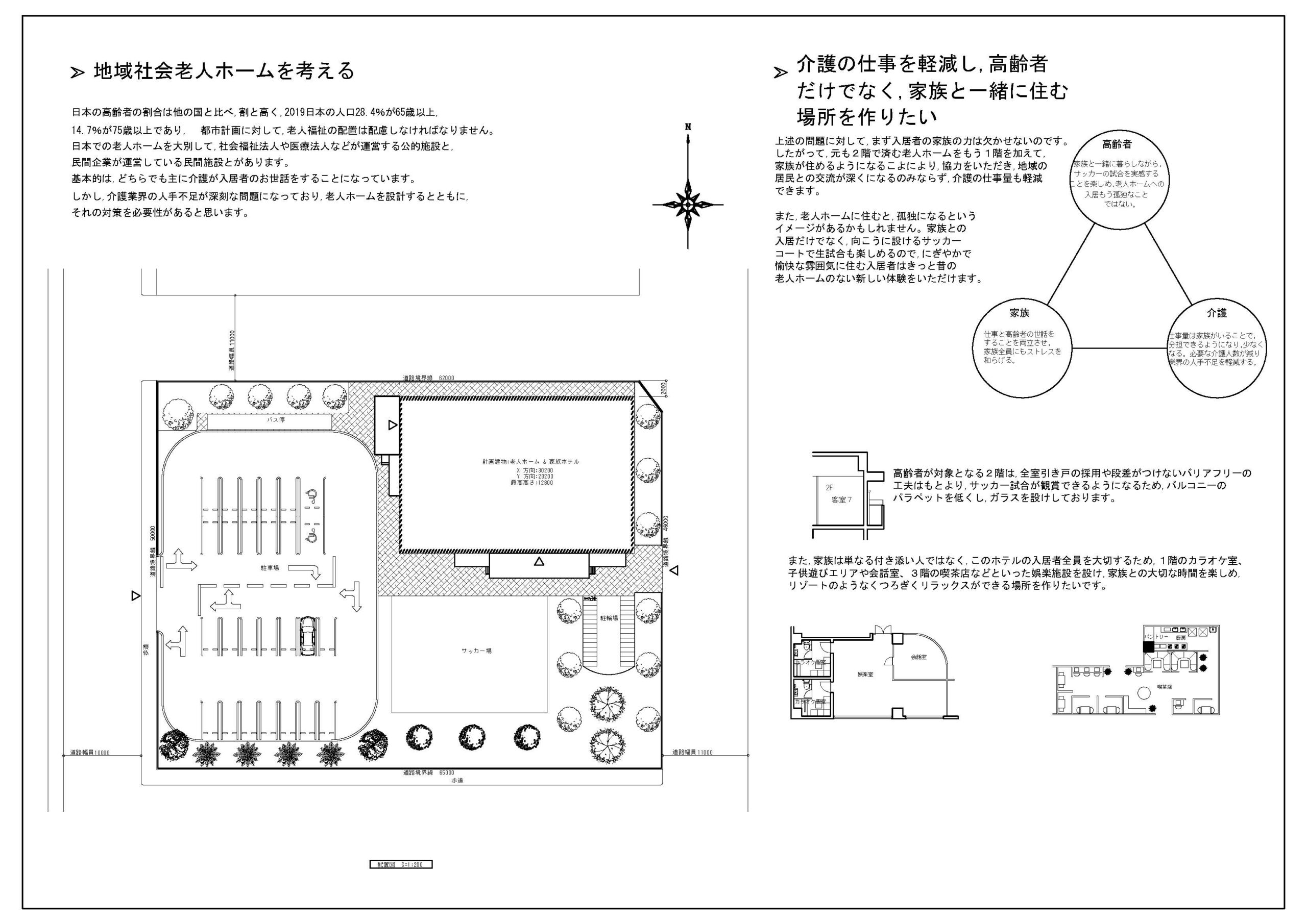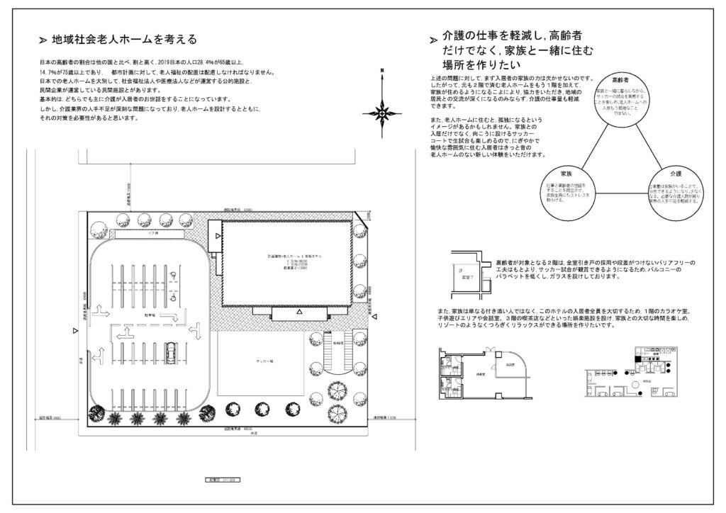 日本の高齢者の割合は他国と比べ高く、2019年日本の人口の28.4%が65歳以上、14.7%が75歳以上であり都市計画に対して老人福祉施設の建設は必須である。日本の老人ホームは社会福祉法人や医療法人が運営する公的施設と民間企業が運営する民間施設とがある。どちらも主に介護士が入居者のお世話をするため介護業界の人手不足が深刻な問題になっている。私は老人ホームの設計を通してその対策も必要であると感じた。