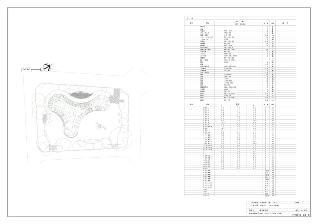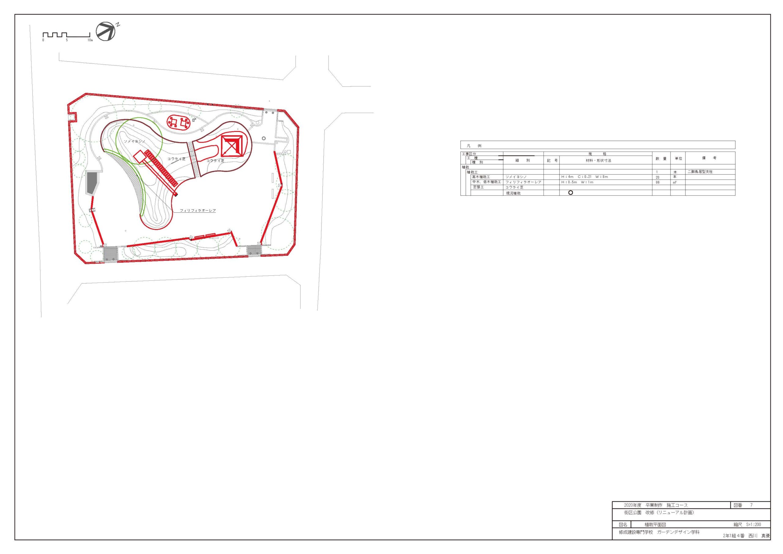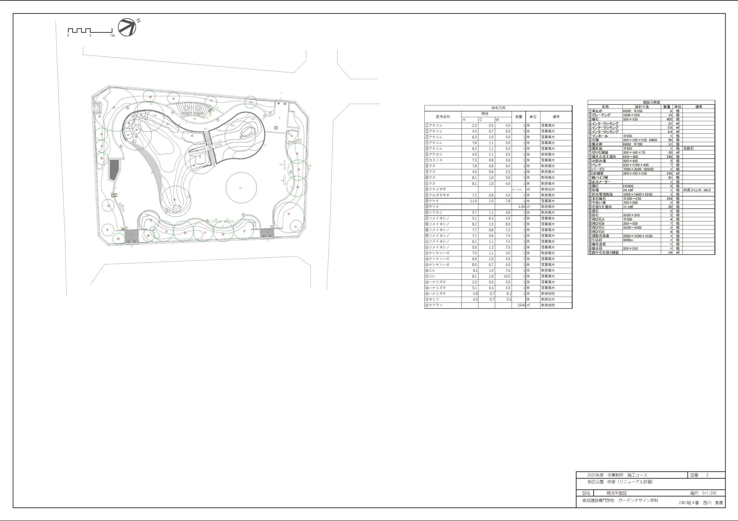 今回の計画地は、西淀川区の公園であったため、頻繁に現地調査を行い、近隣住民の使用状況や要望を聞き込み反映させた、より現実的な改修計画であった。既存の築山を活かした遊戯施設の設置や、利用者の快適性を考慮した四阿や舗装、安全に配慮した柵等、細部に渡って検討したため、改修箇所も多くなったが、積算や人工数量、工程表、施工フローの確認など施工計画書を作成していく中で、安全管理や品質管理、使用重機計画なども含め、現場責任者として各工種の細部に渡って全体を把握していった。意欲的に取り組んだ過程から、施工管理者としての姿勢を学び、2年間の集大成が作品に表現されている。<坂 一朗・中安 哲男>
